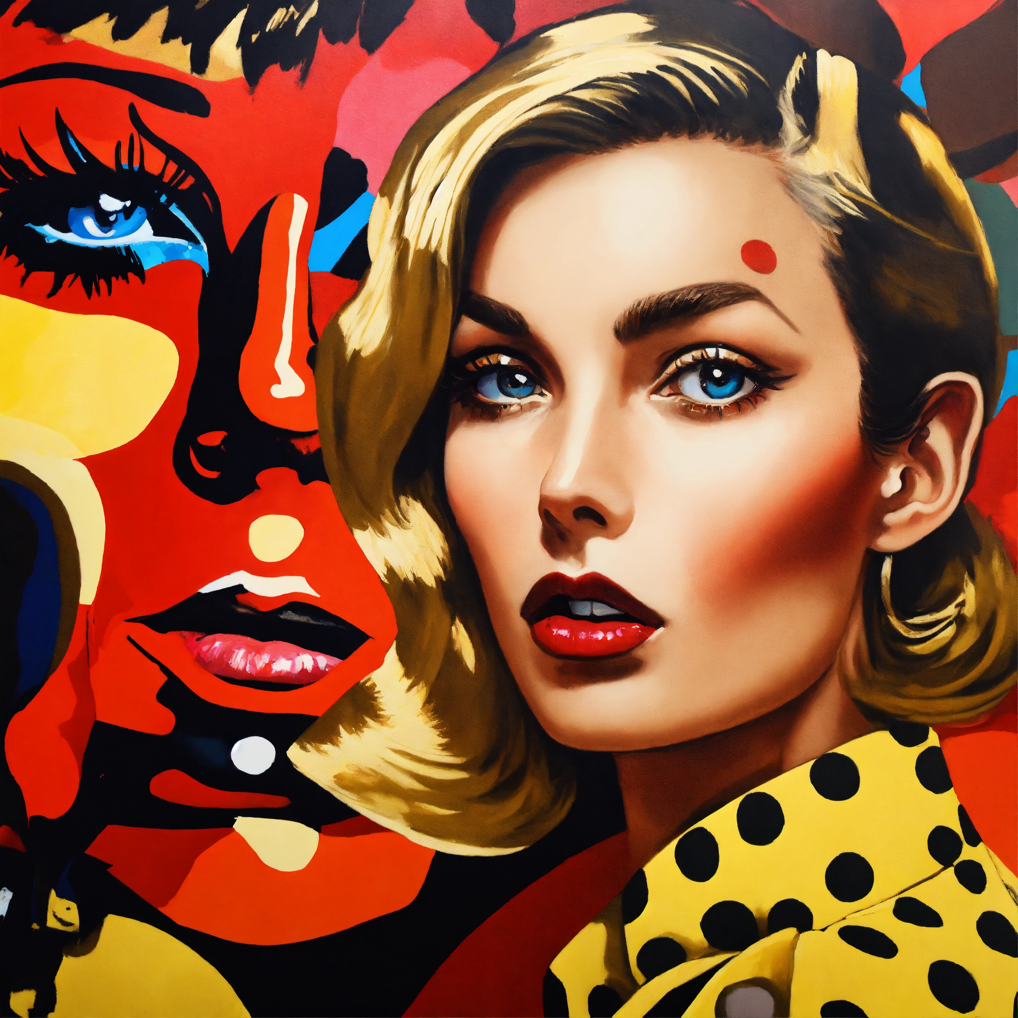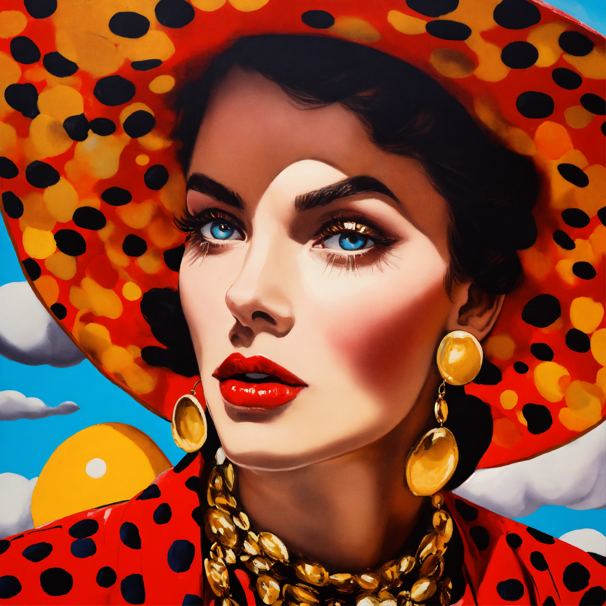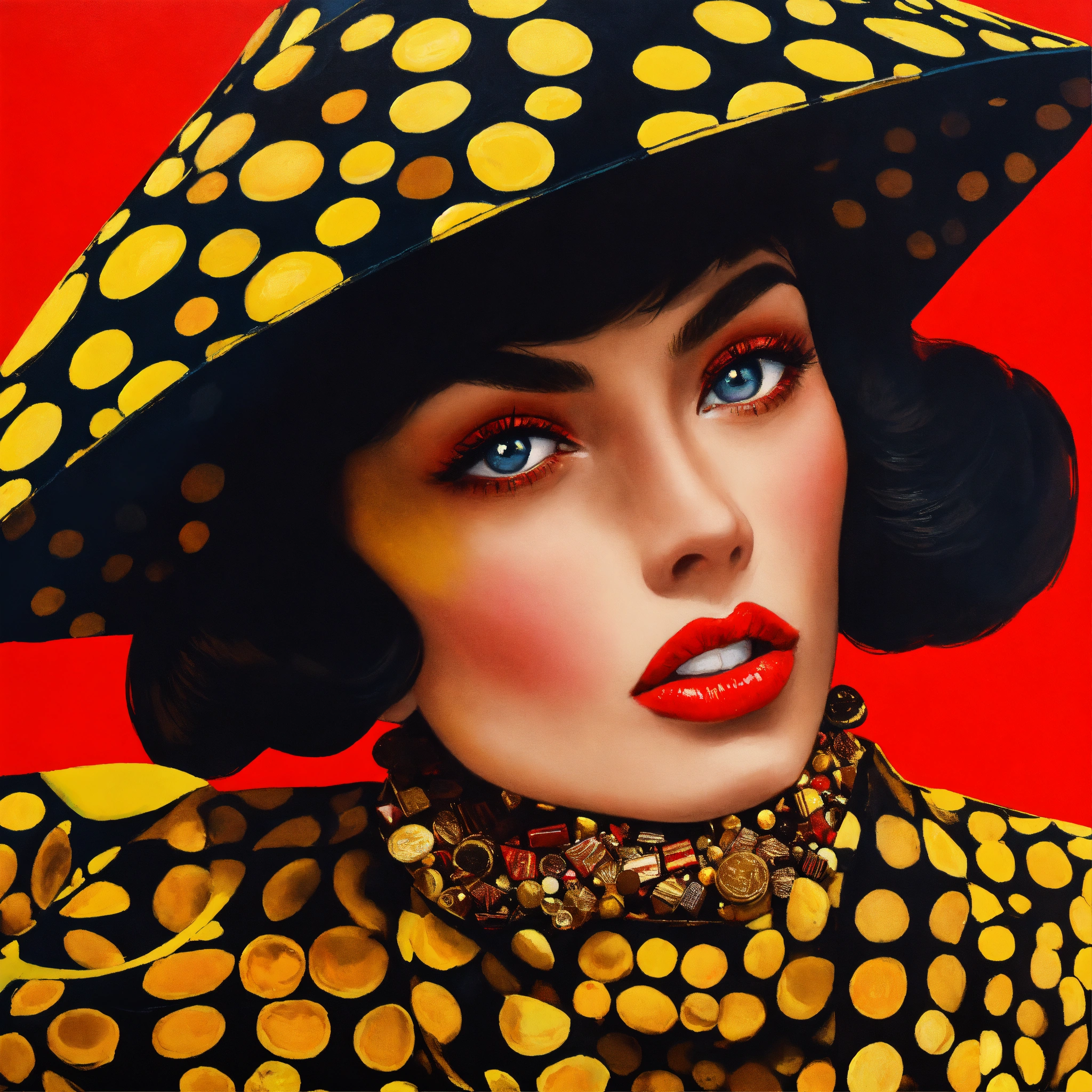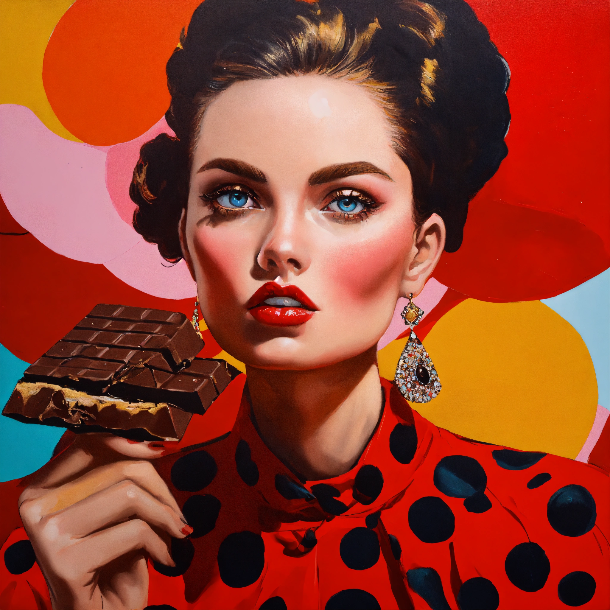 Close up of a female fashion designer in william klein coloured oil painting, woman eating dark chocolate, with women's eyes looking straight at you complex background, perspective, wide angle. very surreal. pop art style loads of colour and dada surrealism. more bizarre and perfect painting. bizarre shaped clouds of polka dot golden and cardinal red skys.loads of polkadot red gold and black every were.