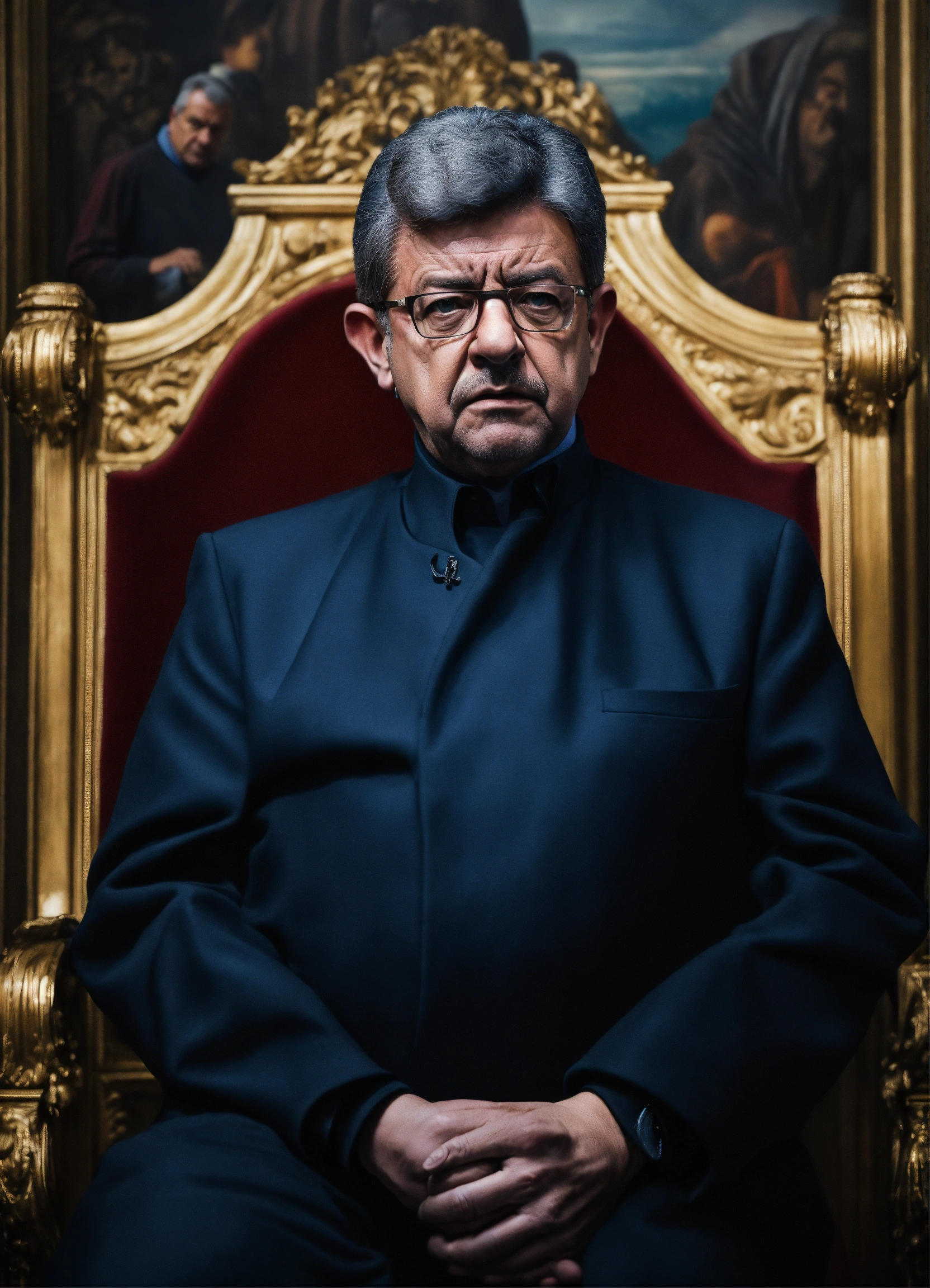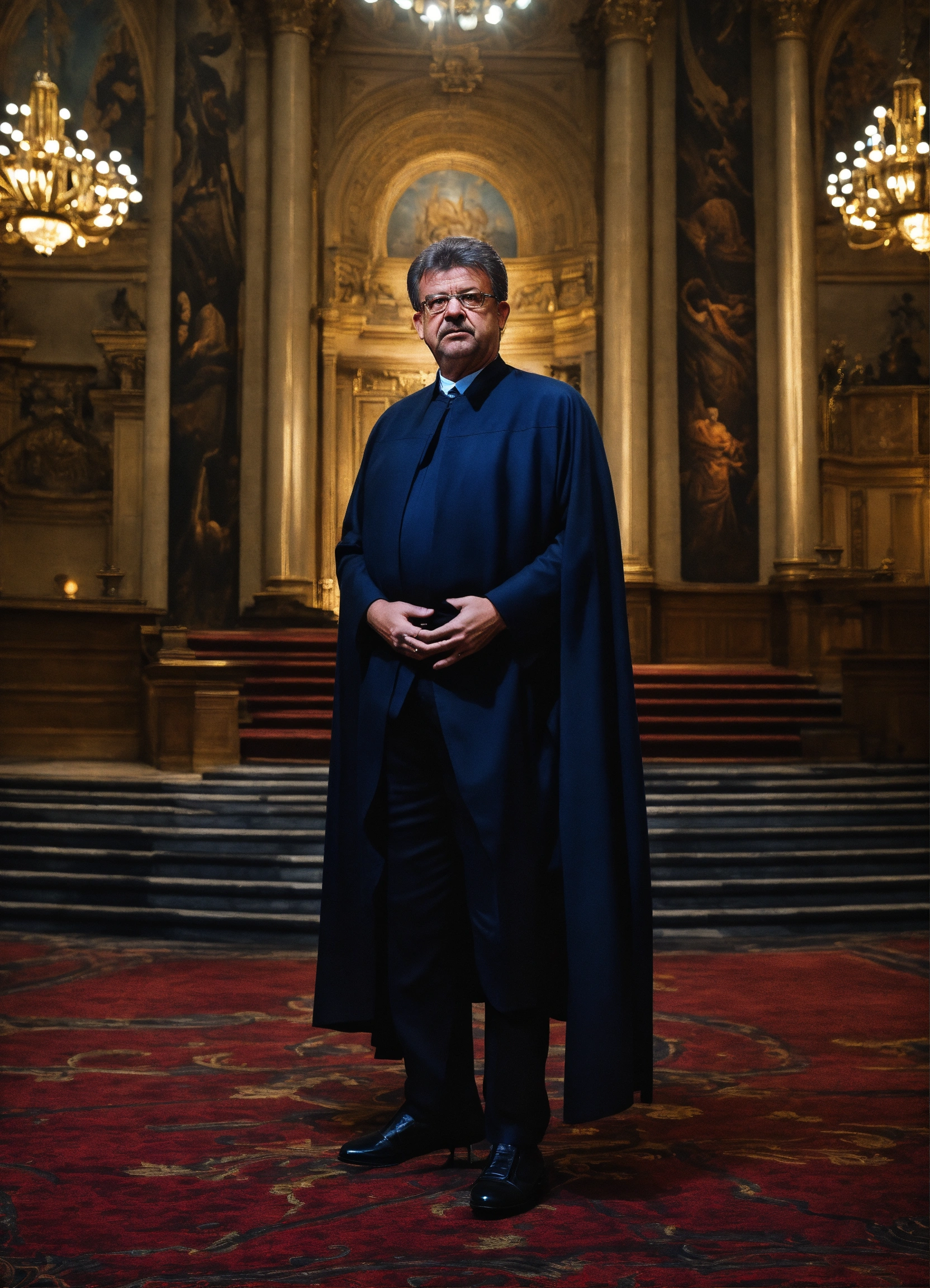 A realistic full body photograph of jean-luc mélenchon look dark vader, scary 65 years old, with an intimidating expression, no beard, an aggressive face, deep blue eyes, in the background the national france assembly, colossal futuristic, dramatic illumination, hyper detailed, hyper realistic, 16k
