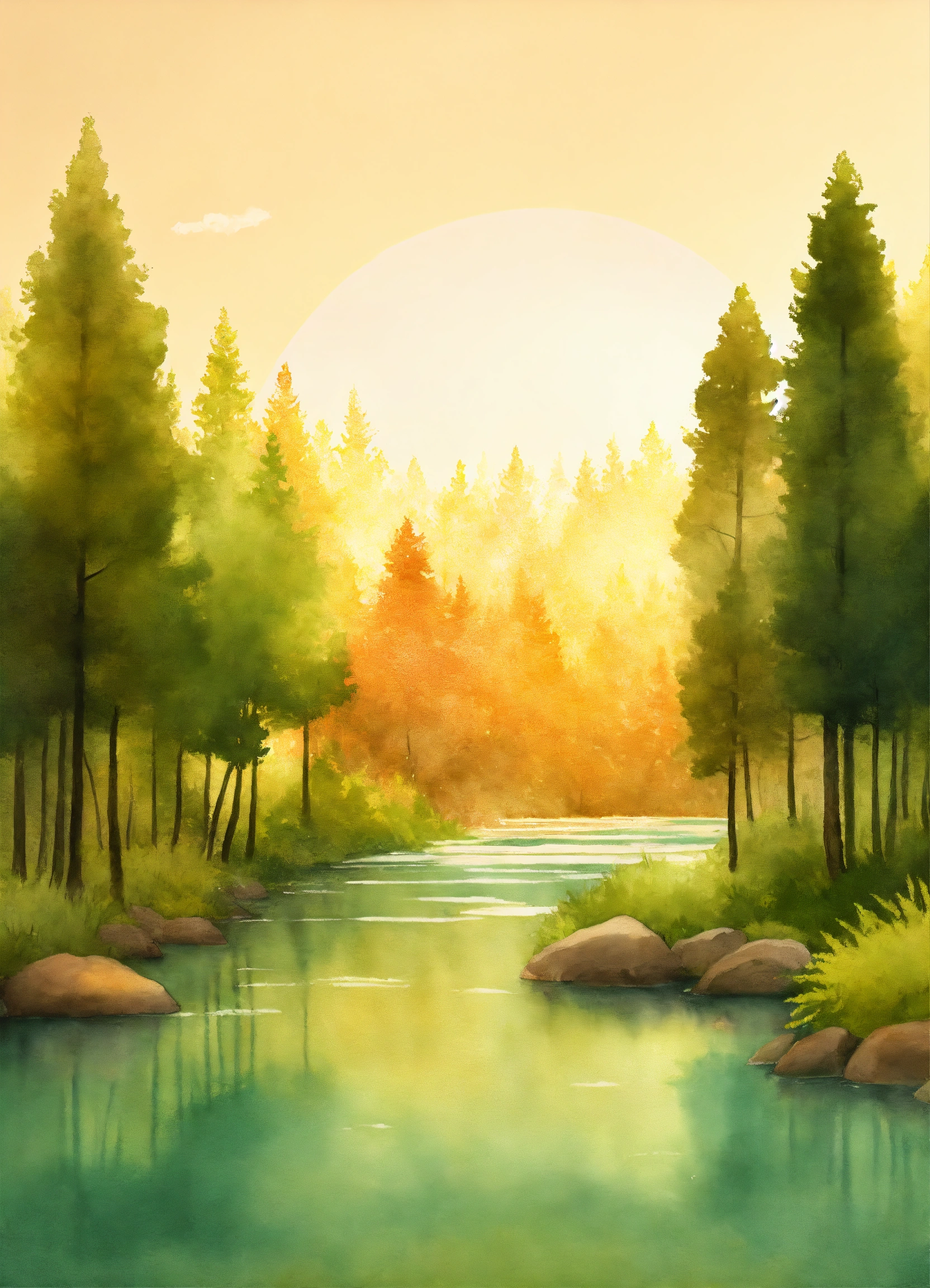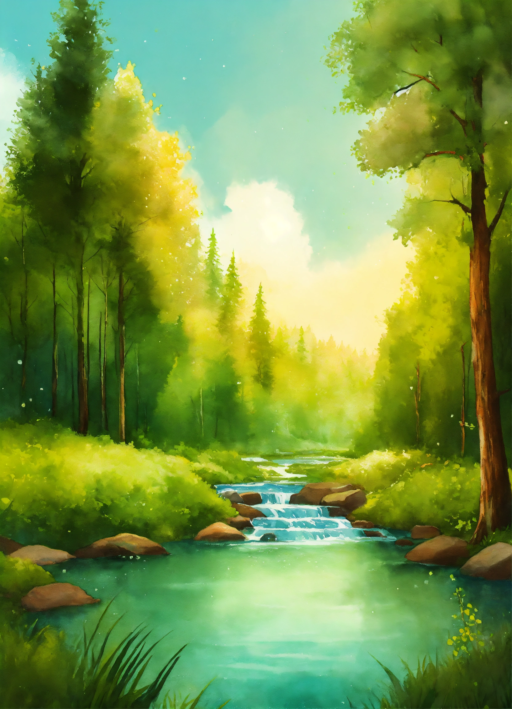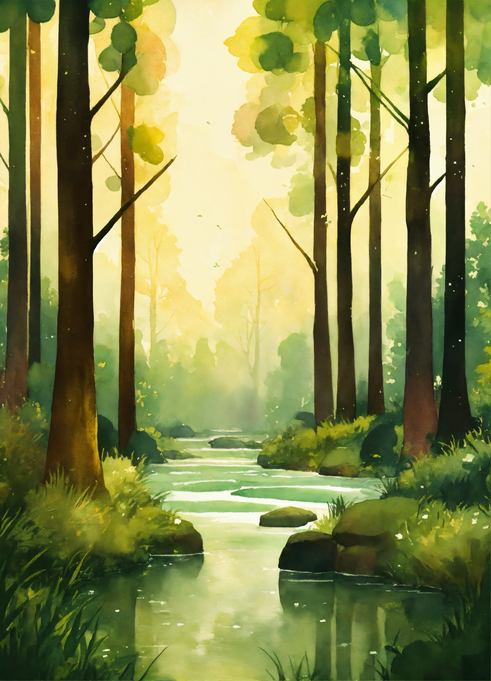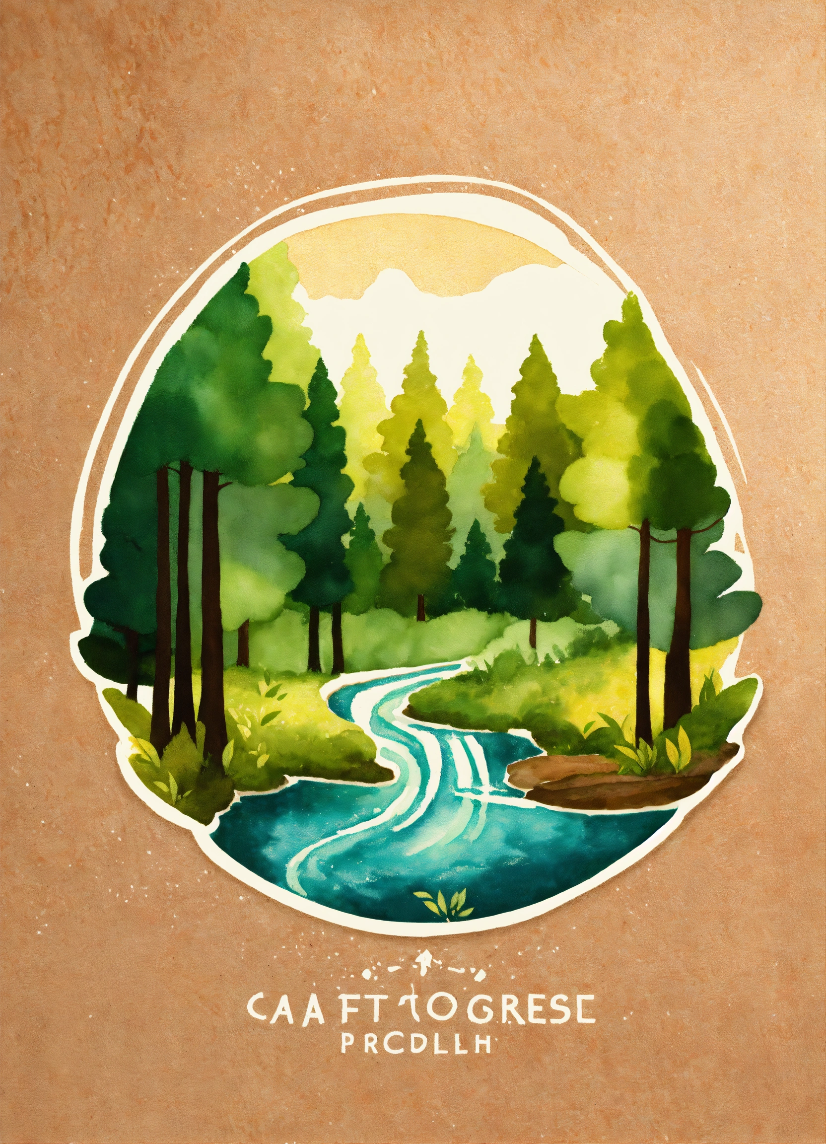 Craft a logo for an eco-friendly cleaning product line, the logo should showcase a pristine, sunlit forest with towering trees and a sparkling stream, invoking a sense of freshness and nature, painting, watercolors on textured paper, --ar 916 --v 5