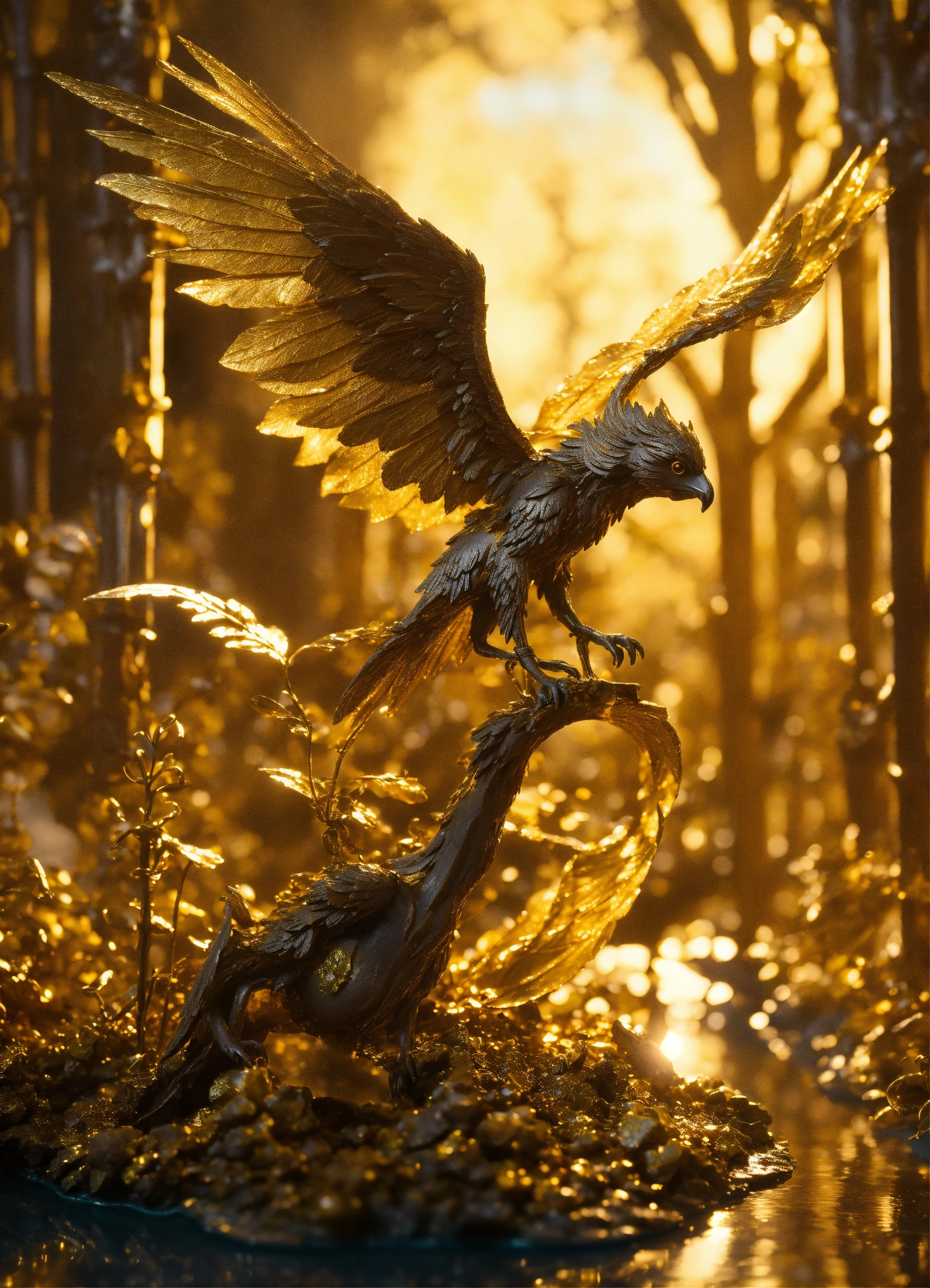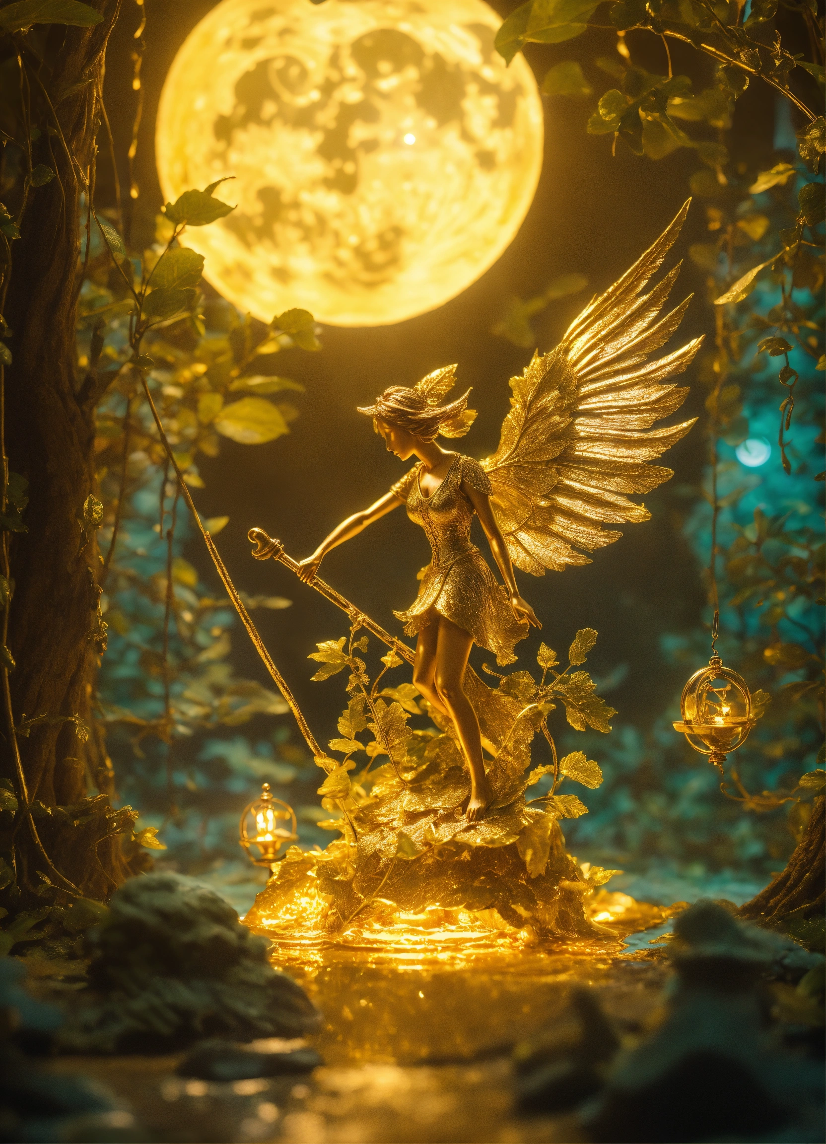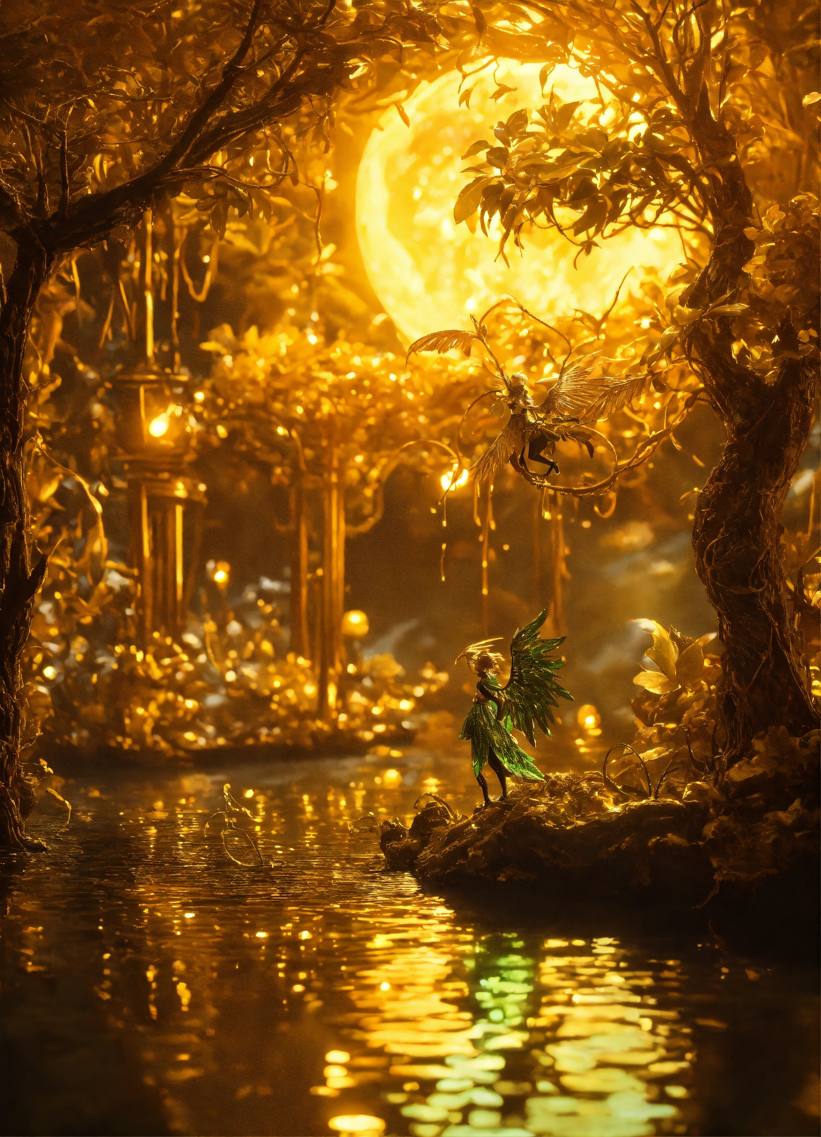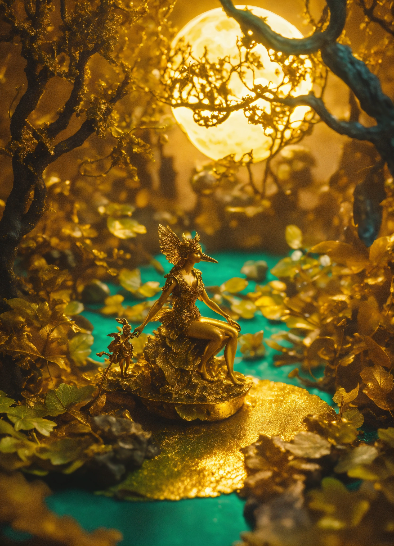 An mystical grove made of liquid gold, a harpy sailing on a leaf, claymation figures, steampunk inspired, rich and detailed, glowing moonlight, mystical grove.