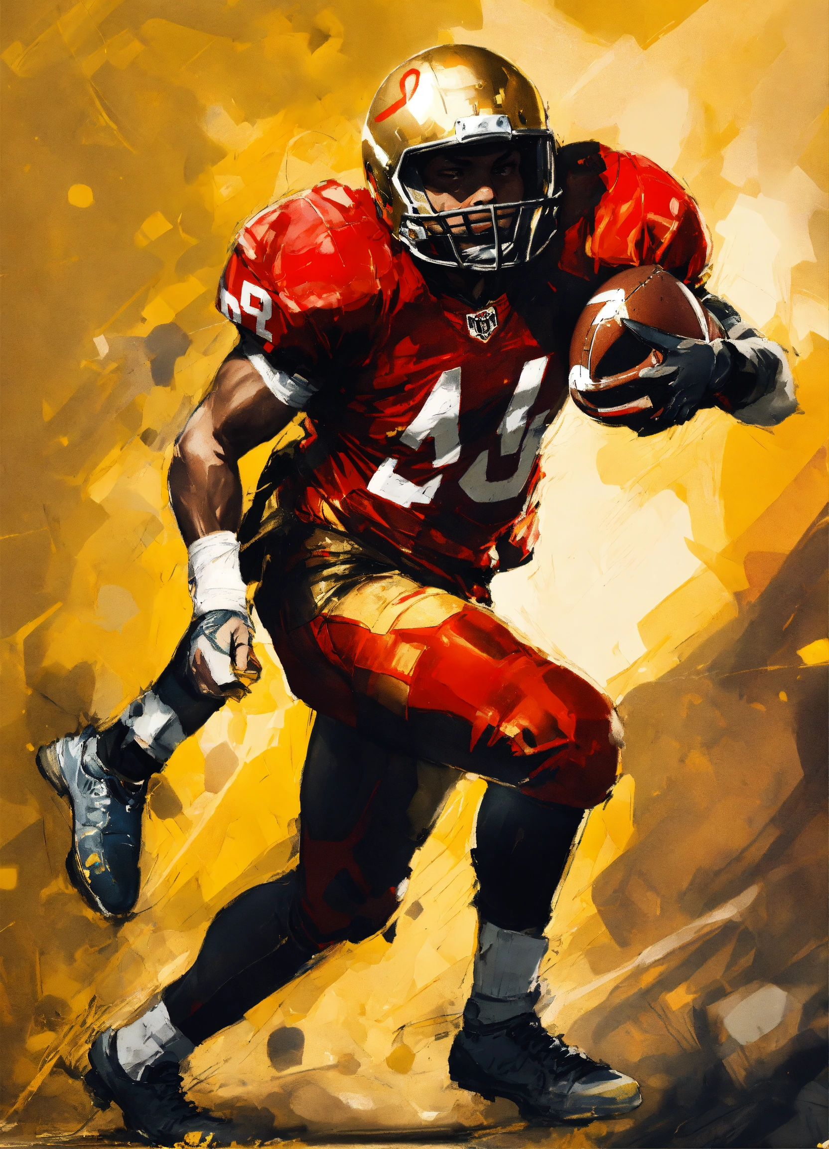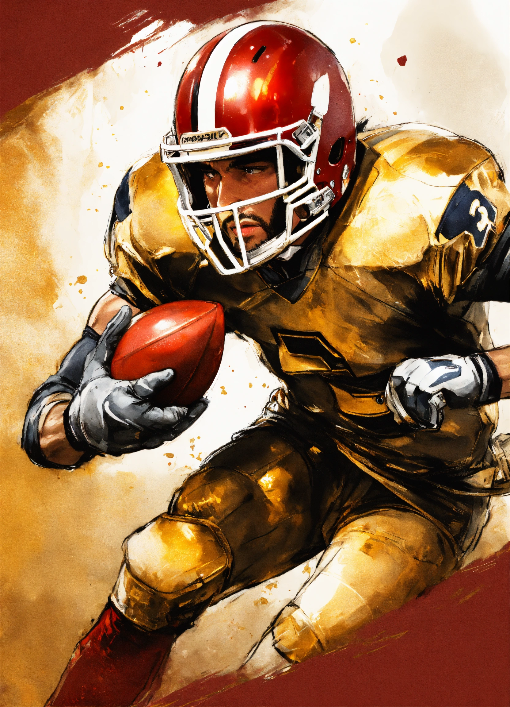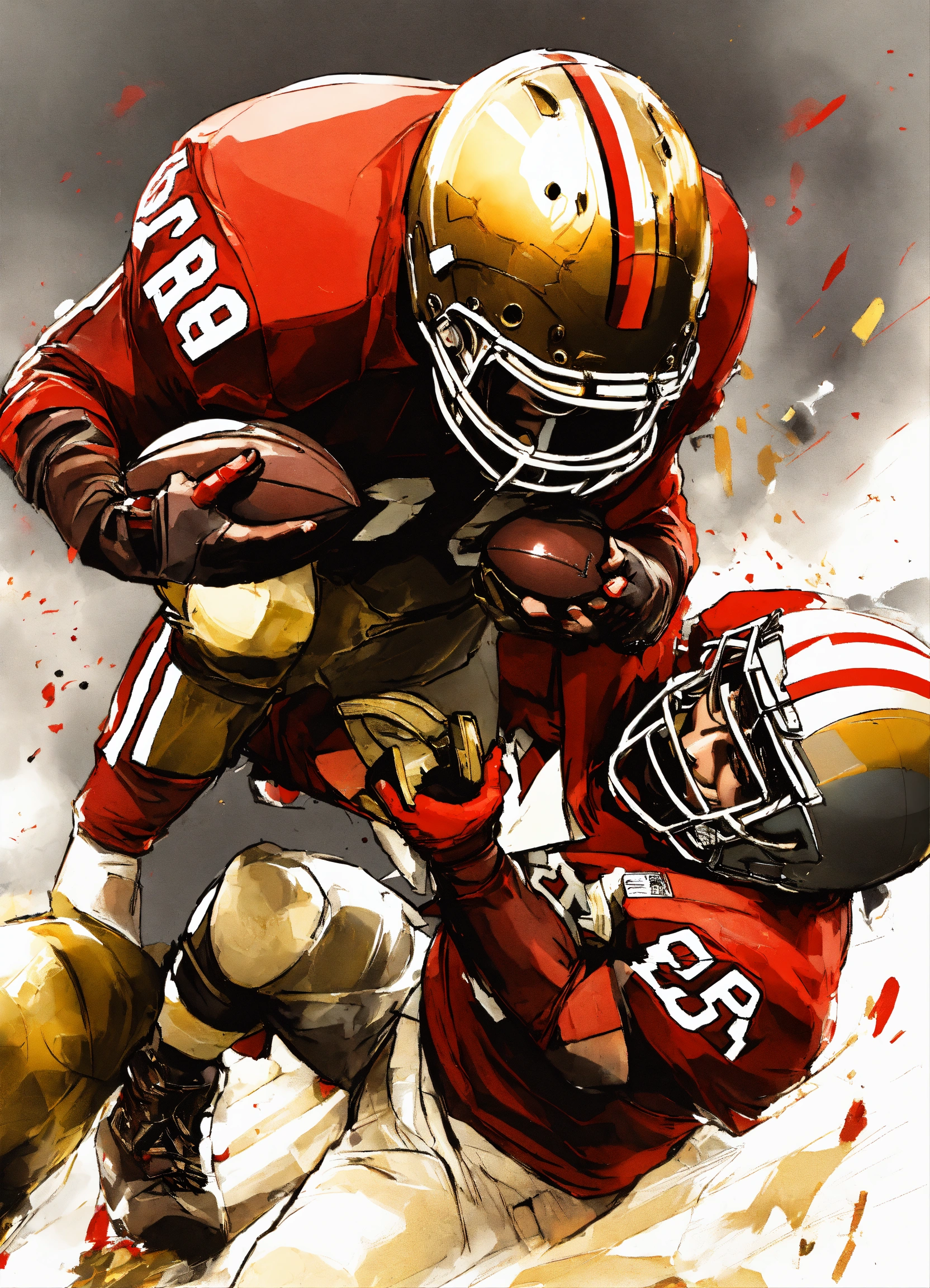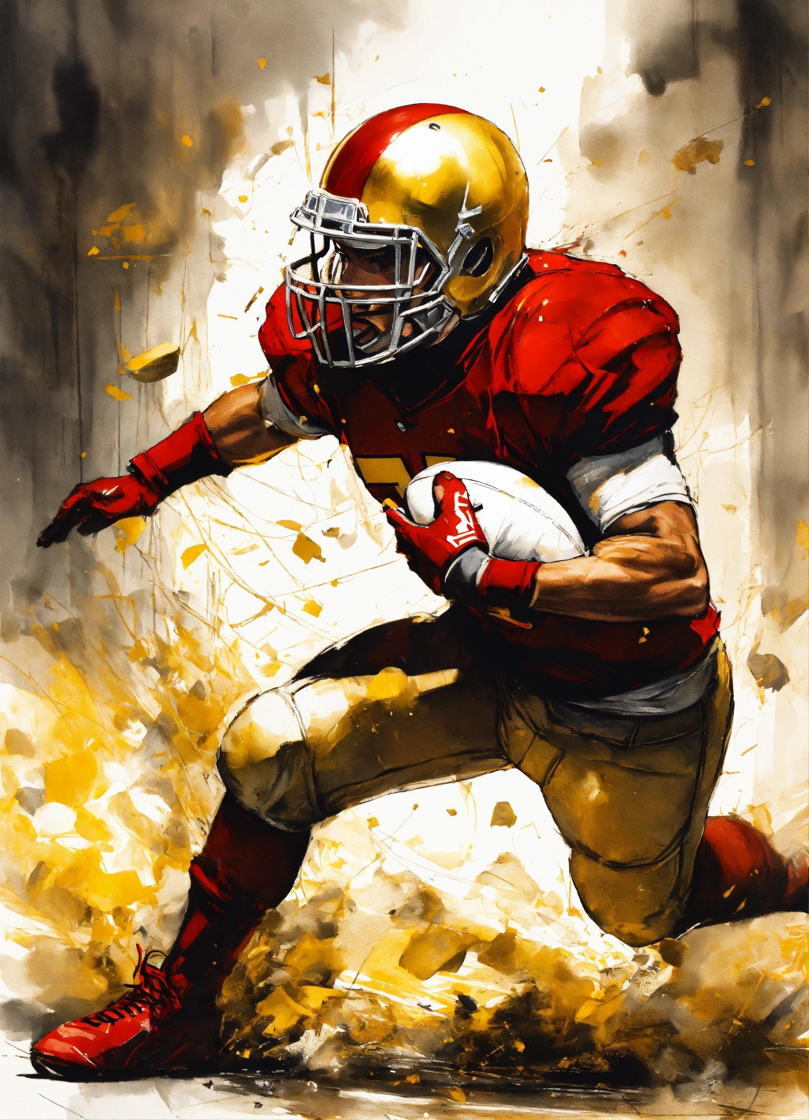 Full photo shot of an american football player getting tackled so hard helmet flies off, yoji shinkawa style, jean-baptiste monge, balanced composition, entirely on a sheet, concept art, backlighting, red, (gold1.3), red and dark gold, stylize, intricate detail, 32k, transparent background, (gold, white background1.4), 3d vector, comic book
