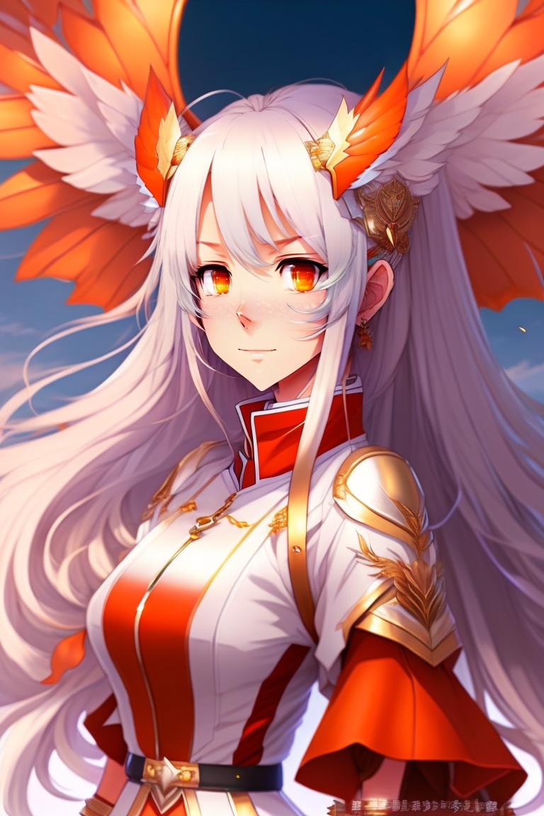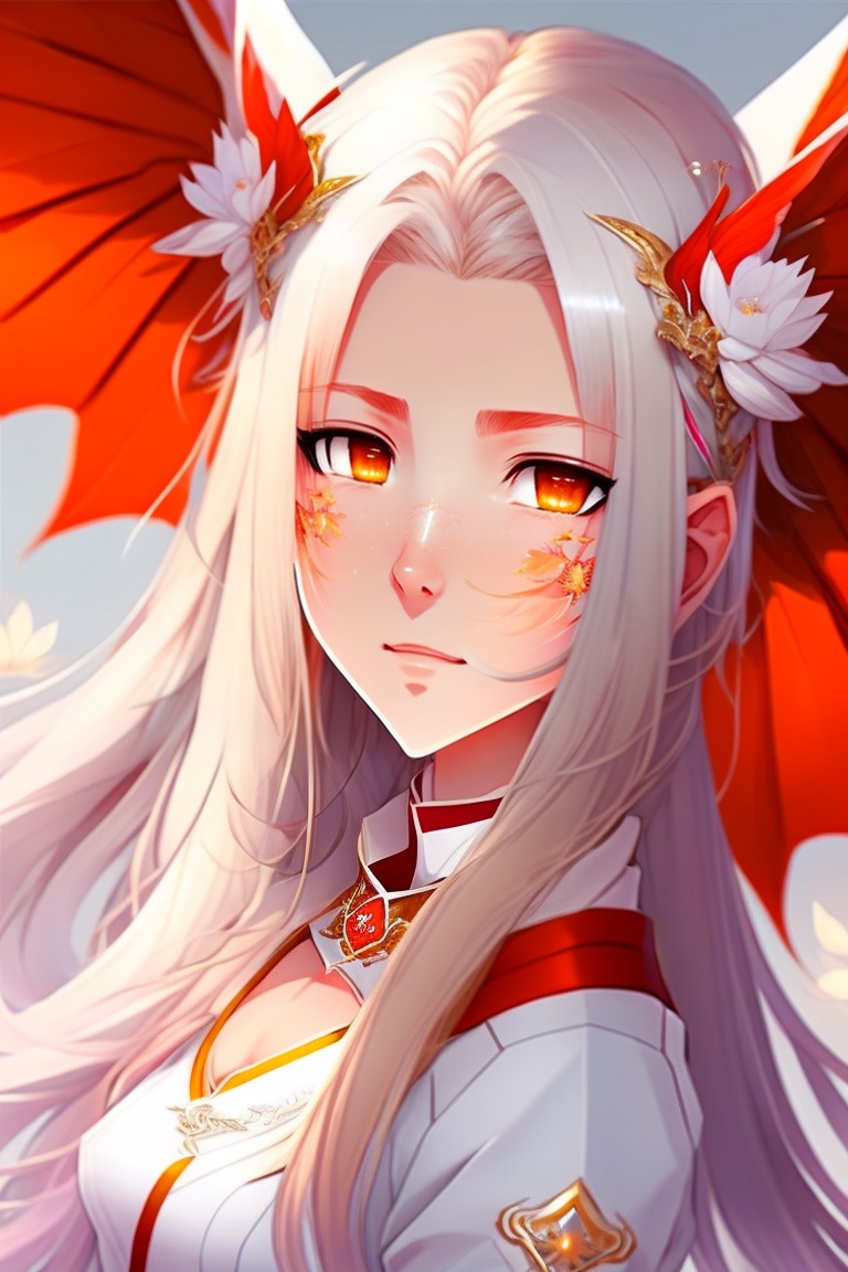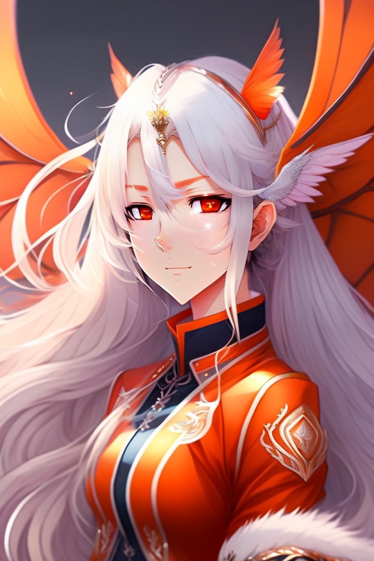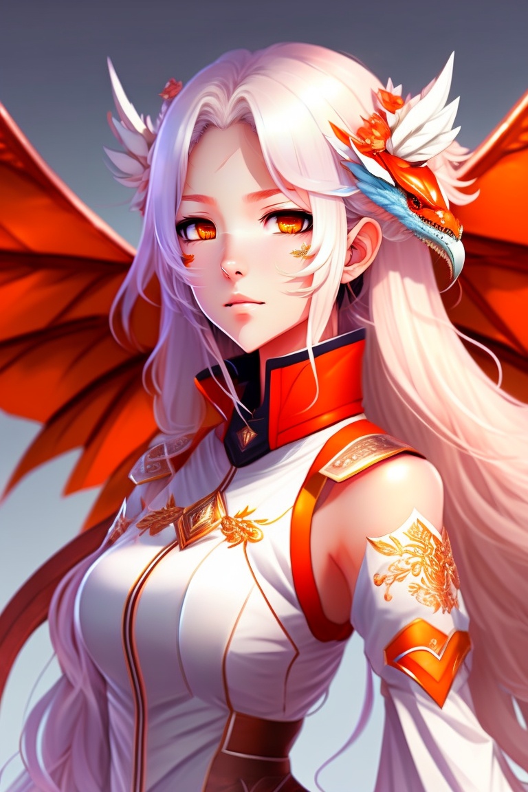 Anime girl, dragon girl, dragon wings, white hair, pretty, beutiful, korean style, gorgeous, dragon wings, white long hair, red/orange eyes.