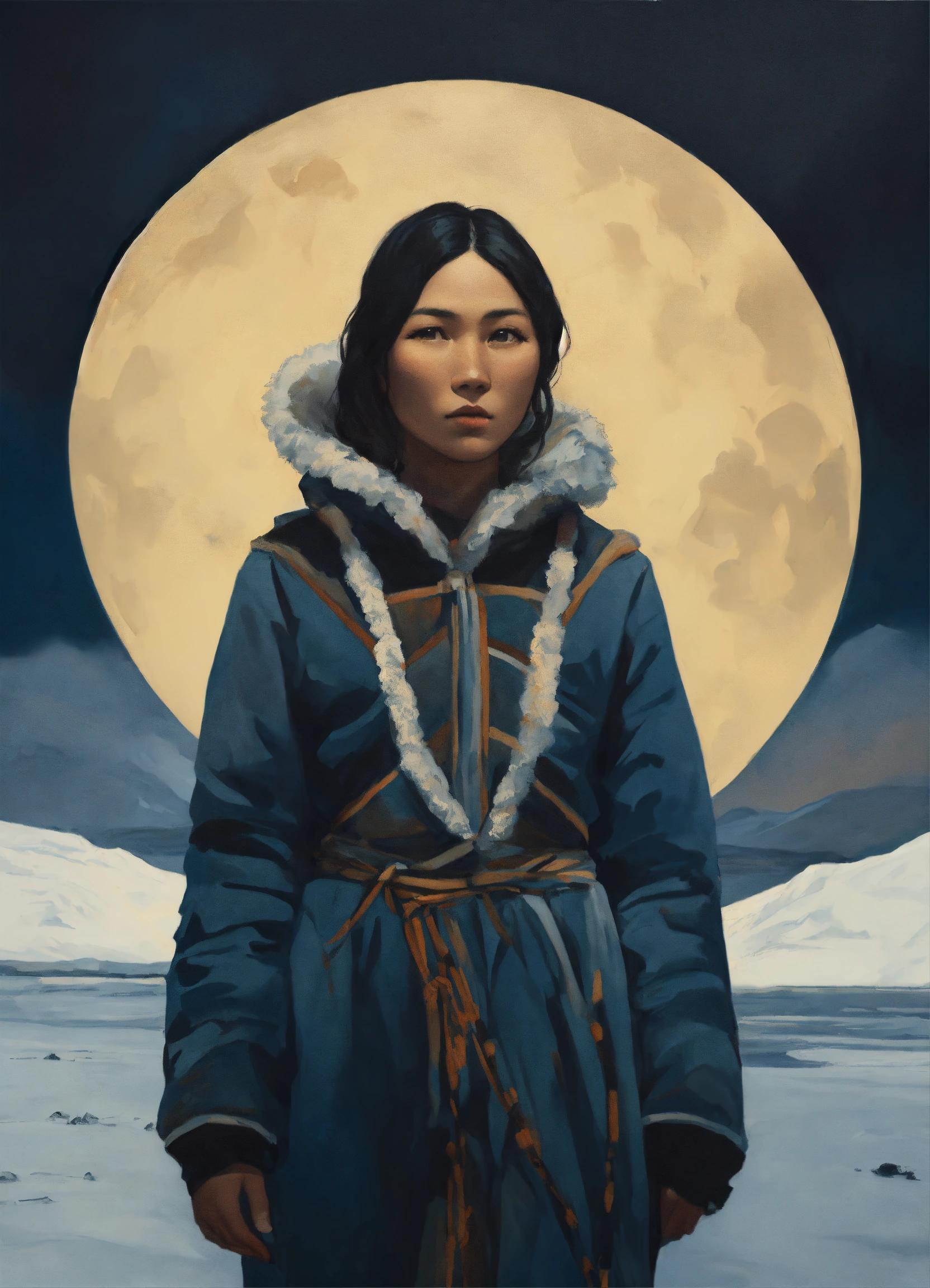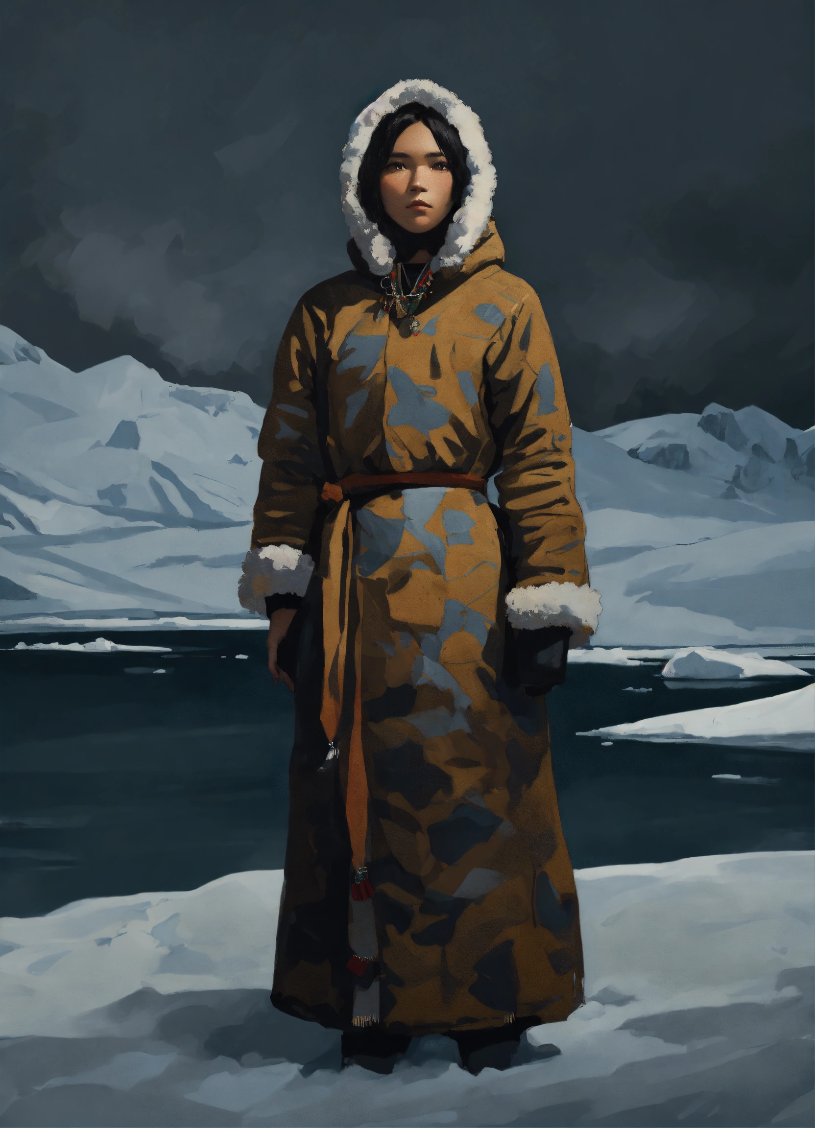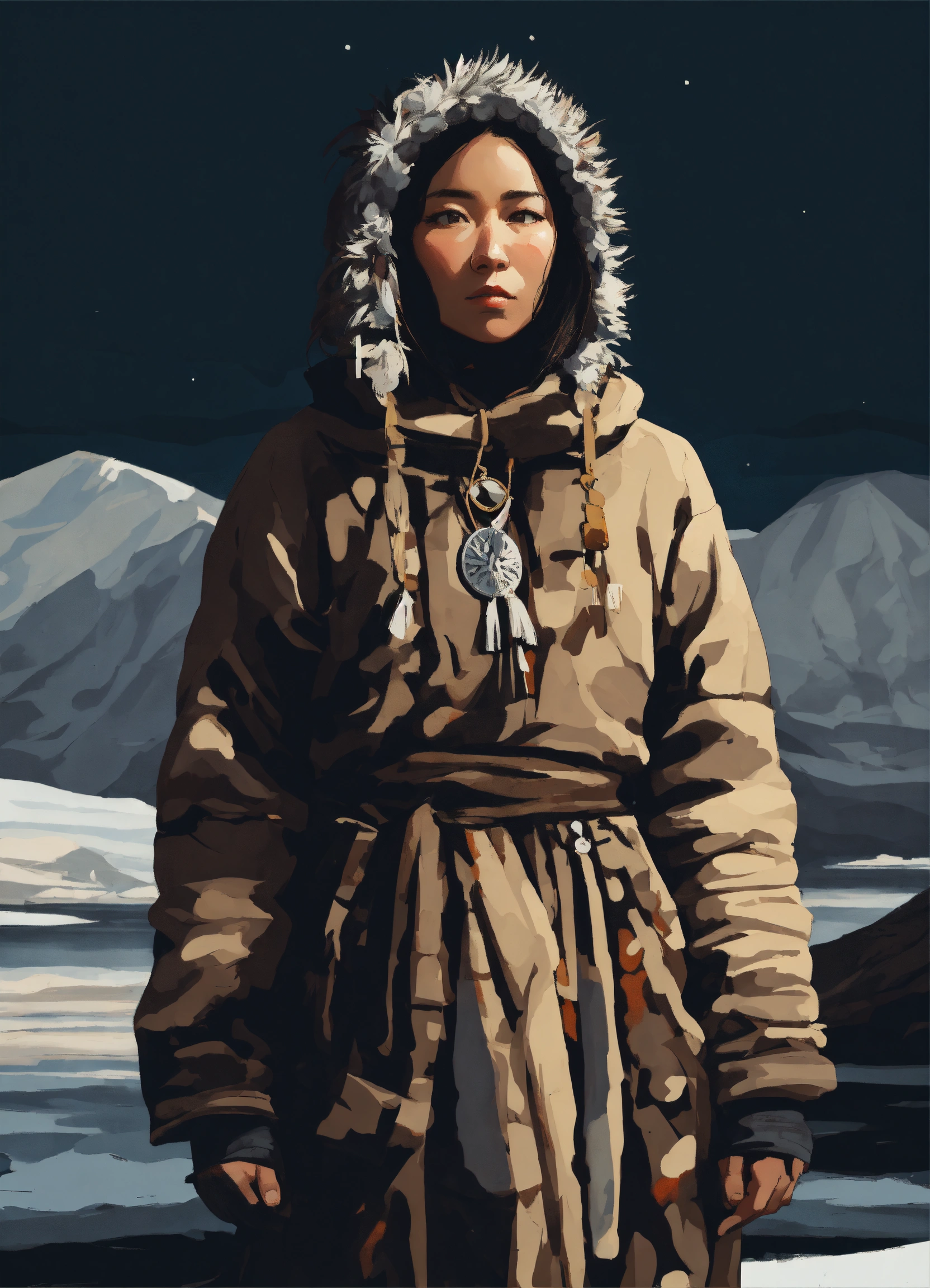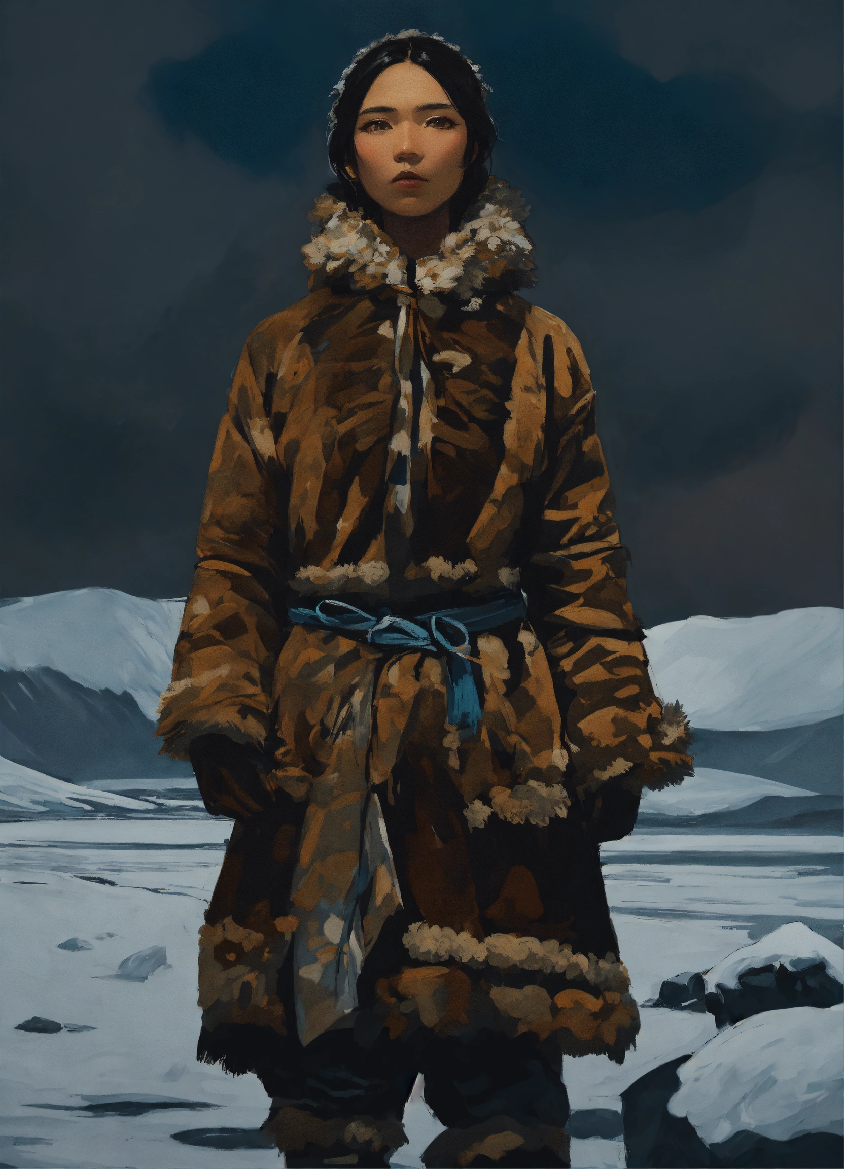 Painting of a young chukchi woman wearing arctic prehistoric clothing, outlined silhouettes, dark hues, gloomy aesthetic, in the style of tom björklund, masterpiece