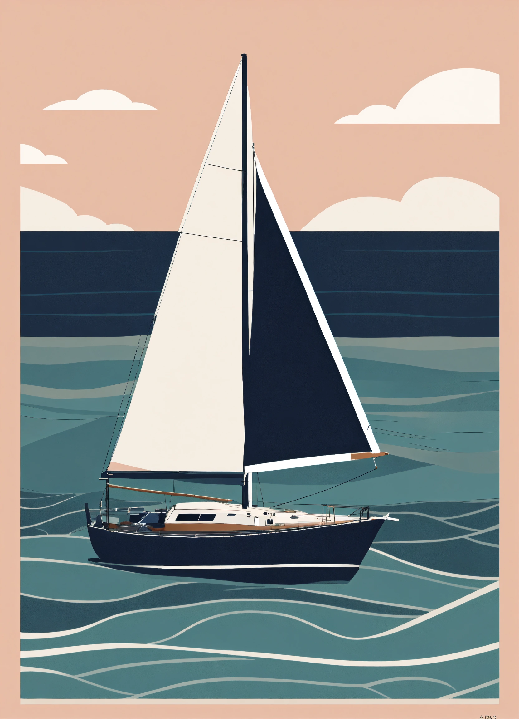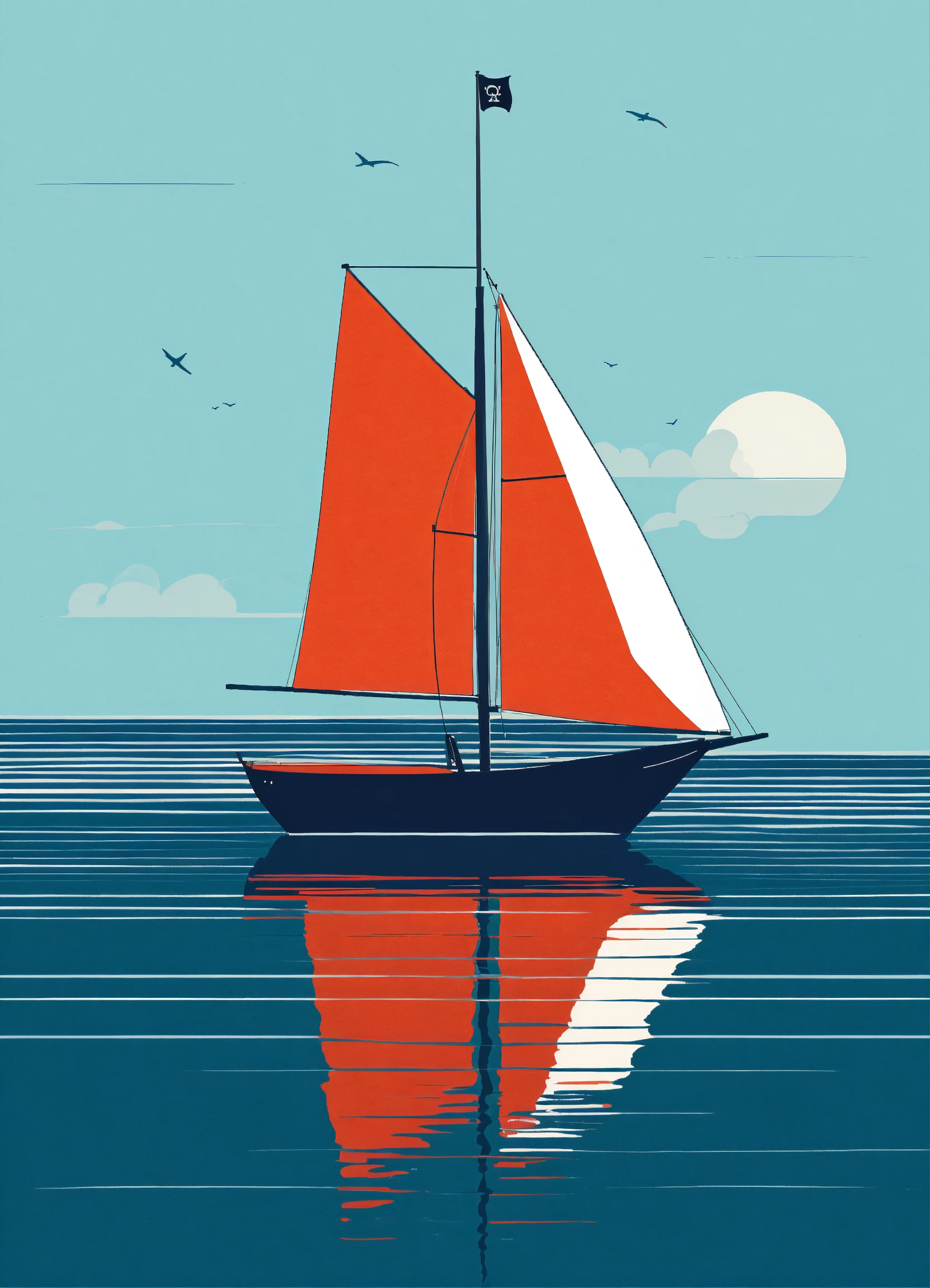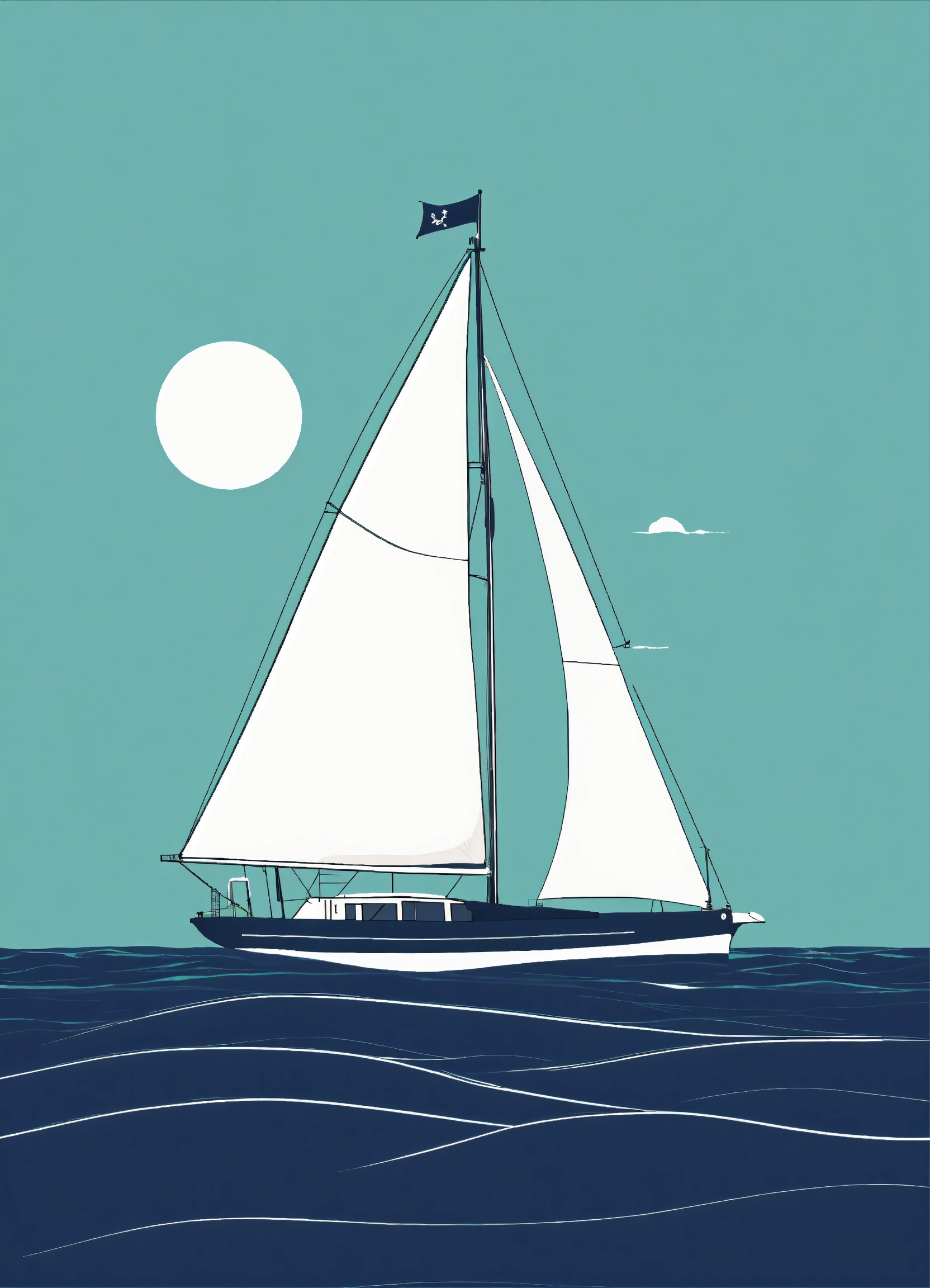 A minimalistic illustration of a sailboat with pirate flag on the ocean, capturing its essence with clean lines and simplified forms, perfect for printing on art prints and tote bags. --ar 23