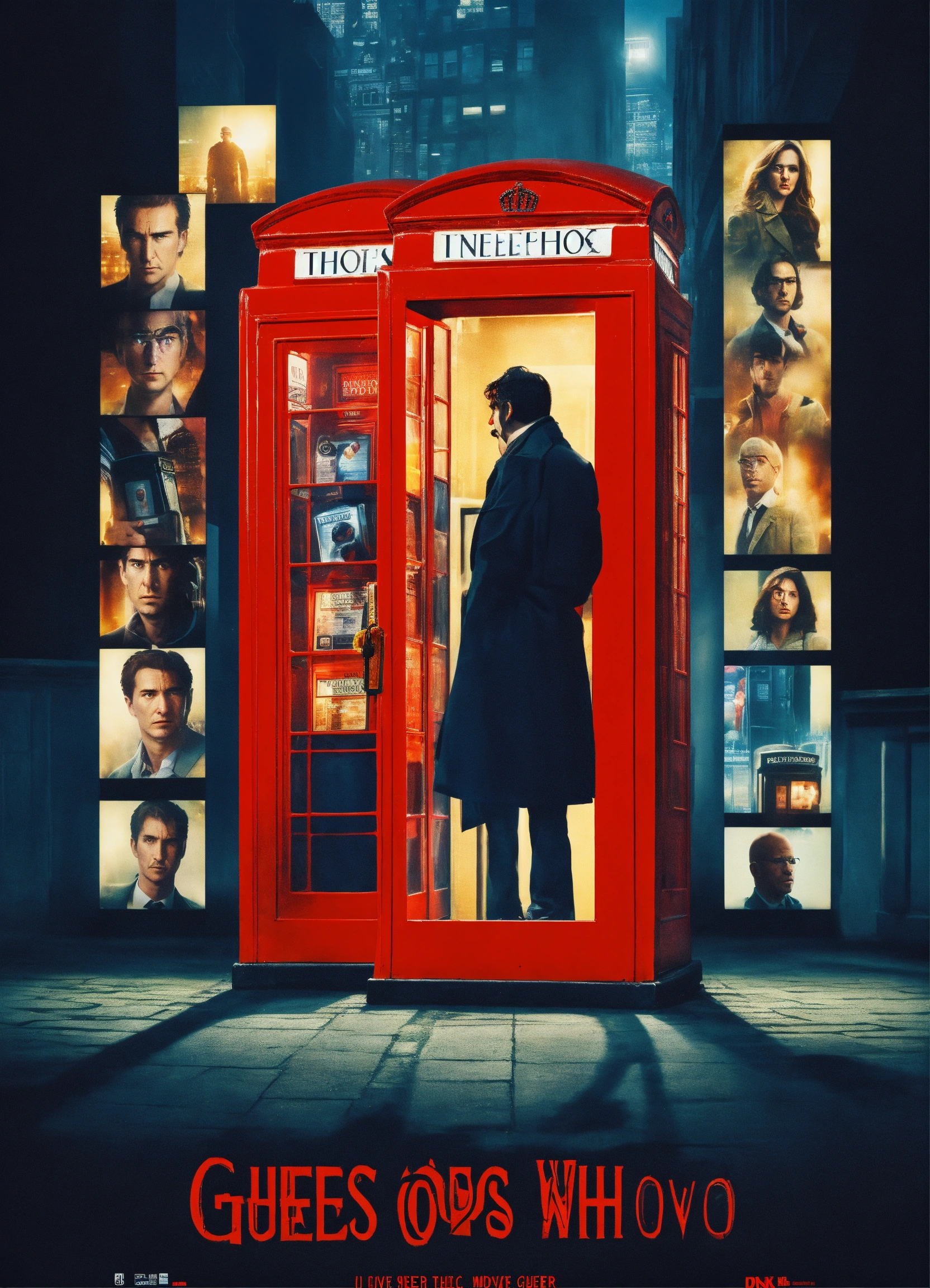 Movie poster featuring montage of a dark phonebox, a shadowy figure whose face cannot be seen, playing the game guess who