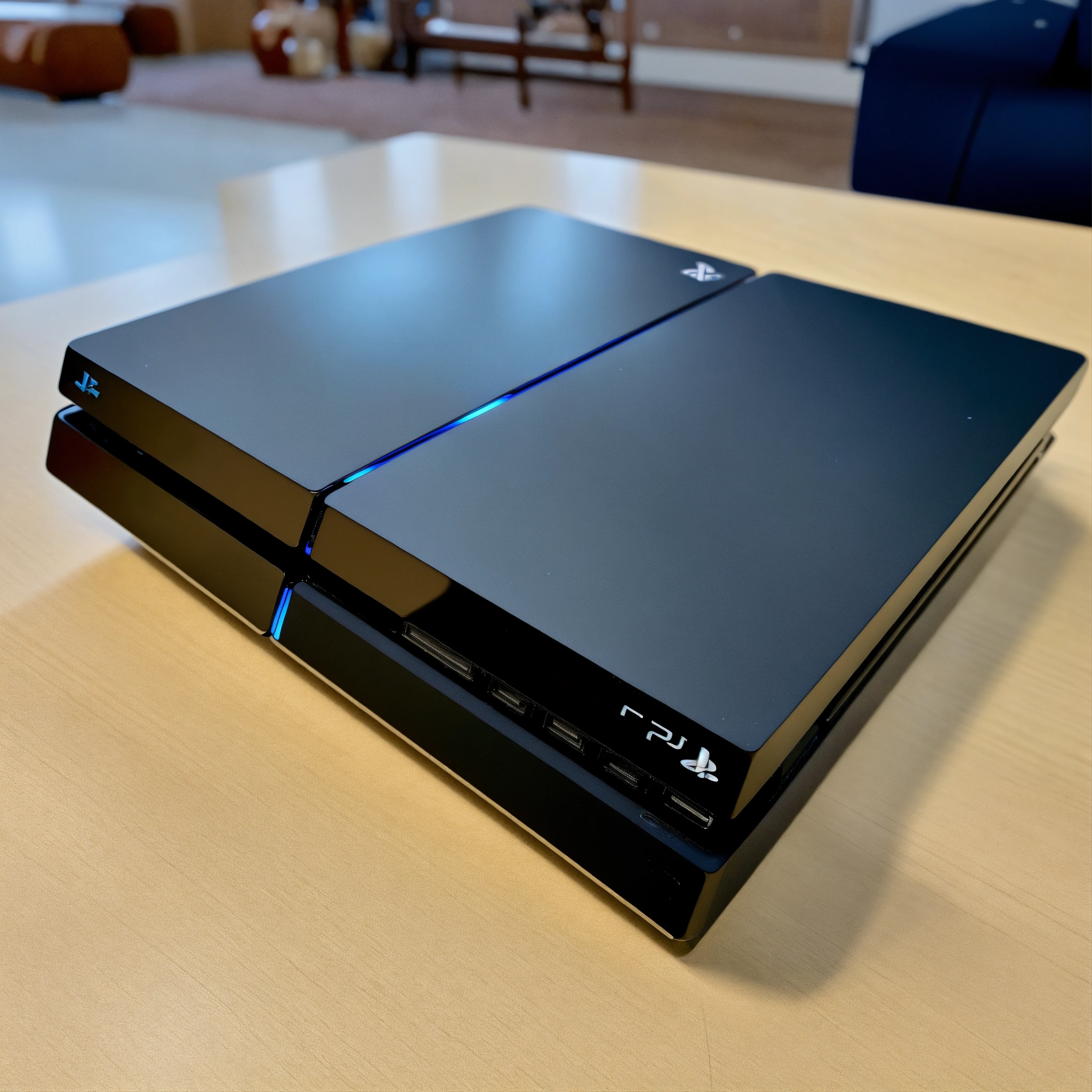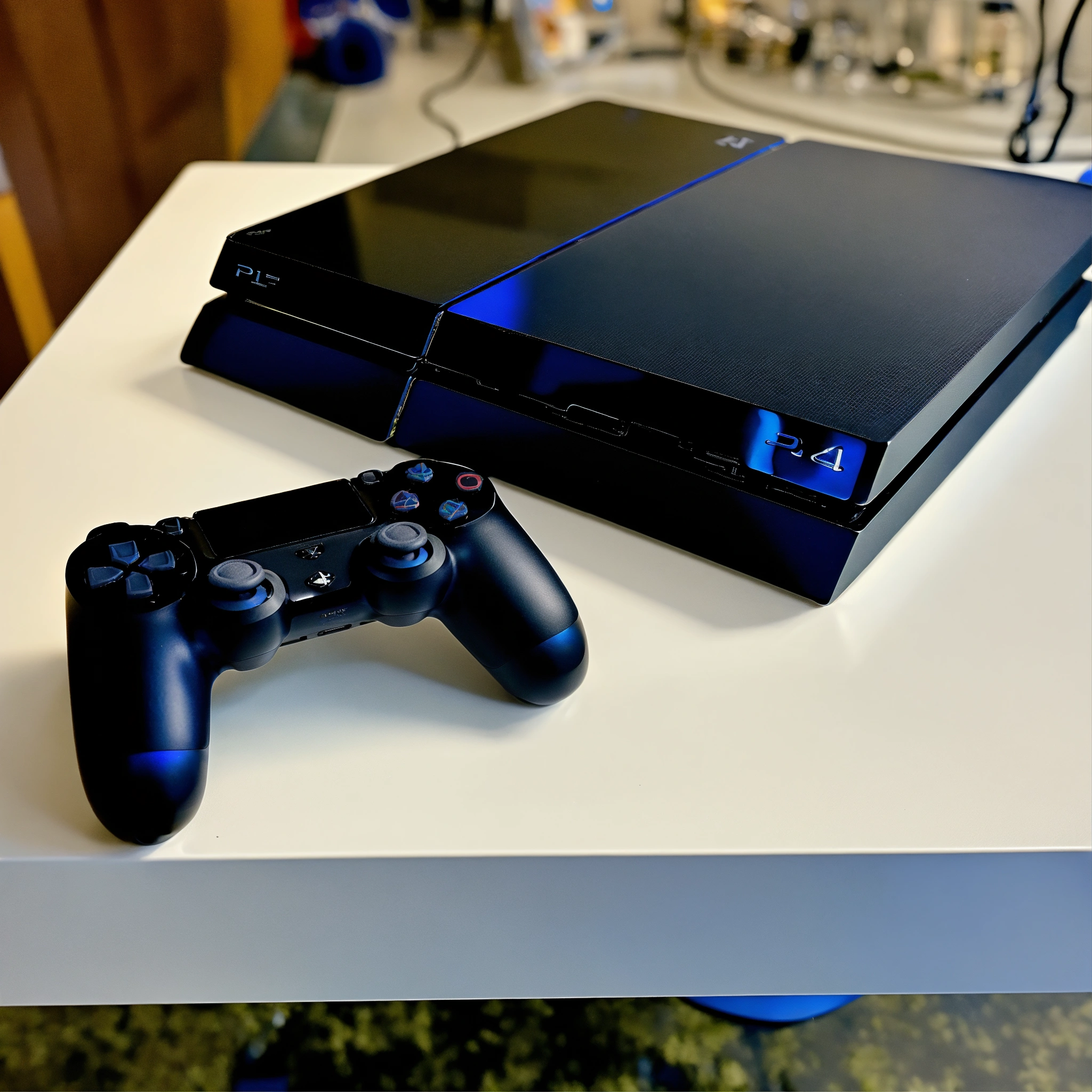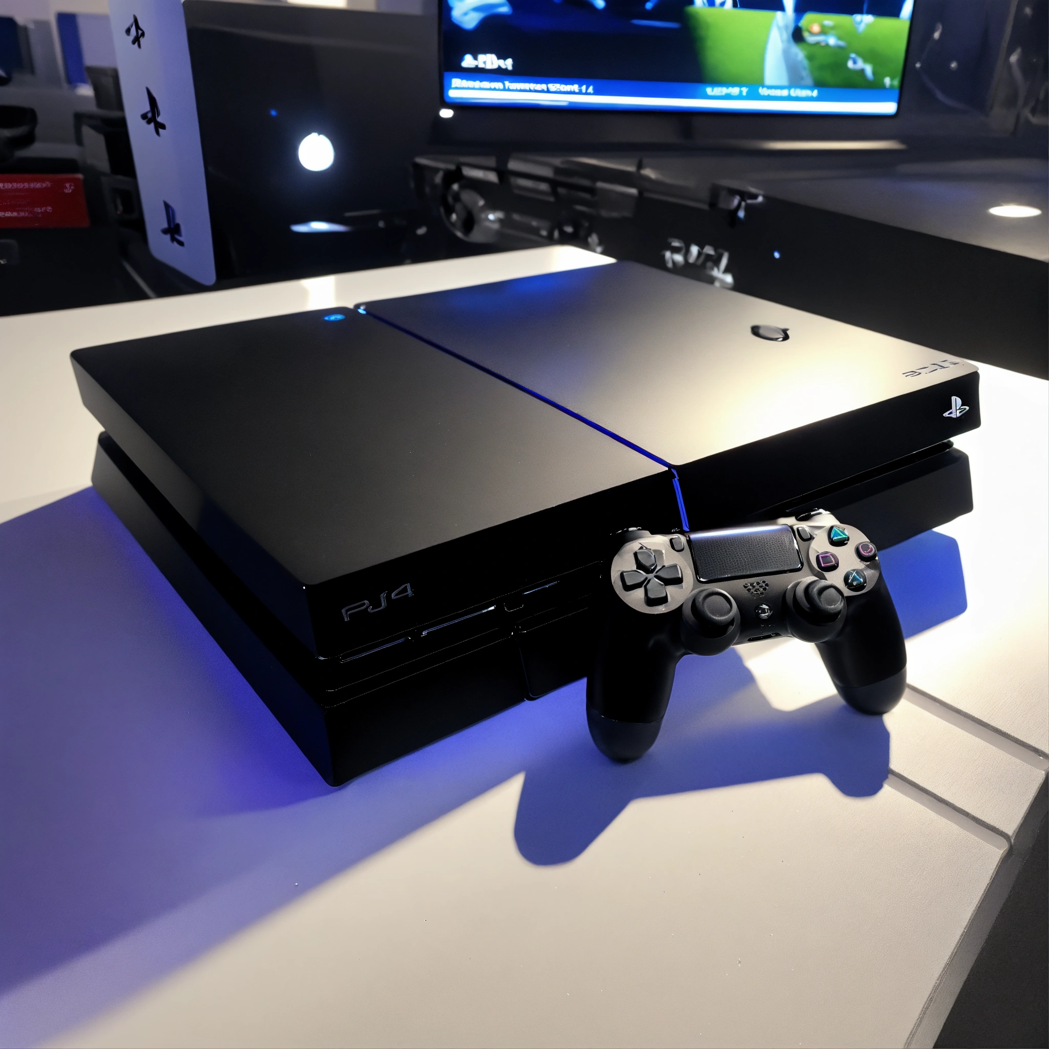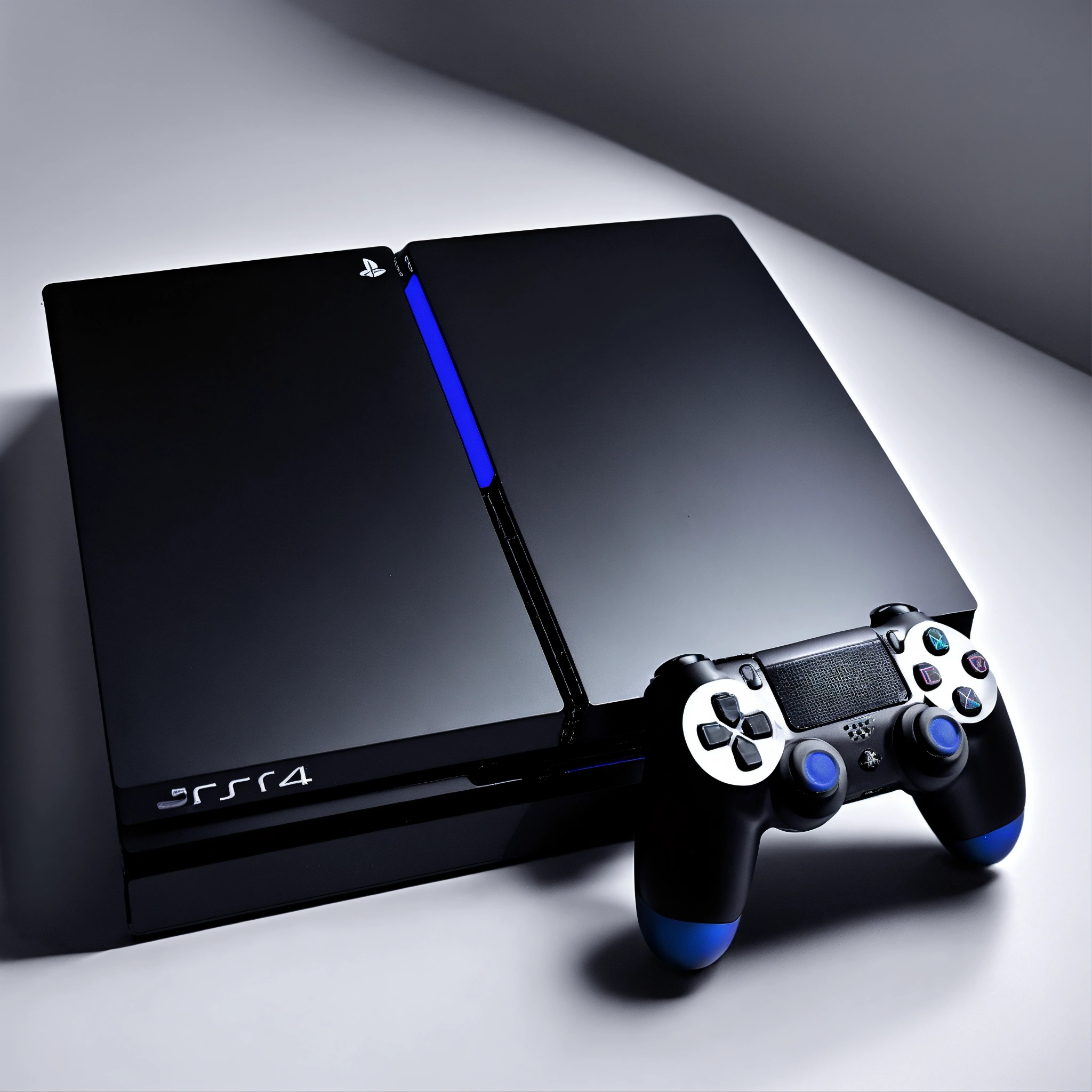 A photo of a playstation 4 console. the console is black, and it is sitting on a white surface. there is a controller next to the console.