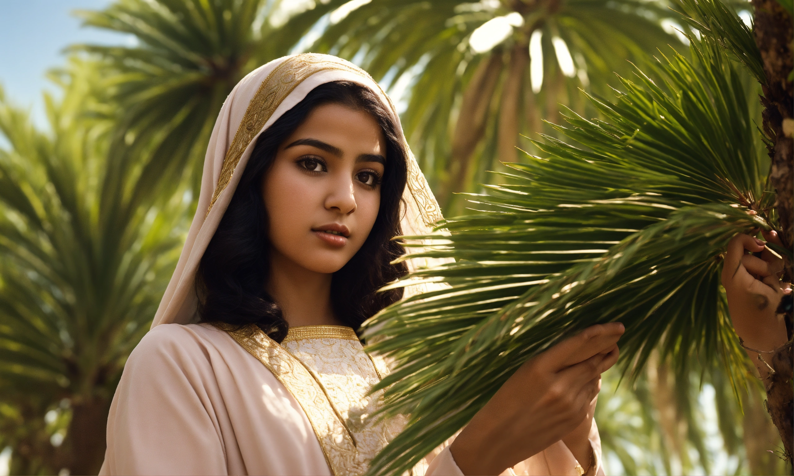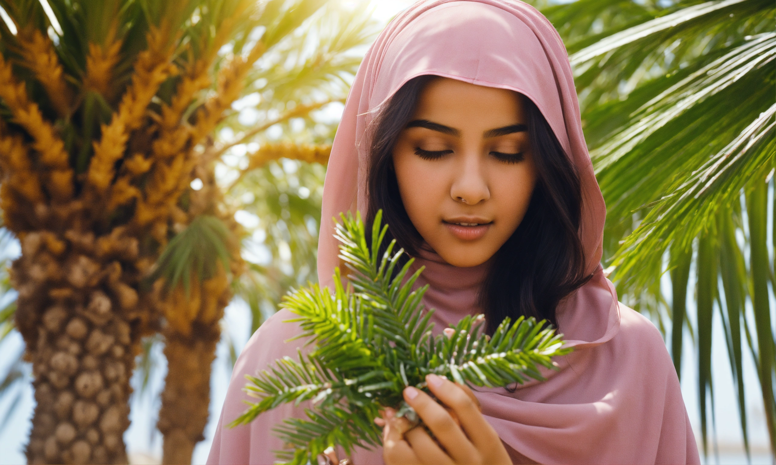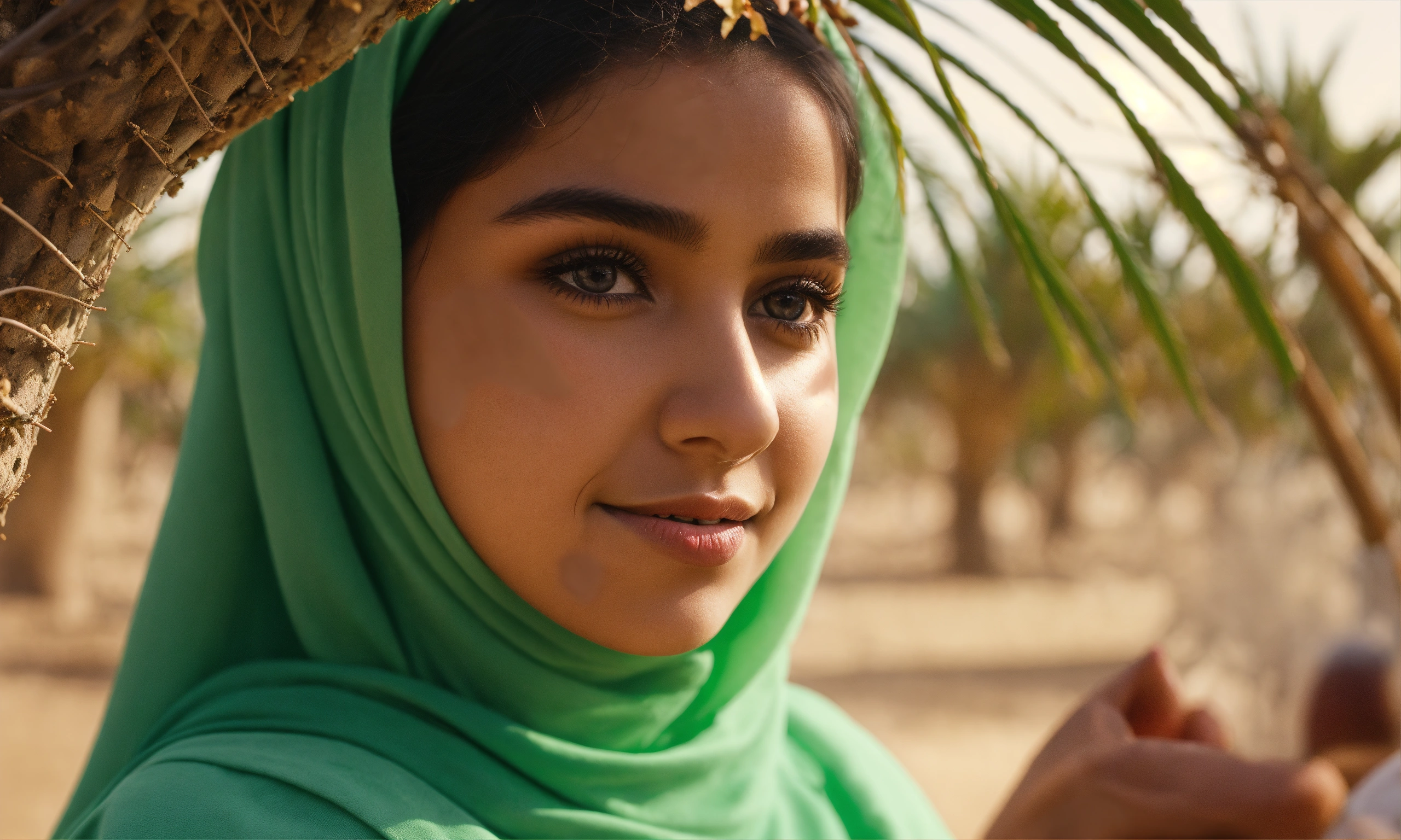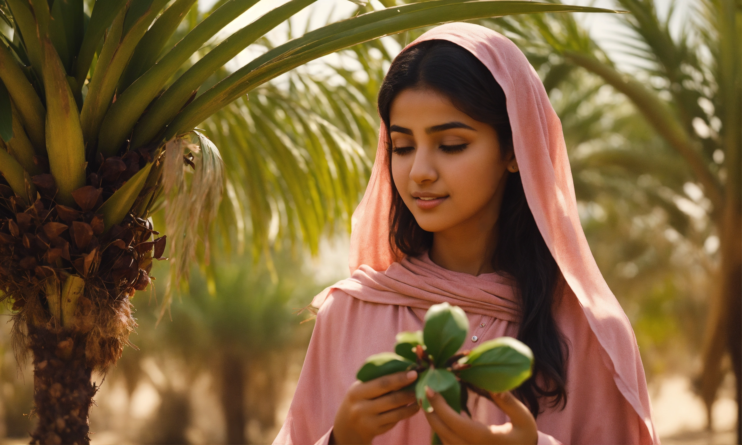 Close up of young saudi girl collecting date from palm tree, greenery environment, photo-realistic, 8k, high definition