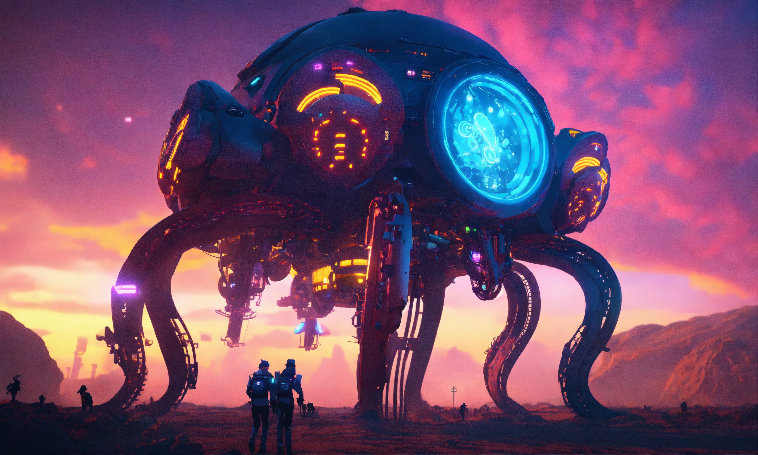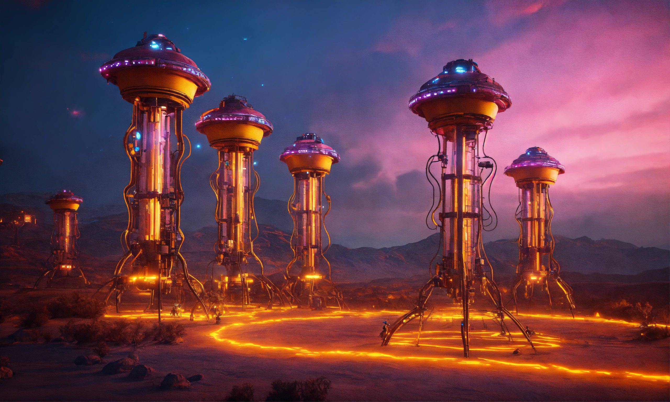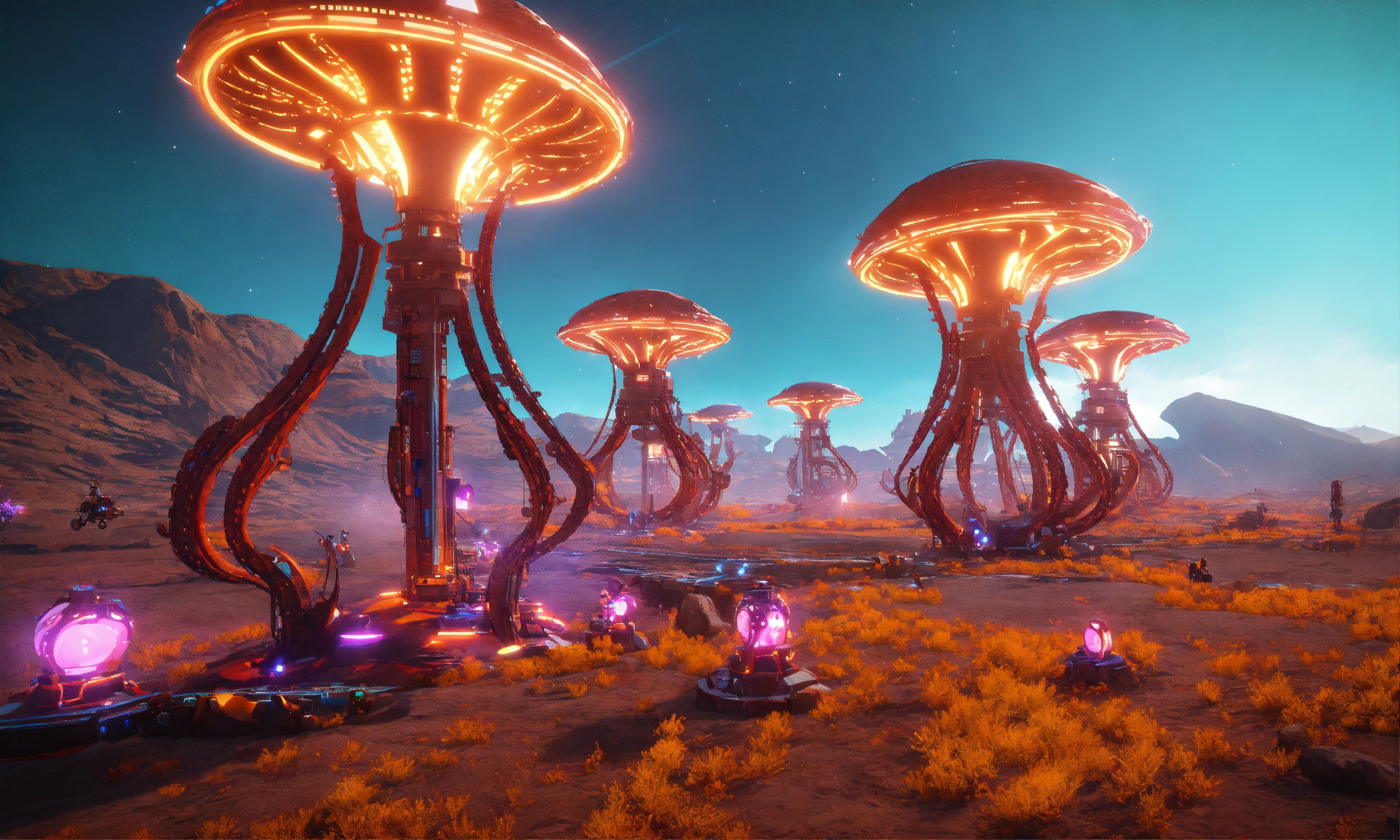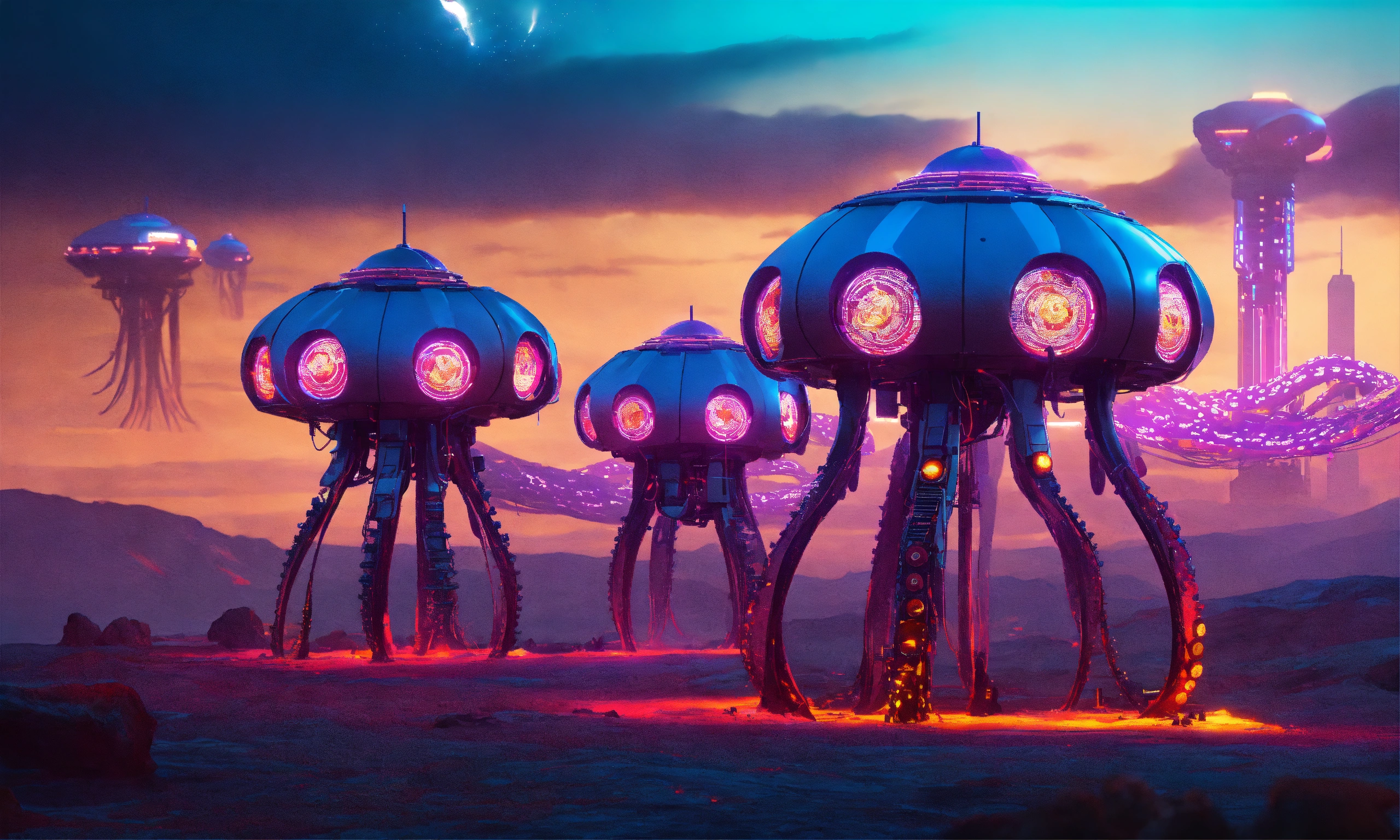 Group of 5 octopus like machine robots flying in the sky with their tentacles in the wind, headed to their base through a barren landscape, unreal engine, 8k, vibrant neon illumination up the tower, quantum processors.
