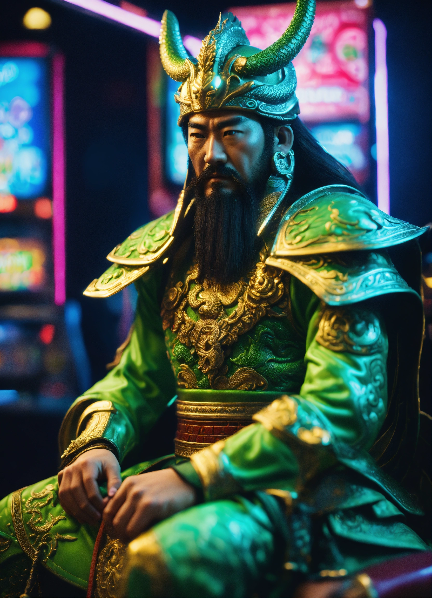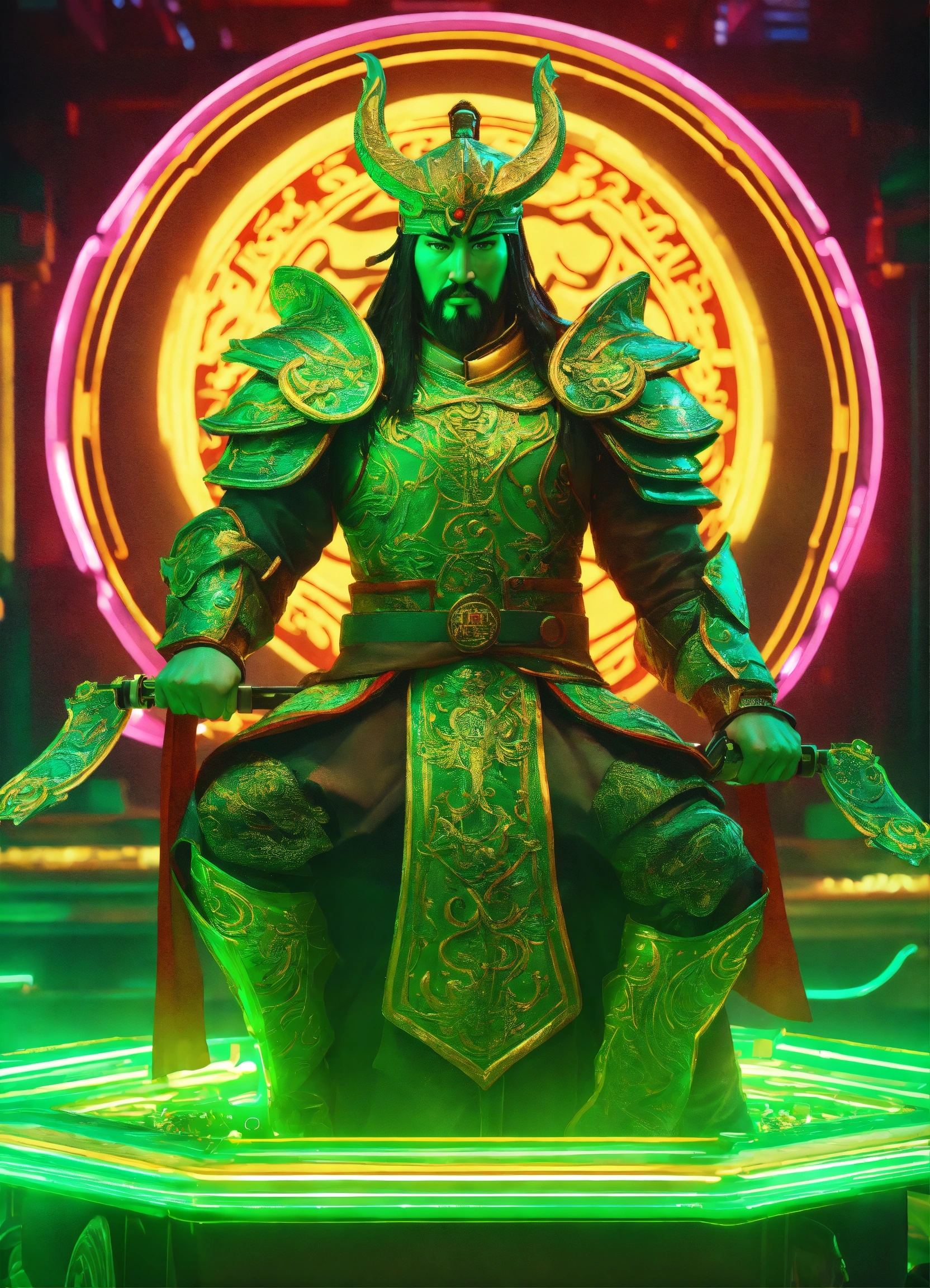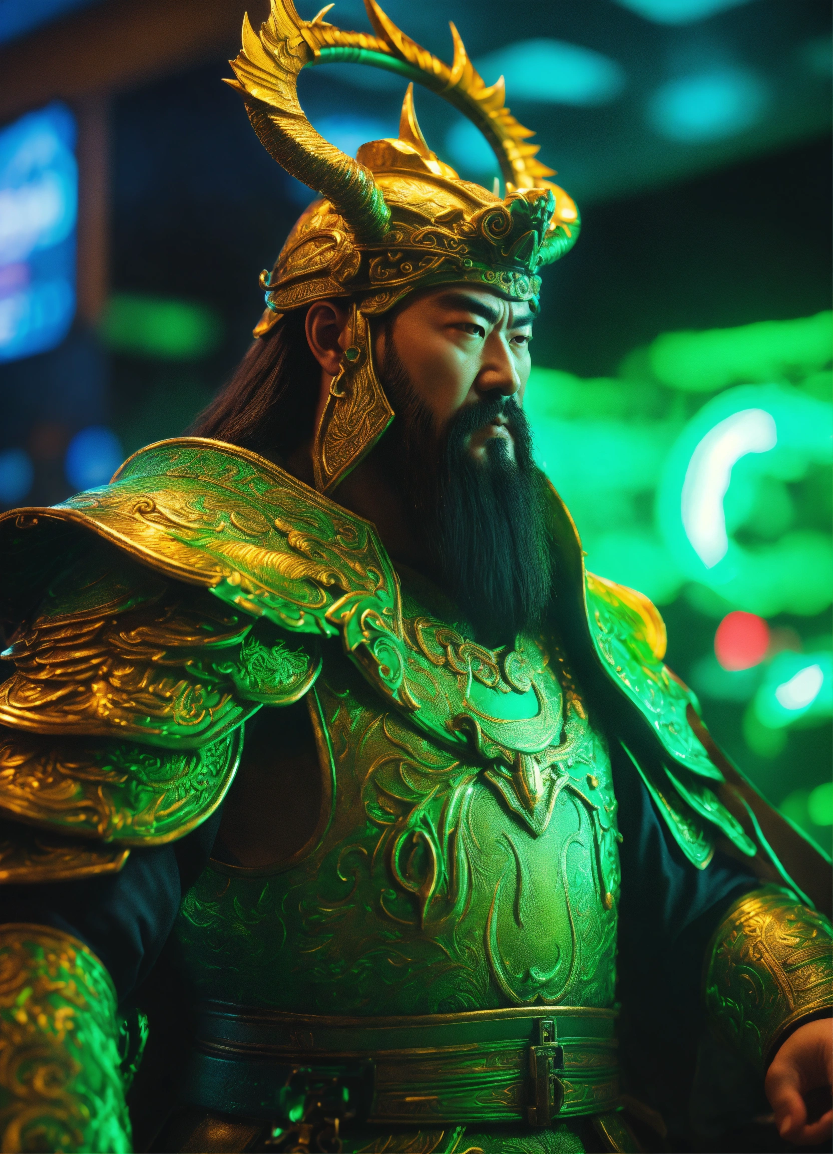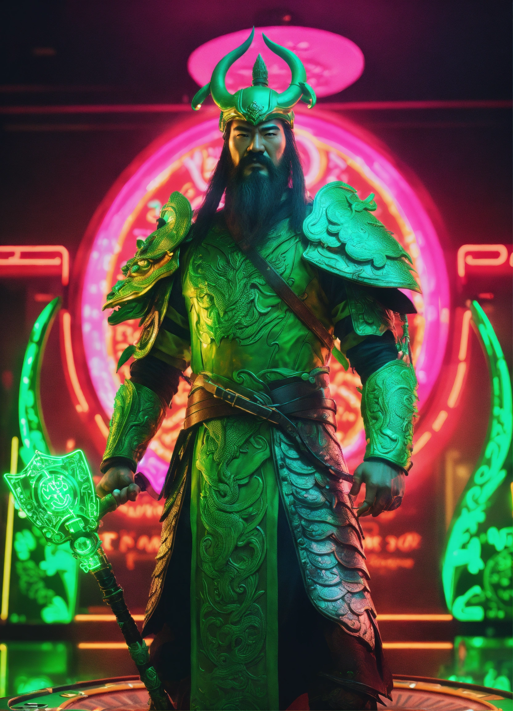 3d realistic handsome guan yu is the god of war wearing his almor futuristic the green dragon crescent blade with hand slot machine casino cyberpunk location, neon light, 8k