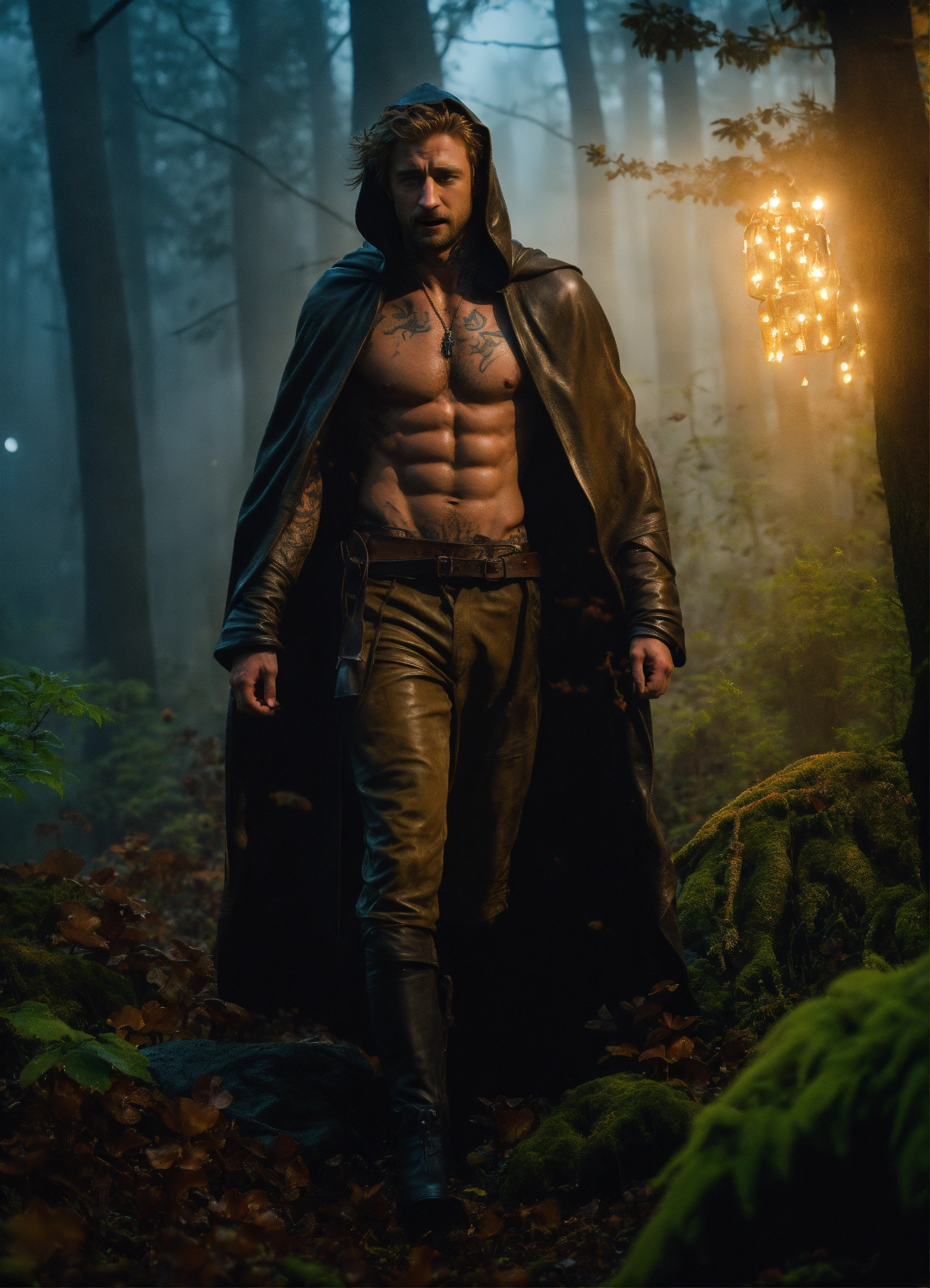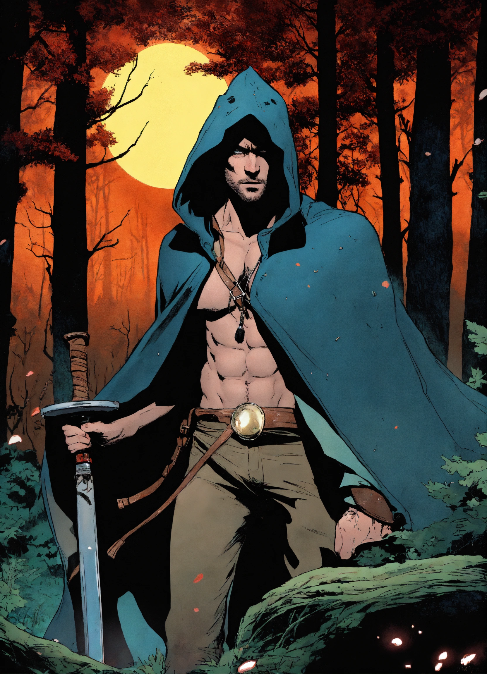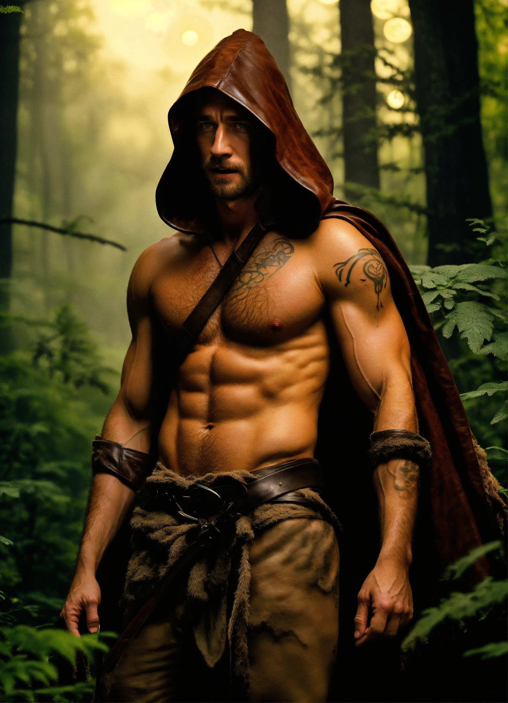 In the style of comic book cover, scott speedman as a thin boney skinny gaunt-faced shirtless hairy-chested tattooed yelling hermit with angry eyes wearing a leather cloak and hood with long salt and pepper hair hunting in a dark foggy forest covered in fungi and moonlight