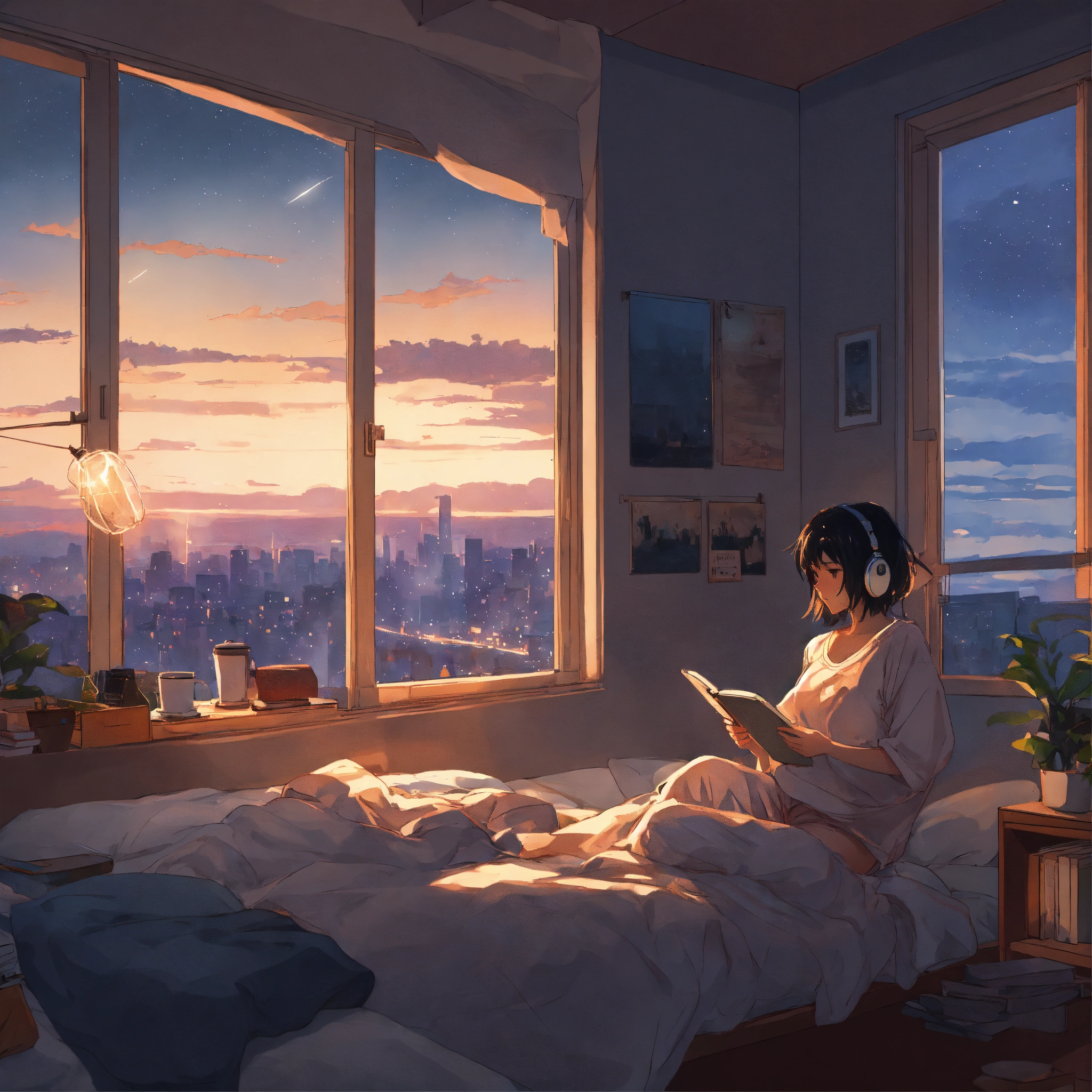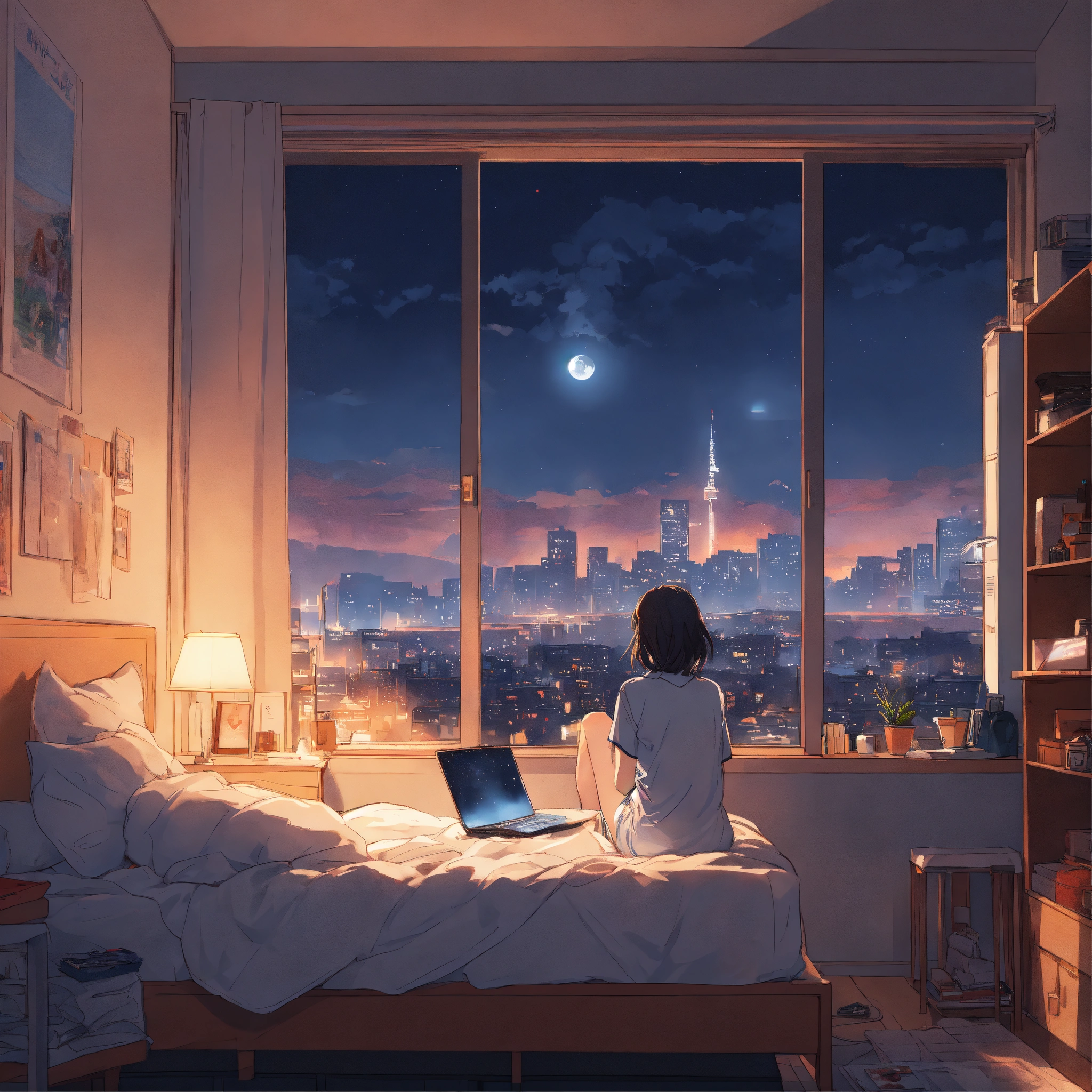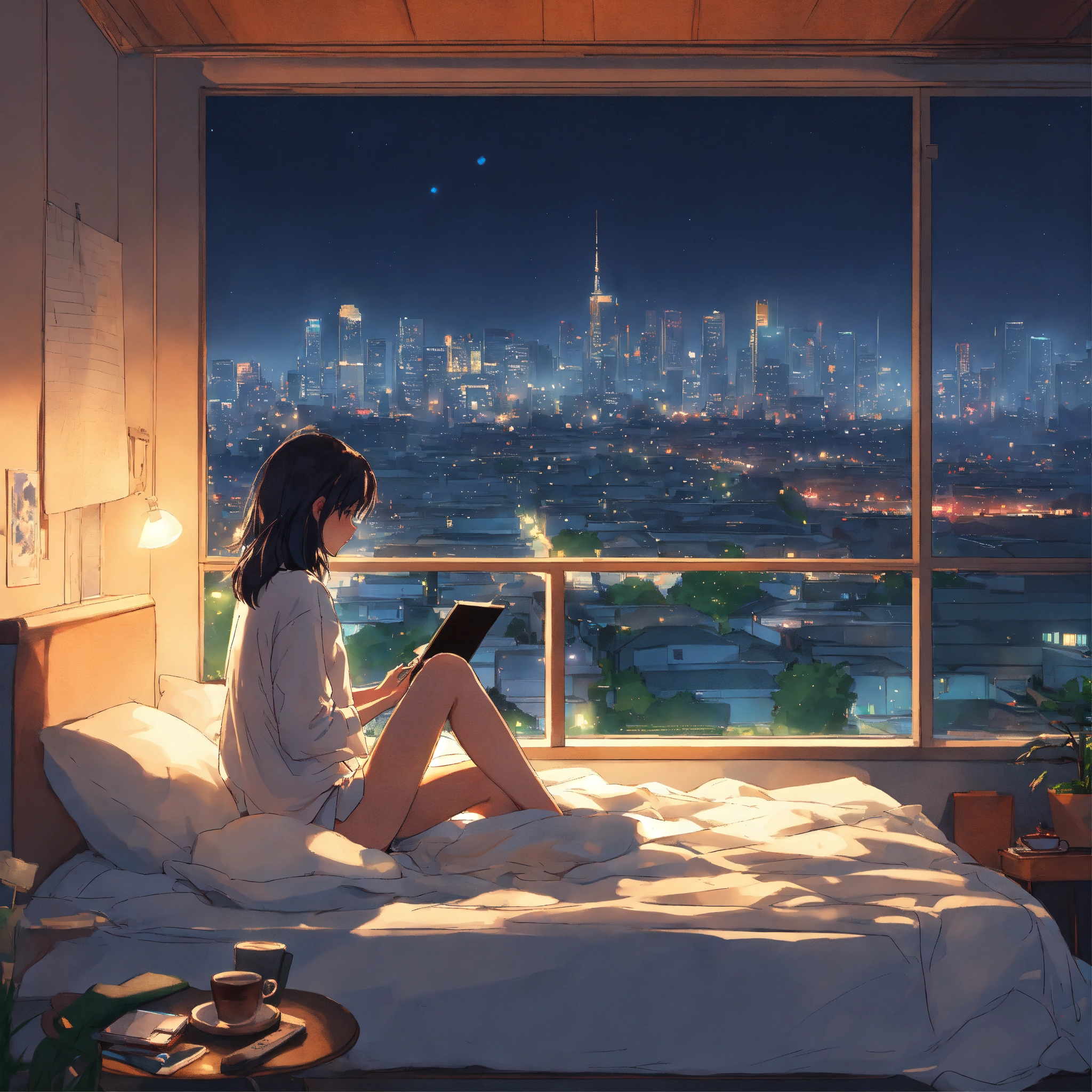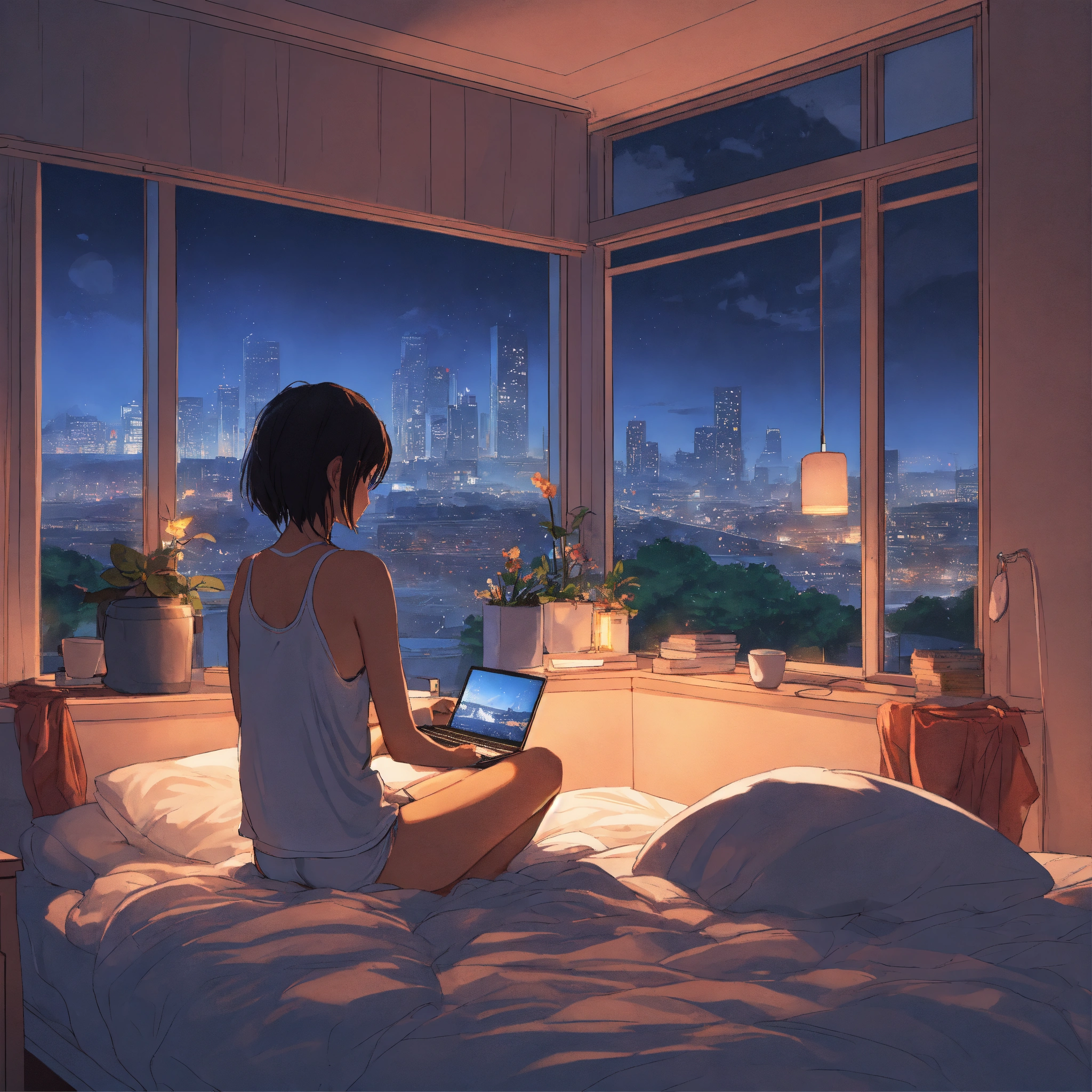 A woman in pajamas in her bedroom, on her bed reading, daydreaming, cityscape, greg rutkowski and makoto shinkai, night sky, rgb lights, downtown, hot pants, sports bra, coffee, lit laptop screen all white, bed room furniture, cozy, looking out of the window, dim light in room