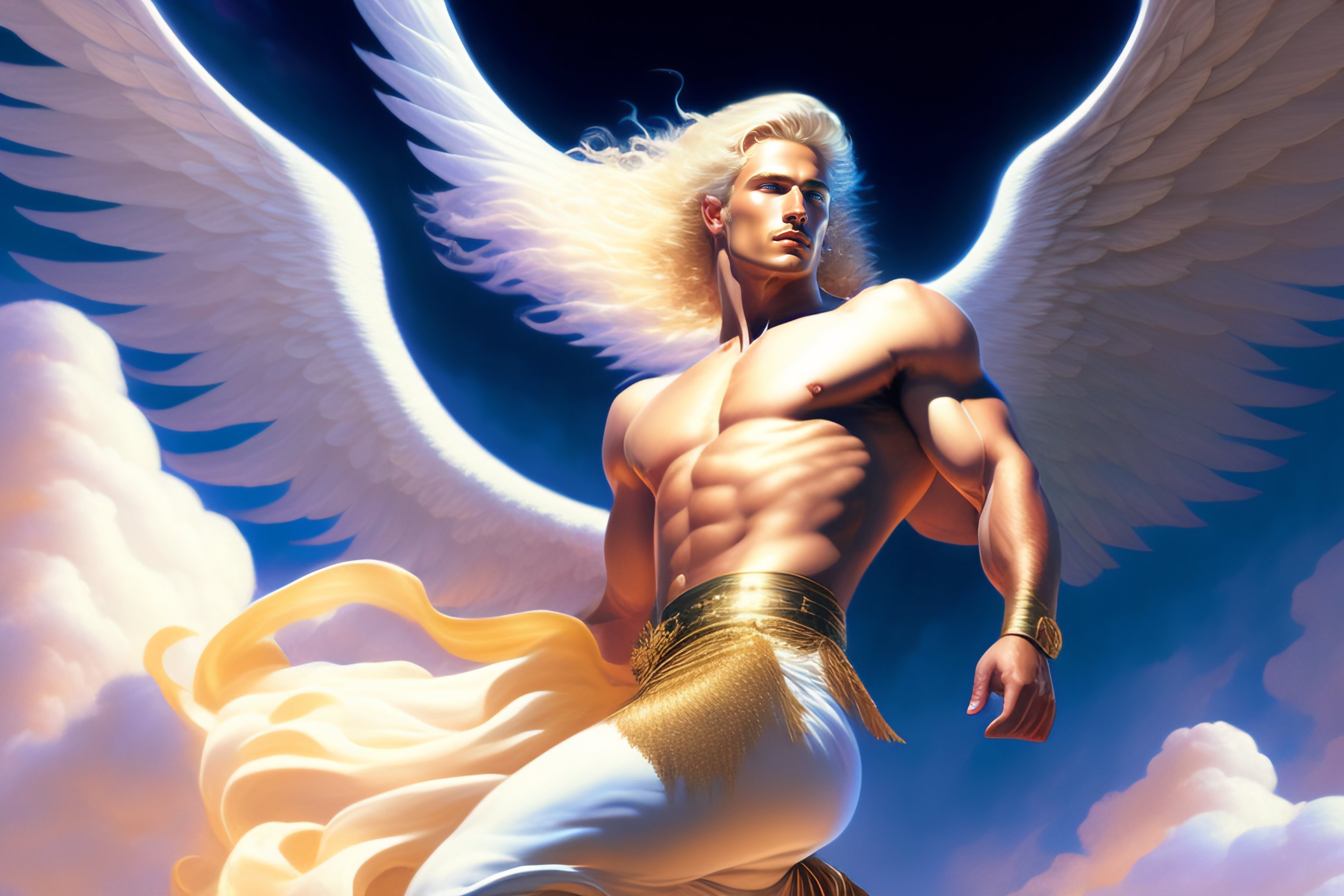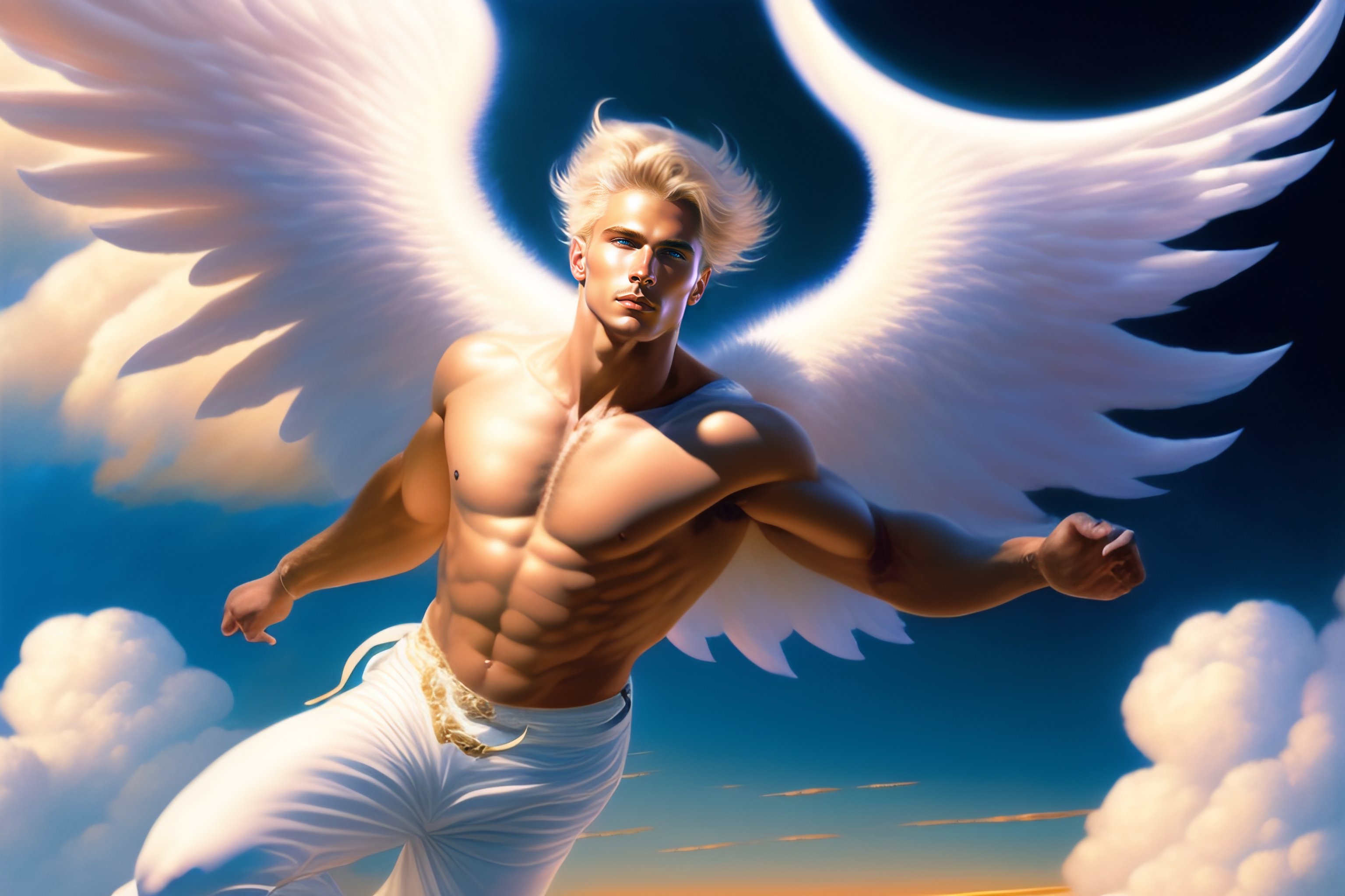 A male angel flying and dancing among the clouds, blond hair, in the center of the images, hyper realistic, ultra realistic, intricate, dynamic, white pants, 8k, art by moebius and greg rutkowski and gilbert williams, plain background, comic cover art