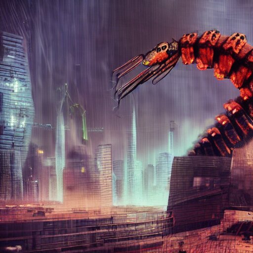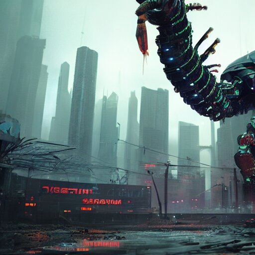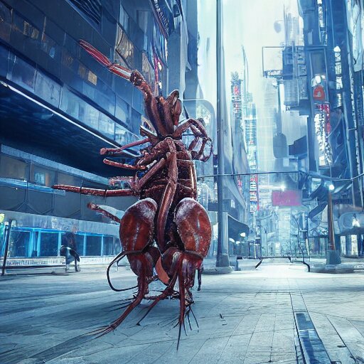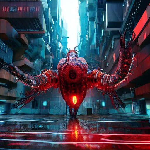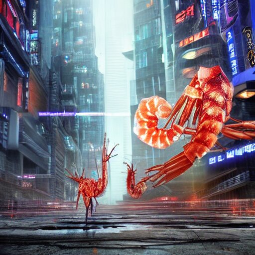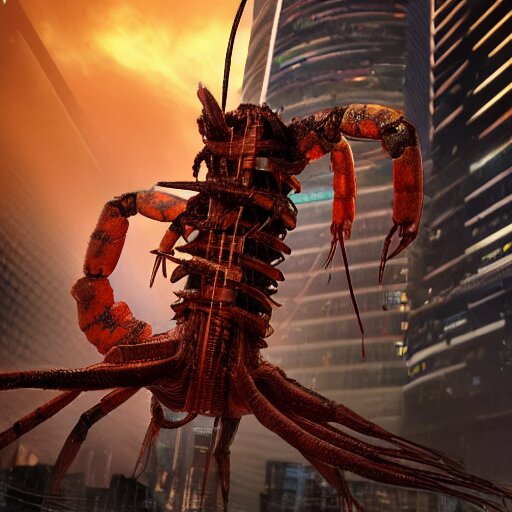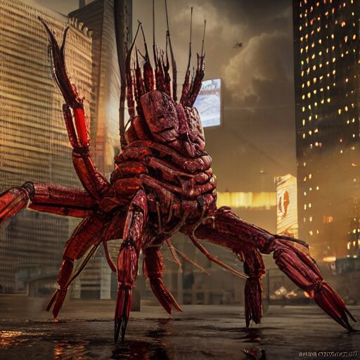 A giant terrifying cyber shrimp standing in a dystopian city, cyberpunk, dystopian, god, evil, villain, sharp focus, dynamic lights, still, photograph, hyper realistic, masterpiece, octane render, rendered, 3 d, cinematic, cinematic lighting, dramatic lighting, highly detailed, intricate details, texture, cinematic composition, by donglu yu and kevin jick and eddie del rio