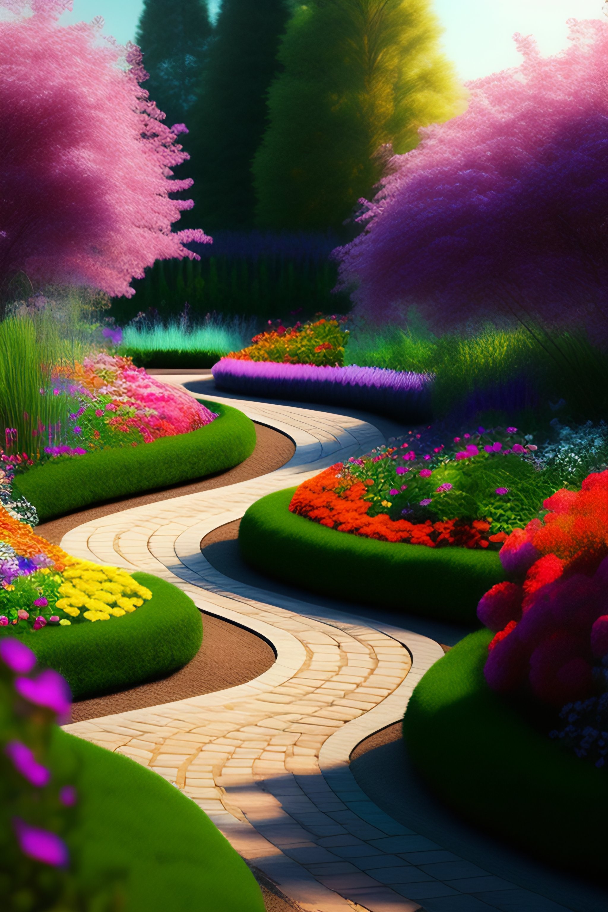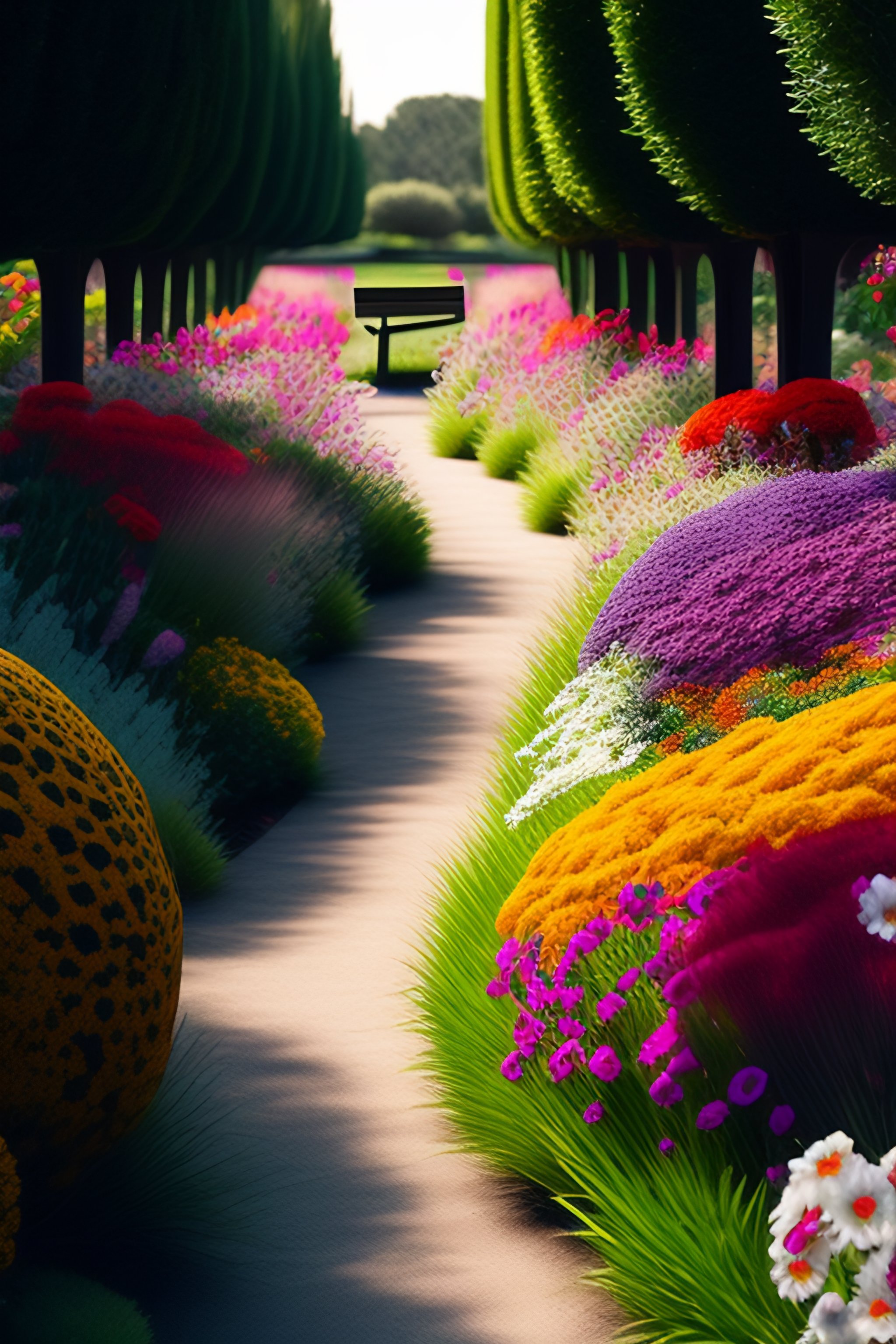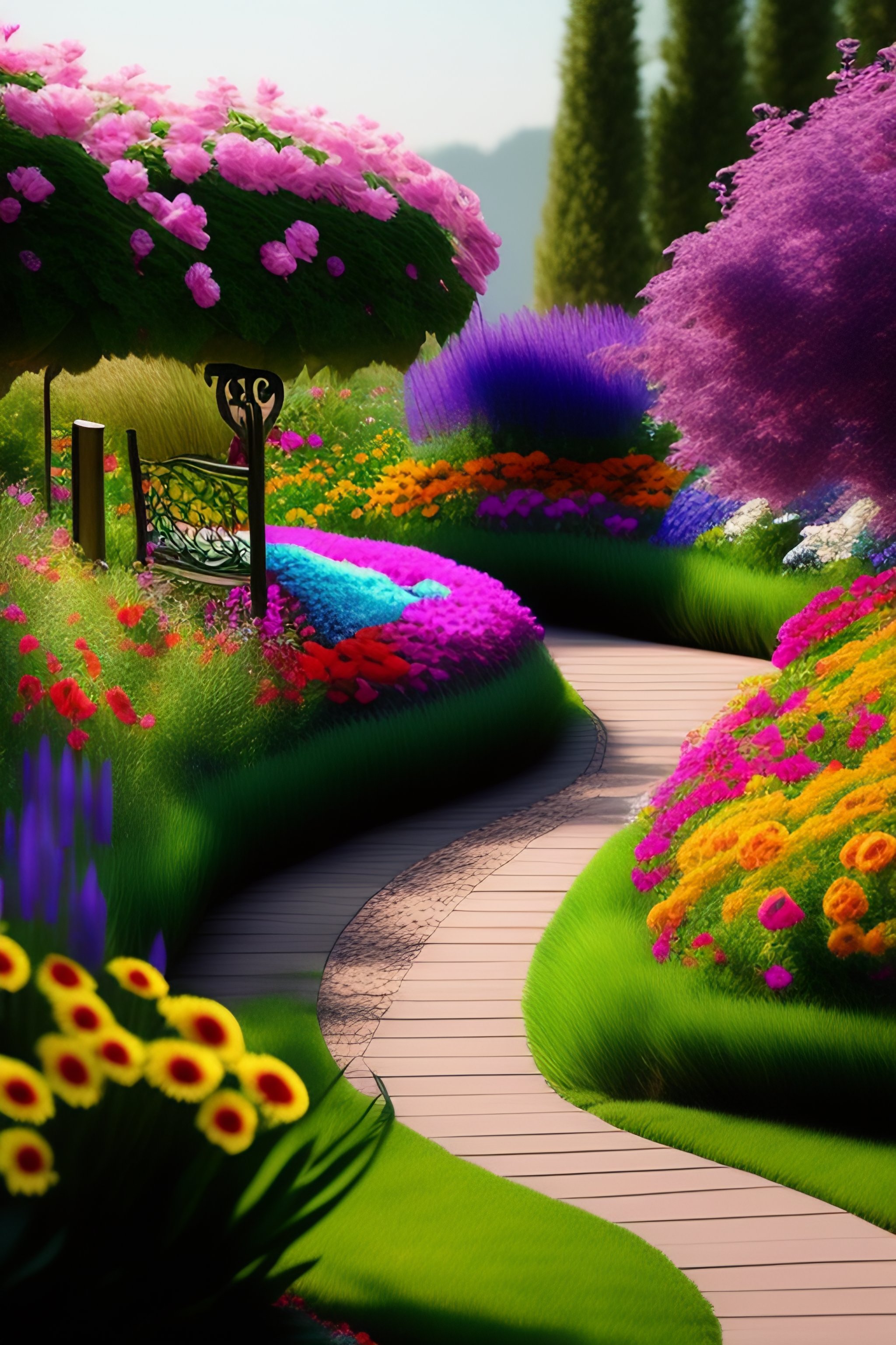 Create a blinking photo of a colorful flower garden with a bench and a path winding through it