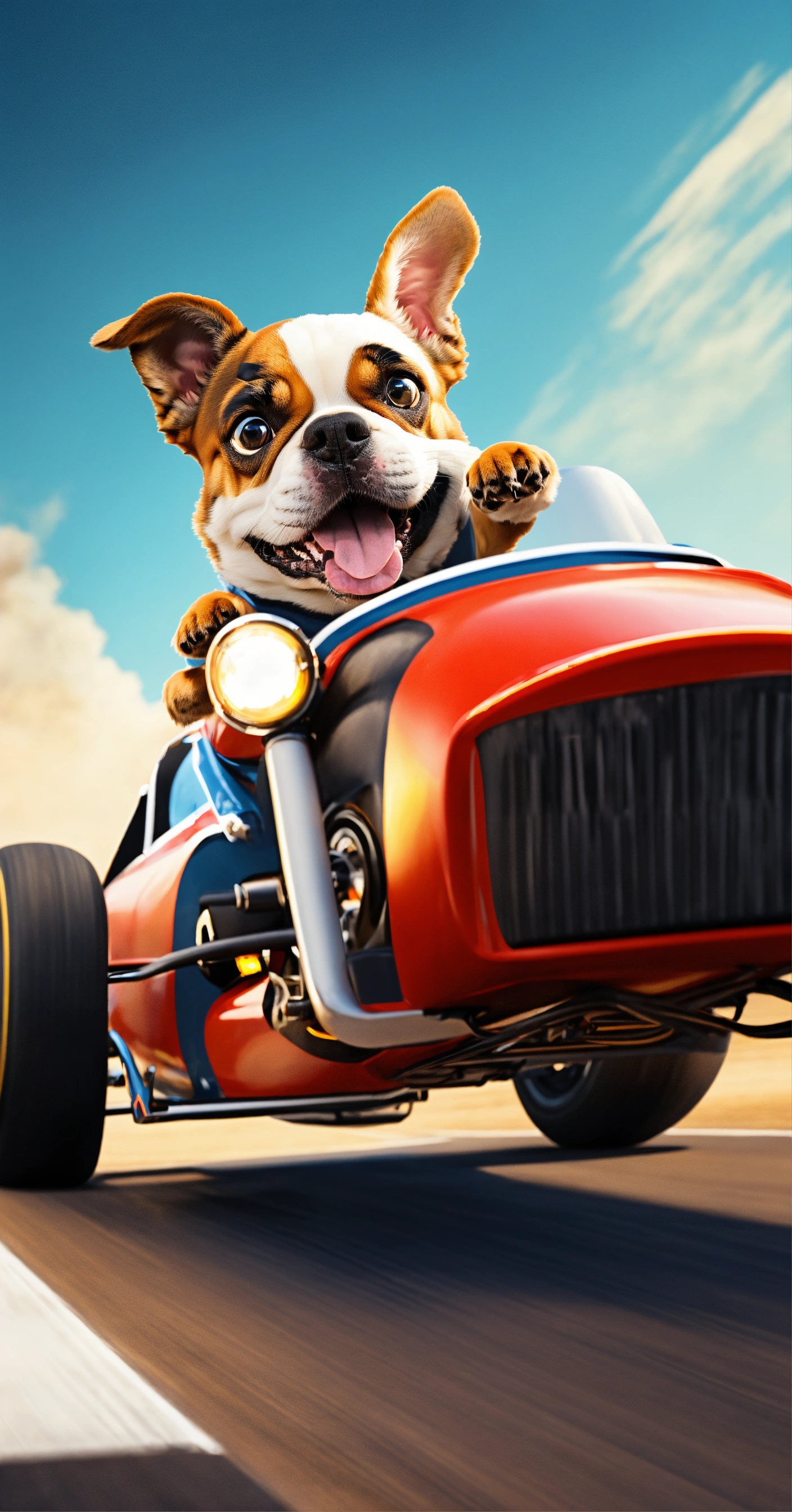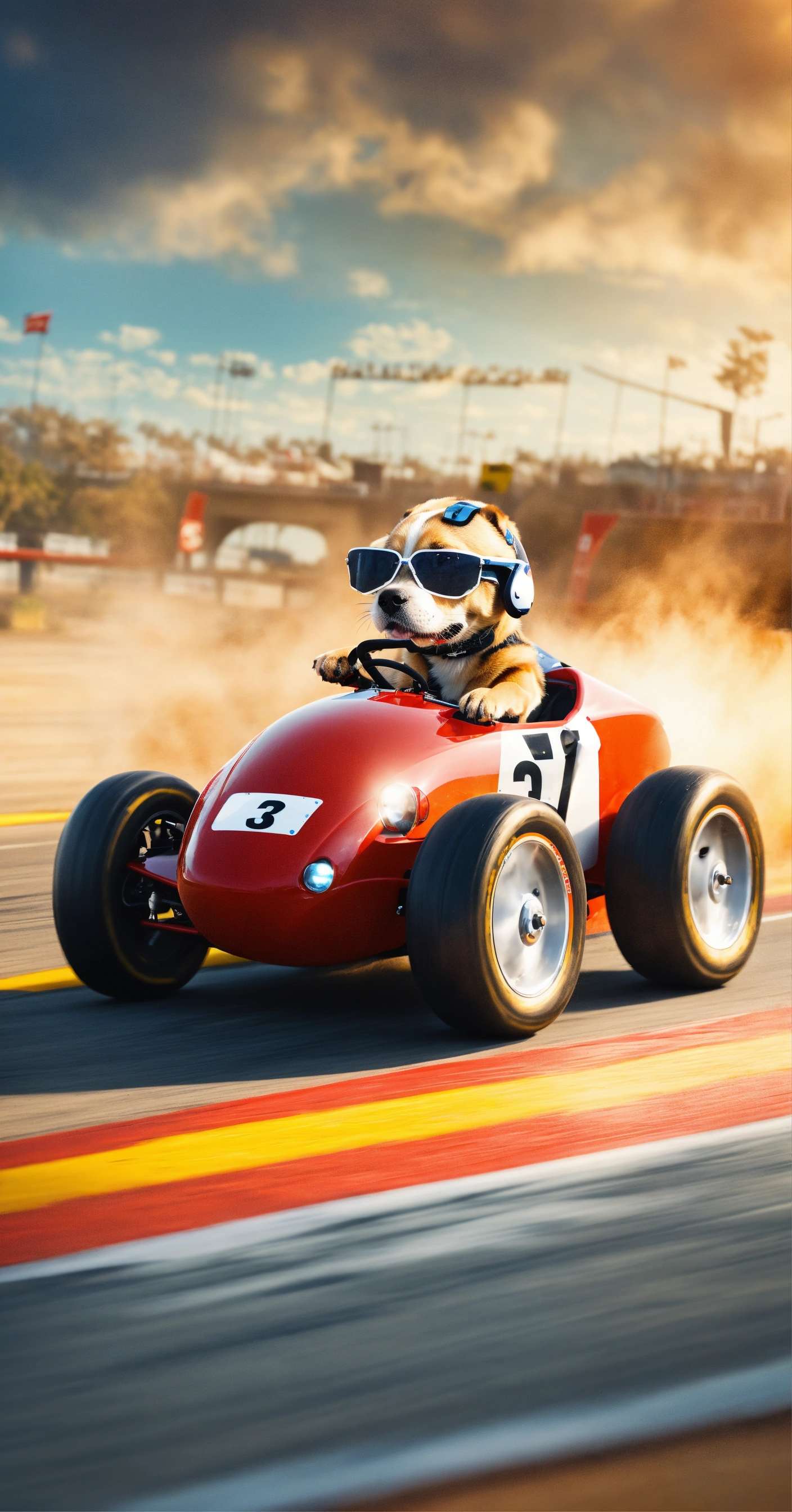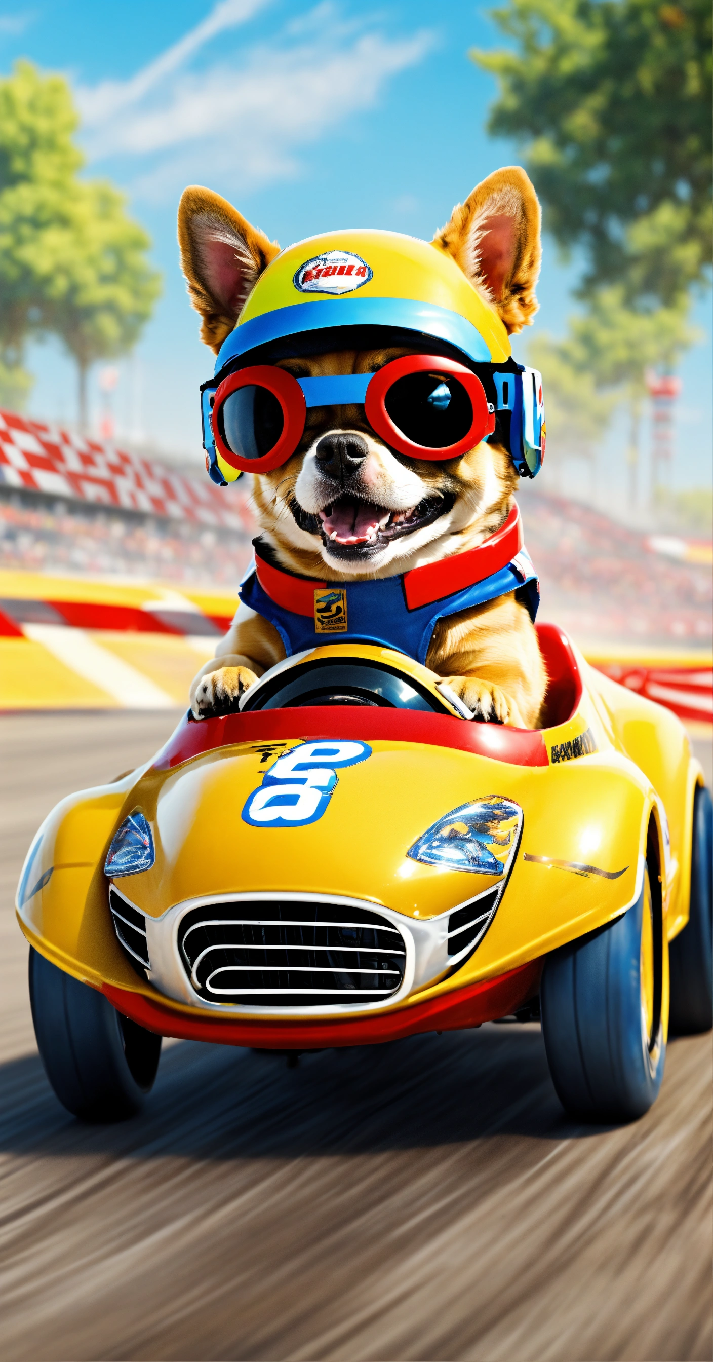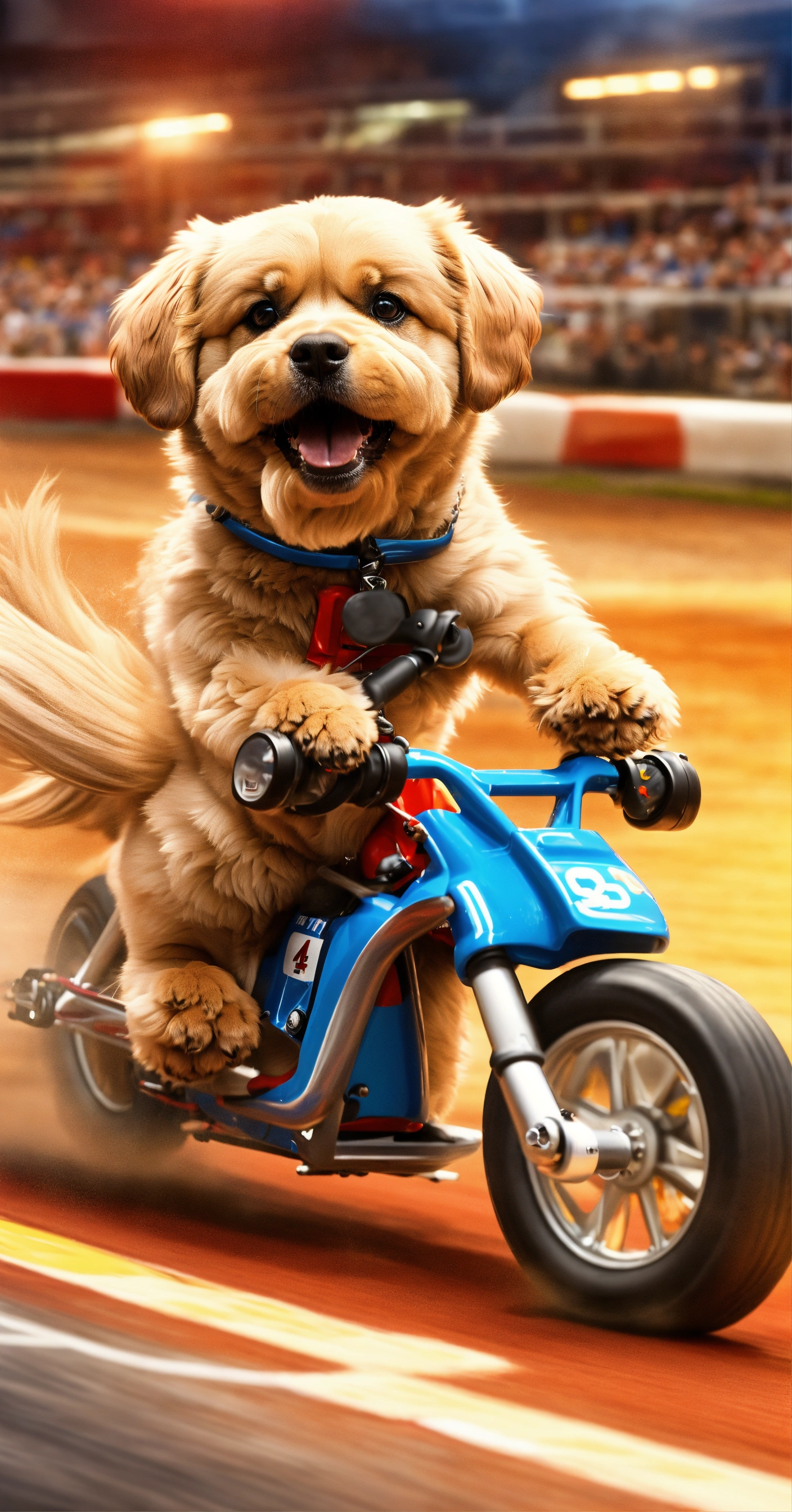 Create a picture of a dog as a fearless race car driver, competing in a high-speed miniature race car bike on a thrilling racetrack.