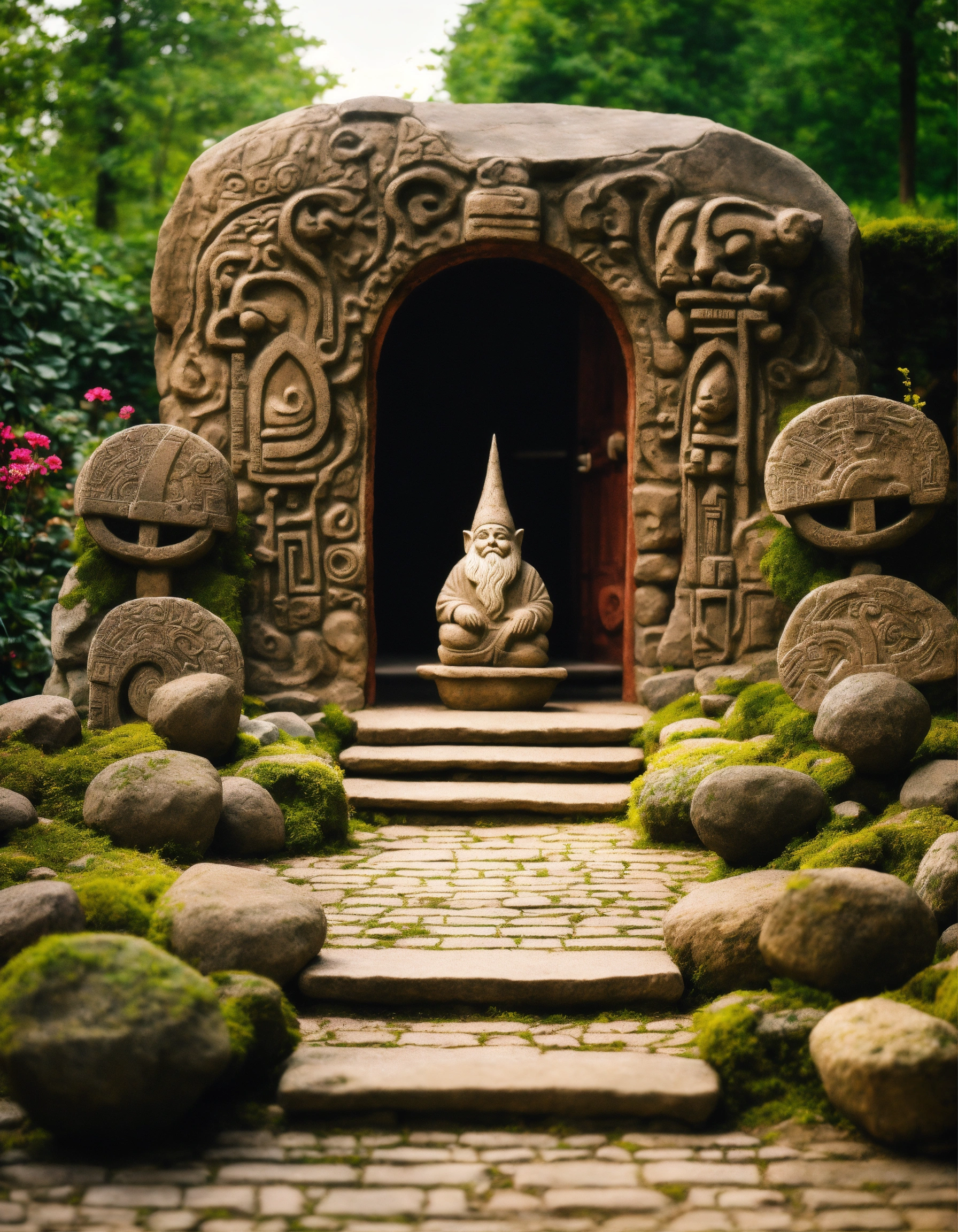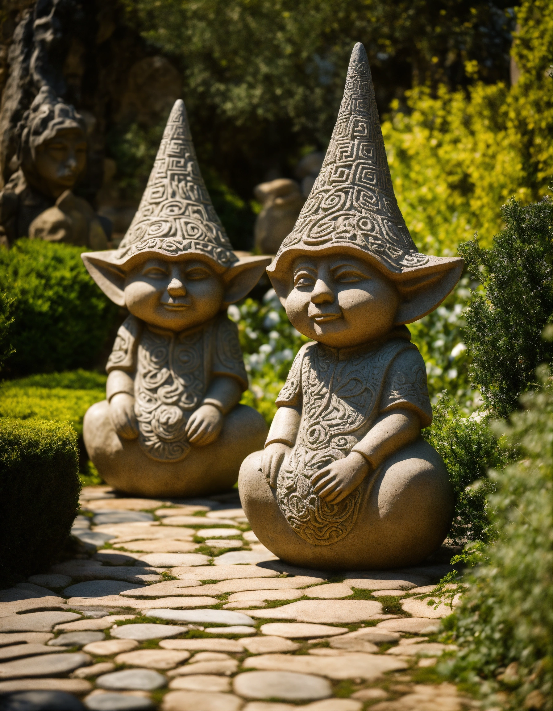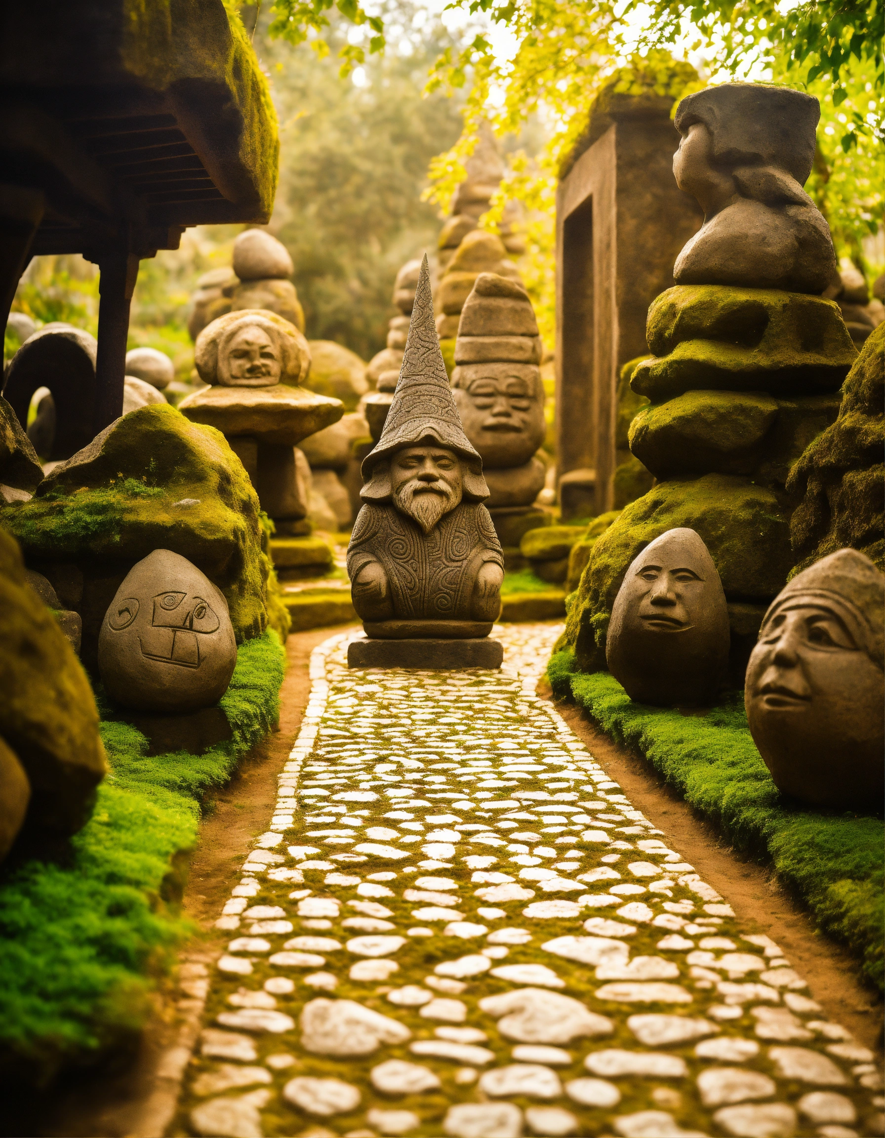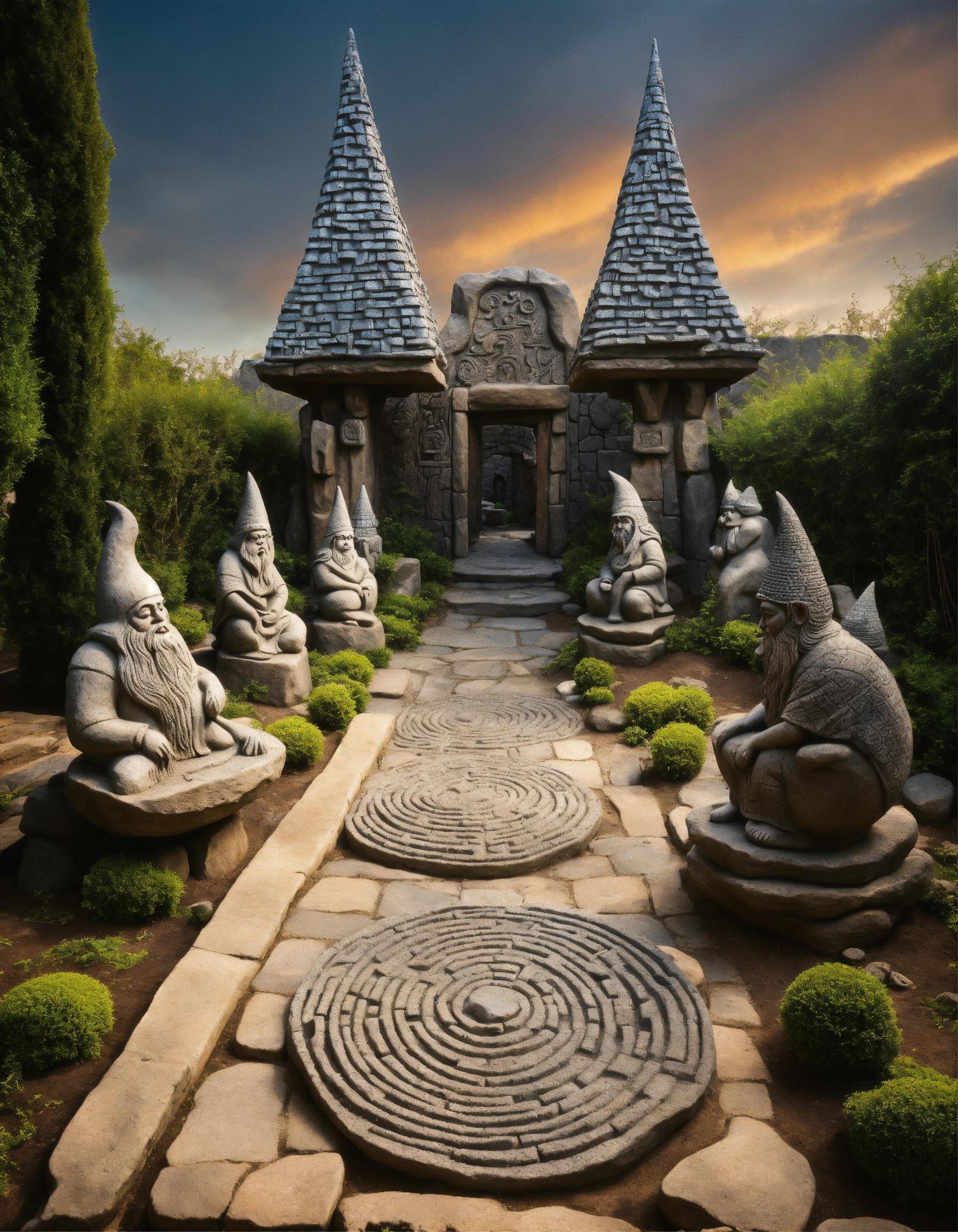 An ancient spiritual hooded gnomes stone pathway rock garden.sculptured . style of alex grey, giger.totem sculptures. patterned stone winding pathway, labyrinth.courtyard.meditative.