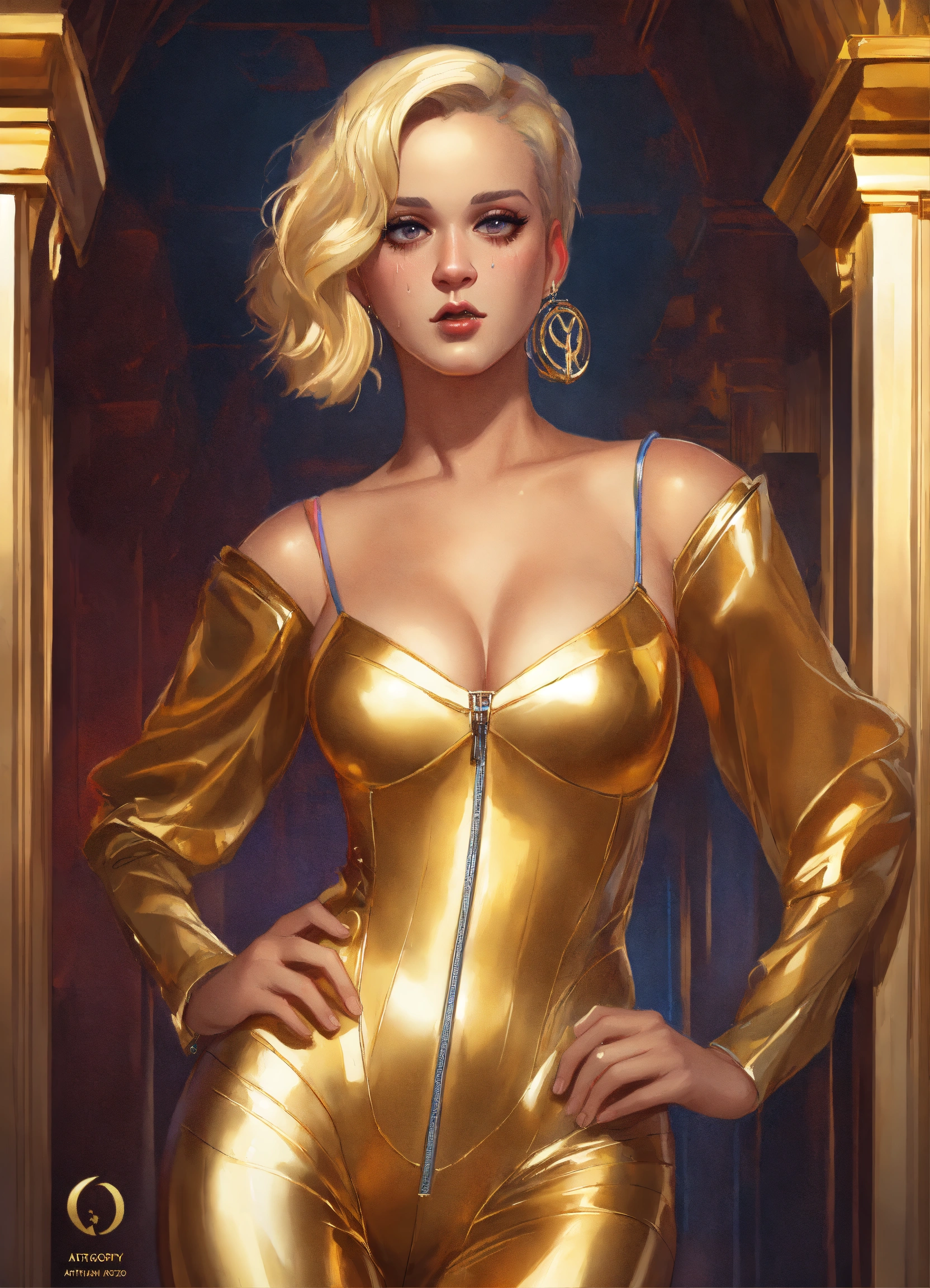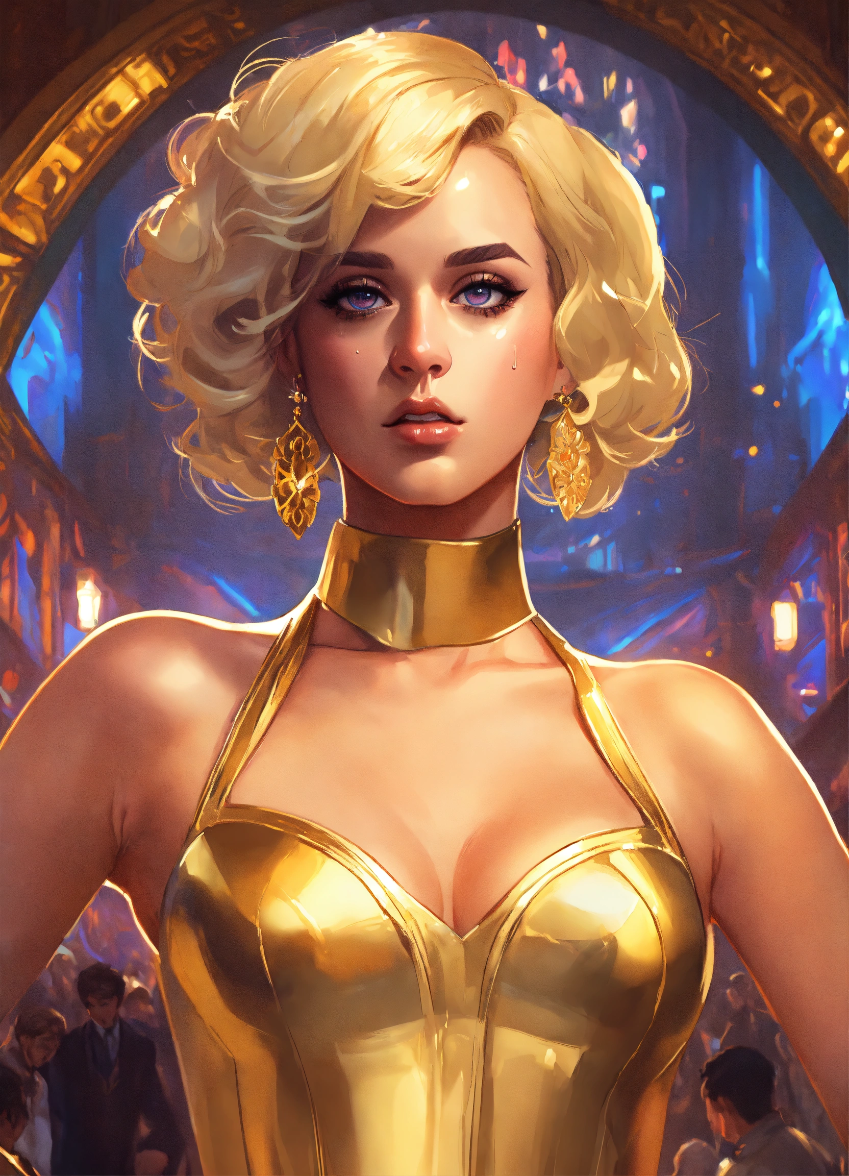Katy perry, skintight gold clothing, big proportions, sweating, blonde hair, goth, nightclub setting, highly detailed, digital painting, artstation, concept art, smooth, sharp focus, illustration, realistic, art by artgerm and greg rutkowski and alphonse mucha and william - adolphe bouguereau