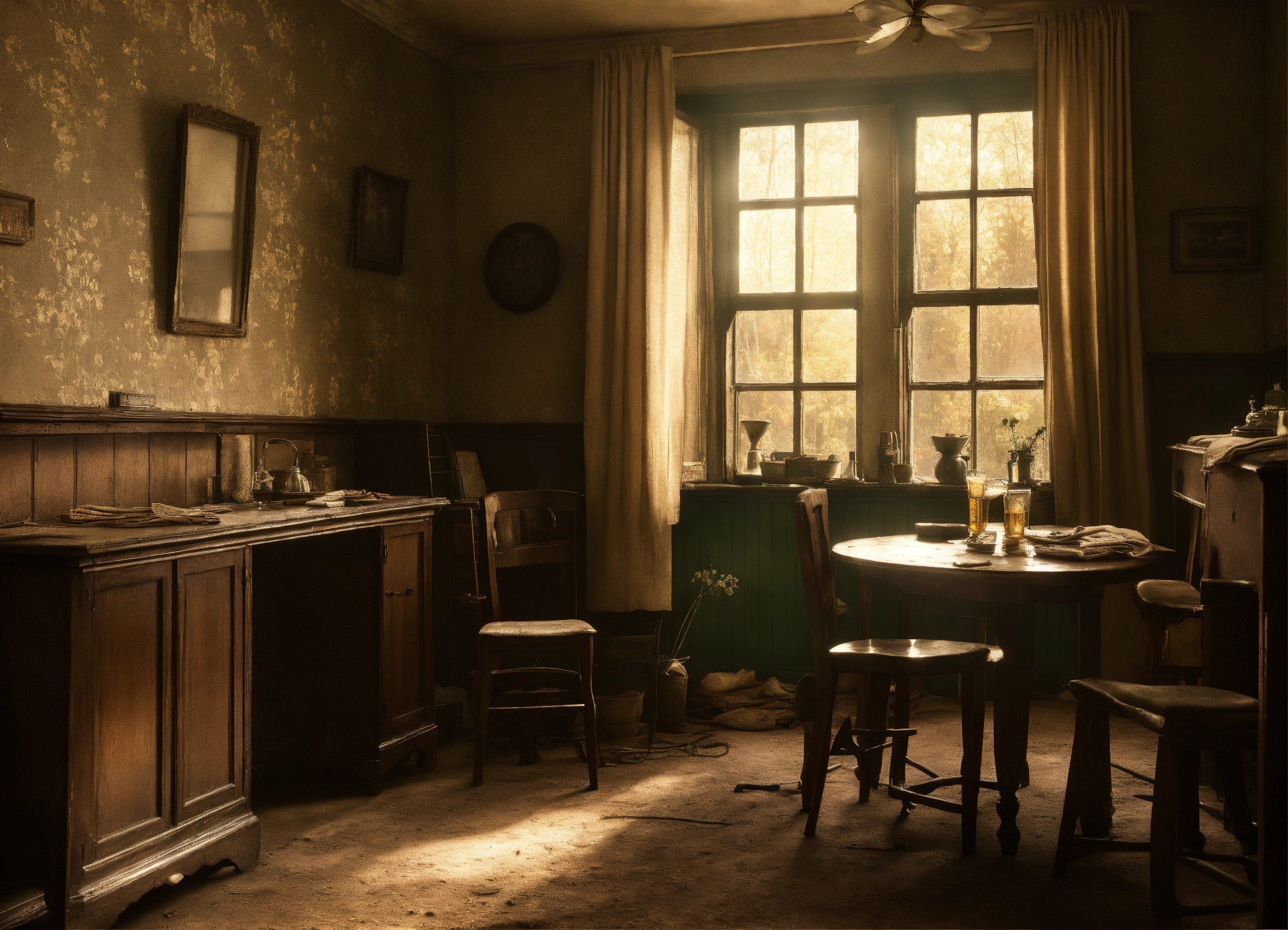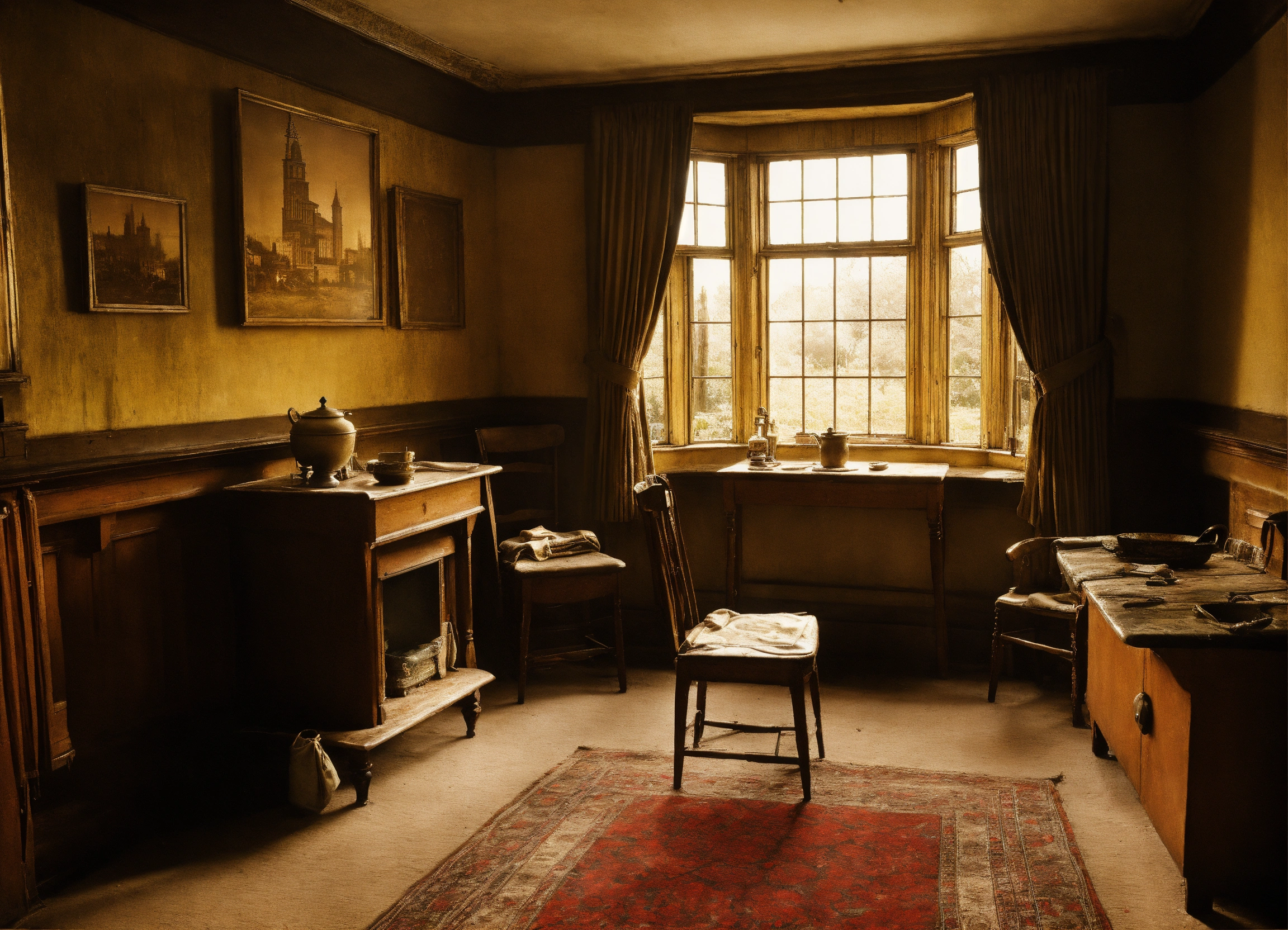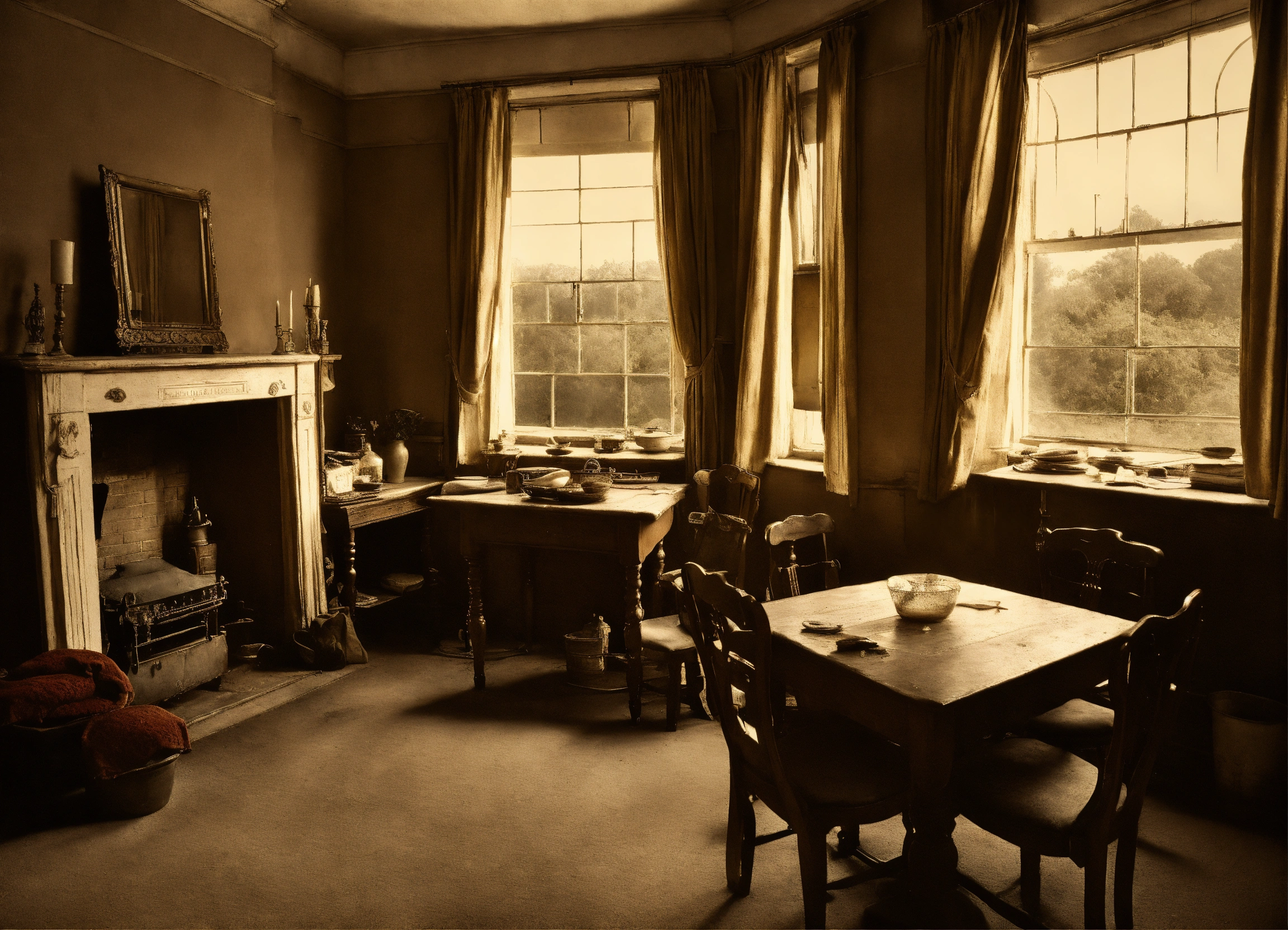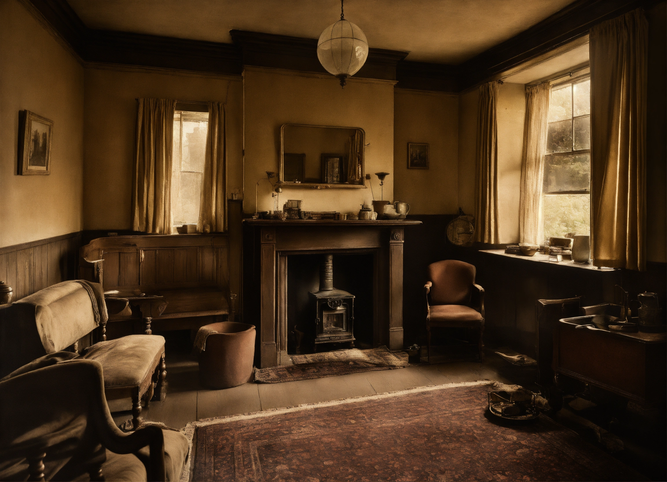 Birmingham residence house interior in druids heath in the 1950s, aged, poverty, after the wwii, musky, realistic, moody, sepia.