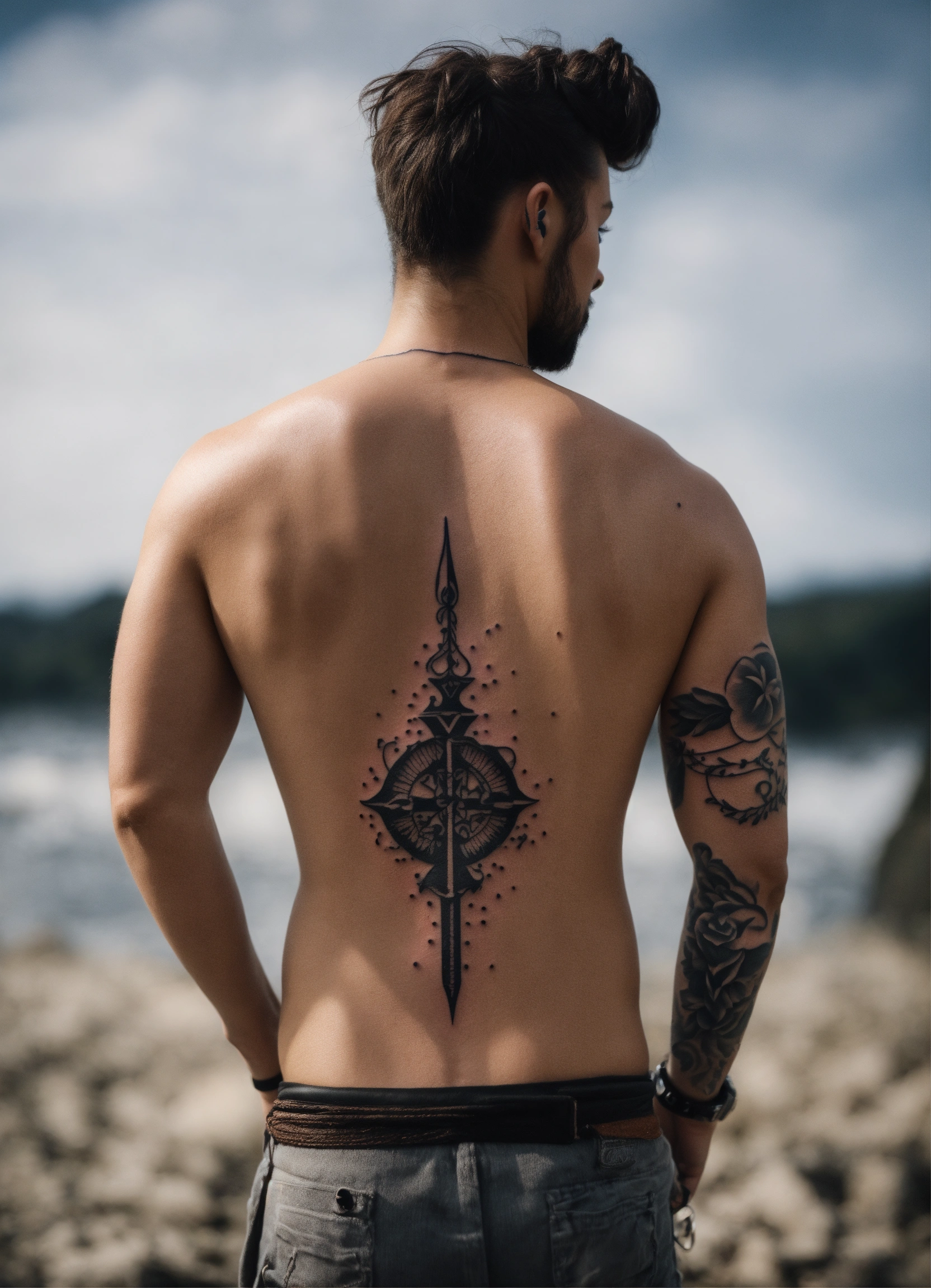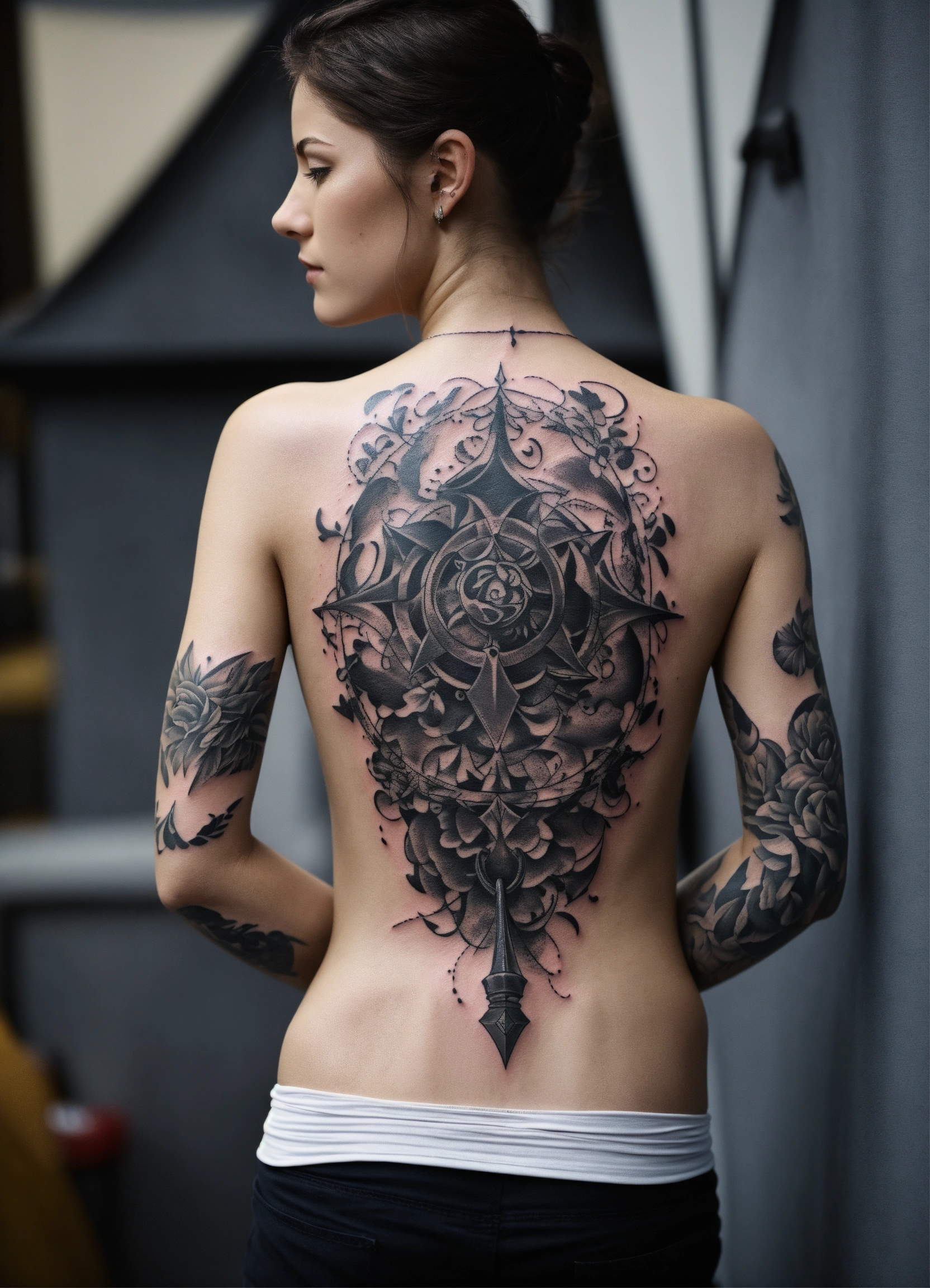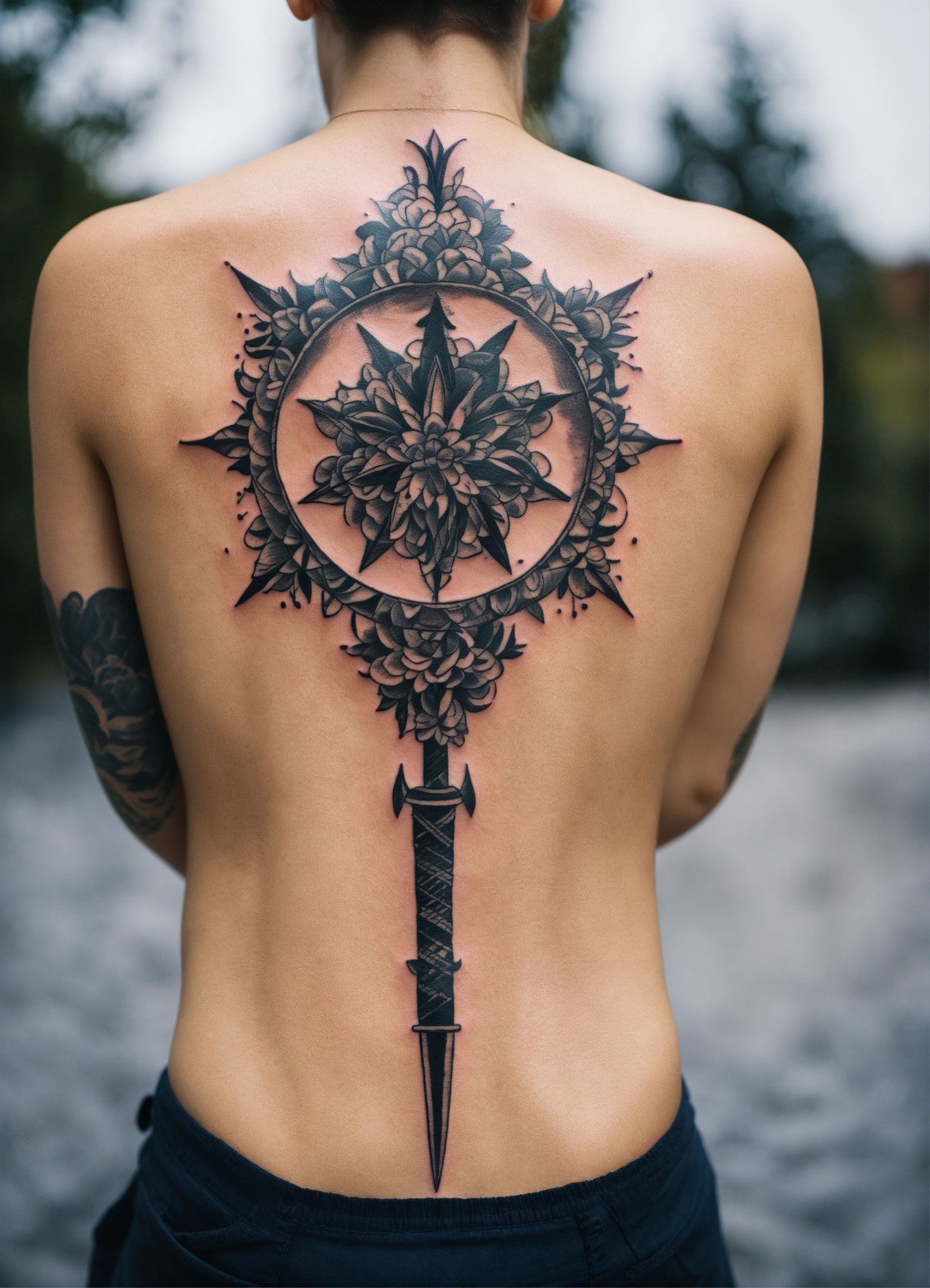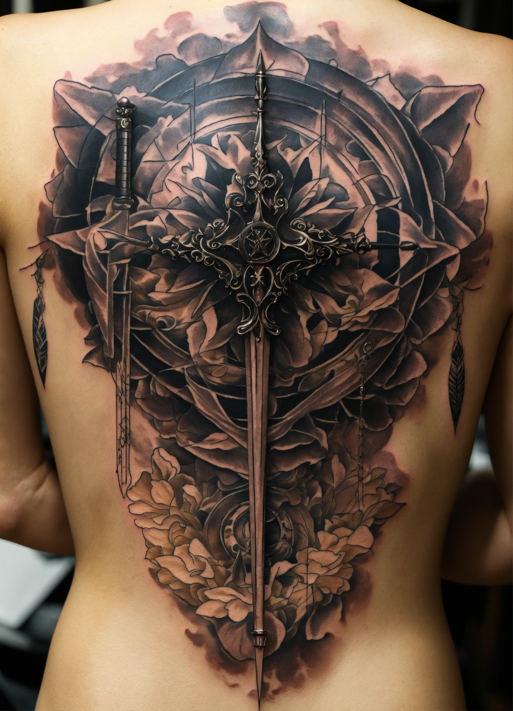 Rücken tattoo mit einem samurei mit schwert in schwarz weiss