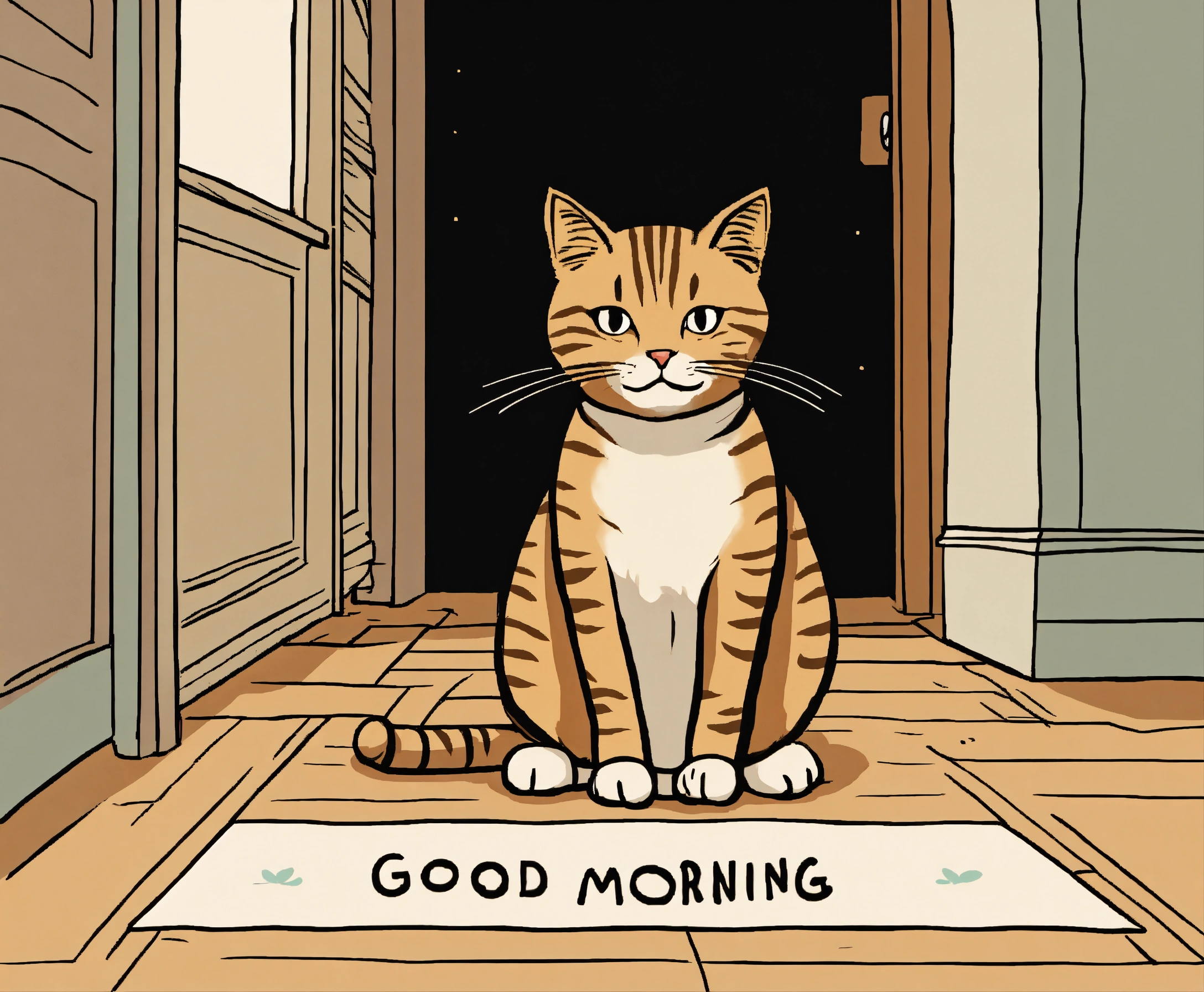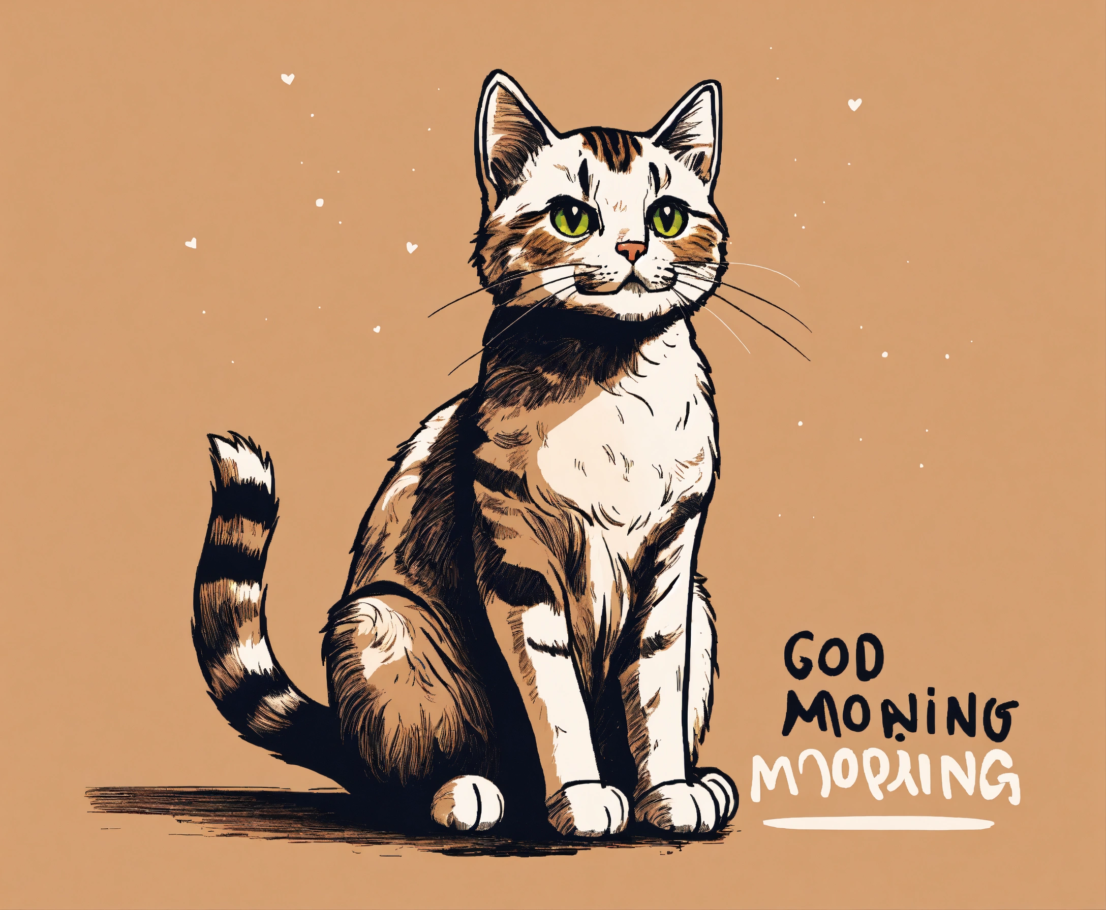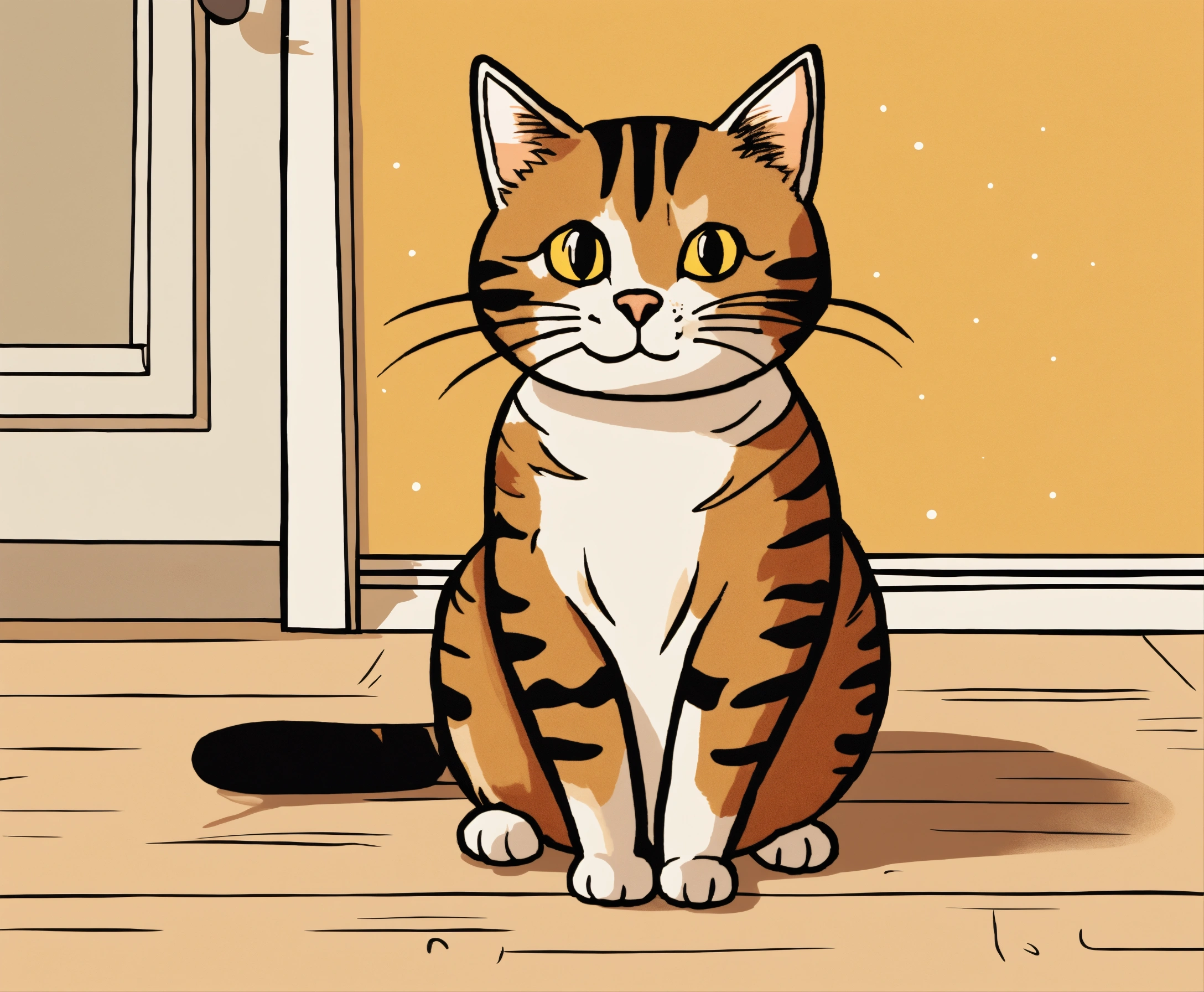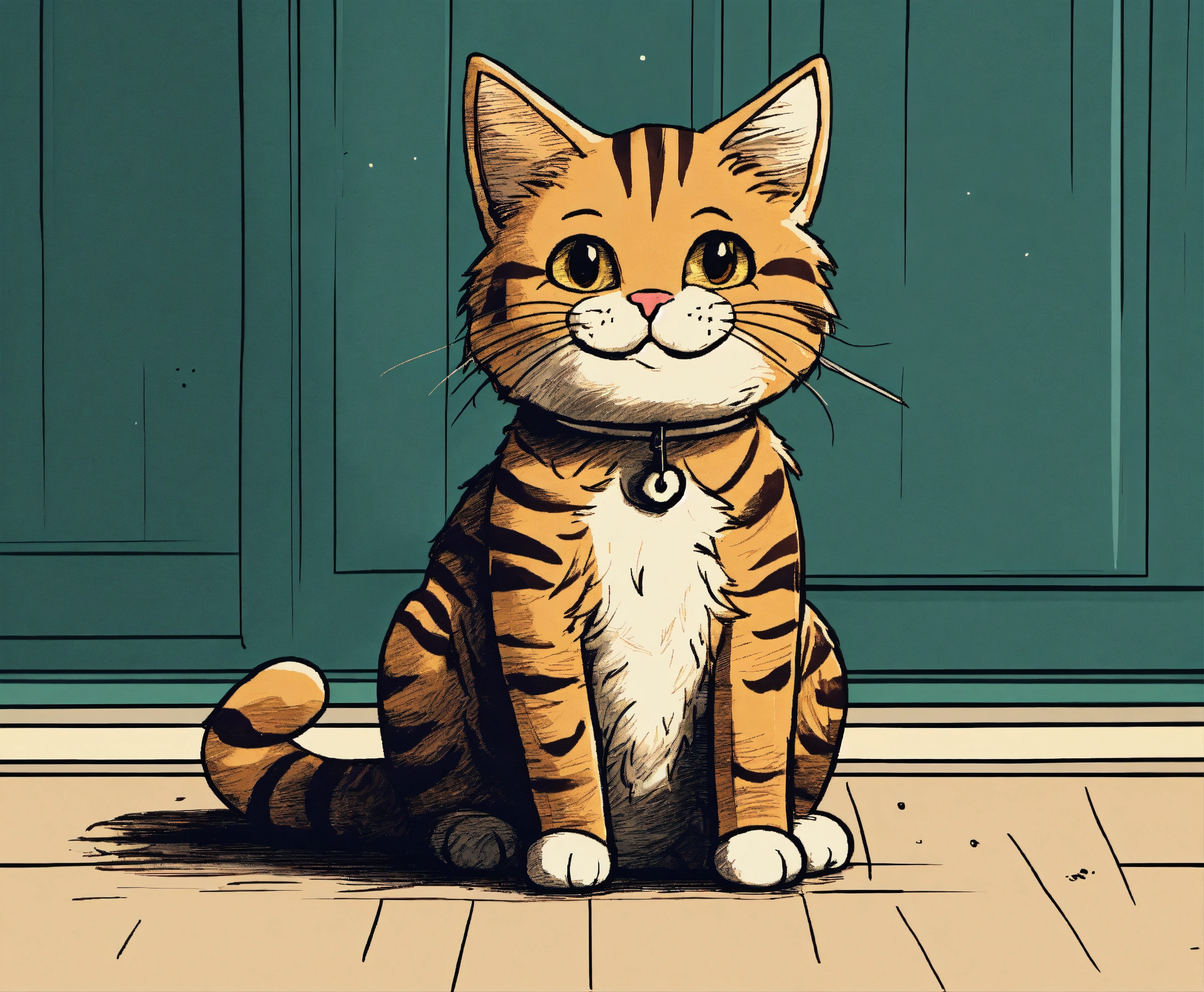 An ink drawn cartoon tabby cat sitting upright on the floor