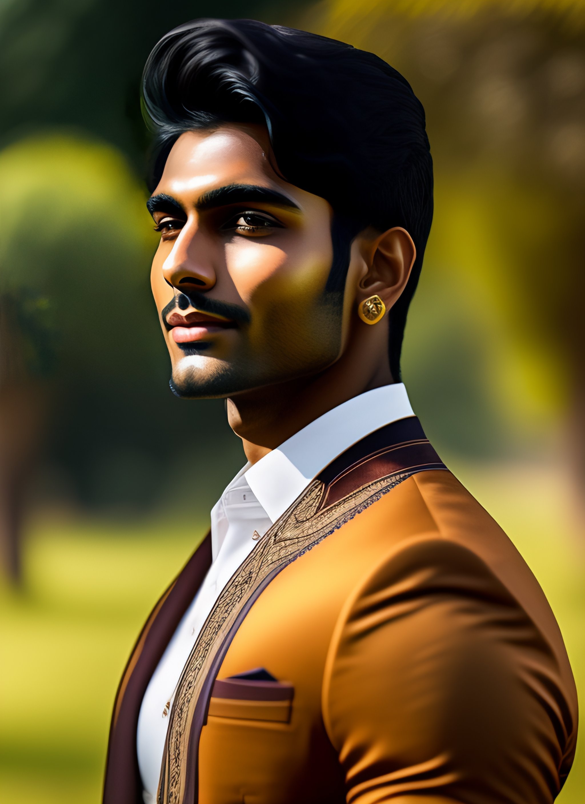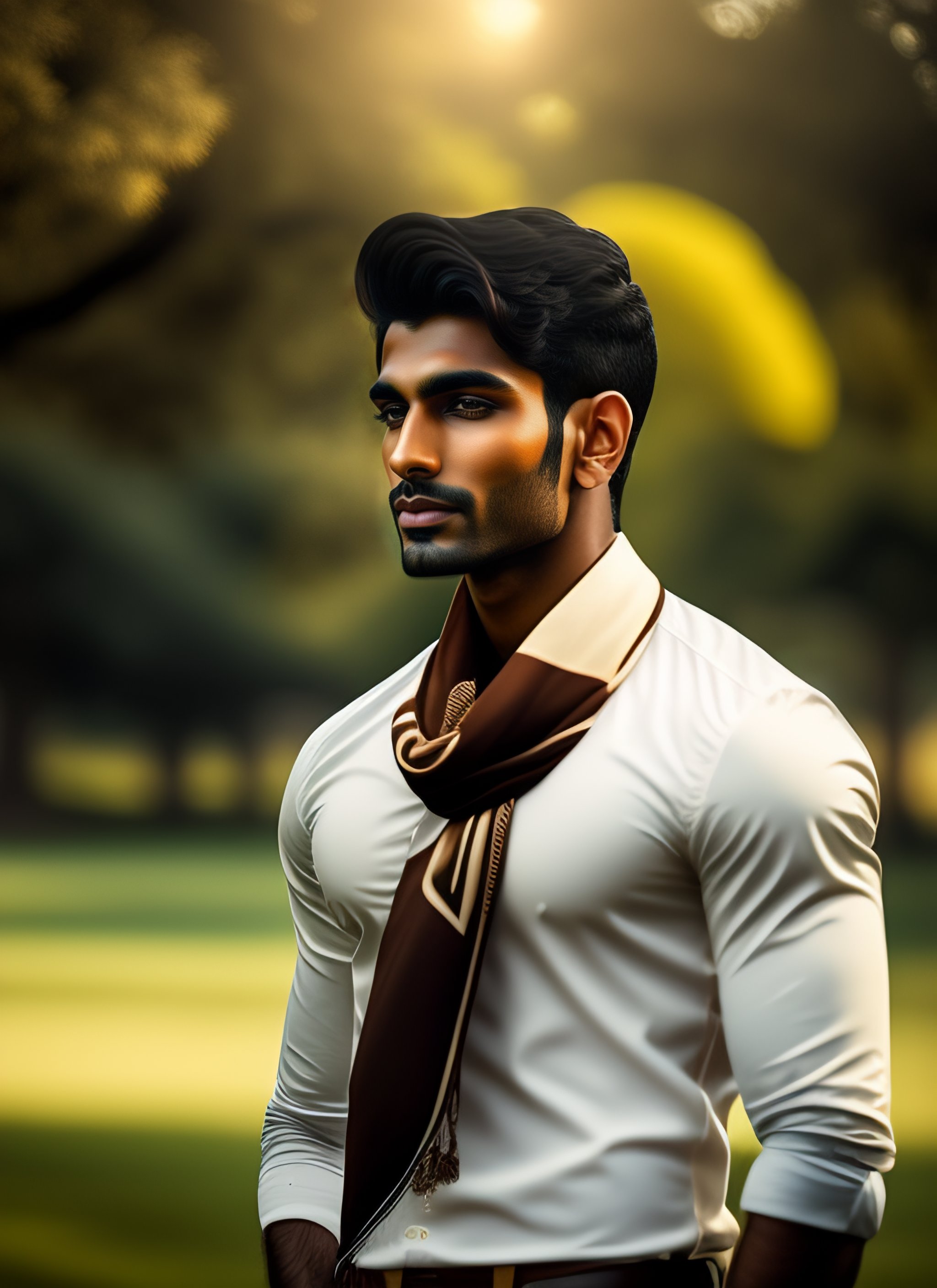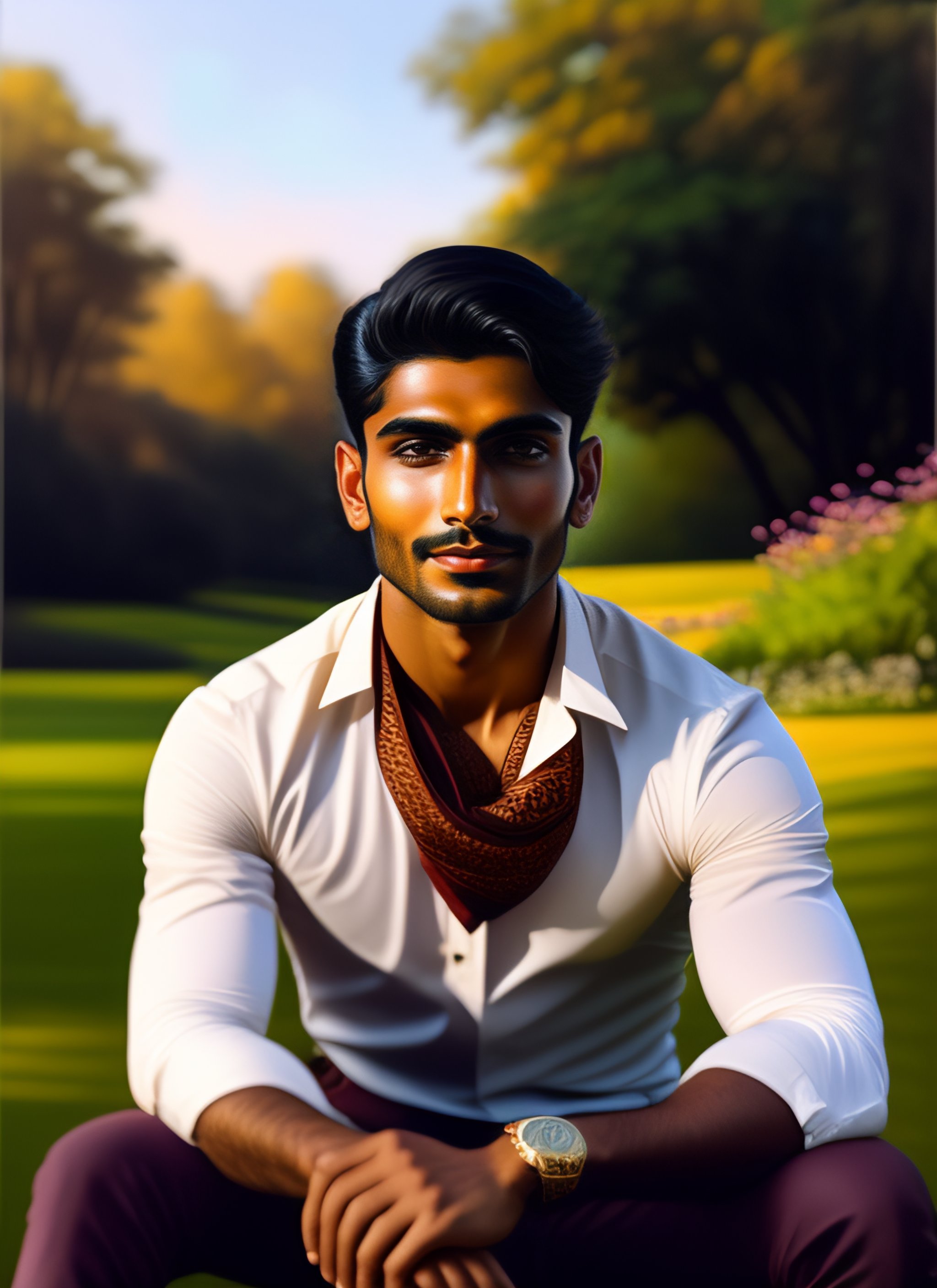 A slim handsome indian boy with smooth brown skin wearing a shirt and an elegant scarf sat on the grass posing for a picture at daytime, natural location, beautiful portrait, intricate frame, tender depiction, detailed, sharp focus, clear lighting, joyful, classical oil painting