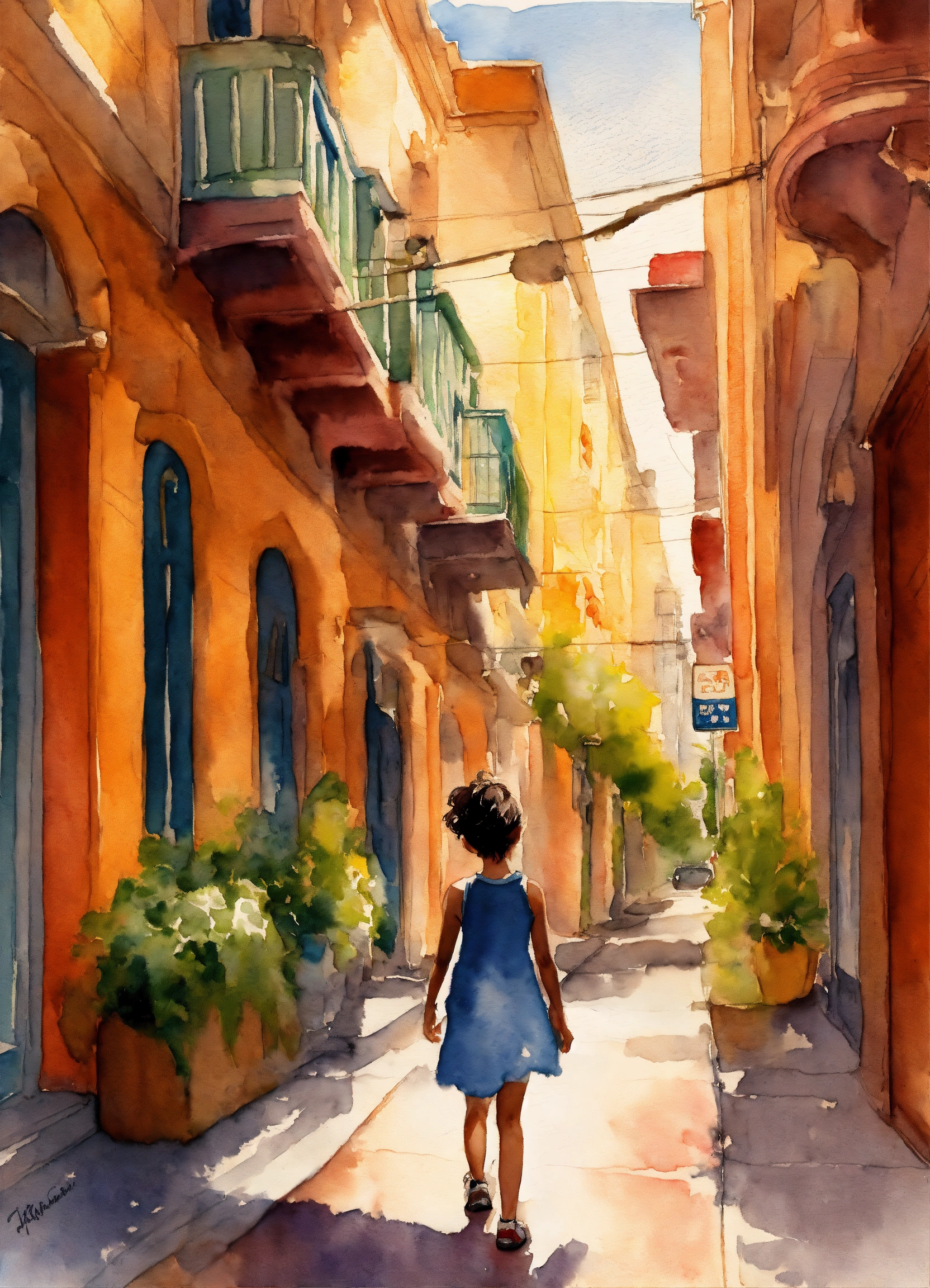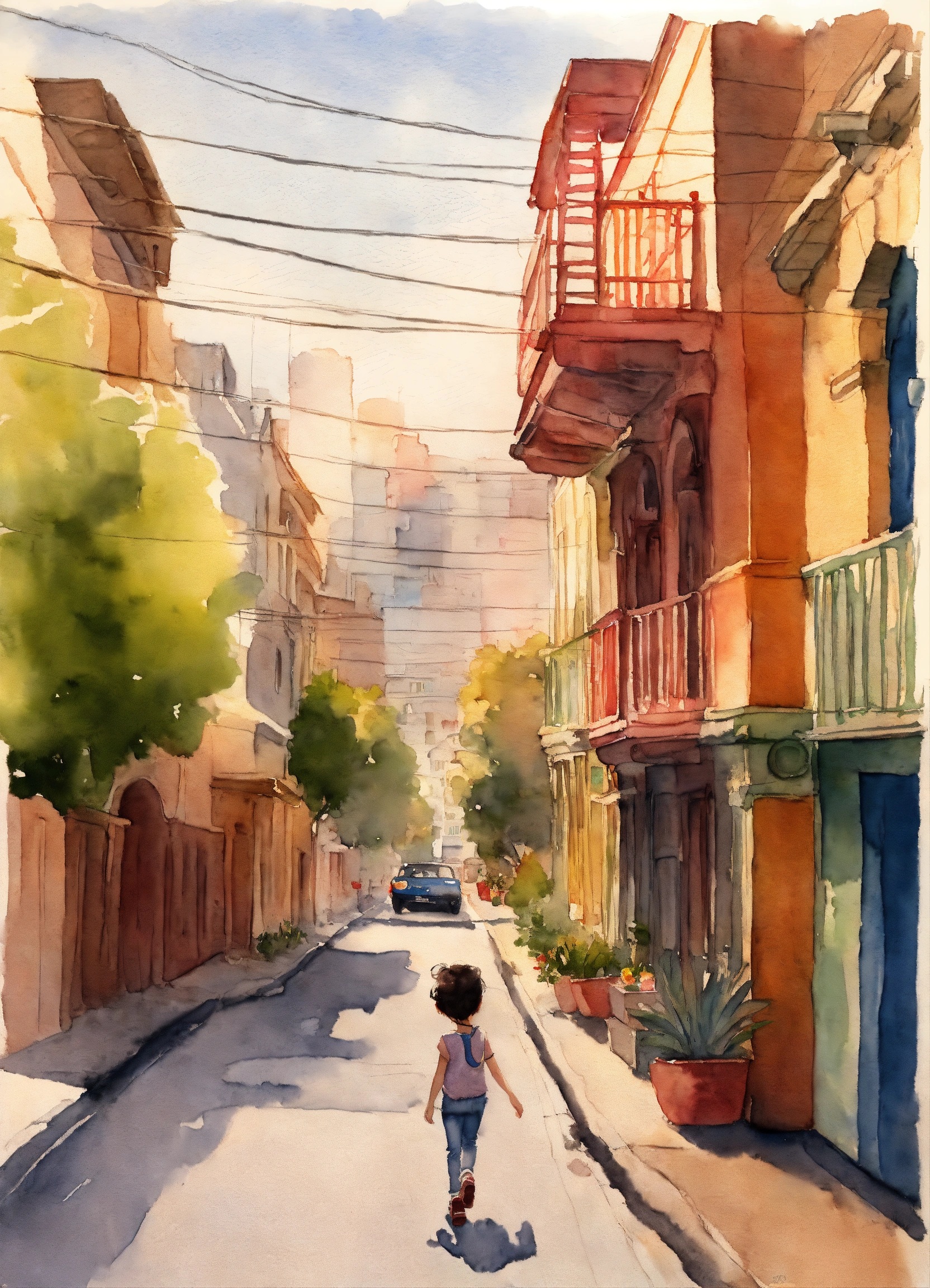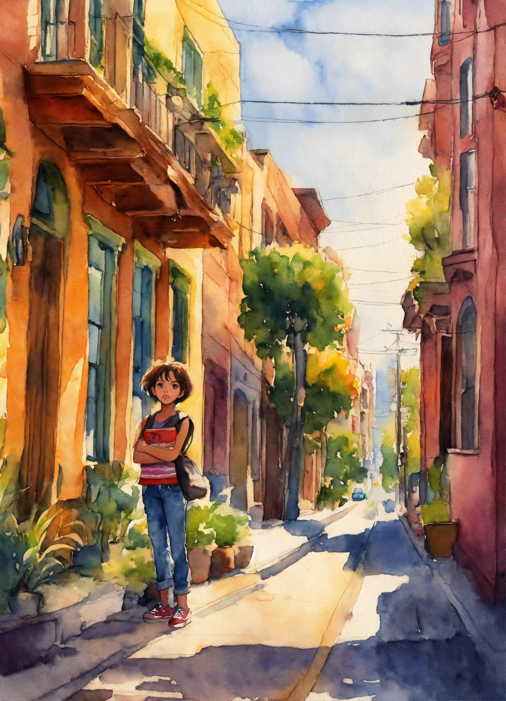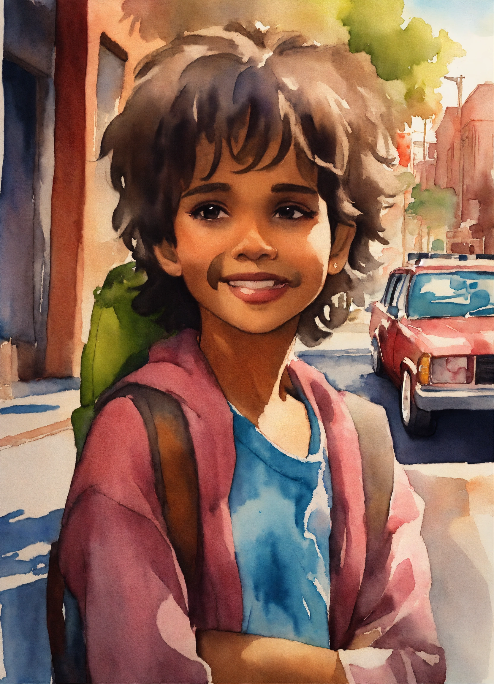 Watercolor pixar painting of 8 year old hispanic halle berry san francisco's vibrant mission district, known as "la misión, watercolor pixar style cartoon