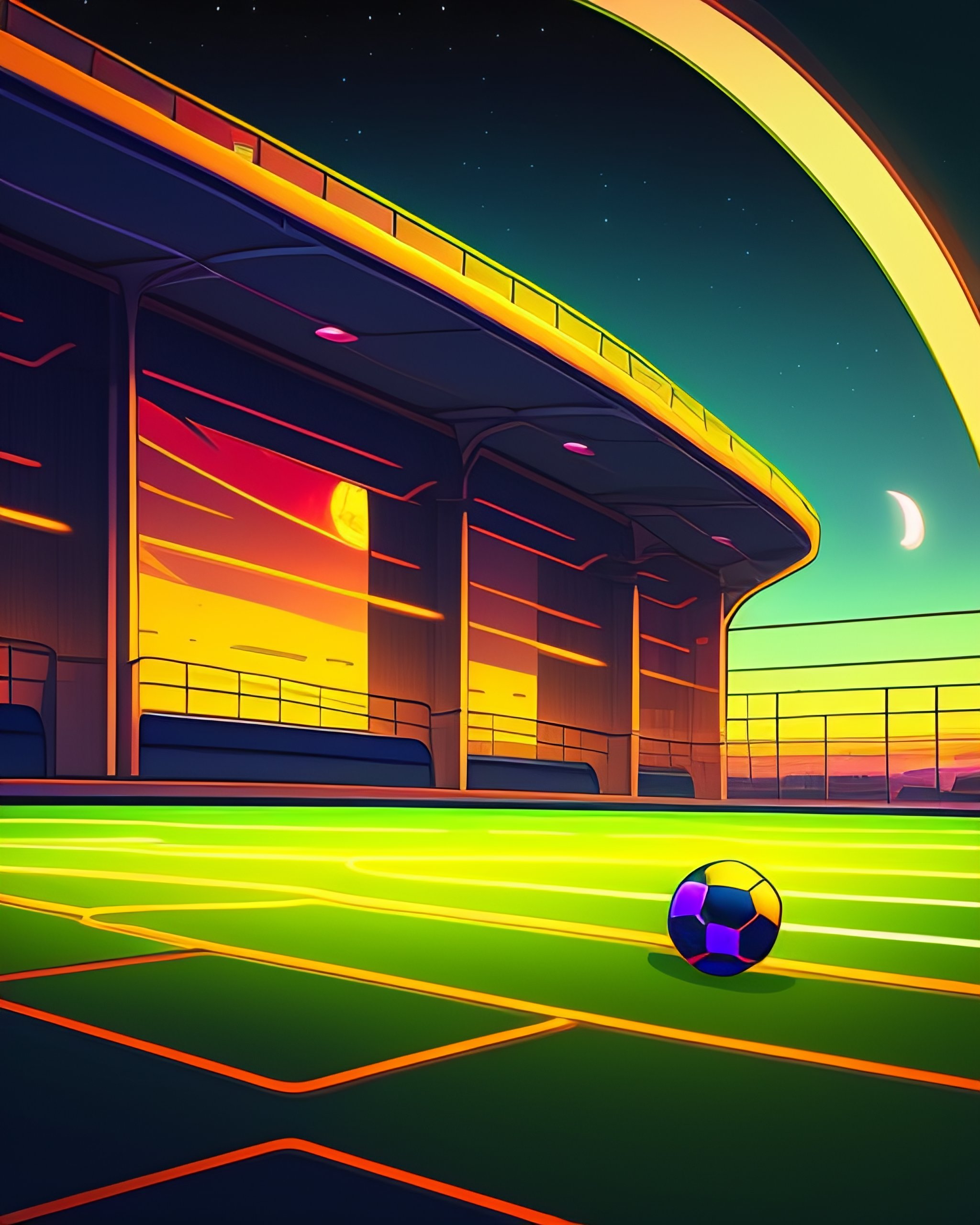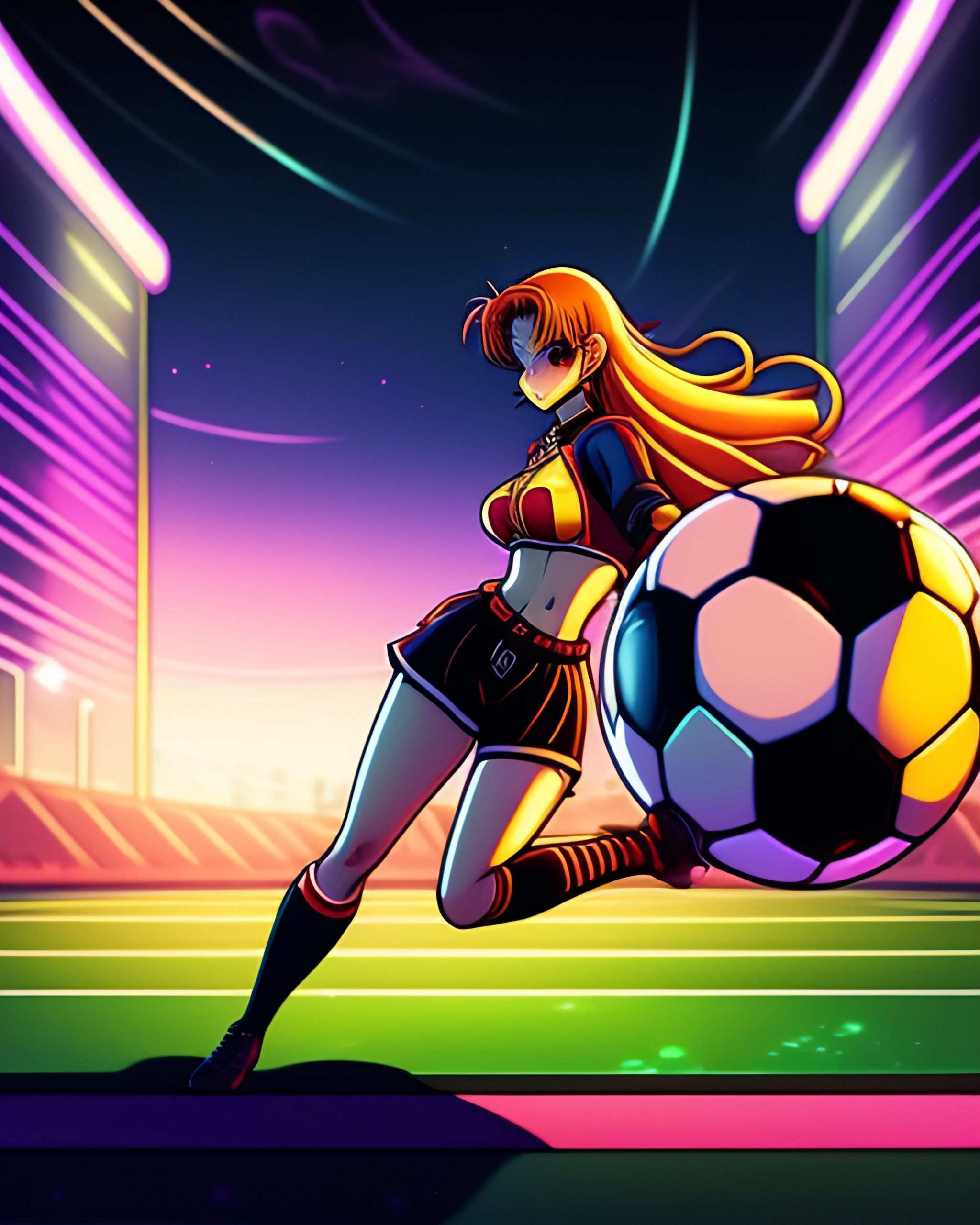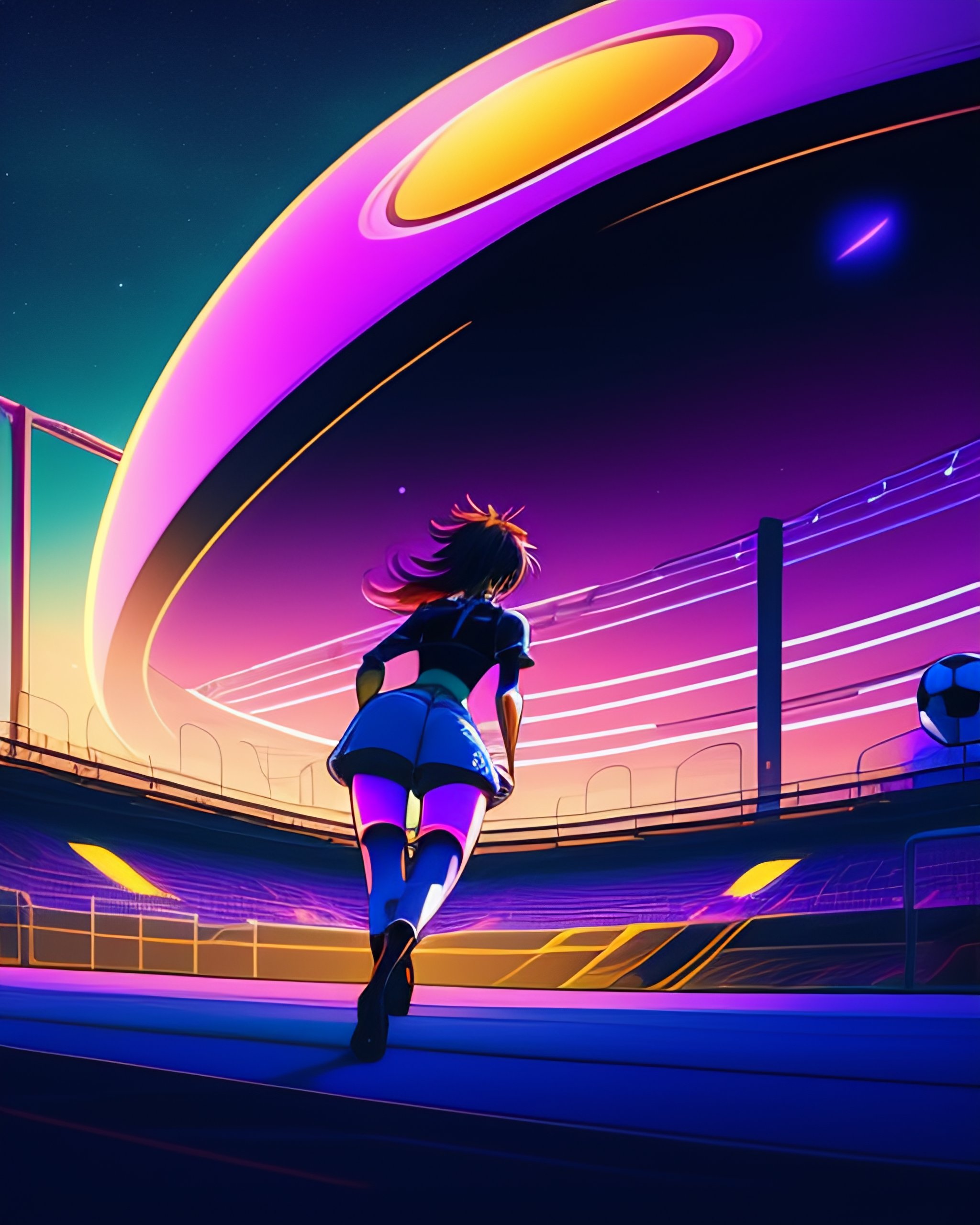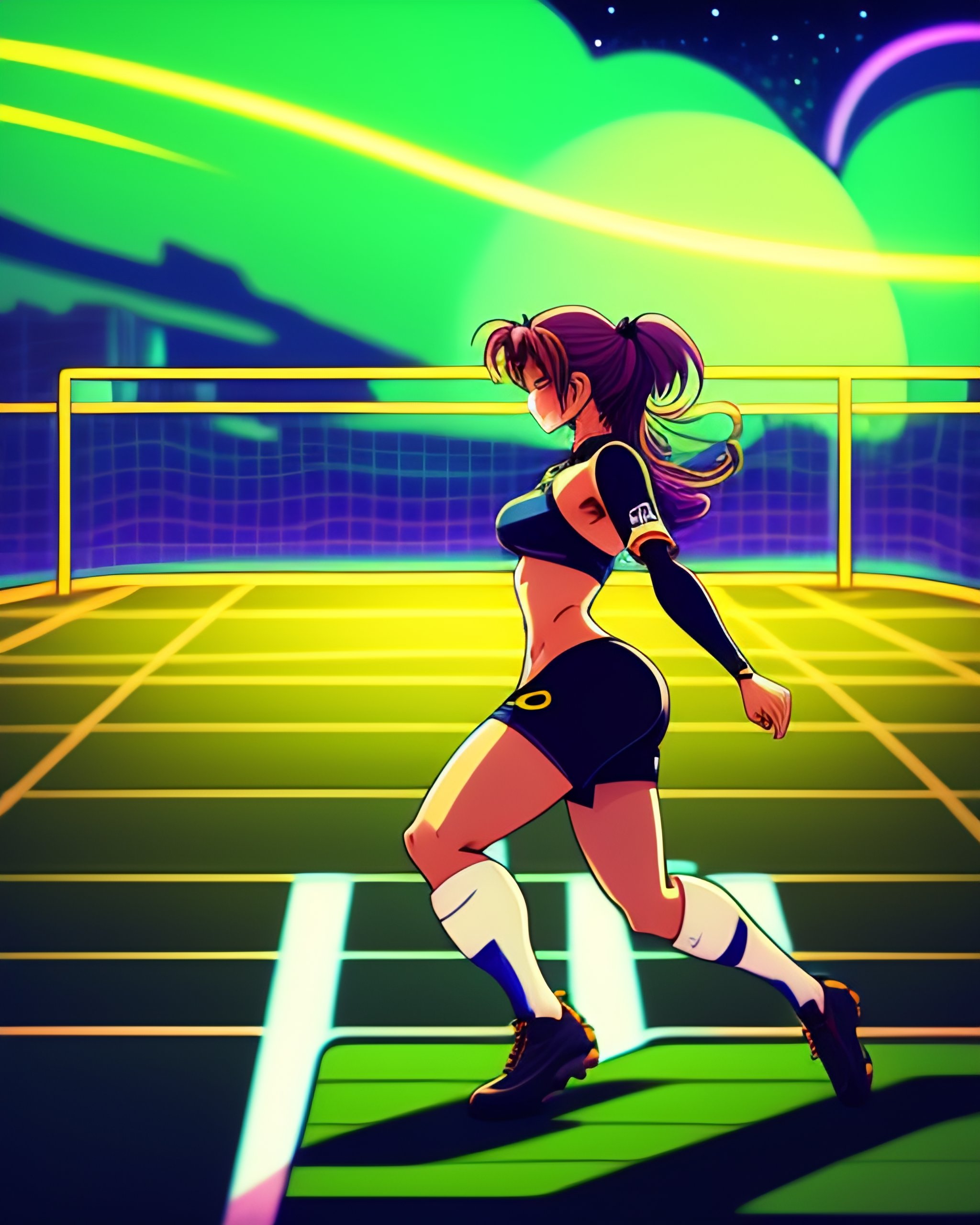Vintage 90's anime style soccer field at night; a woman wearing a bikini playing with a soccer ball; by greg tocchini, sci-fi. line art. environmental arcade art.