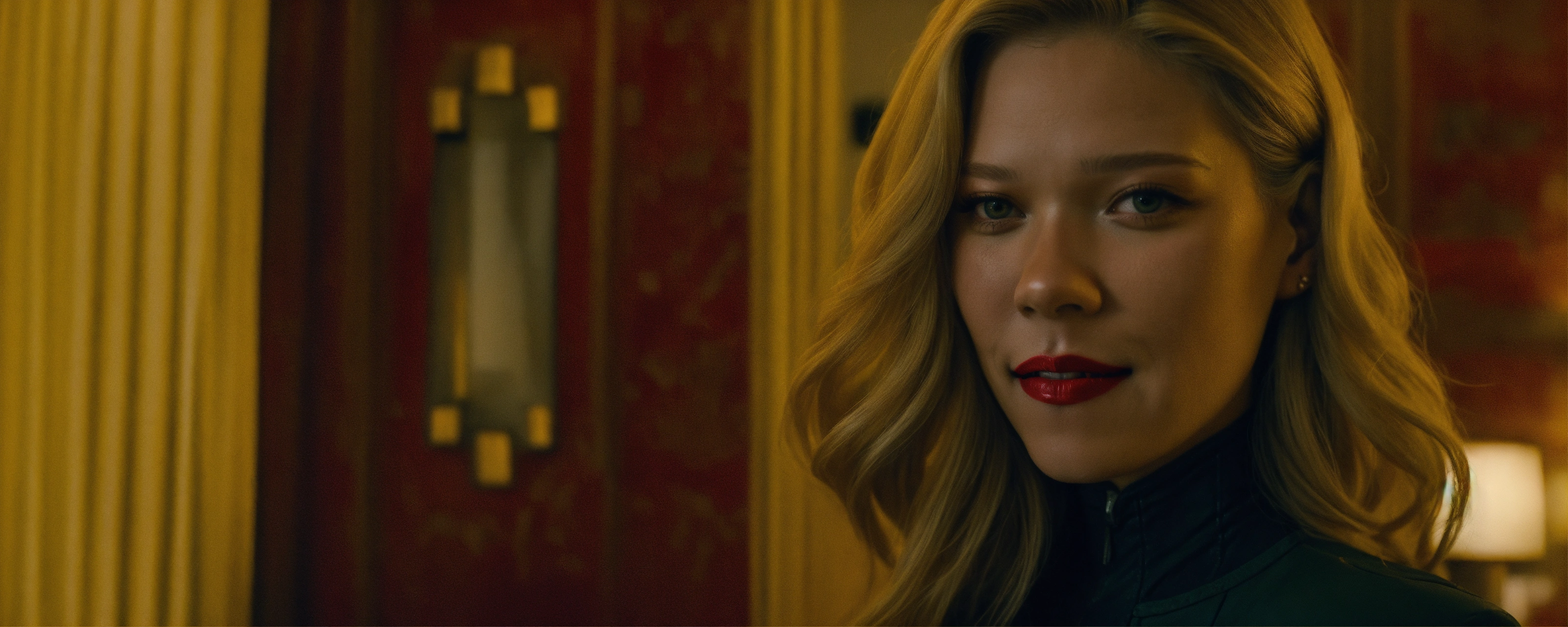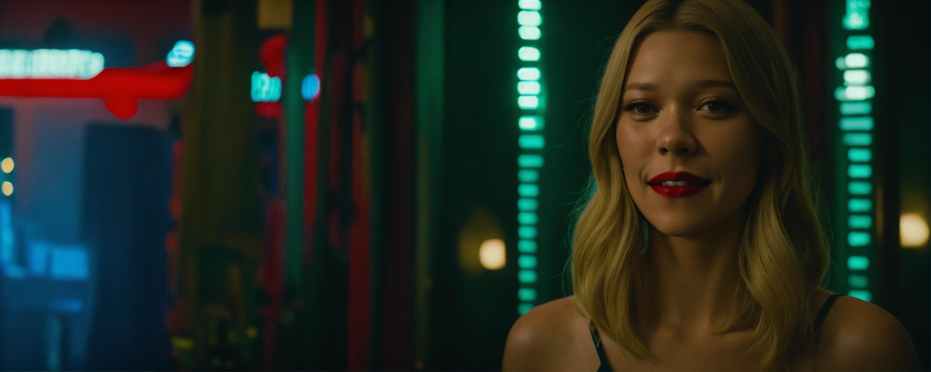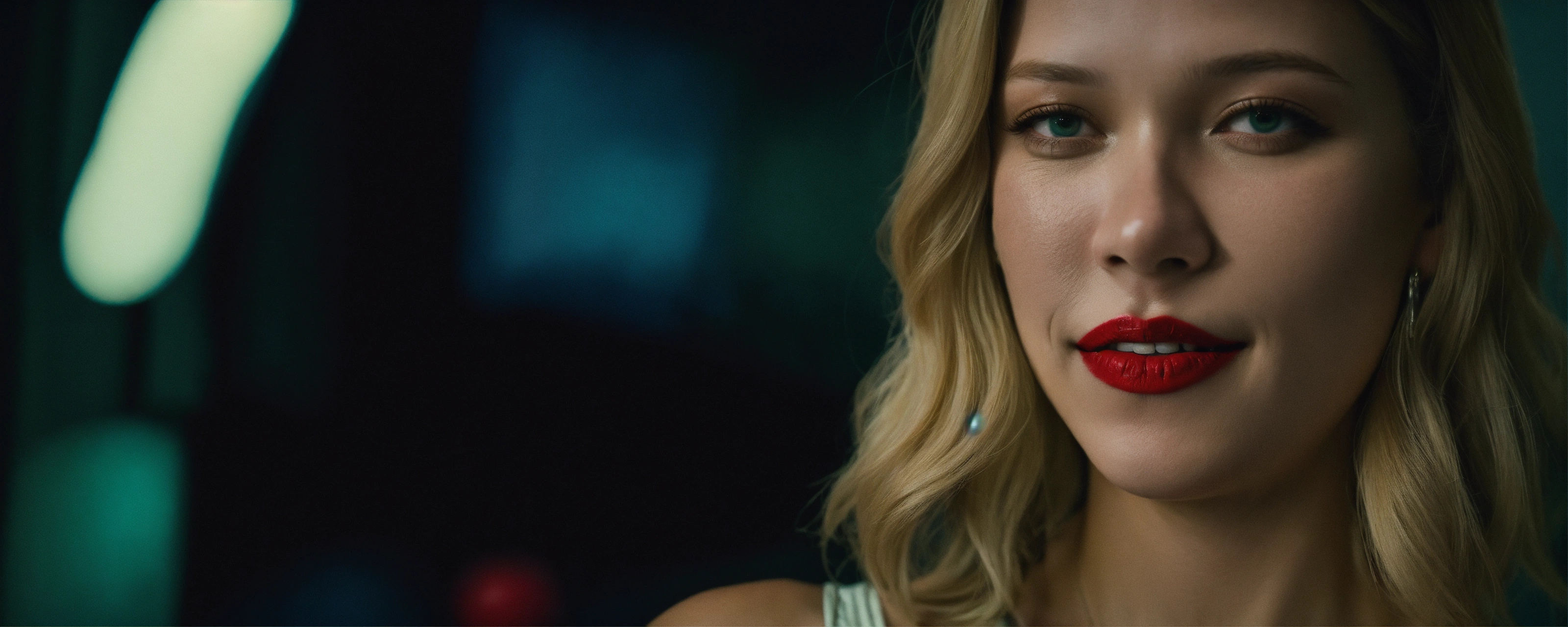 Beautiful blonde girl, lea seydoux long hair, altered carbon style, very realistic, 27 years old, serial killer hunt, tall bitch, grin, red lipstick