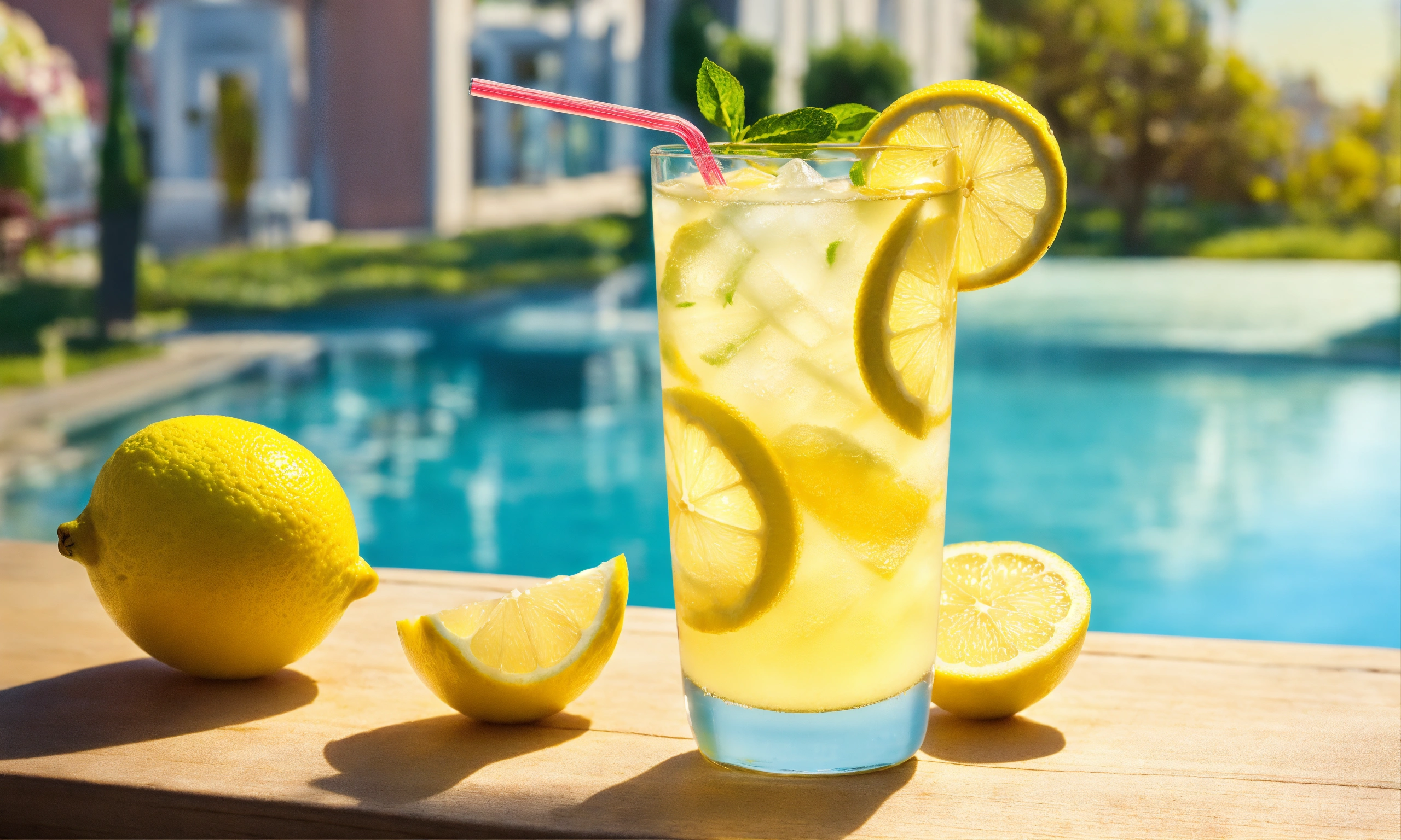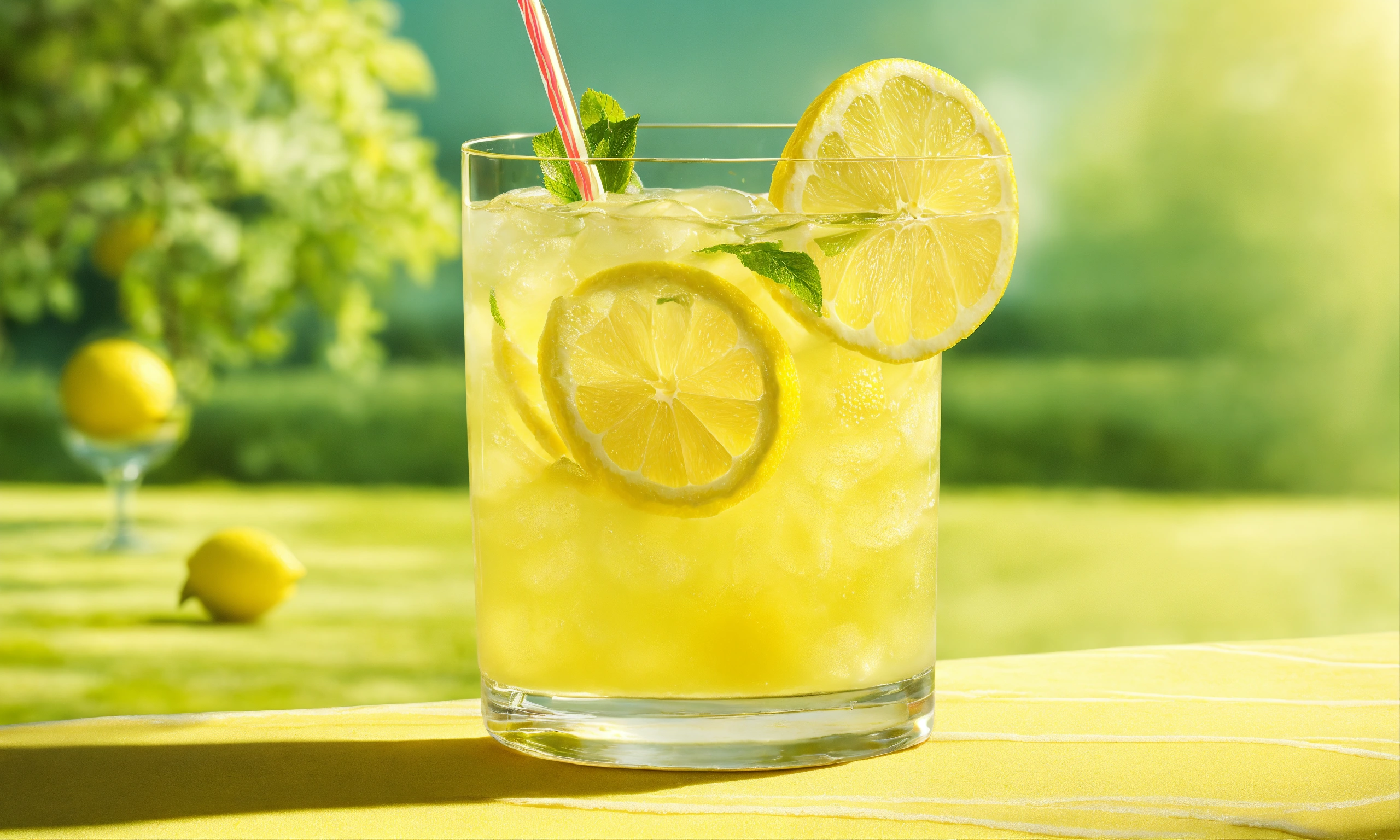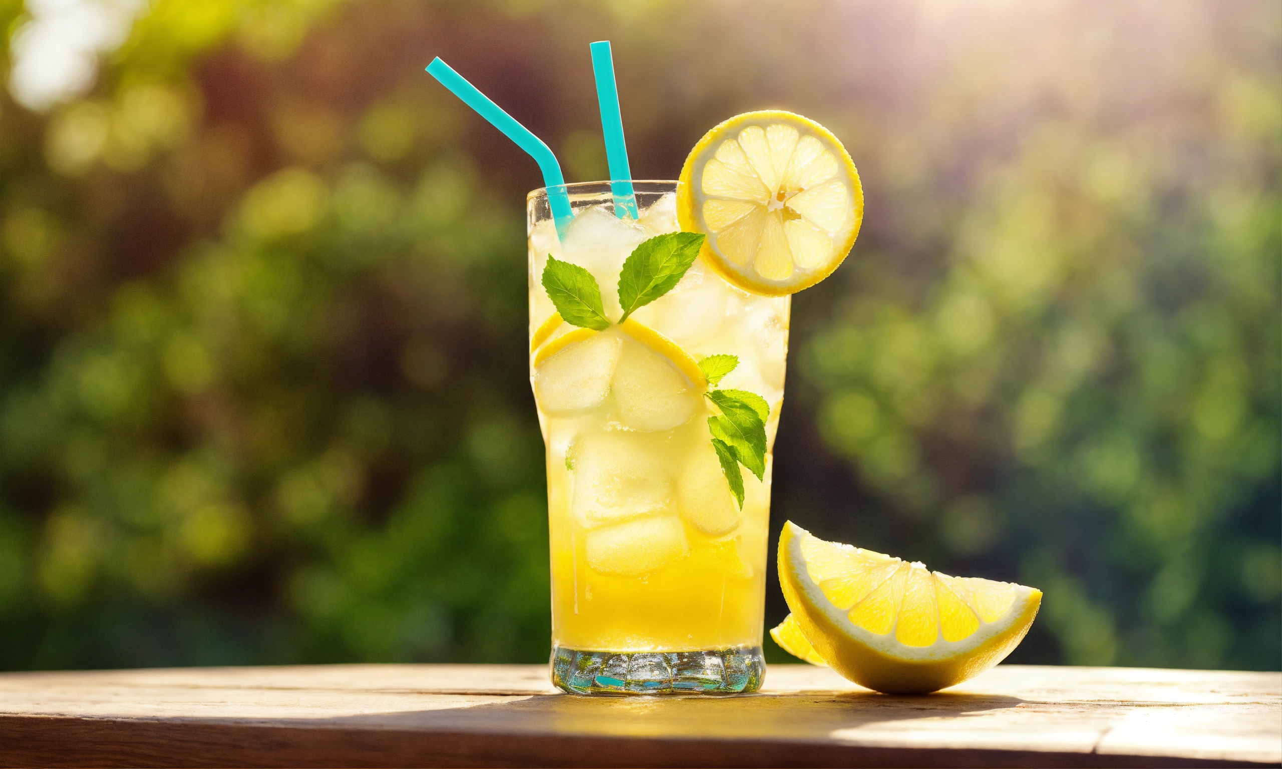 Lemonade (repeat) a refreshing glass of lemonade, with a lemon slice and a straw, placed against a sunny, cheerful backdrop.