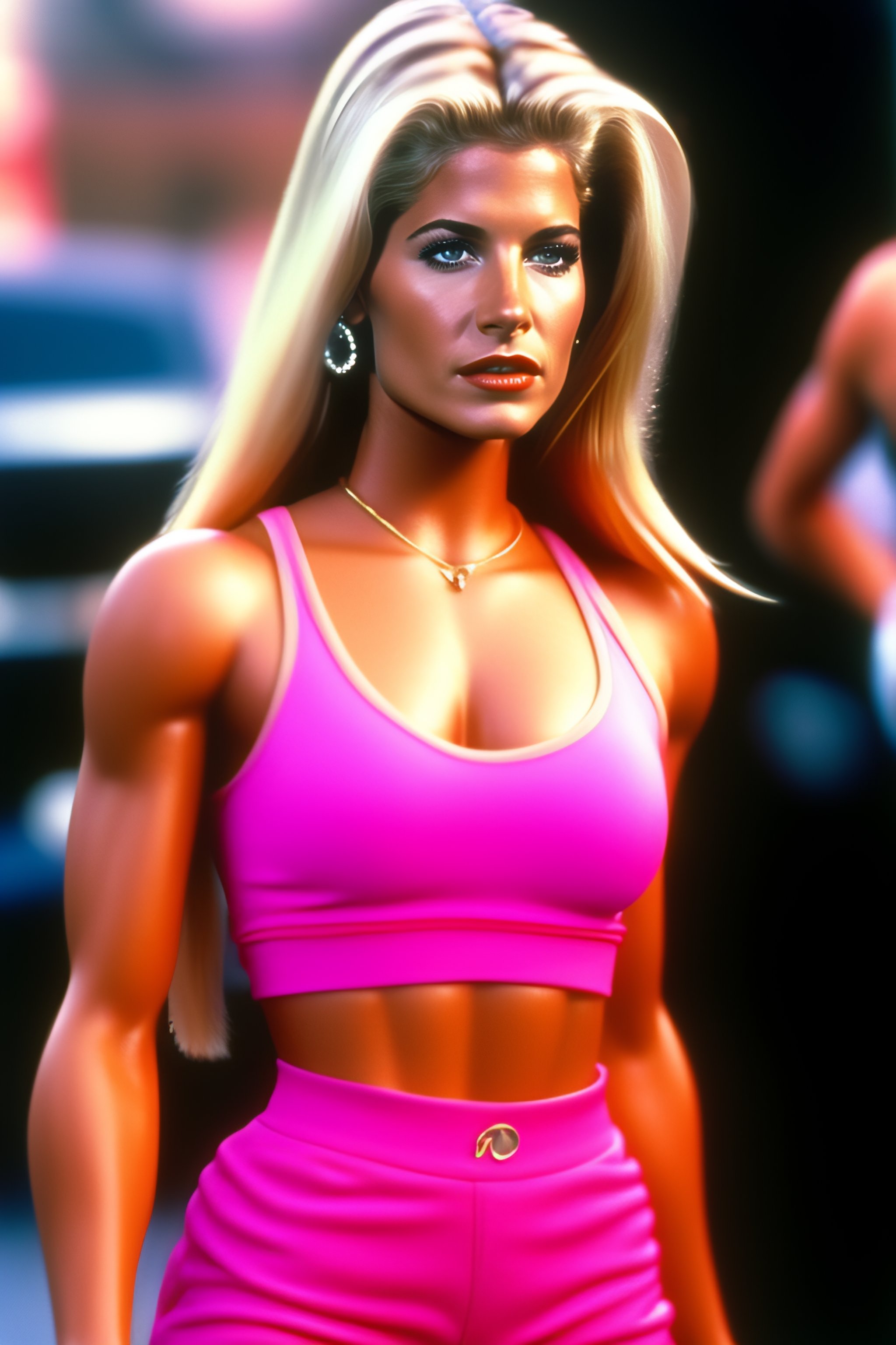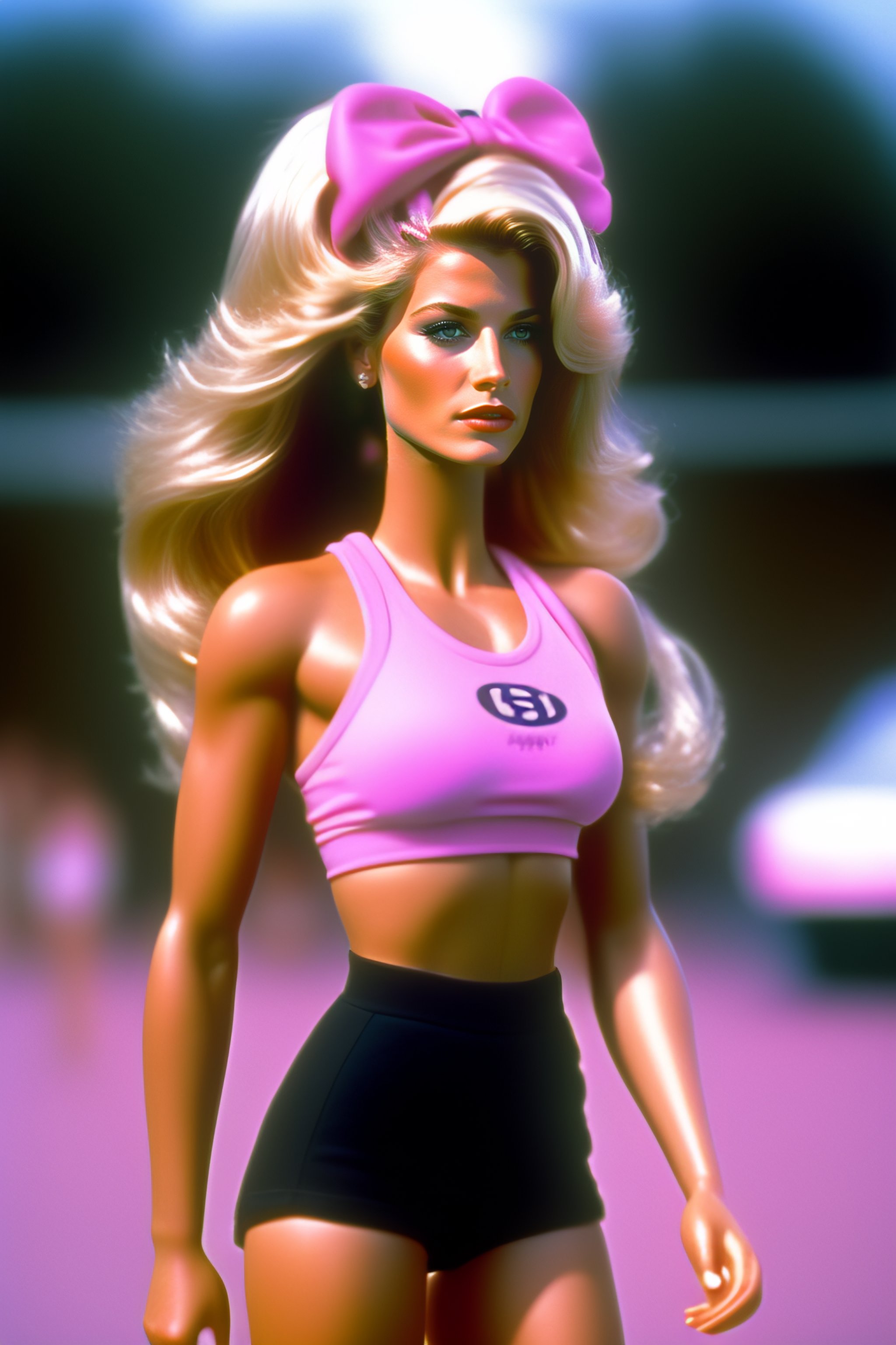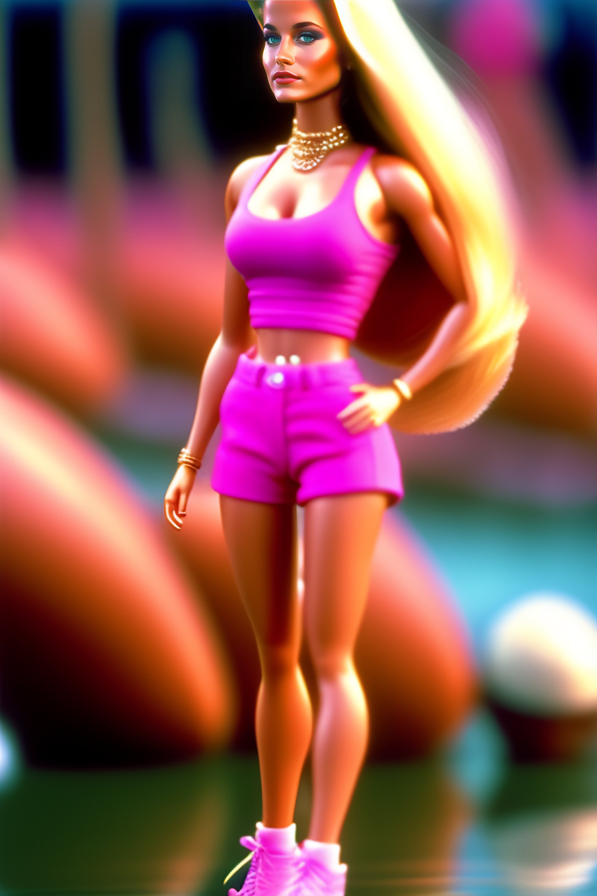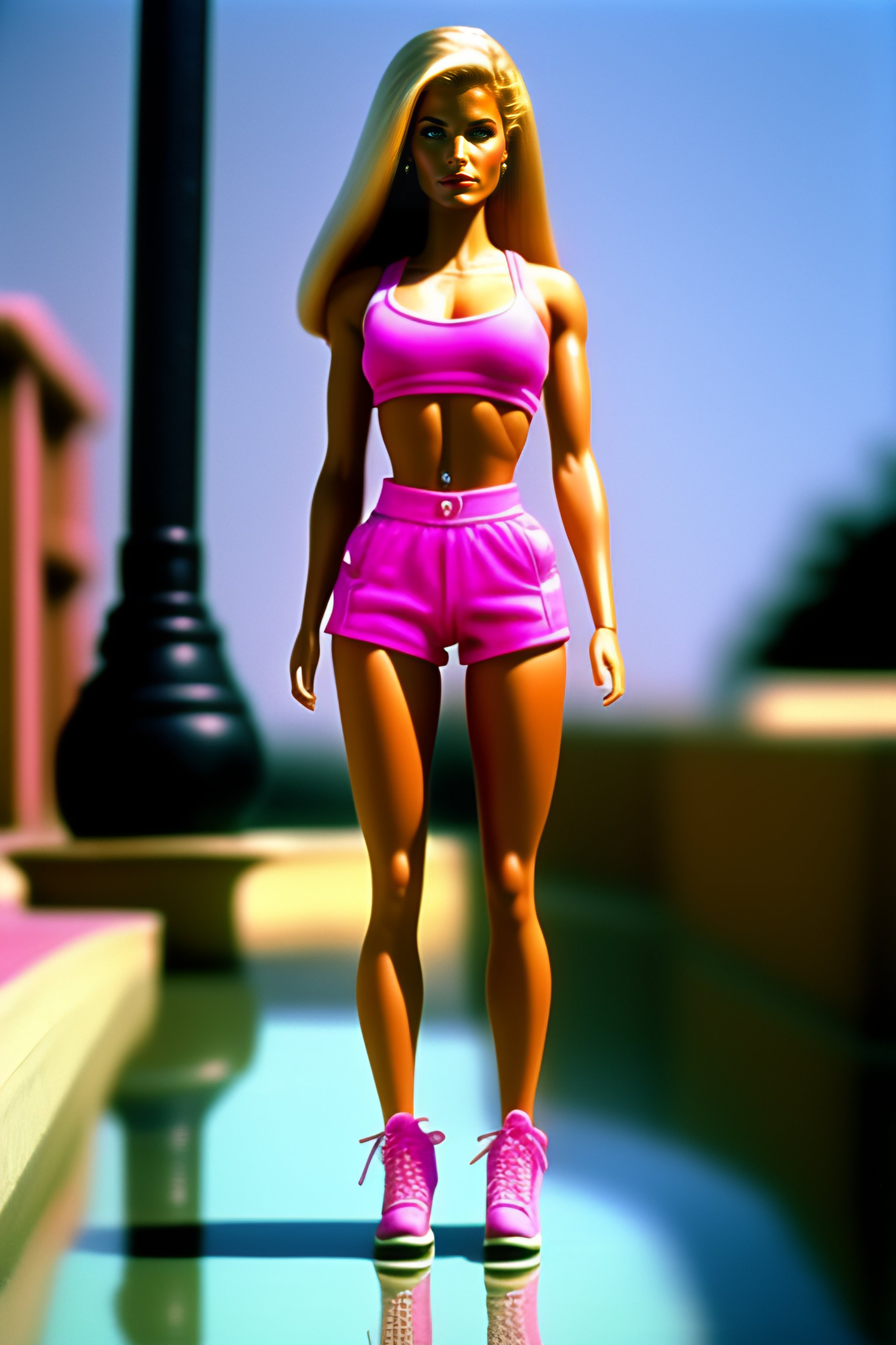 Rachel green, barbie doll, perfect hourglass body, shorts and pink tank top, 1990, realism, futuristic sharp focus, movie still