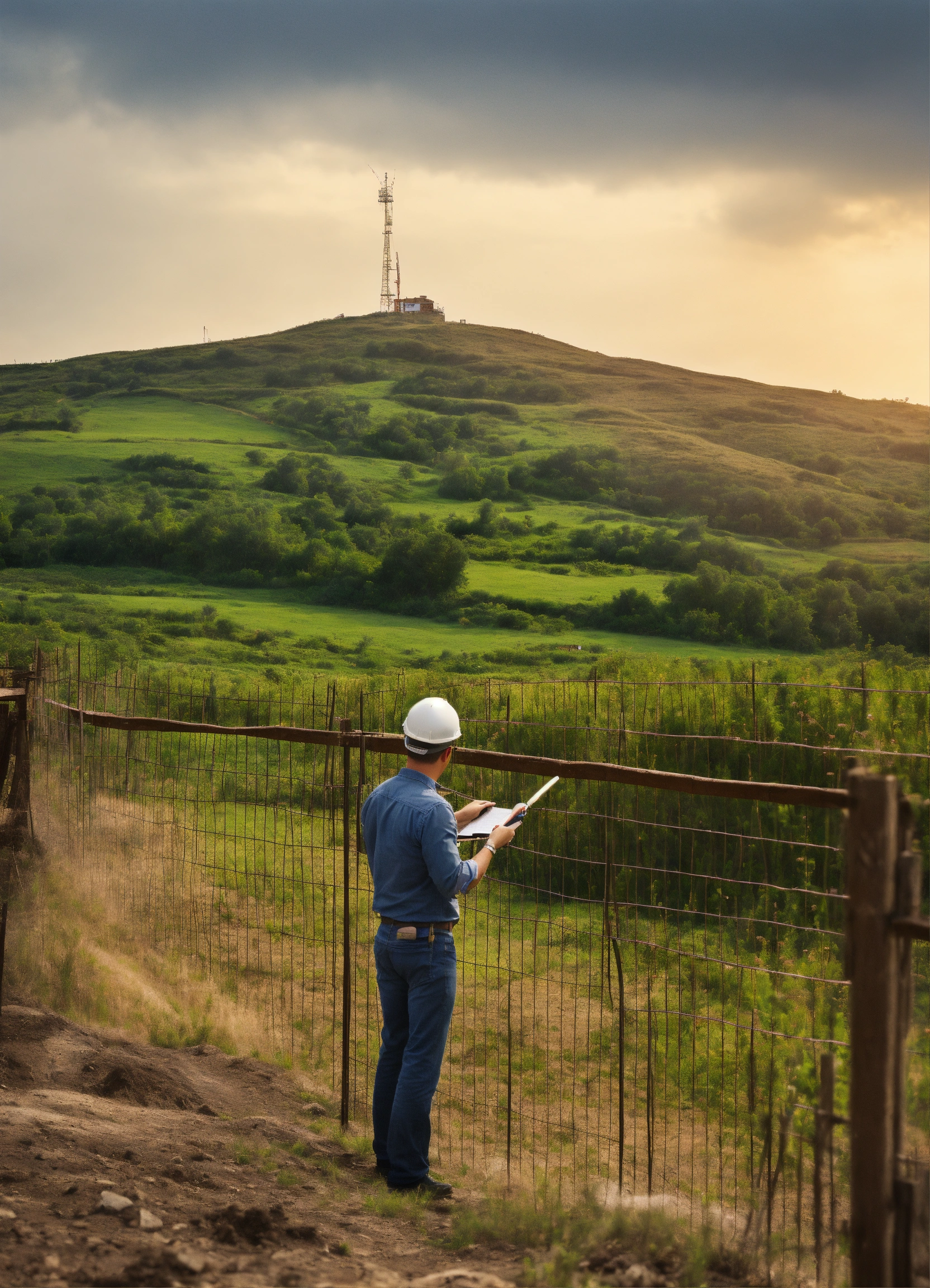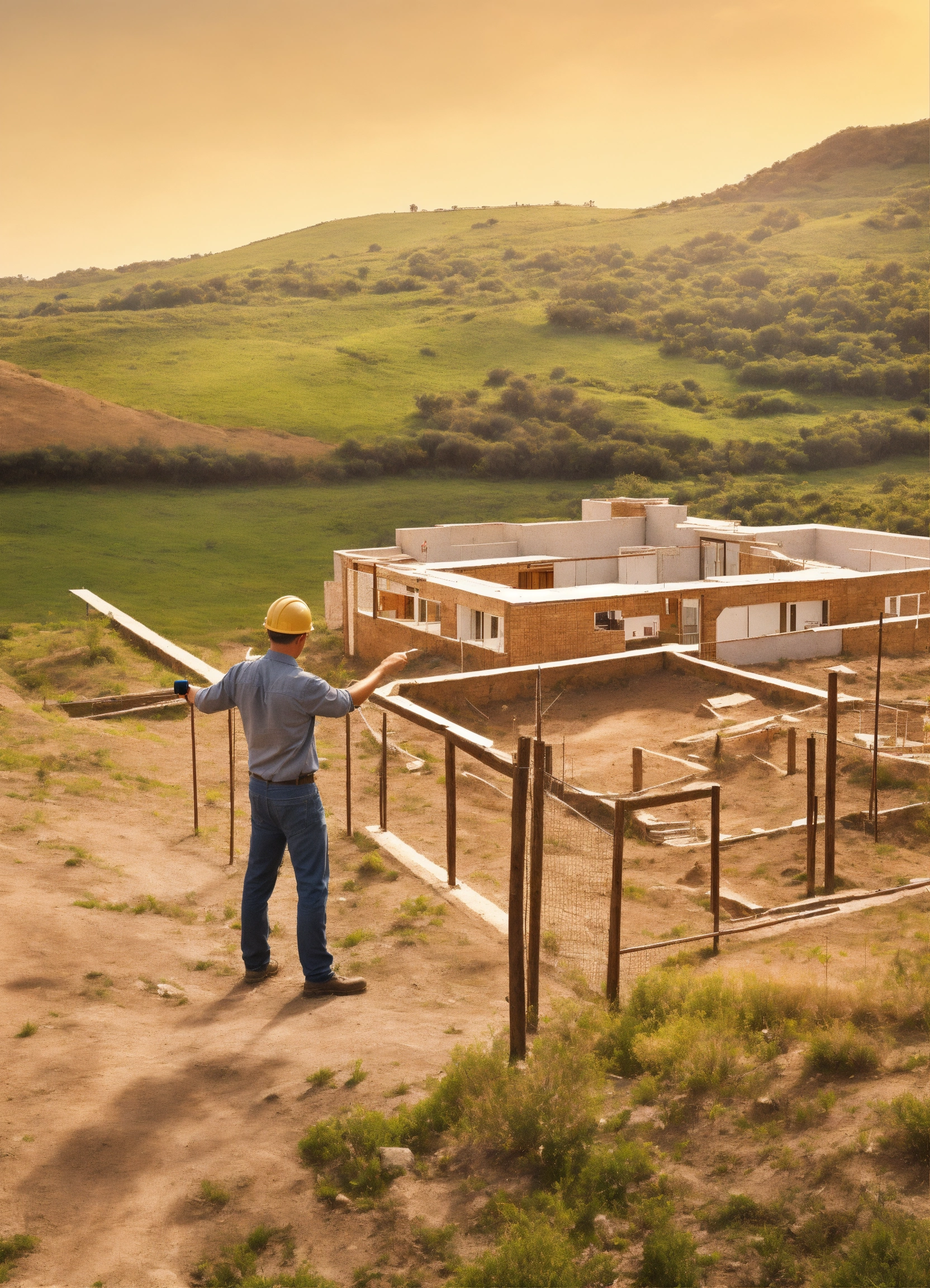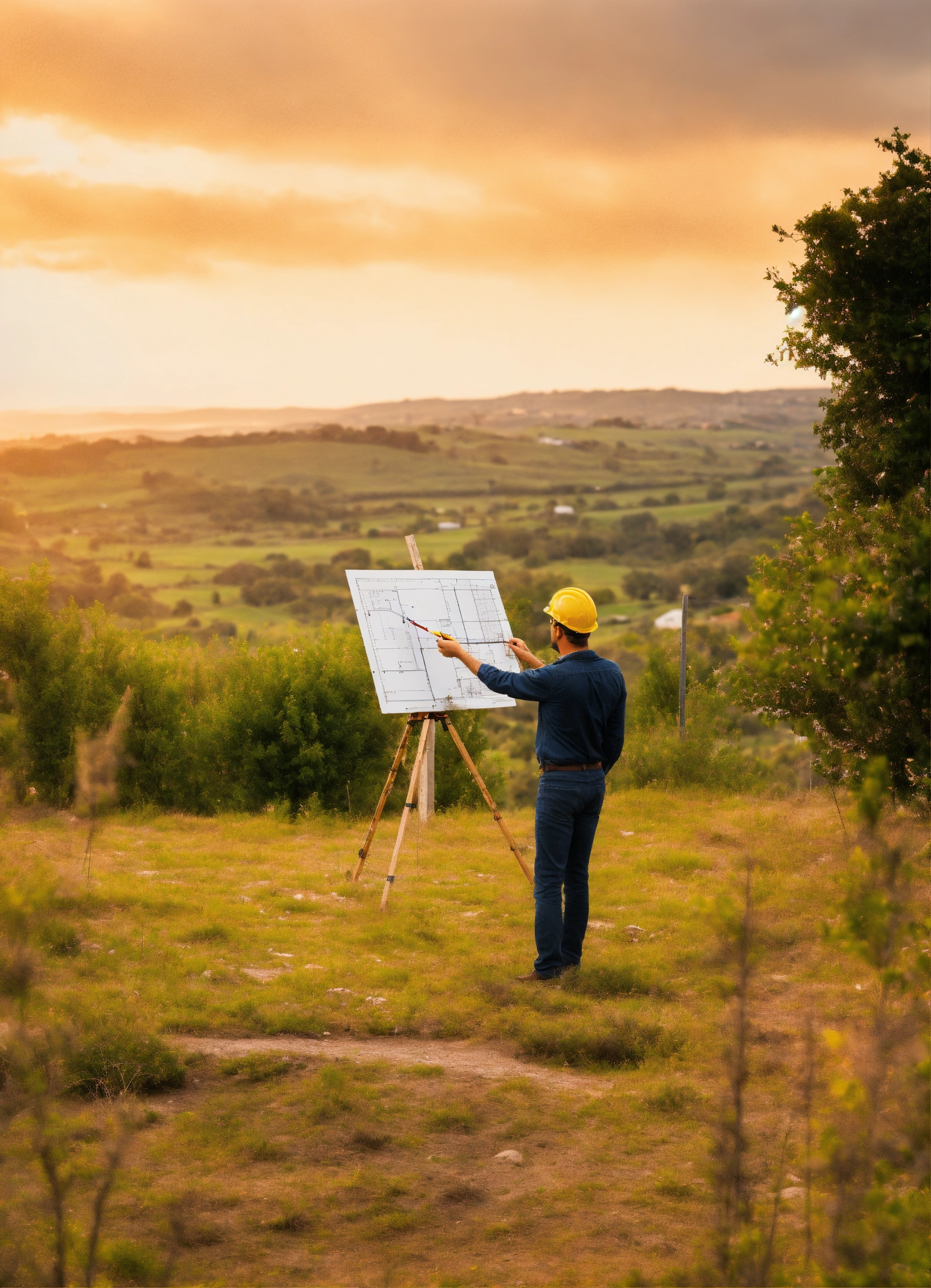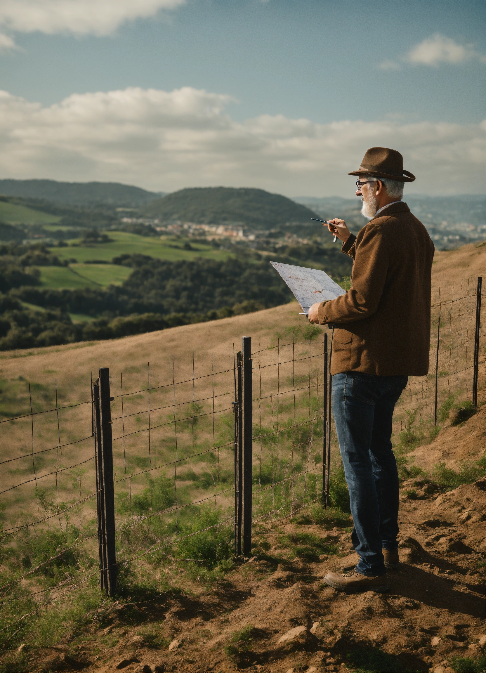 Architect on a piece of land pointing to a hill near by, the site has a fence all arround and the architect has in his hands the project plans