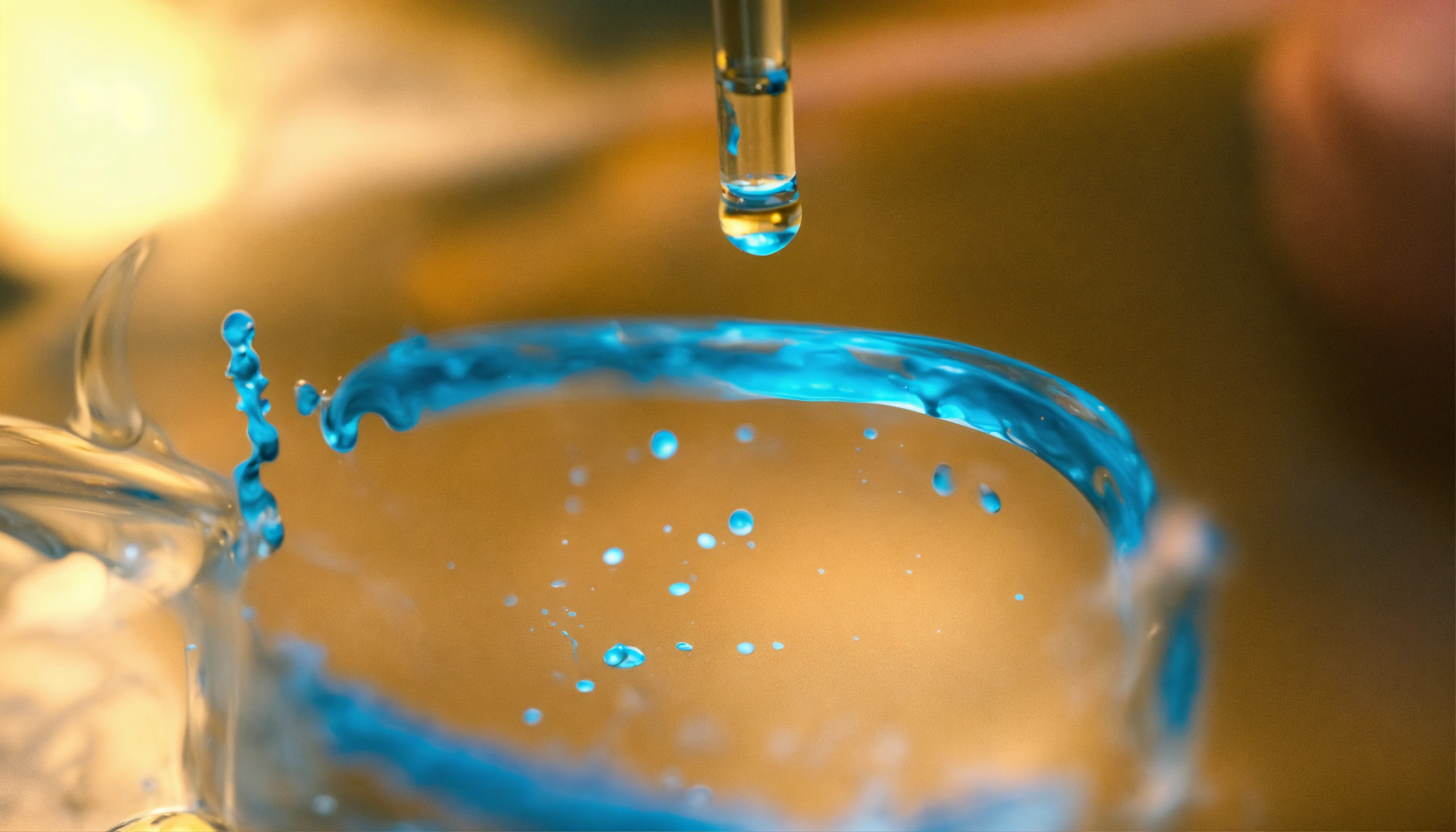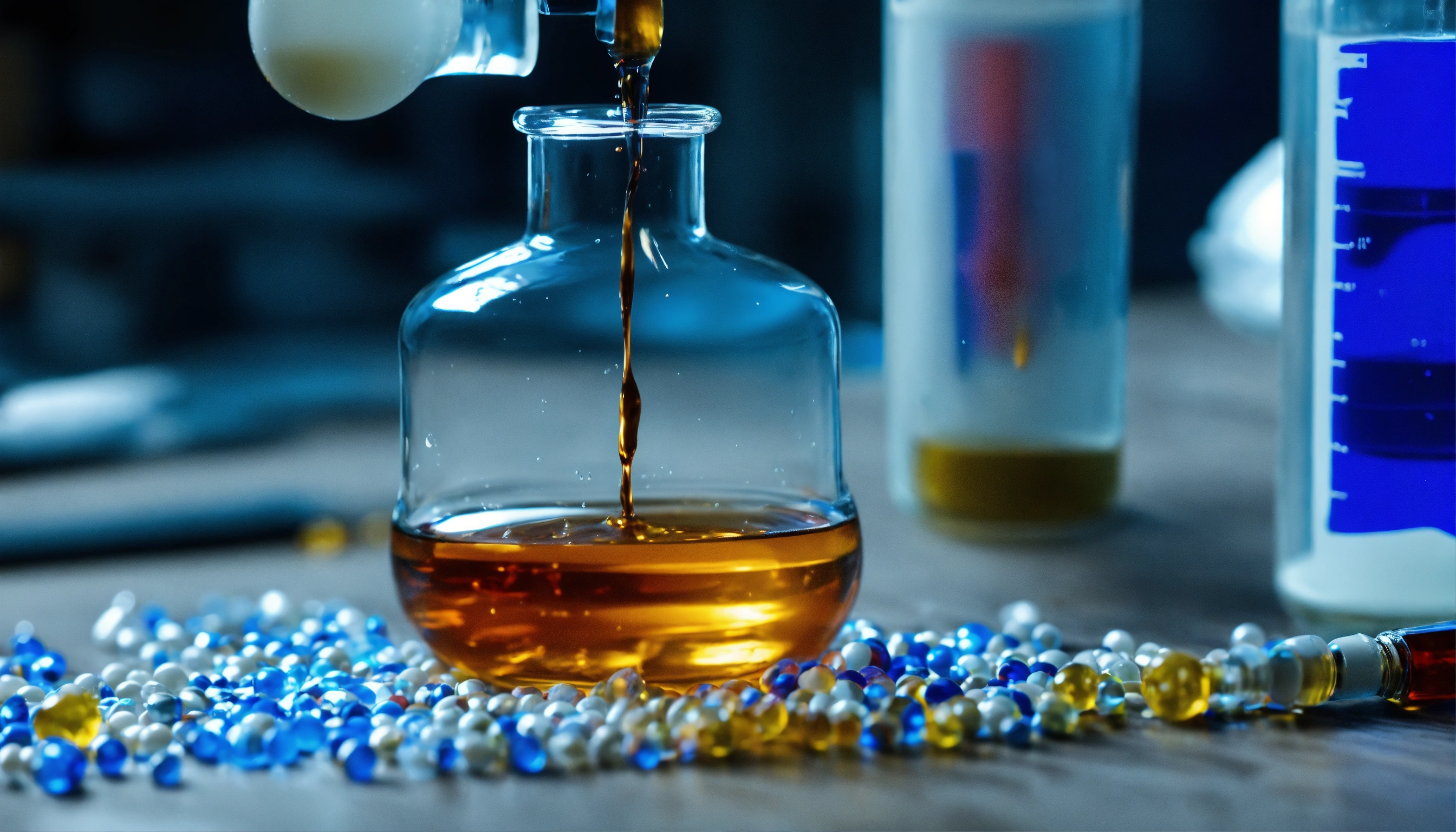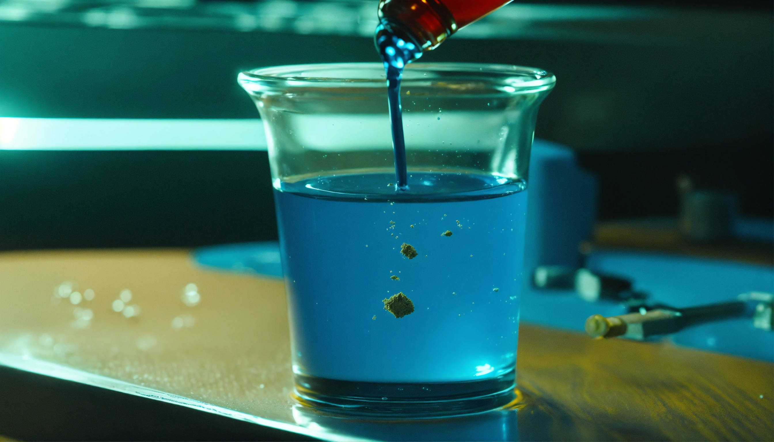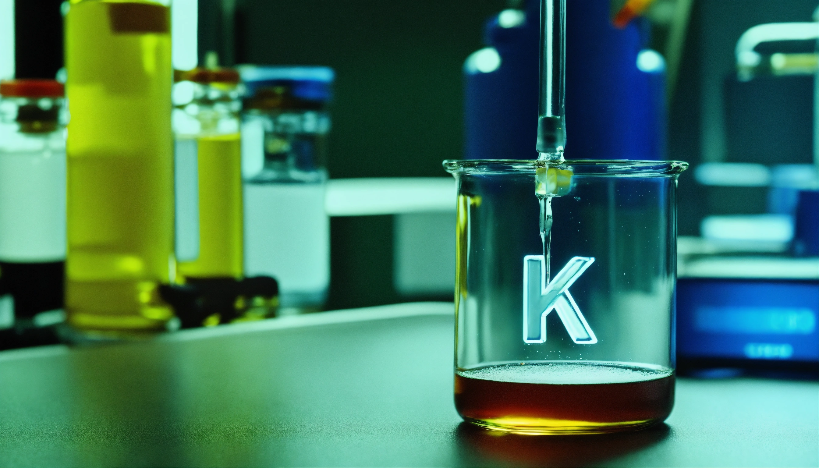 Fiole de chimie graver la lettre k de dans un liquide bleu, le tous sur un fond de laboratoire, image en 4k
