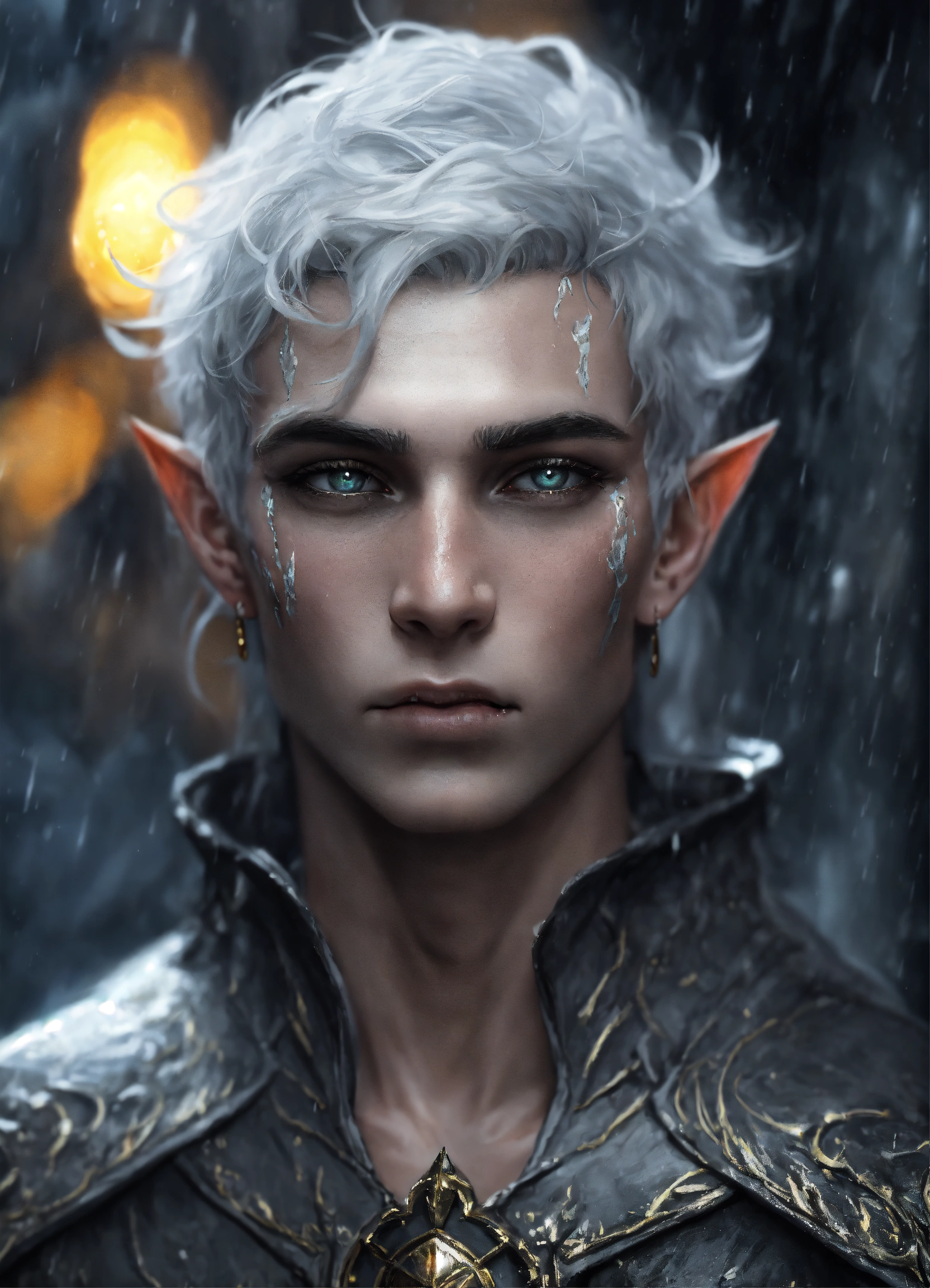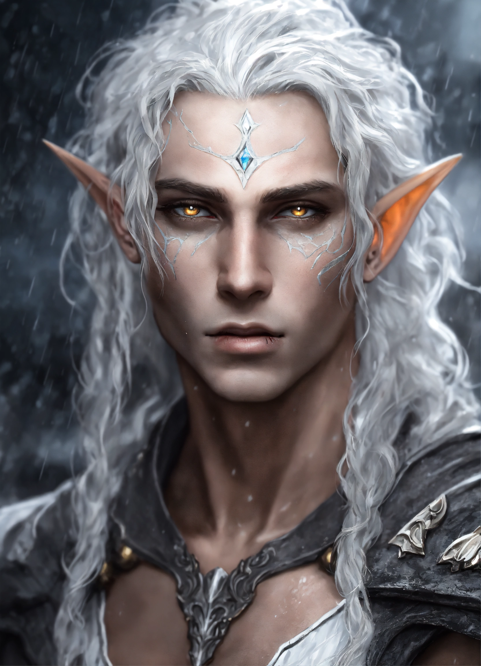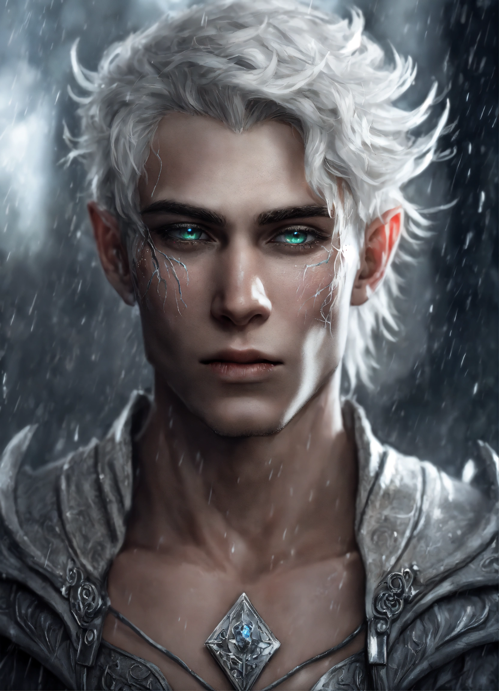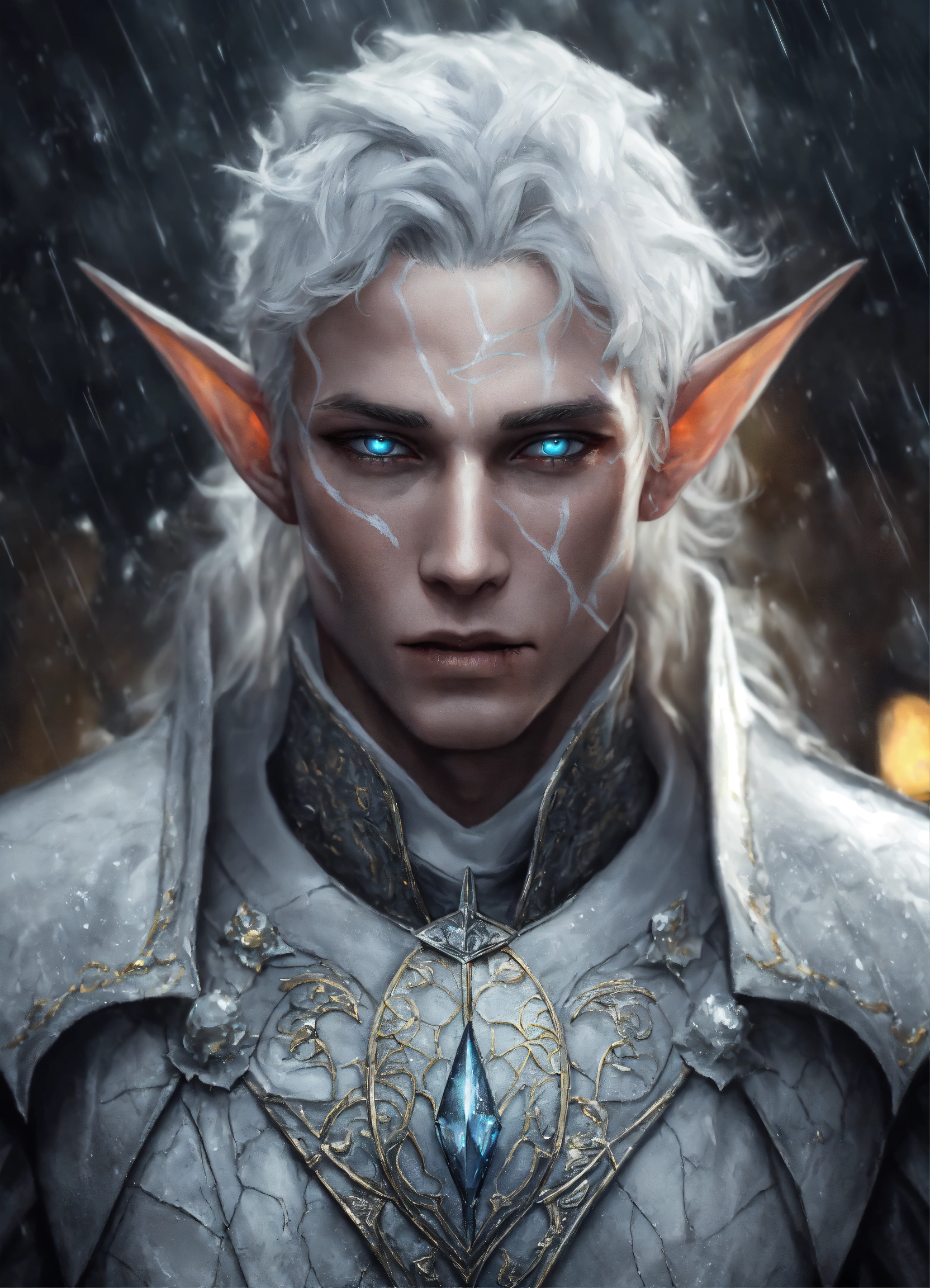 Fantasy portrait of a ash-grey skinned elf, masculine, androgynous, glowing white cracks in skin, glowing white scars, blank white eyes, sharp features, sad expression, fangs, glowing white curly hair, rainy castle background, ultra detailed