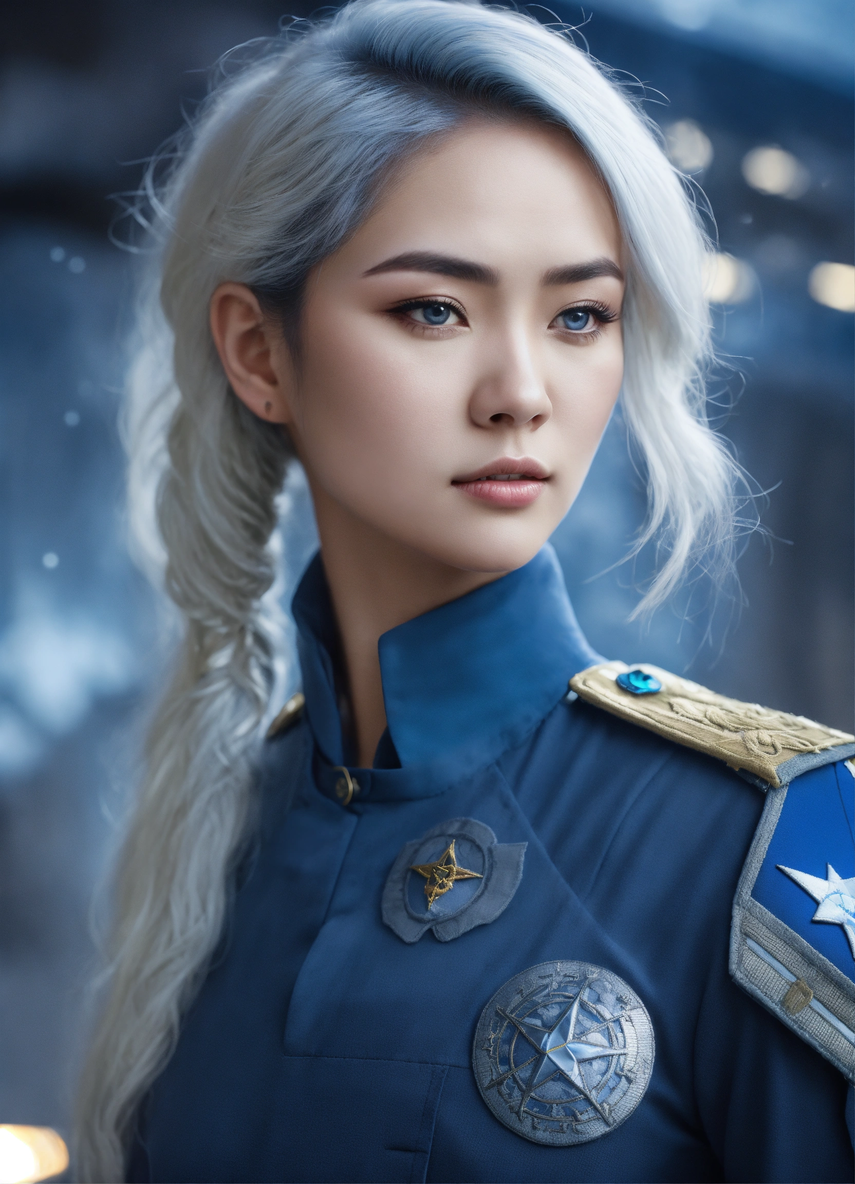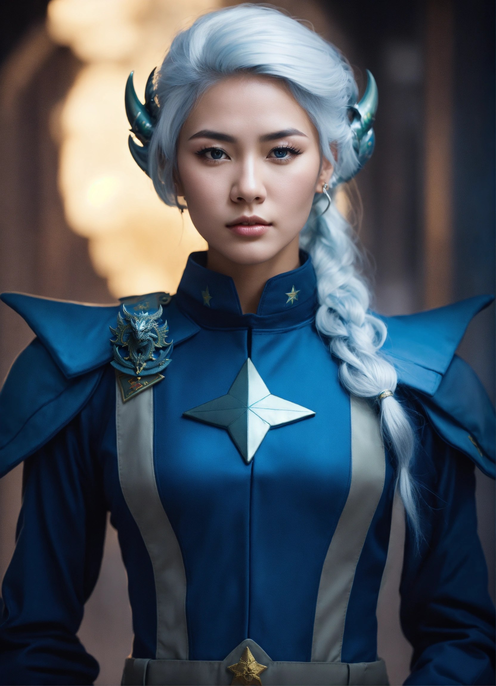 A beautiful alien woman, with white hair, light blue asian eyes, wearing indigo blue star command military uniform, with insignia on her chest. serious and serene look. very beautiful. no make up. in the background, a transparent dragon.