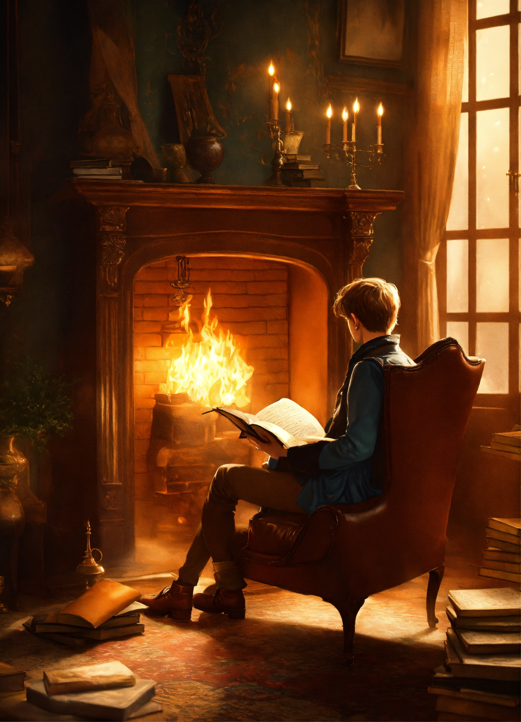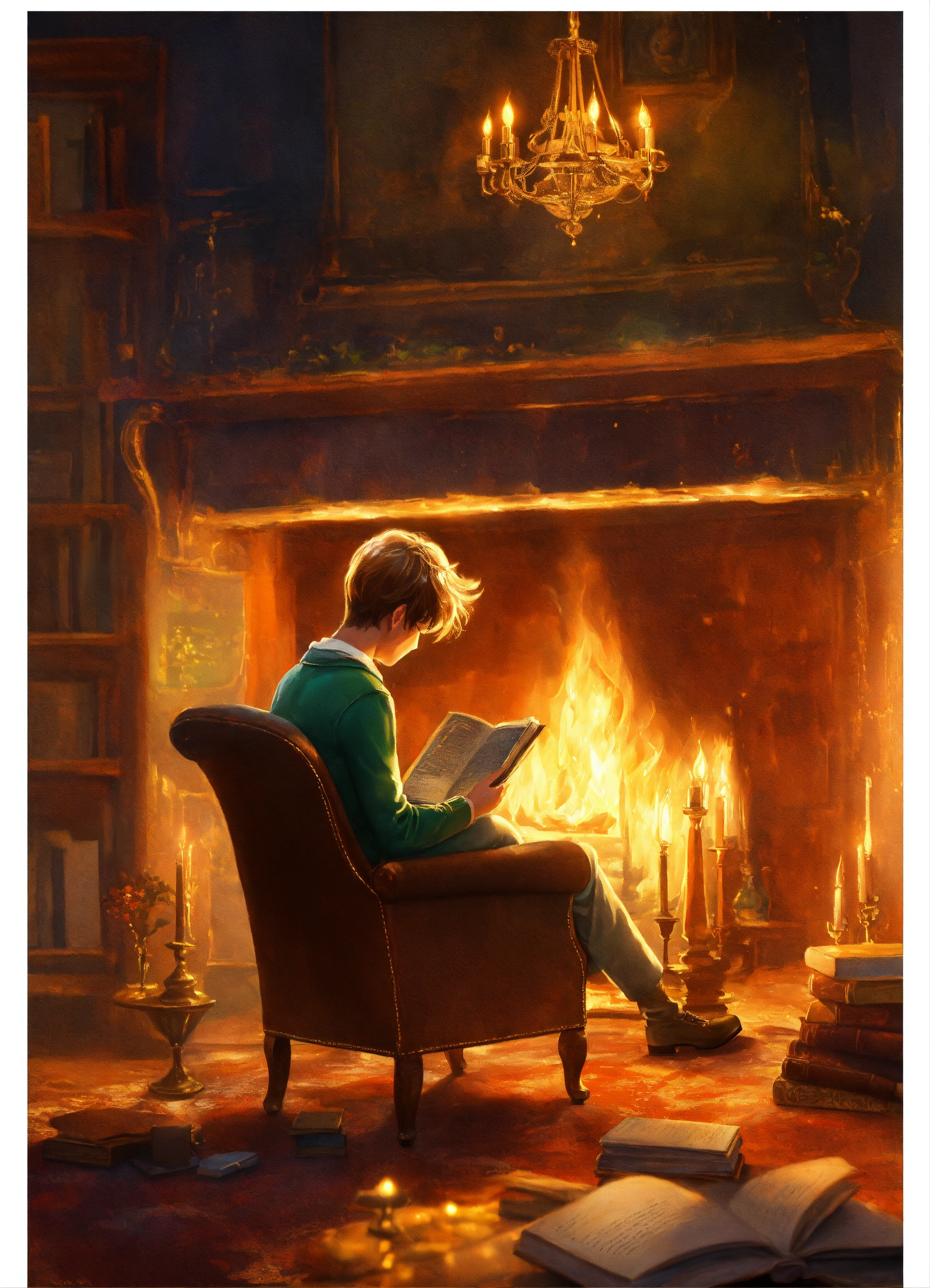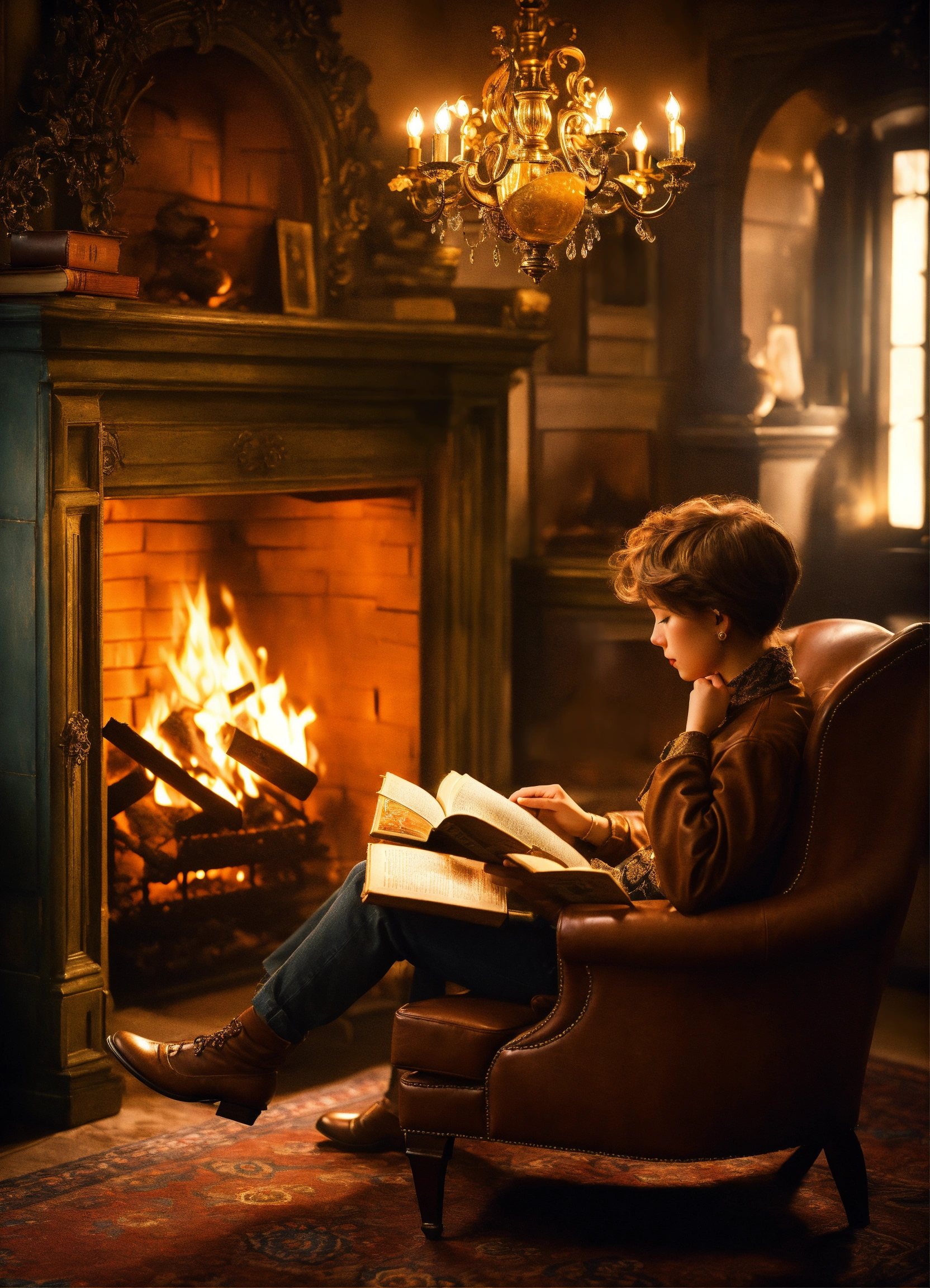 A person reading "the little prince" on a vintage leather armchair by a crackling fireplace. the warm, cozy room is filled with antique books, and a dimly lit chandelier adds an old-world charm. as the person flips through the pages, characters from the book come to life, appearing as ethereal, translucent figures around them. the atmosphere is both nostalgic and enchanting, with a touch of mystery. style photorealistic with a hint of magical realism execution high-resolution digital painting, emphasizing warm lighting and rich textures