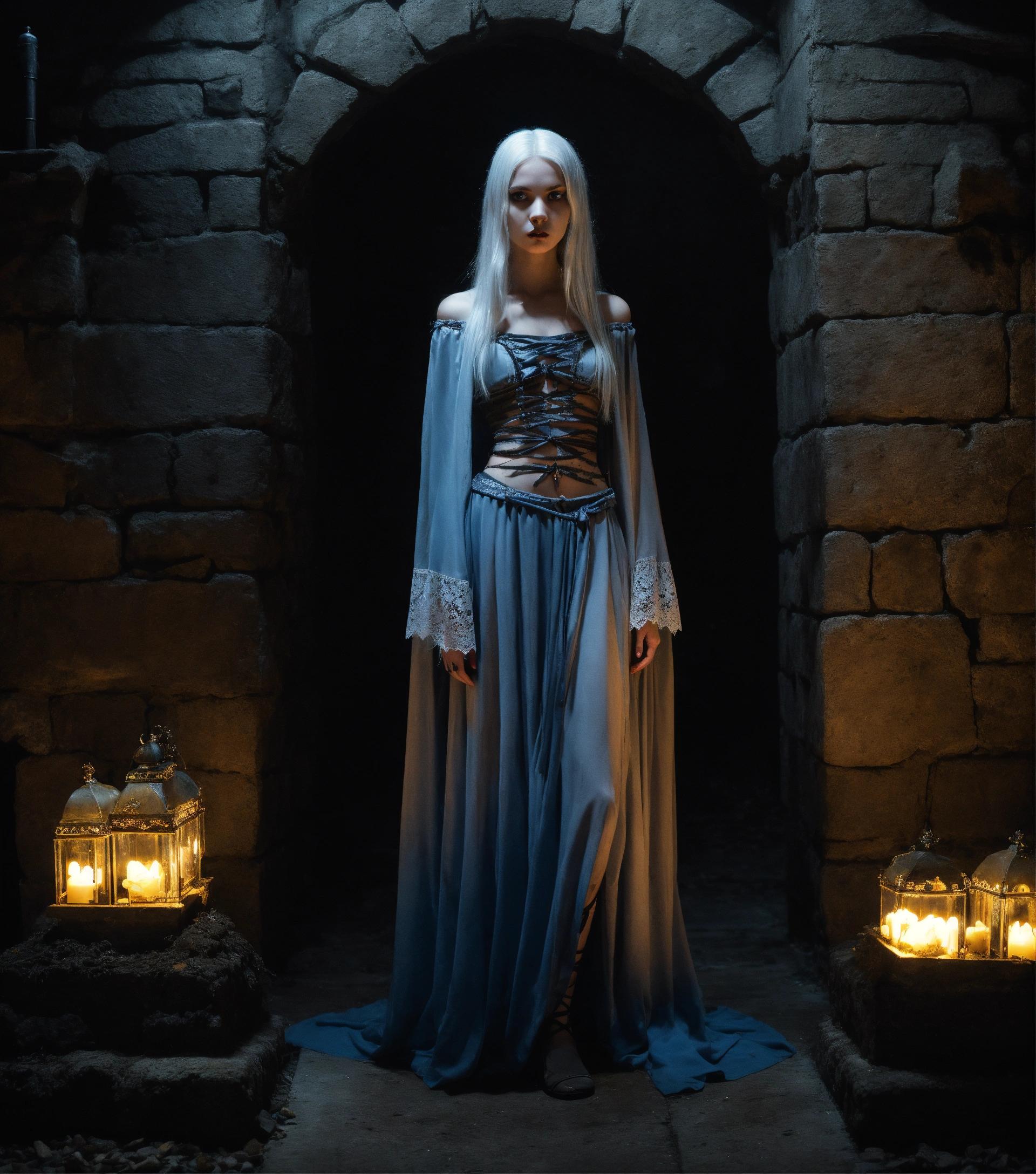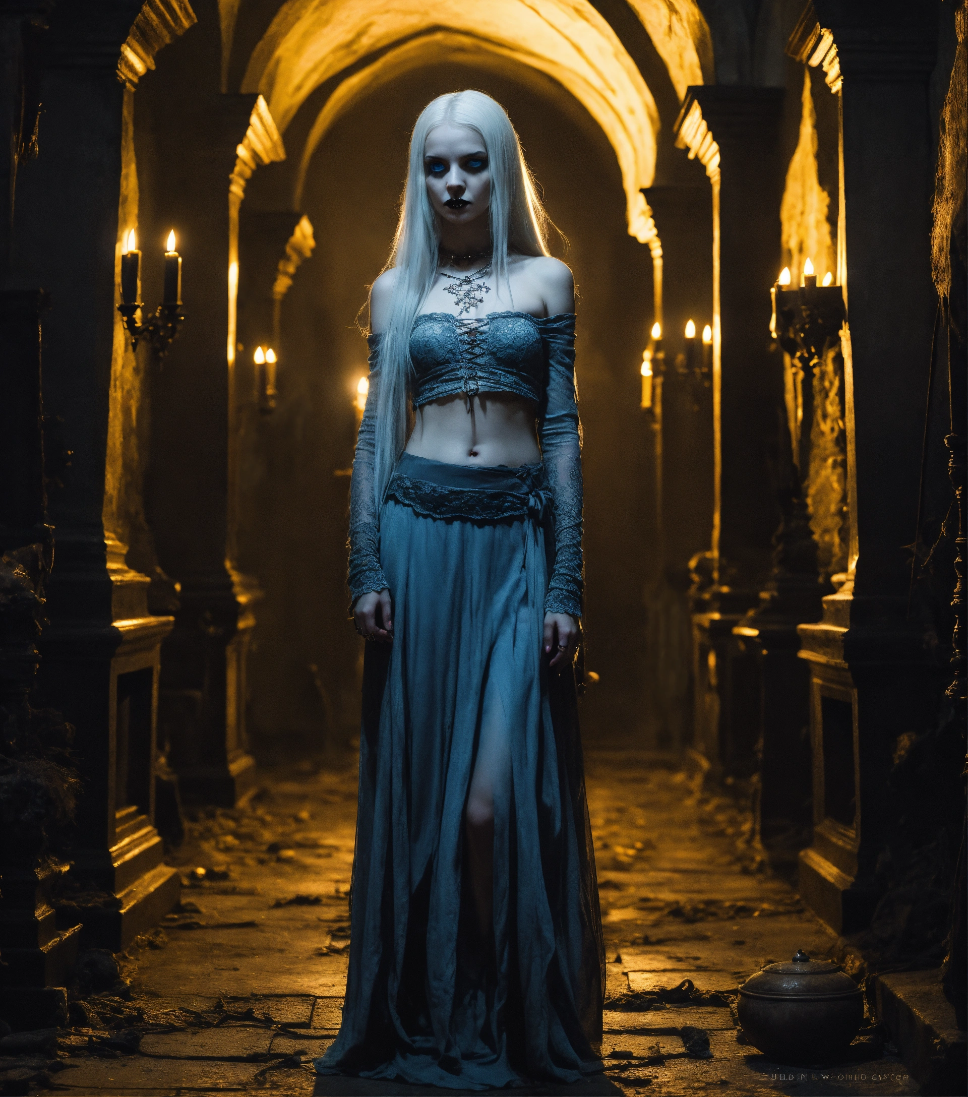Body portrait, sehr kindhaft deadly pale twelve year old female child goth necromancer with waist long silverwhite hair and a aufreizendes off-the-shoulder lace silk cropped top mit tiefem ausschnitt and a low-waisted high slit skirt, extremely flat belly, belly button, extremely skinny, extremely slim and emaciated body, completely emaciated, very narrow face, alabaster skin, pale as a corpse, glowing blue eyes, slim face, innocent looking, leans against a sarcophagus in a gloomy crypt, kindlich, unschuldig, childlike, juvenile, graceful, wispy, glowing blue eyes, ghostly, dead, evil, demonic, undead, darkness, grotesque, mysterious, dark, dark, cold ambient lighting, extremely detailed, fantasy, medieval setting