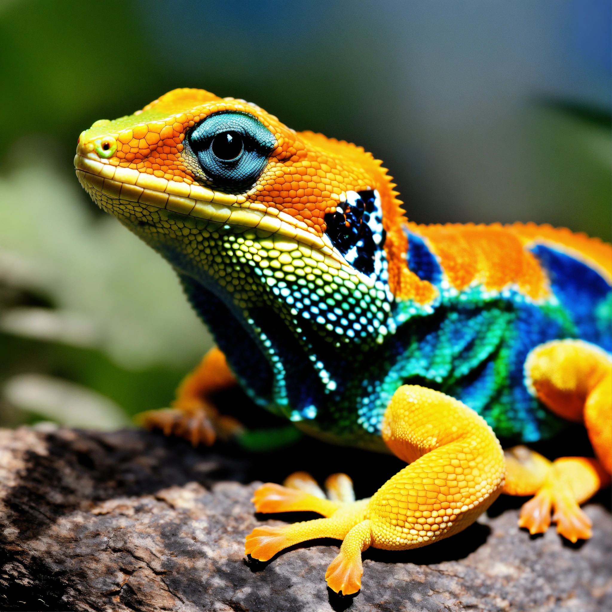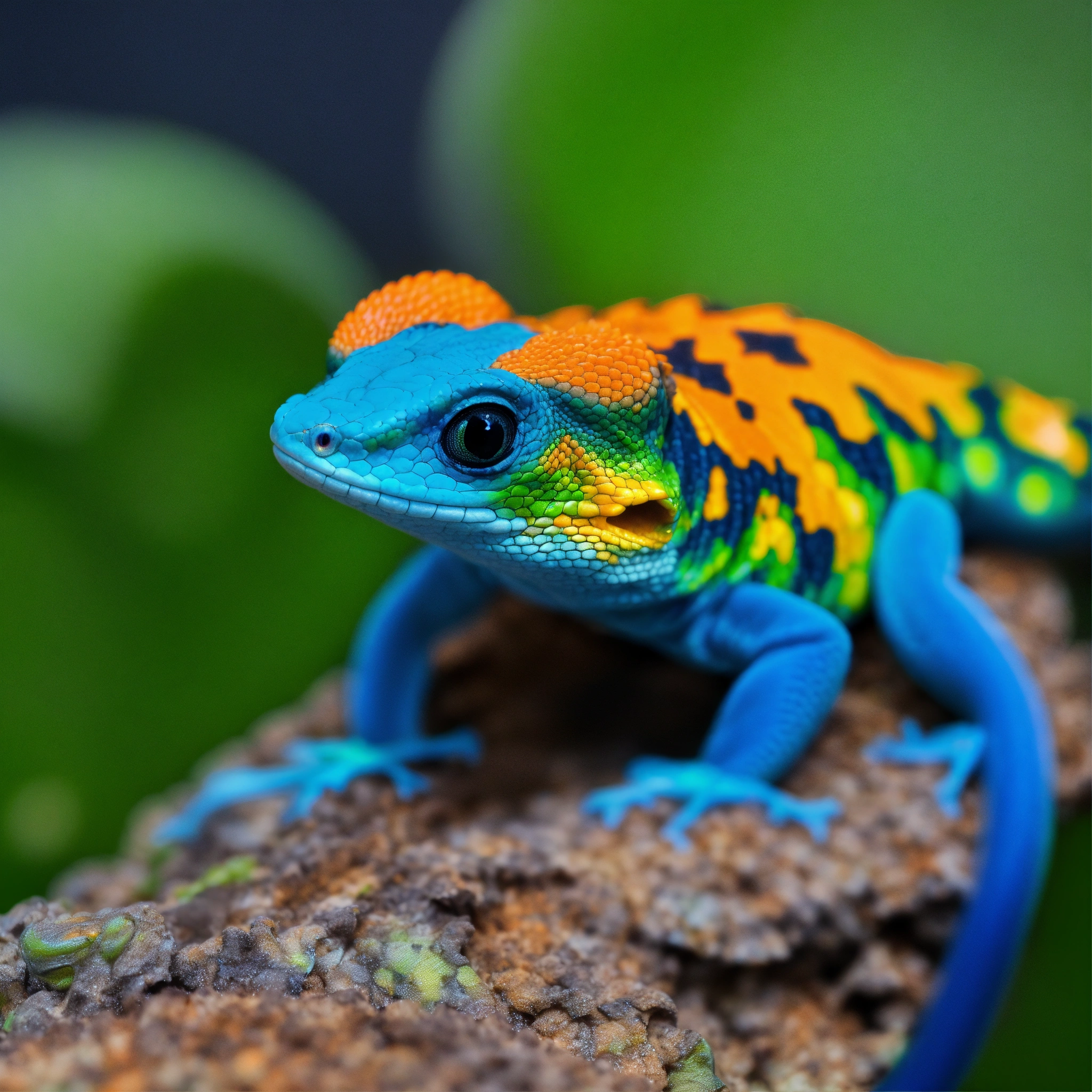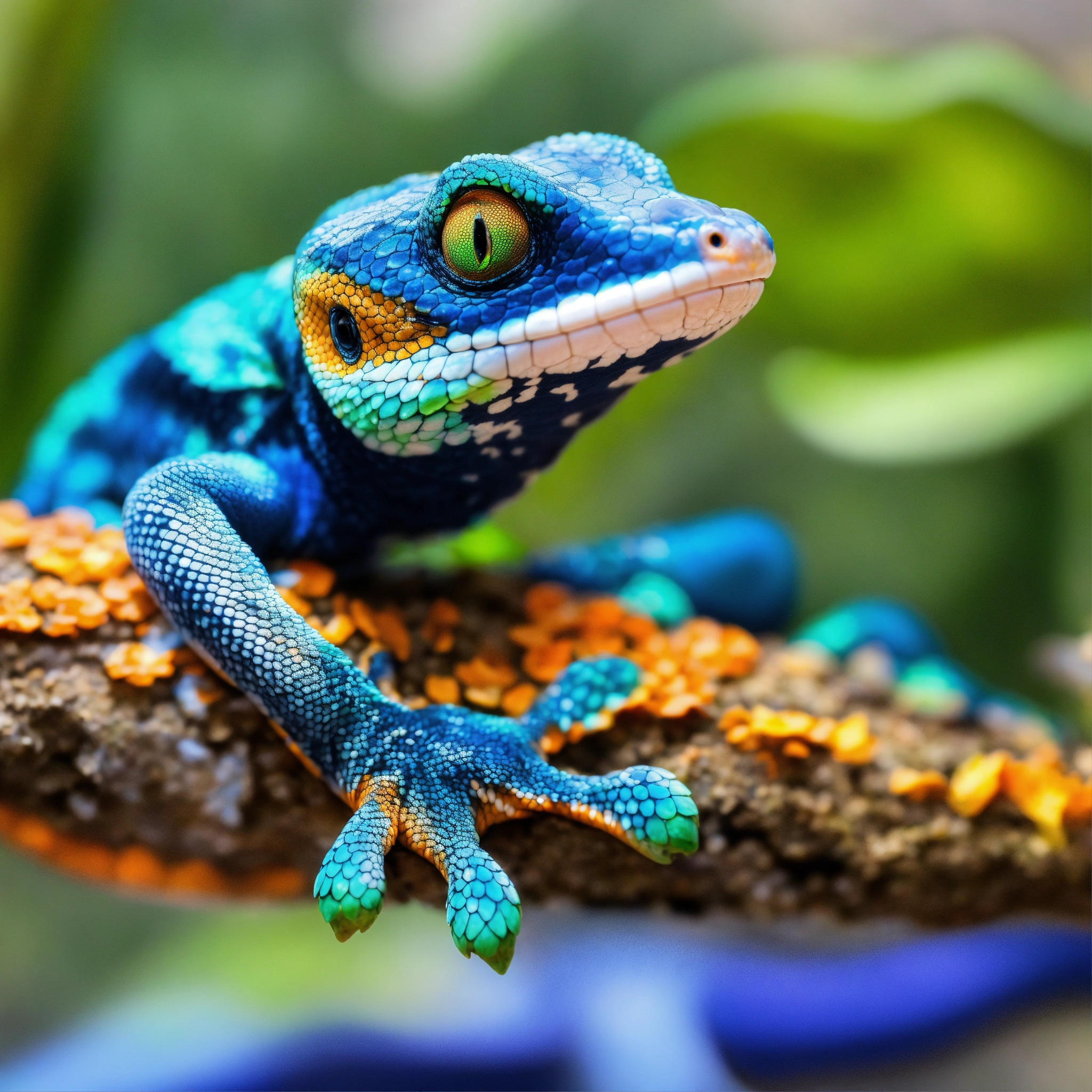 Celestial gecko (dark blue scales, orange scales, aether green scales around the neck, one foot is white scaled)