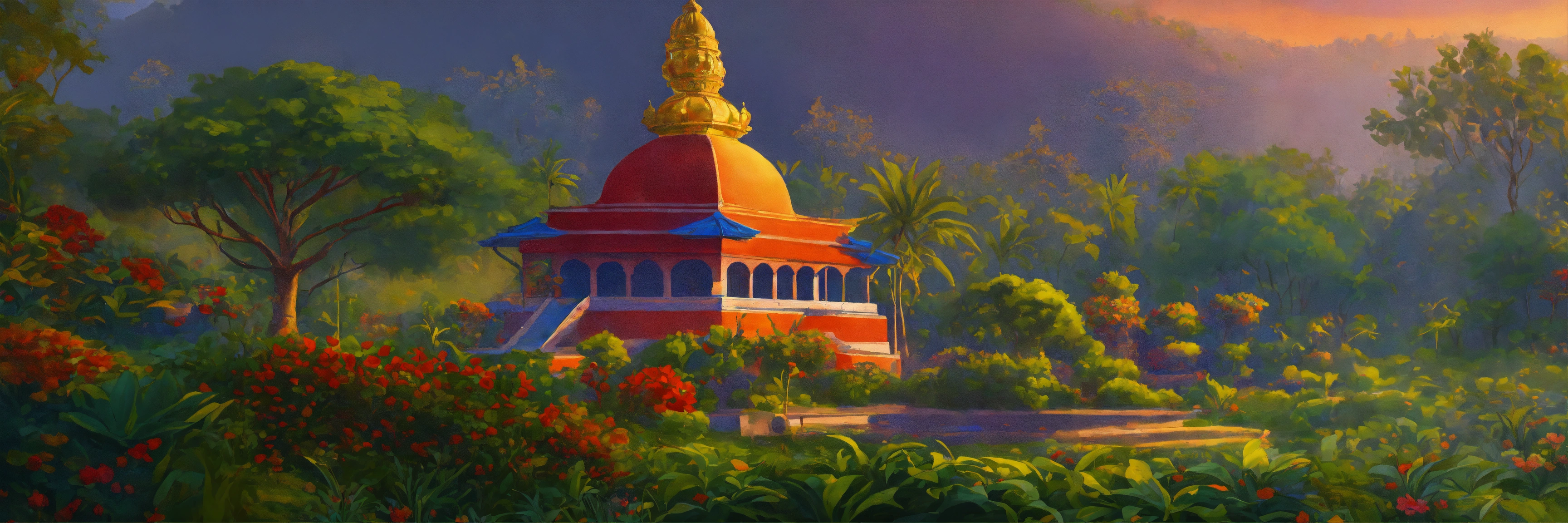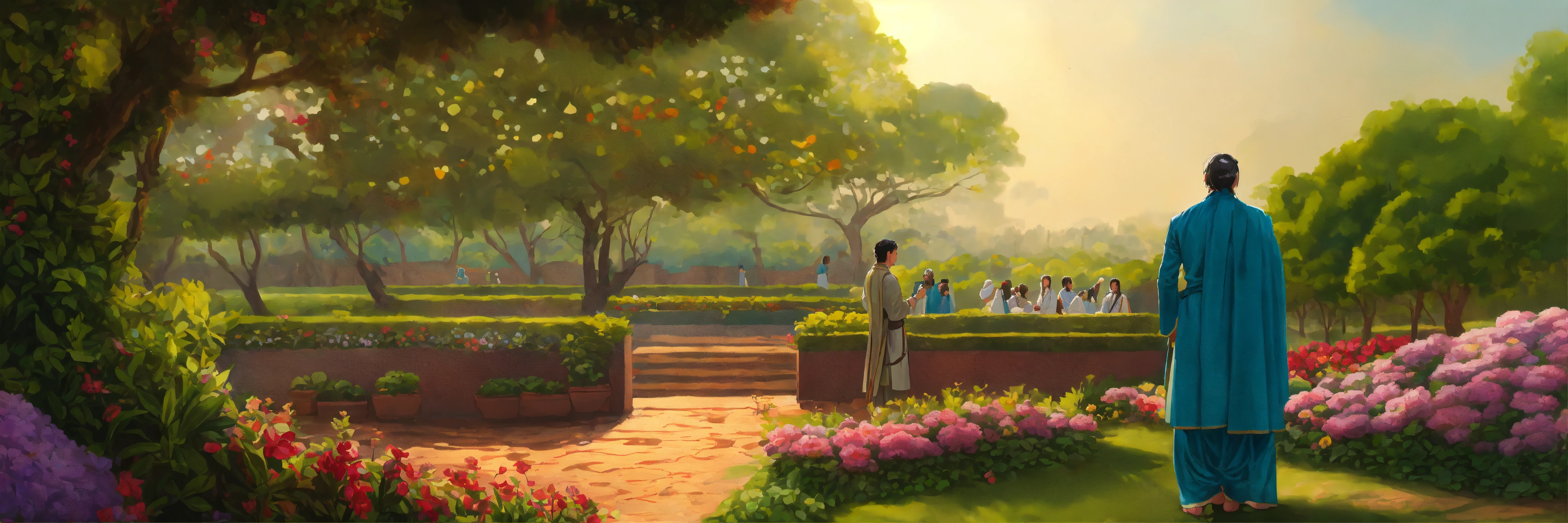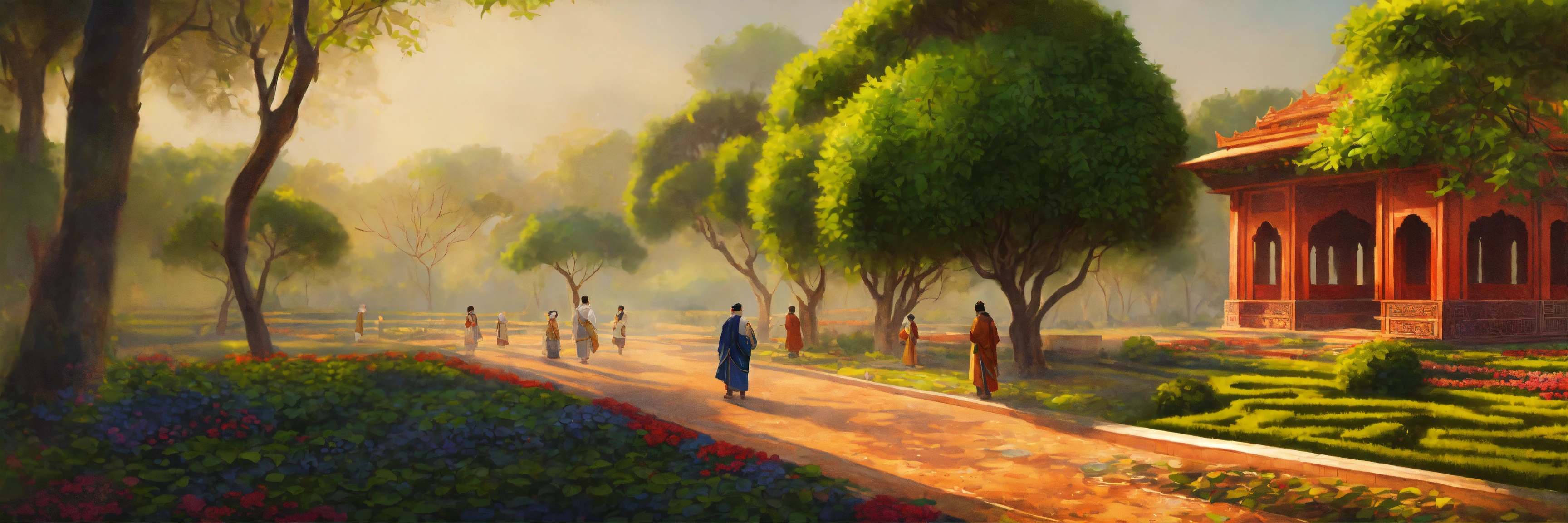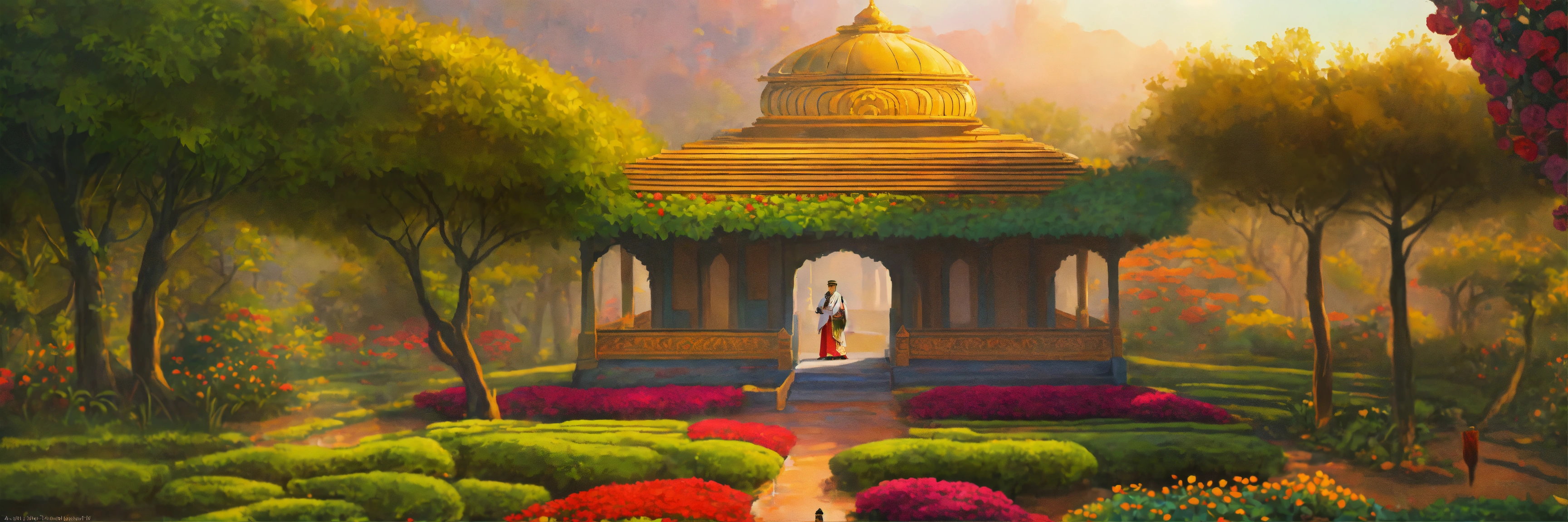 Paint a vivid scene of the small garden hidden behind the ashram, and describe the striking moment when the emperor arrived, discovering a garden engulfed in mud, his feet bare. illustrate the emperor's curiosity as he engages the gardener in conversation, detailed, 16k, focused, extreme details, super resolution, cinematic, masterpiece