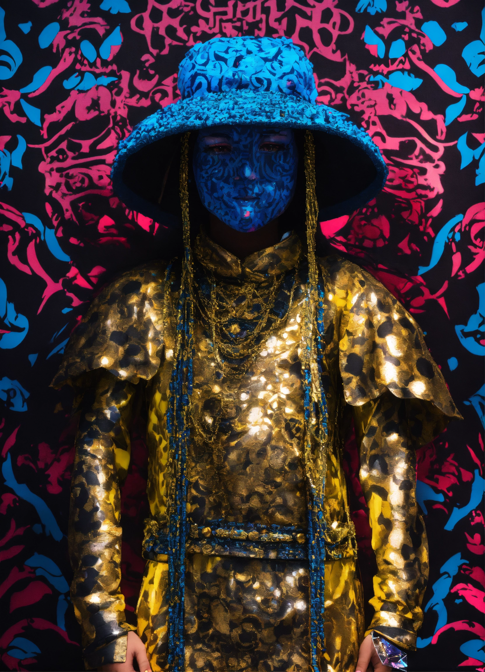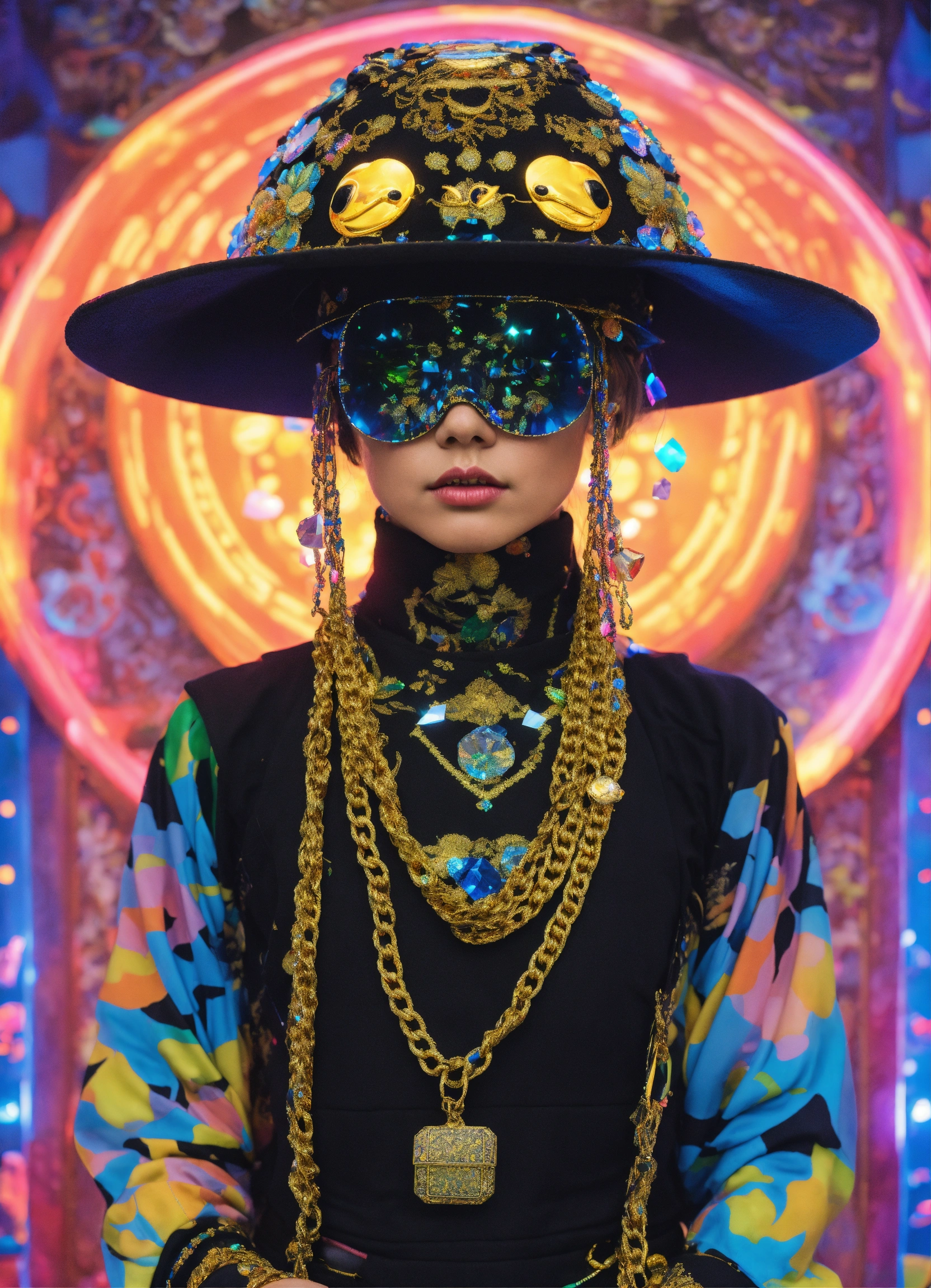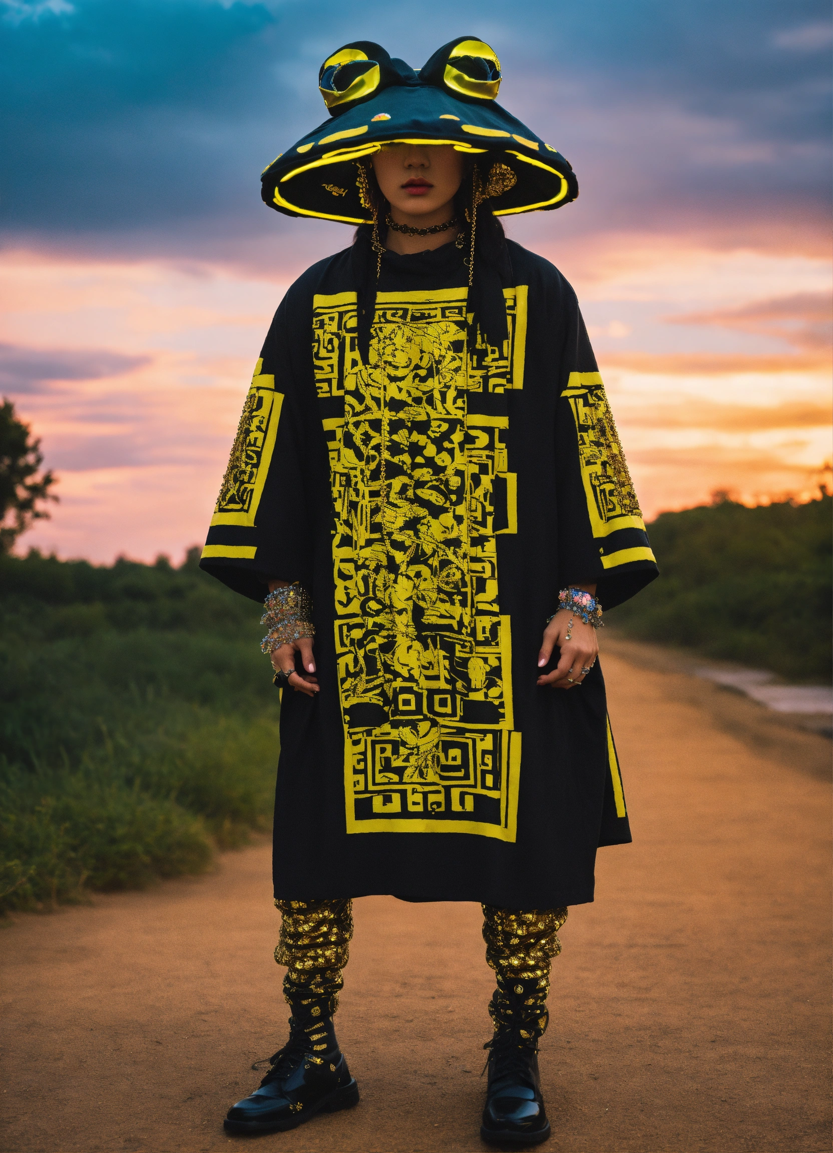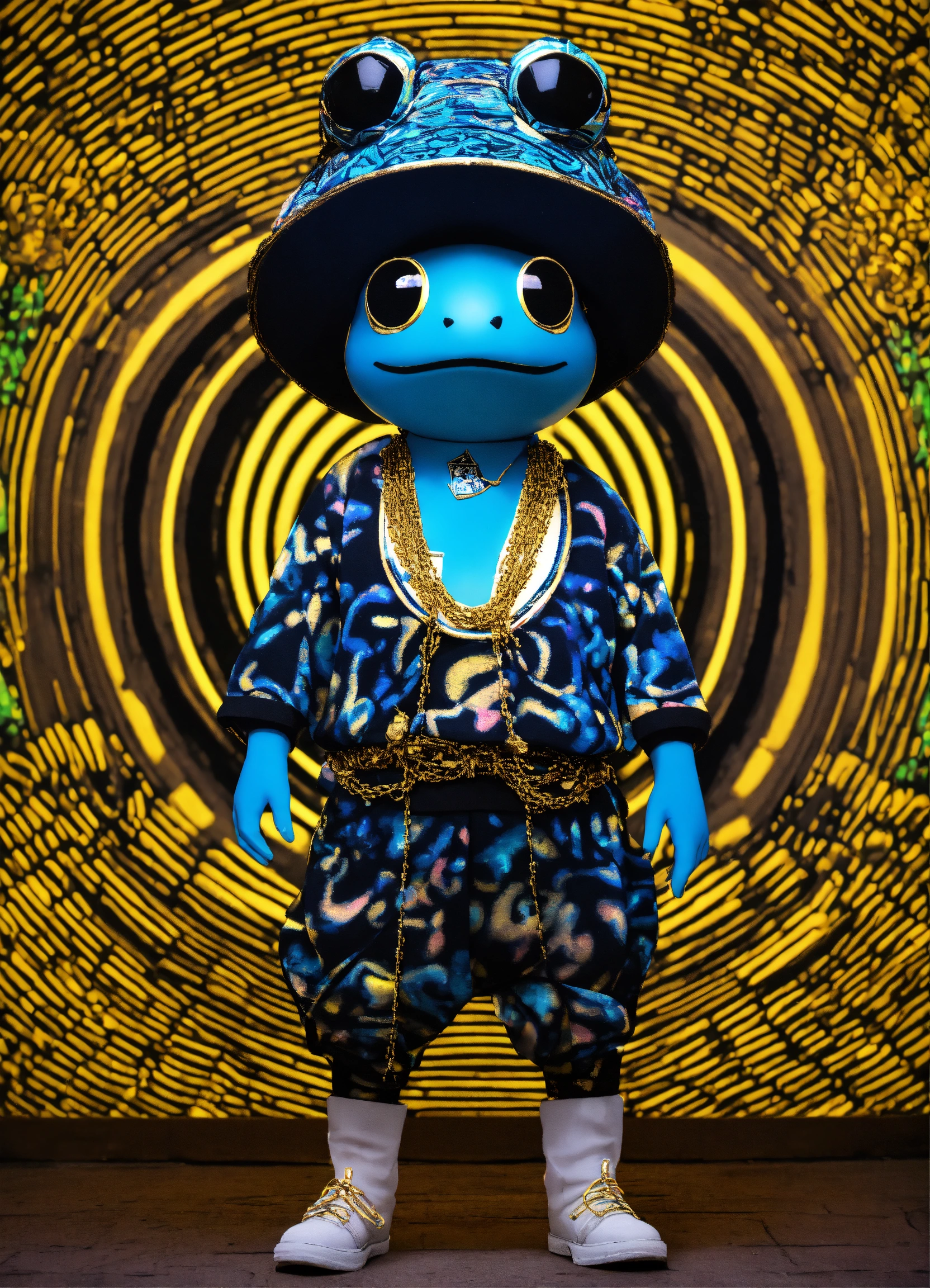 Full body portrait a toad made out of a 3d black and sapphire crystal cloud psychedelic patterned light neon optical illusion, festival raver street wear, kawaii hat with crystal hemp gold black chains, ninja qr code samurai in folk costume in a fashion magazine