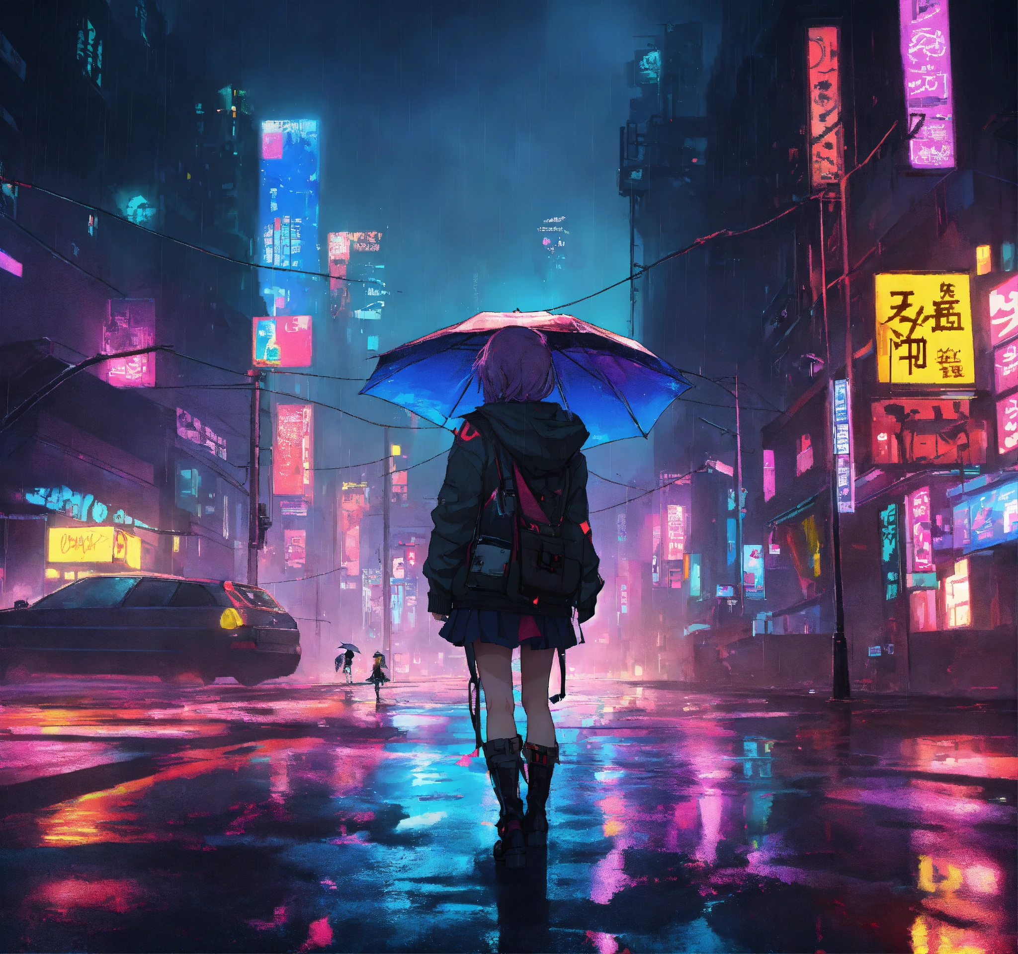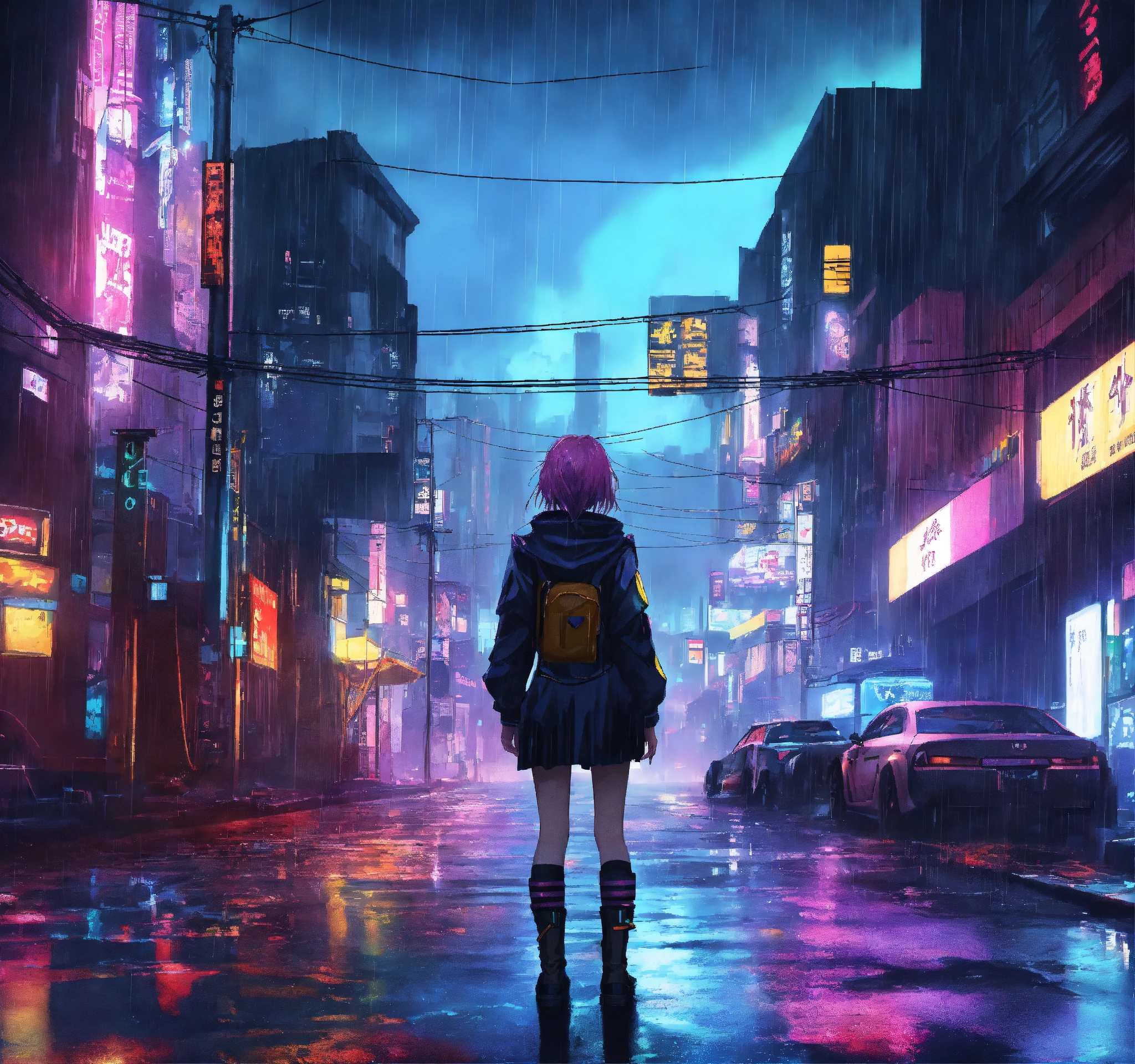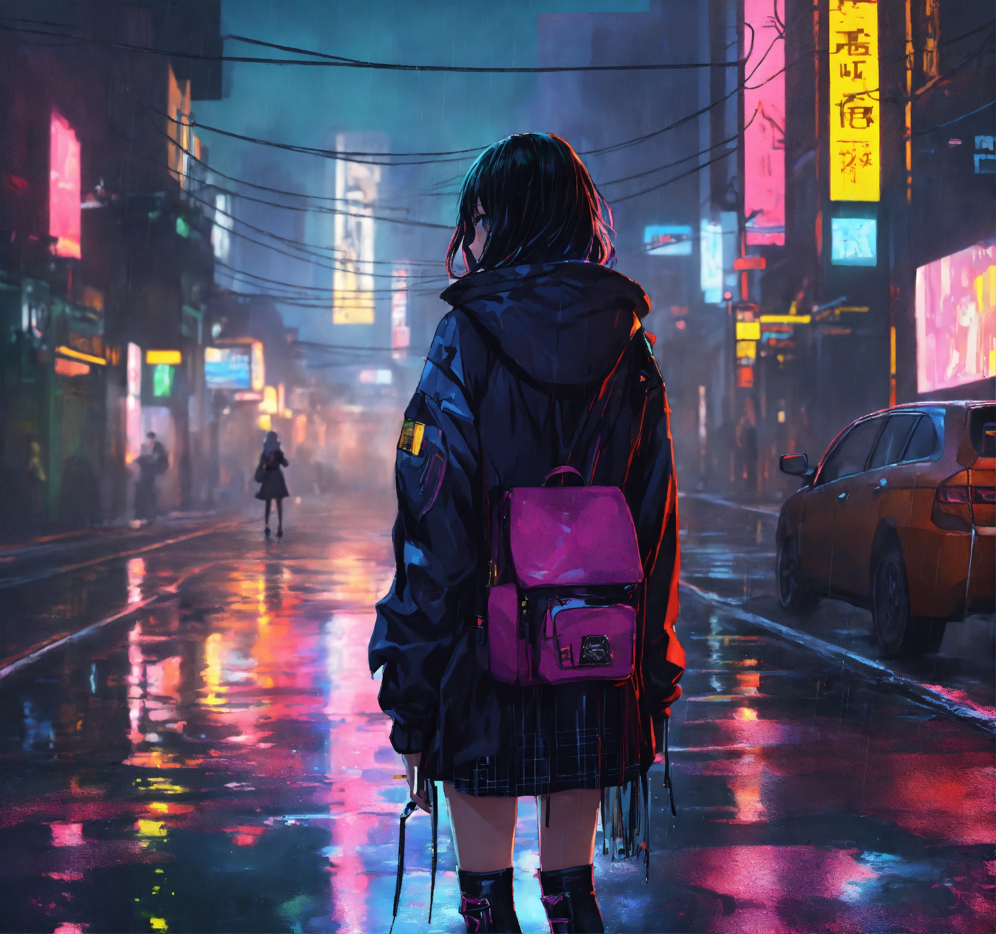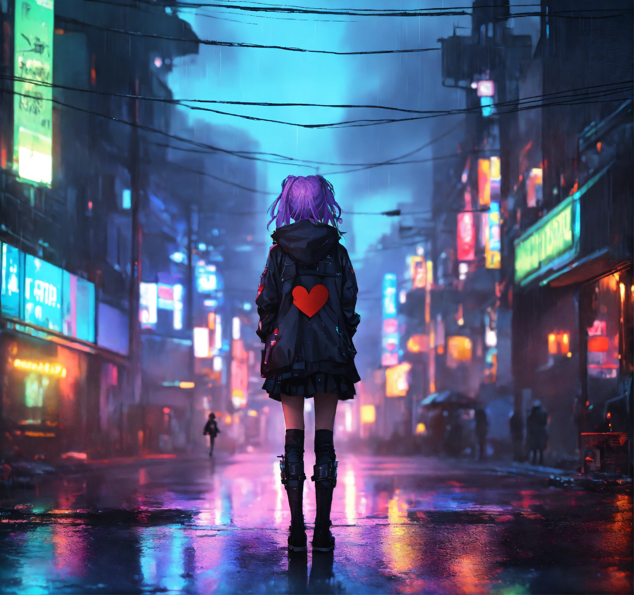 Cyberpunk city heart broken gothic girl standing in the middle of the street while it is a rainy dark night anime style colourful