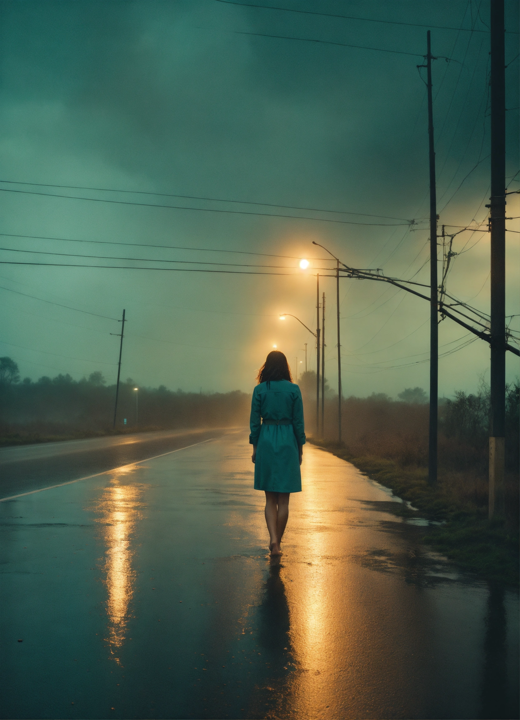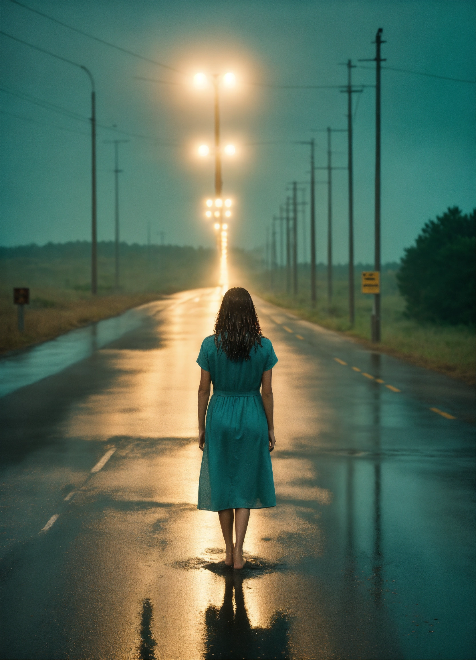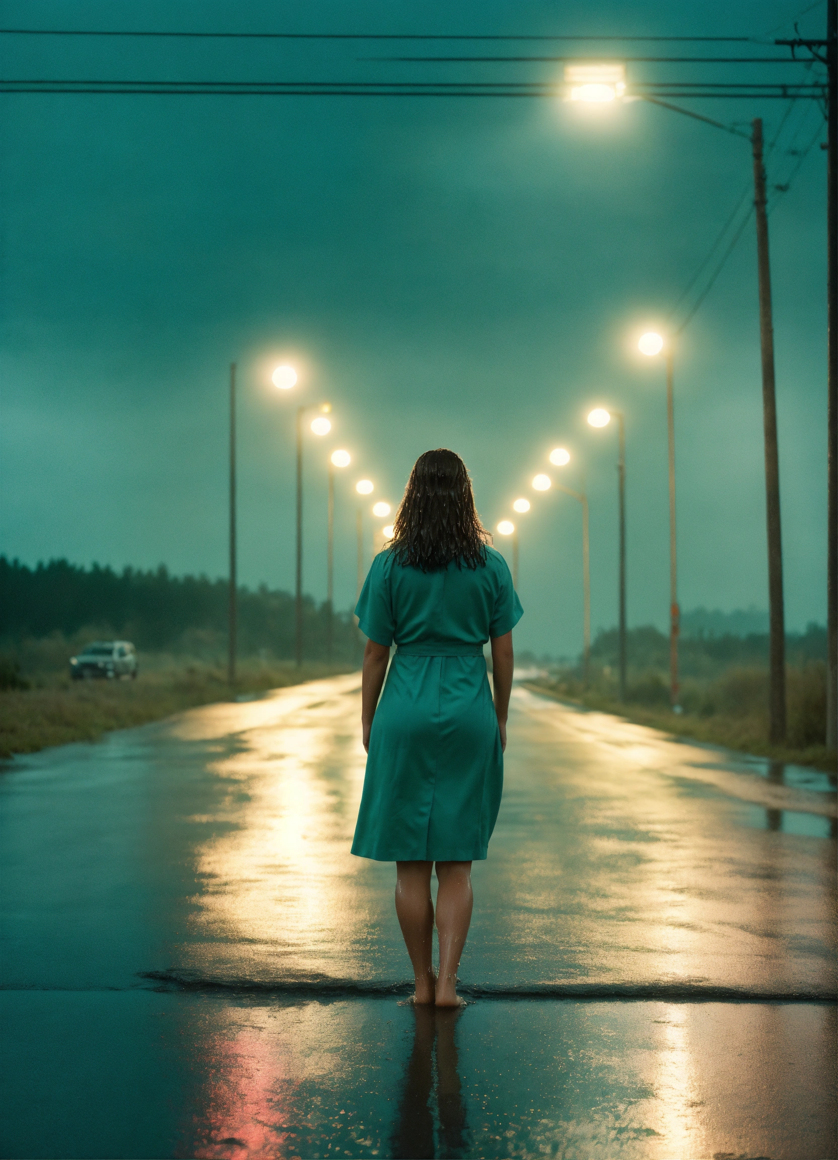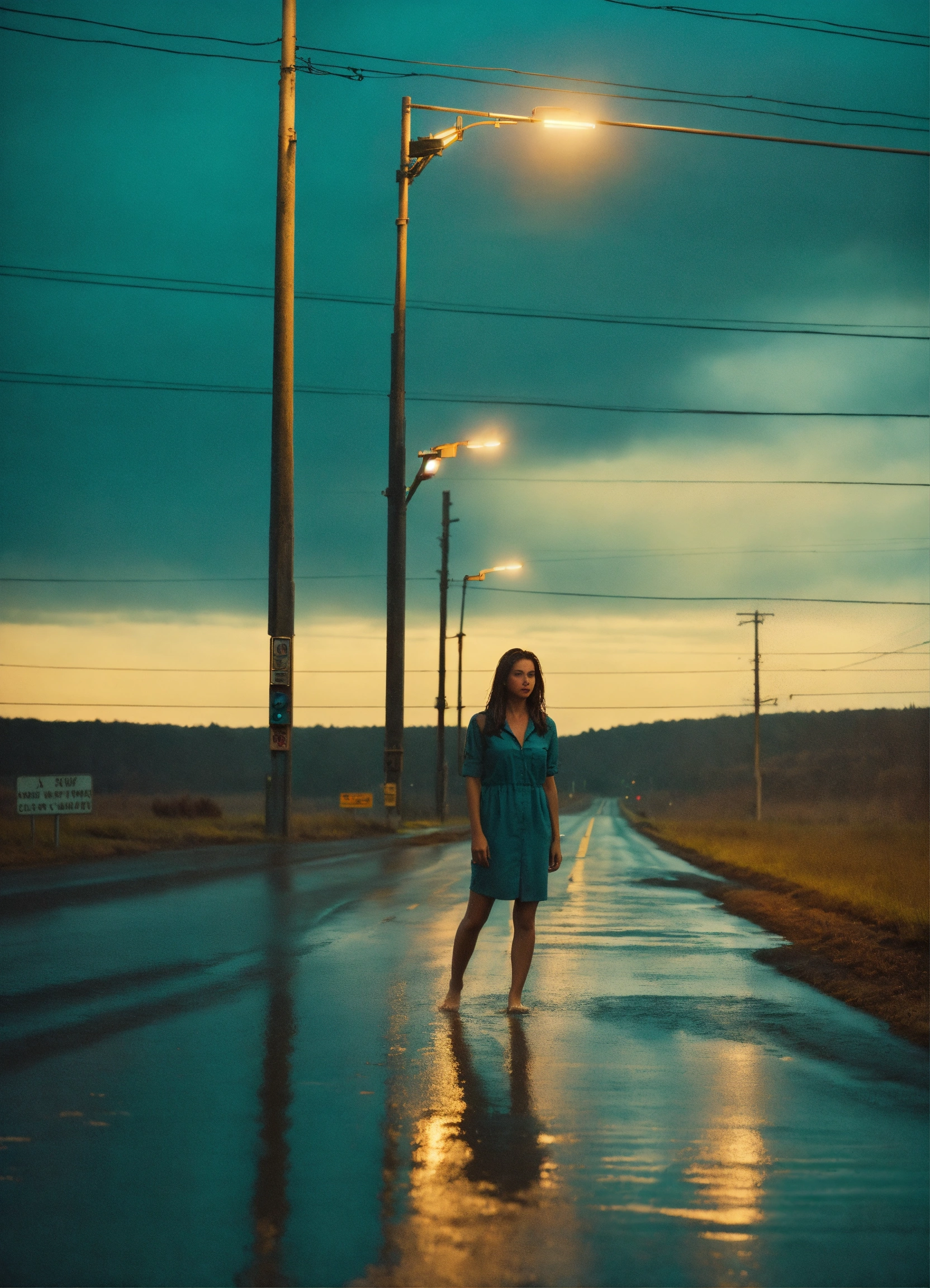 A retro photograph of a woman with long brown hair standing on wet road on a highway with no traffic, bare feet, gregory crewdson style wide format, a single teal street light reflecting on the wet road, 8k, cinematic, open sky