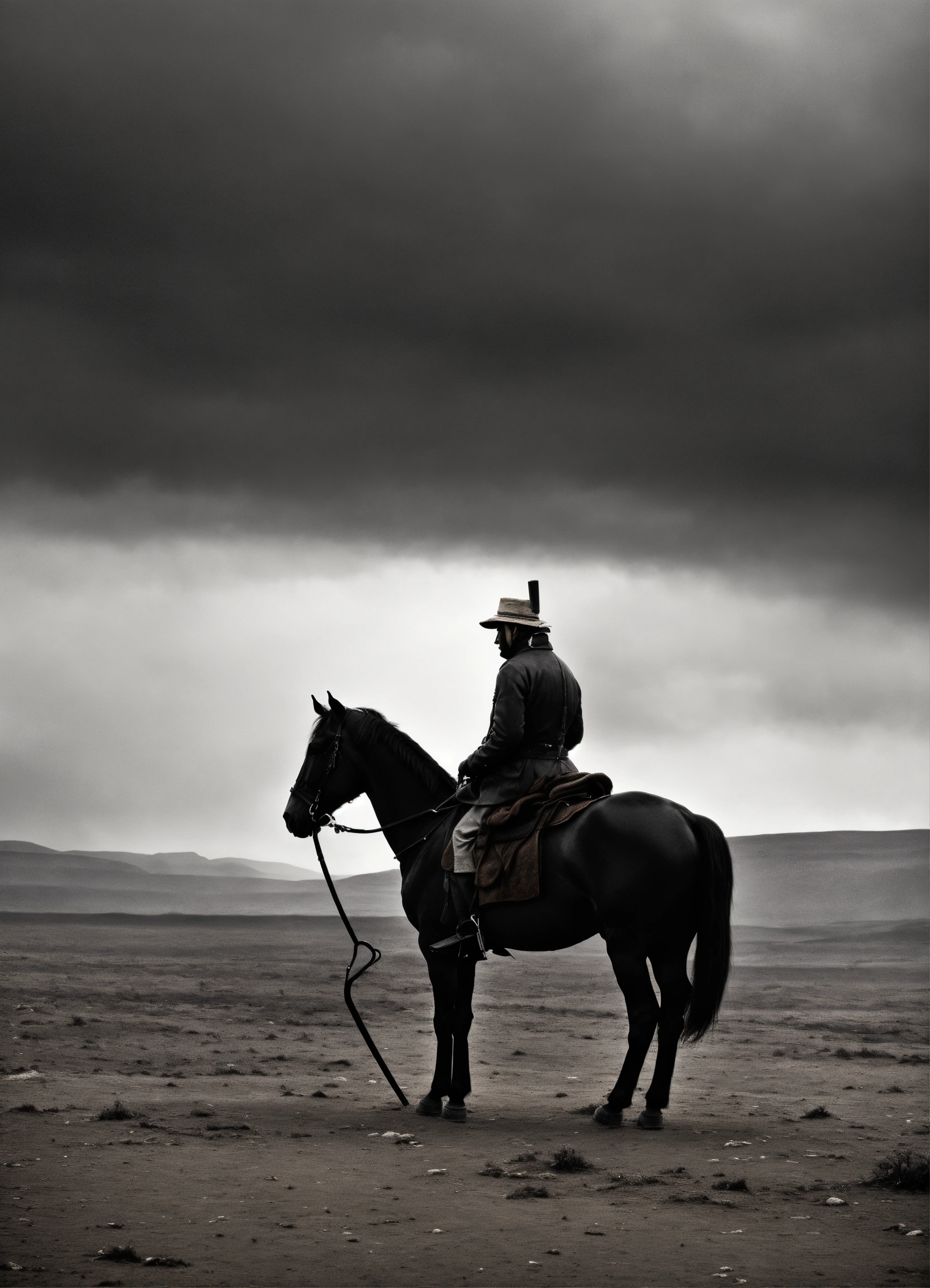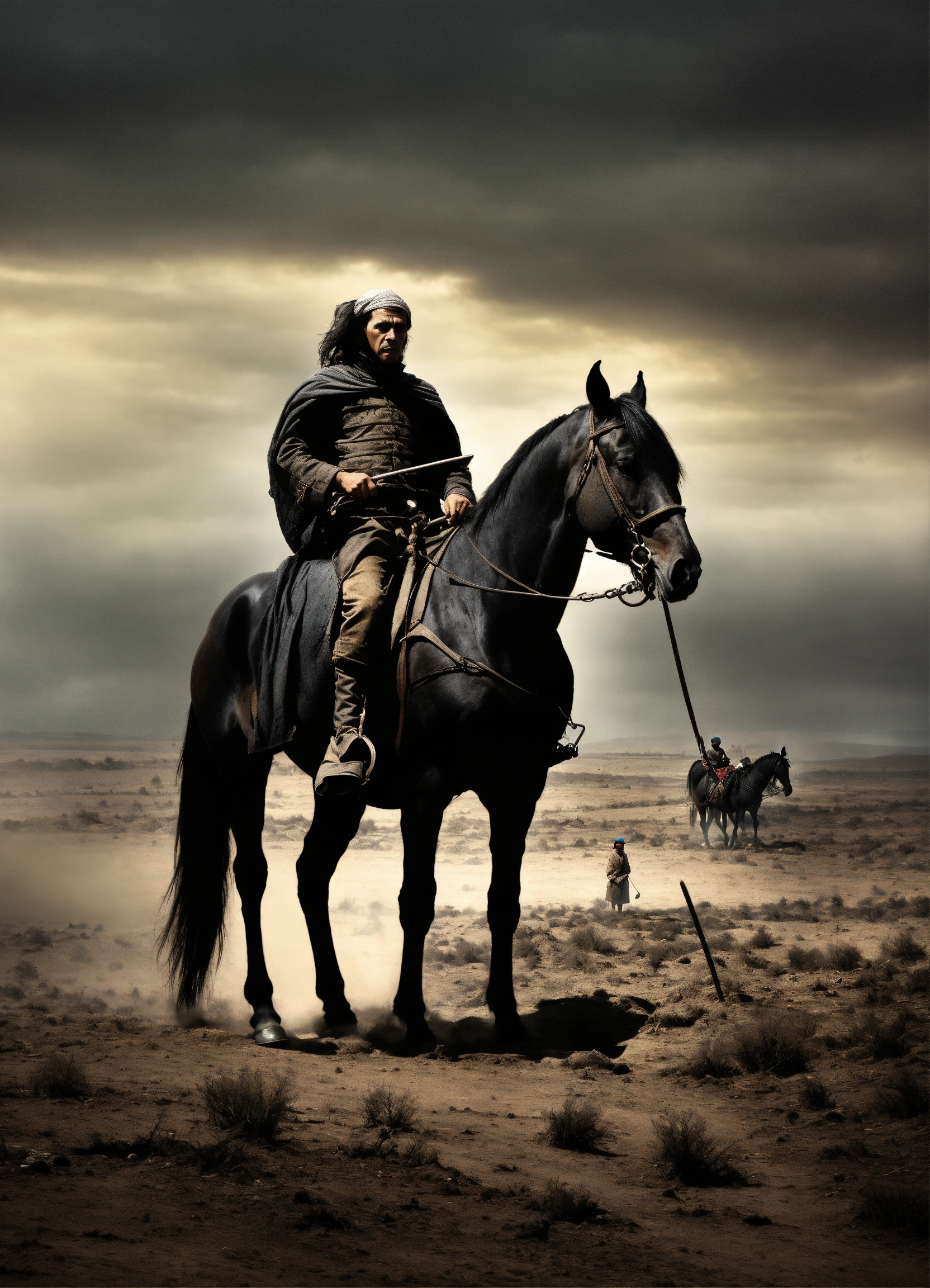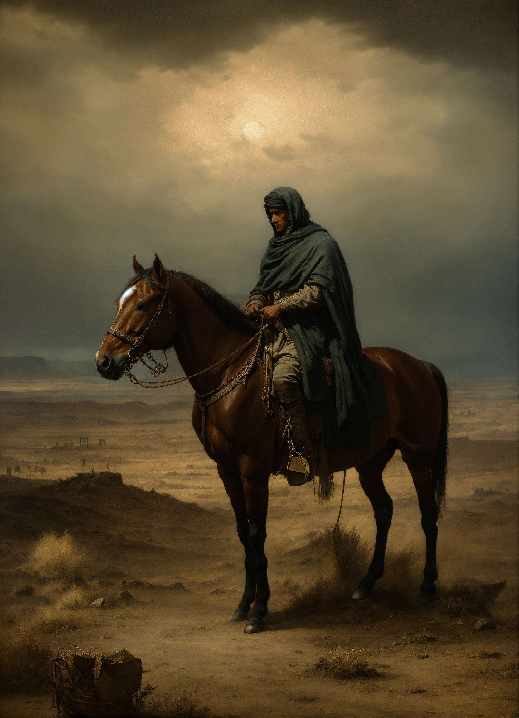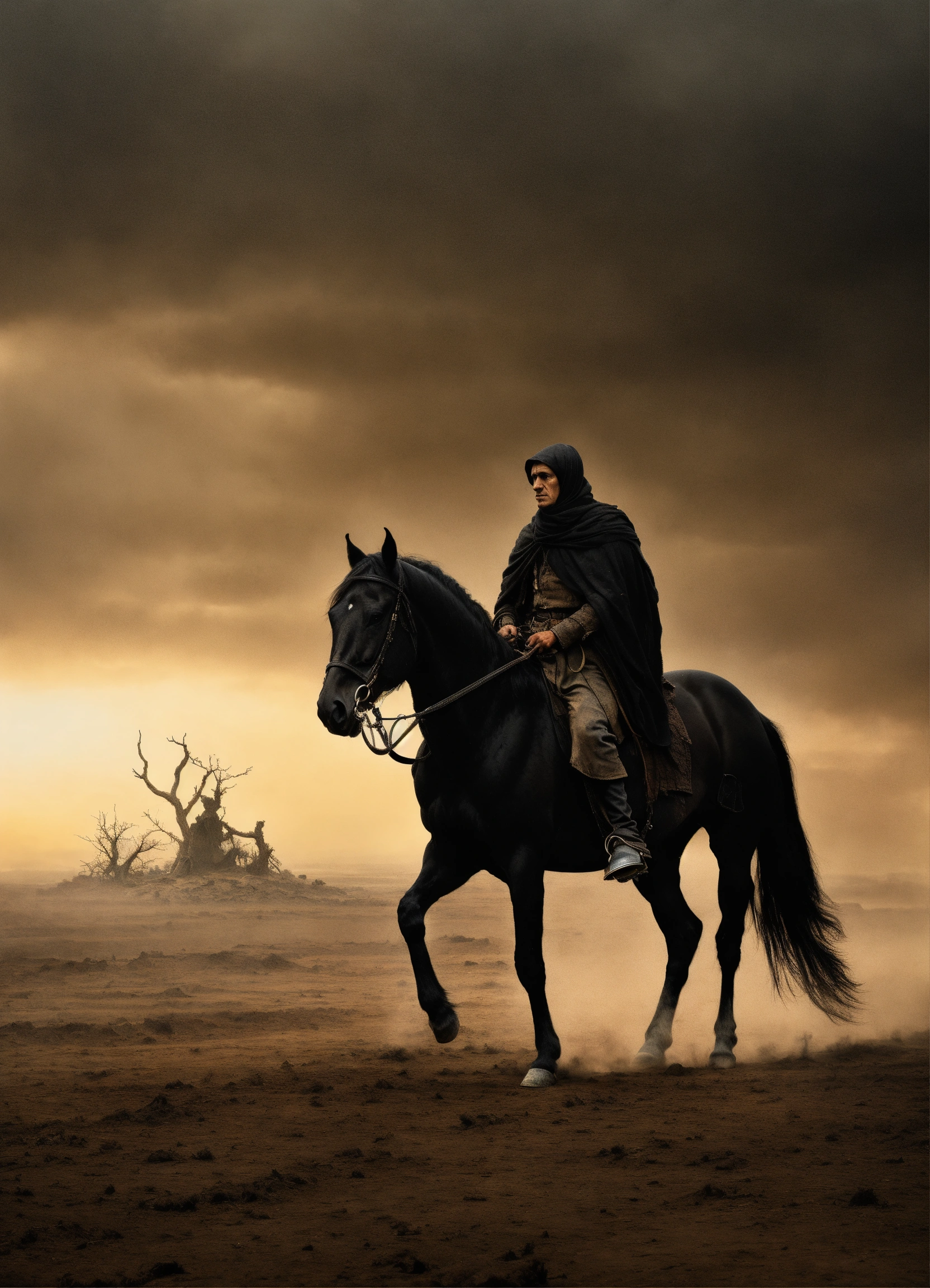 Depict the horseman on a black steed, holding a pair of scales in a desolate, famine-stricken landscape. use dark and muted tones to convey a sense of scarcity and economic hardship. the composition should evoke a feeling of foreboding and scarcity, prompting viewers to reflect on the symbolic meaning of this horseman, often associated with famine and hardship in the end times.