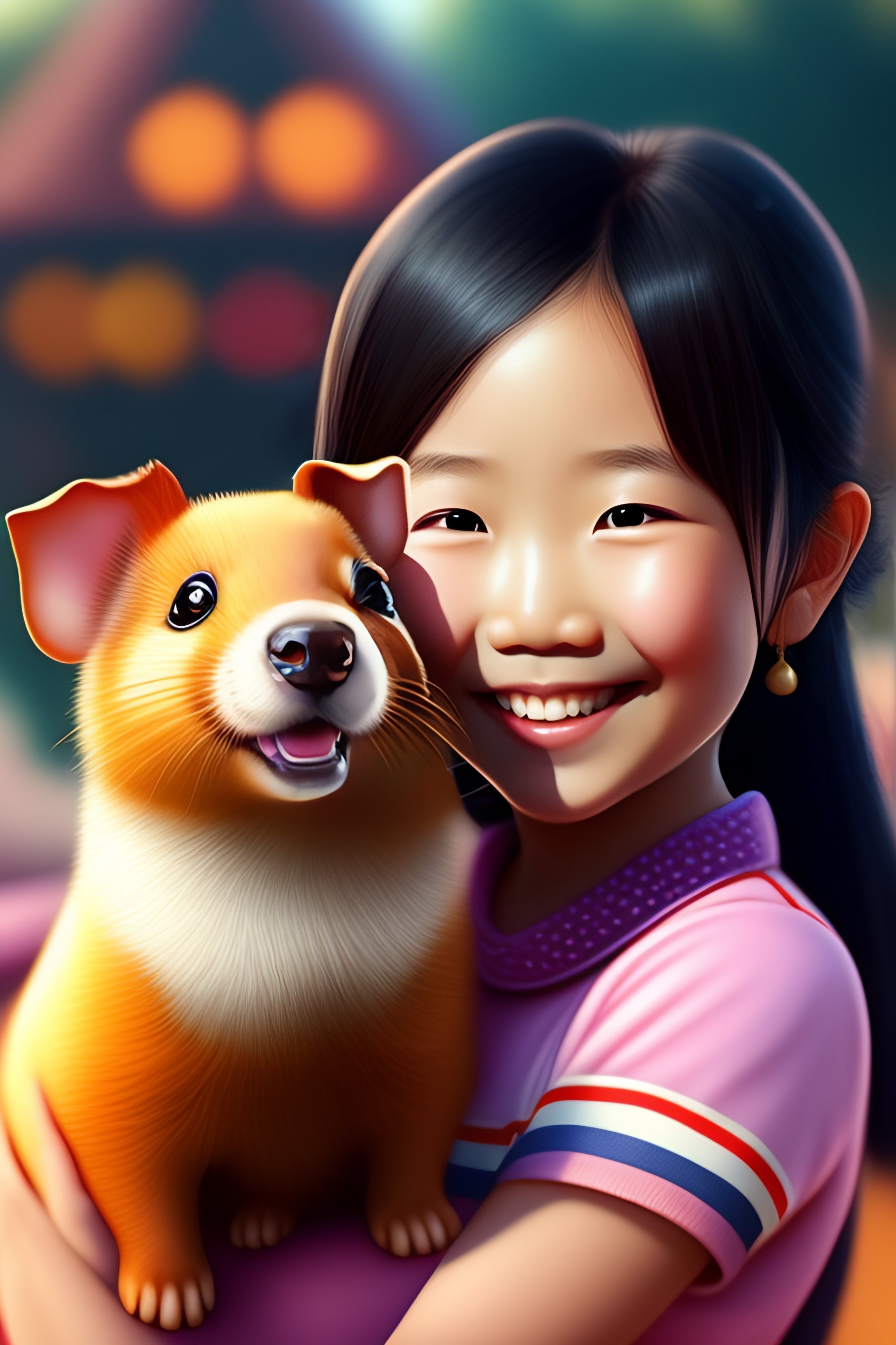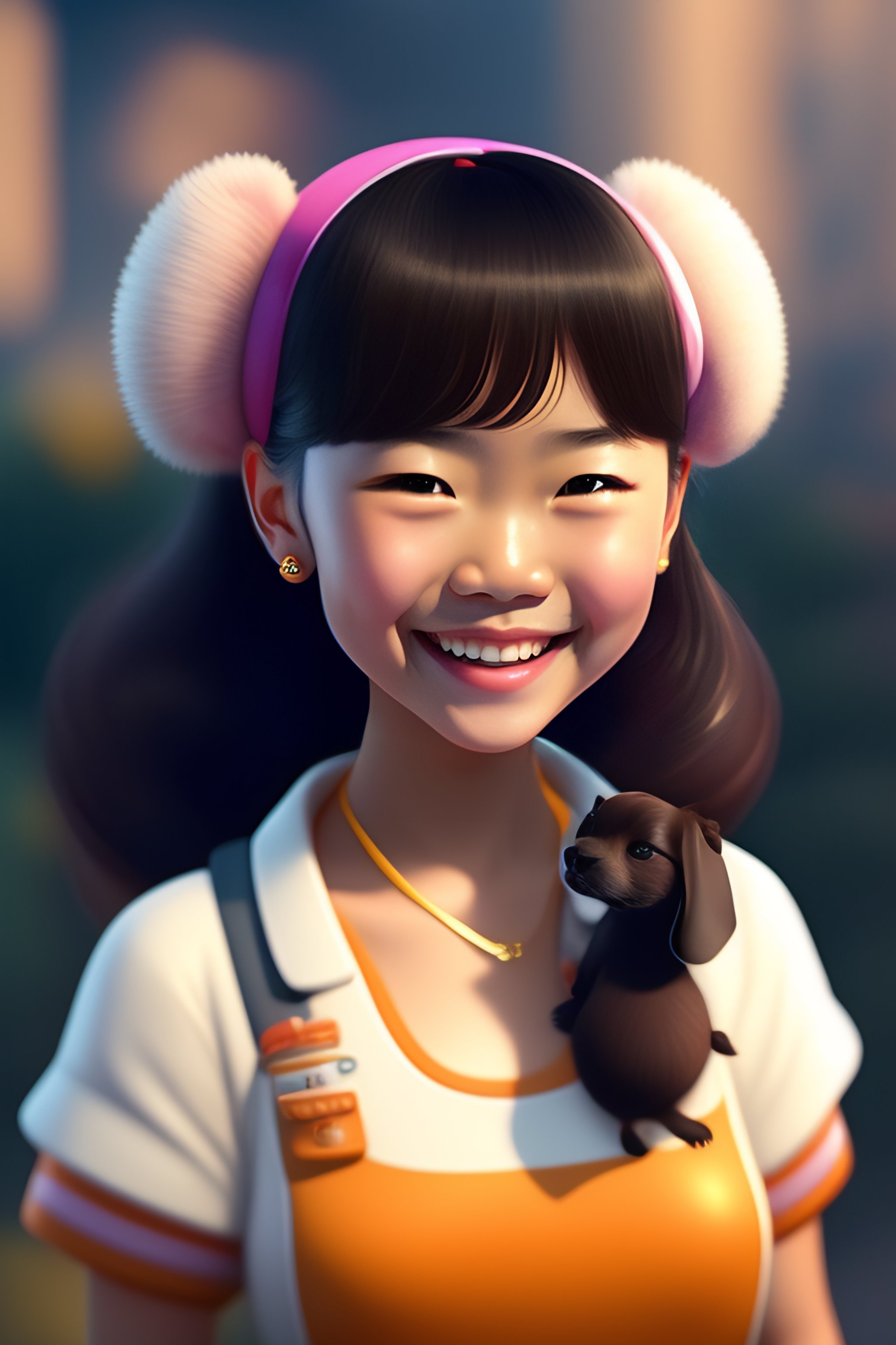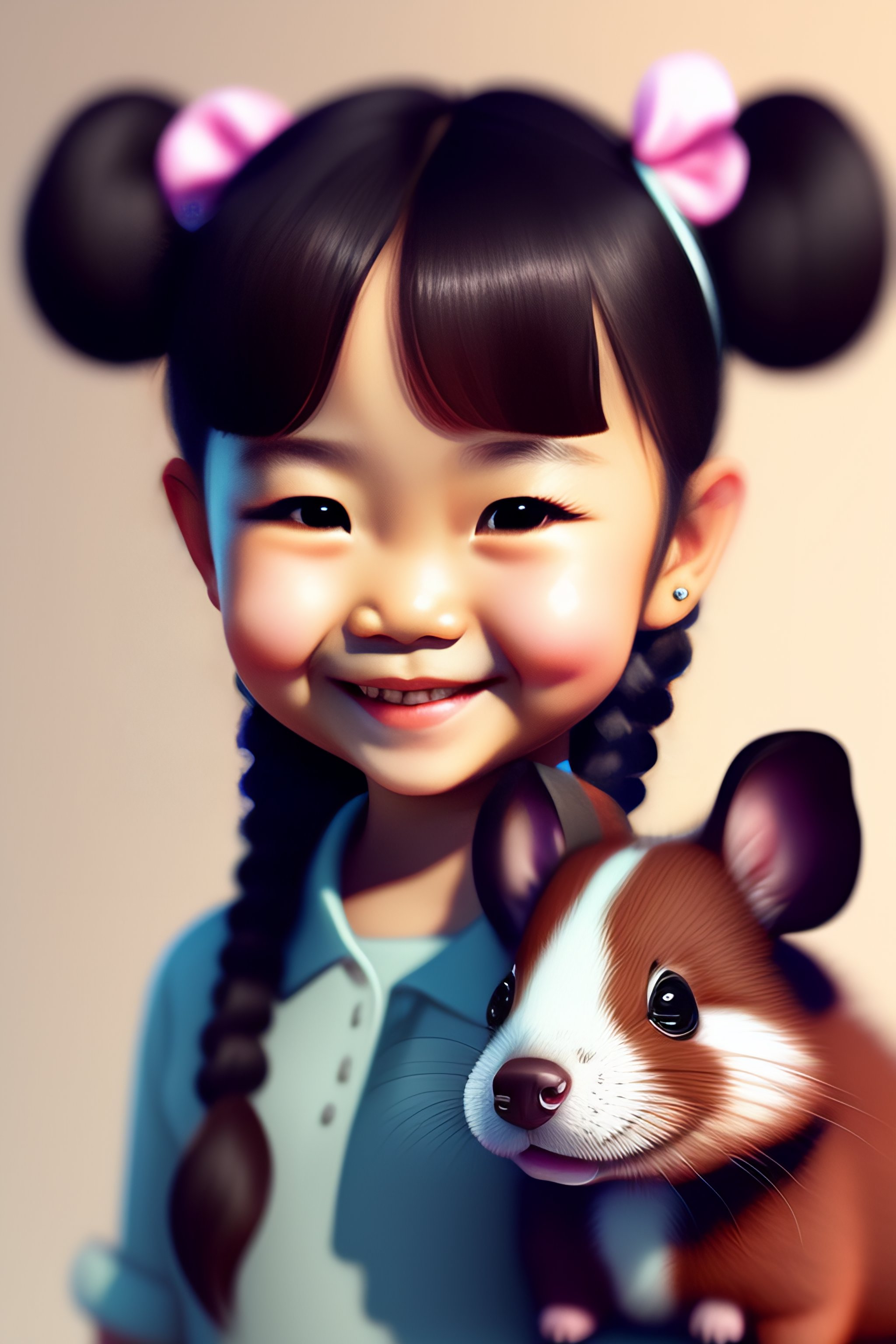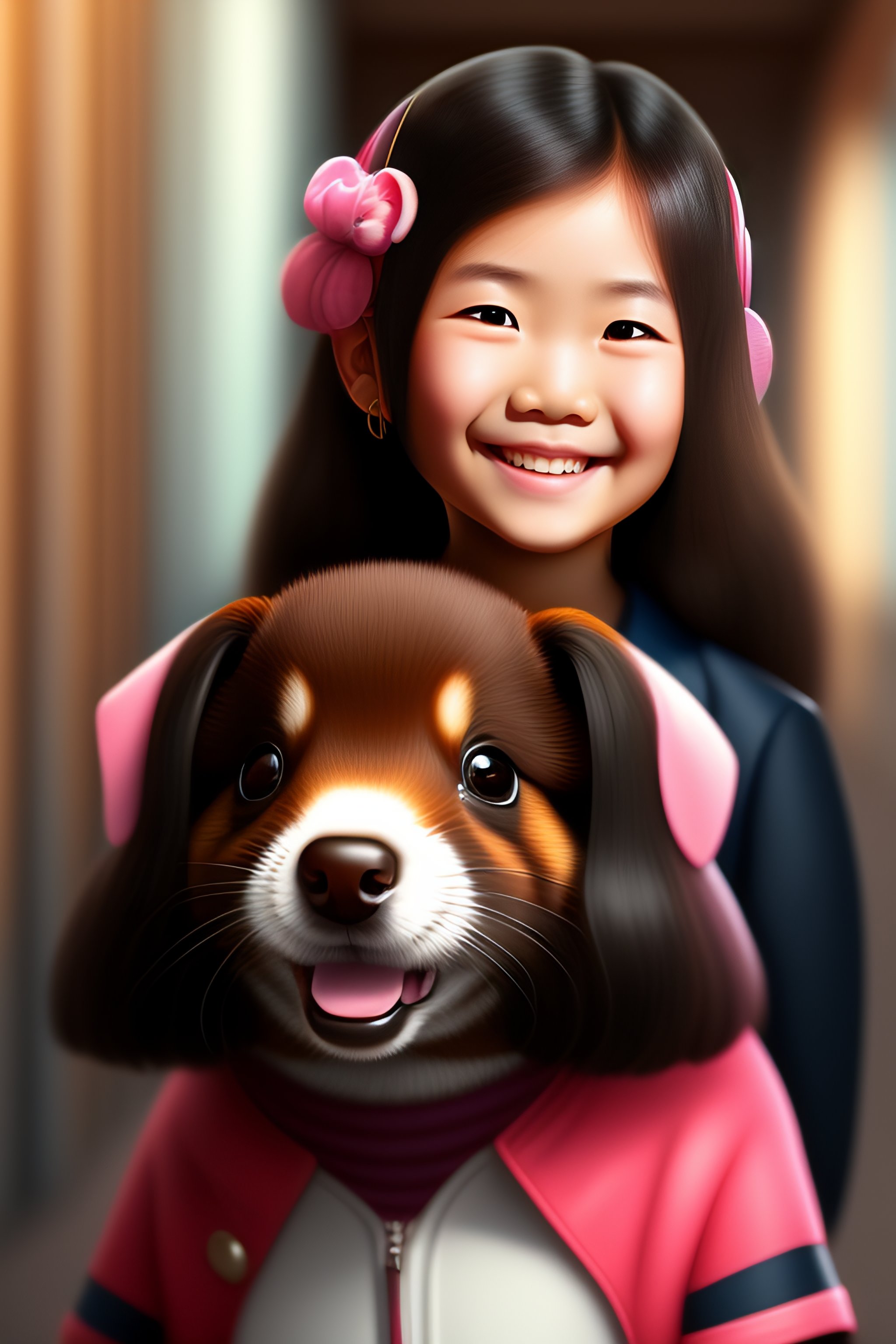 Cute and adorable cartoon asian girl, big smile, with high pigtails, include both dog & brown ferret, hyper real, dreamlike, surrealism, super cute, trending on art station