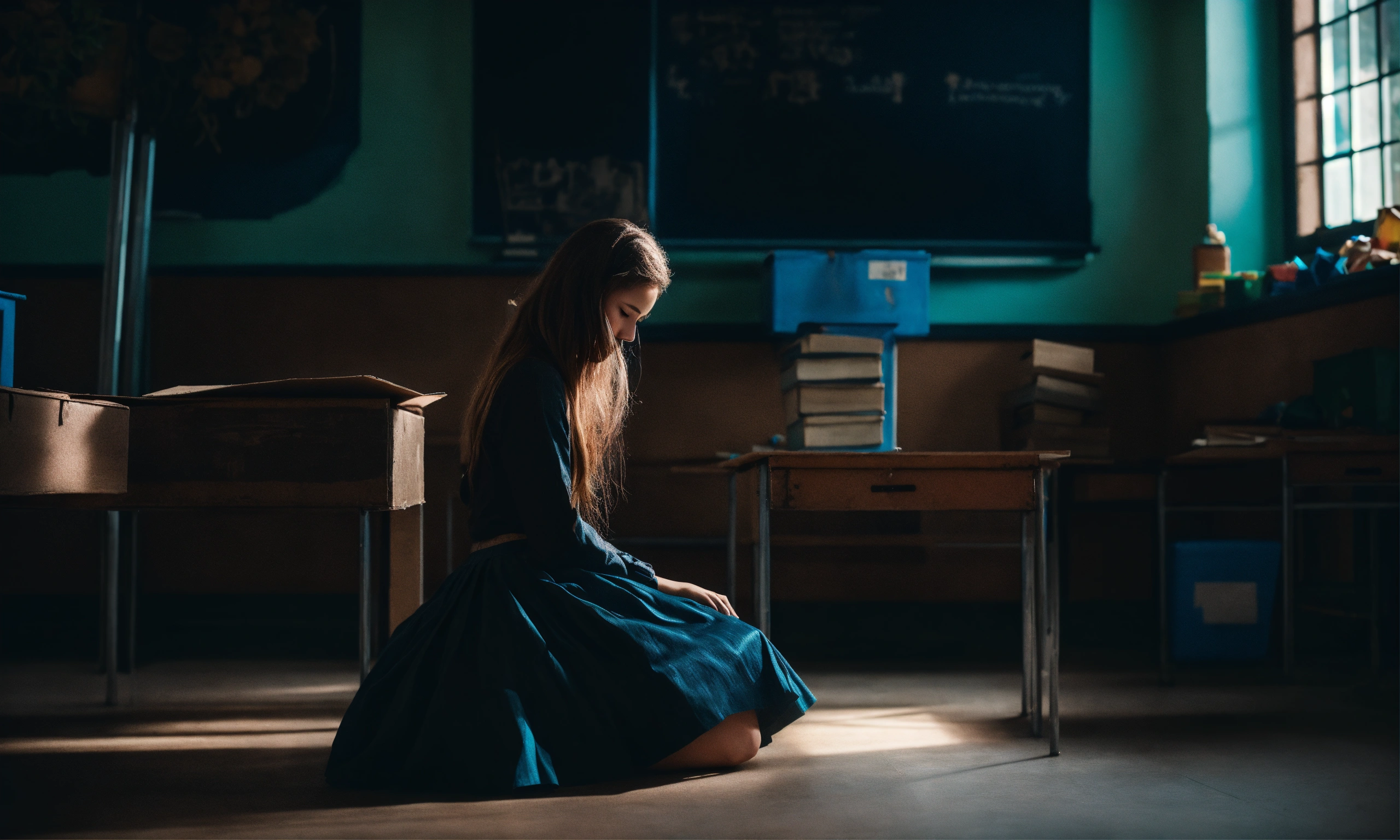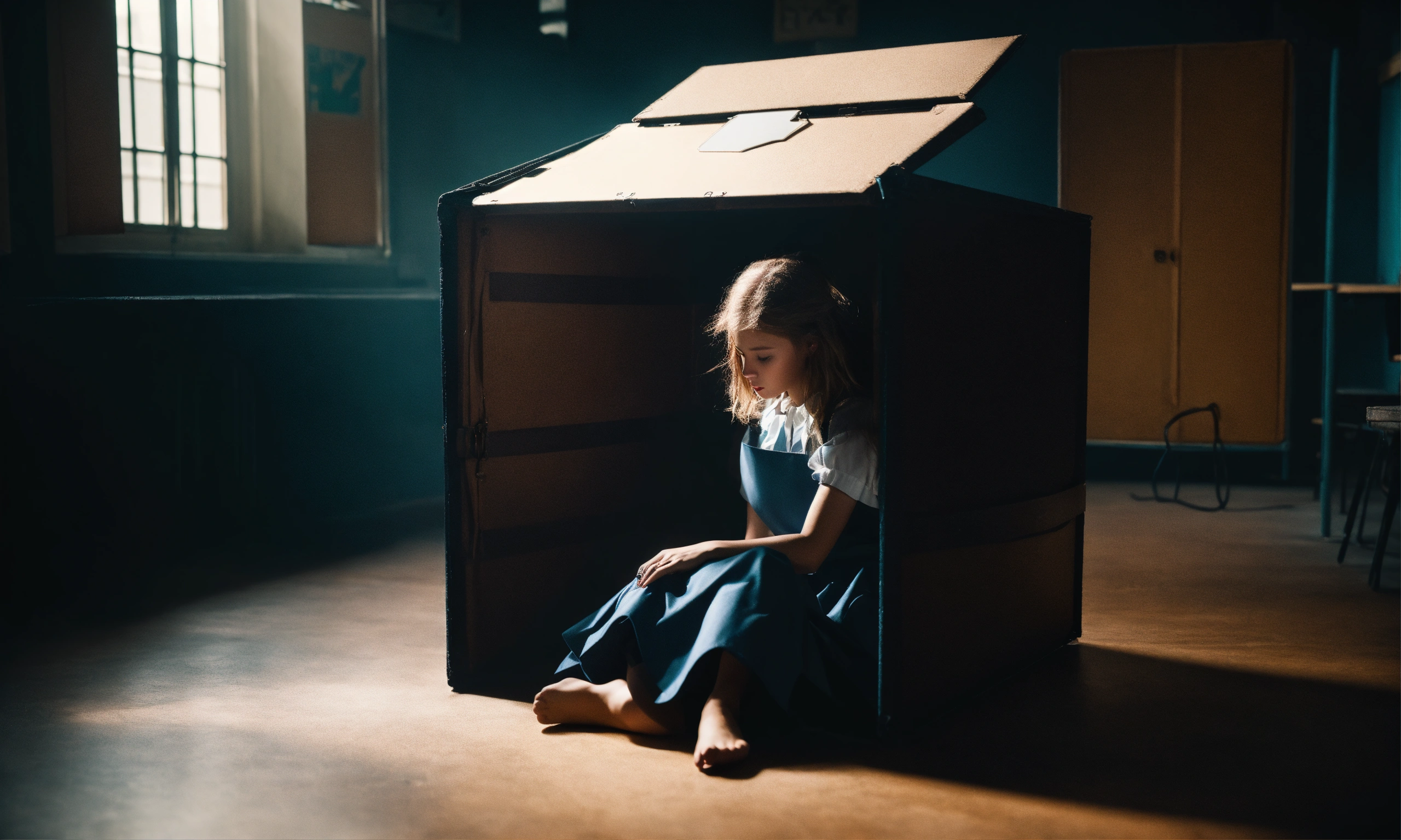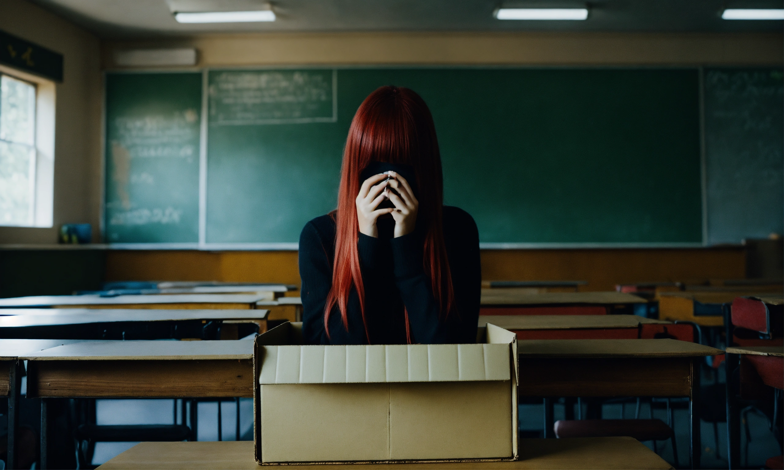 Girl always wears box due to her ugliness; skirt; in classroom; shy; fantasy, cinematic lighting, other worldy, surreal 8k photo, dark moody aesthetic; she put her head inside the box to hide her face