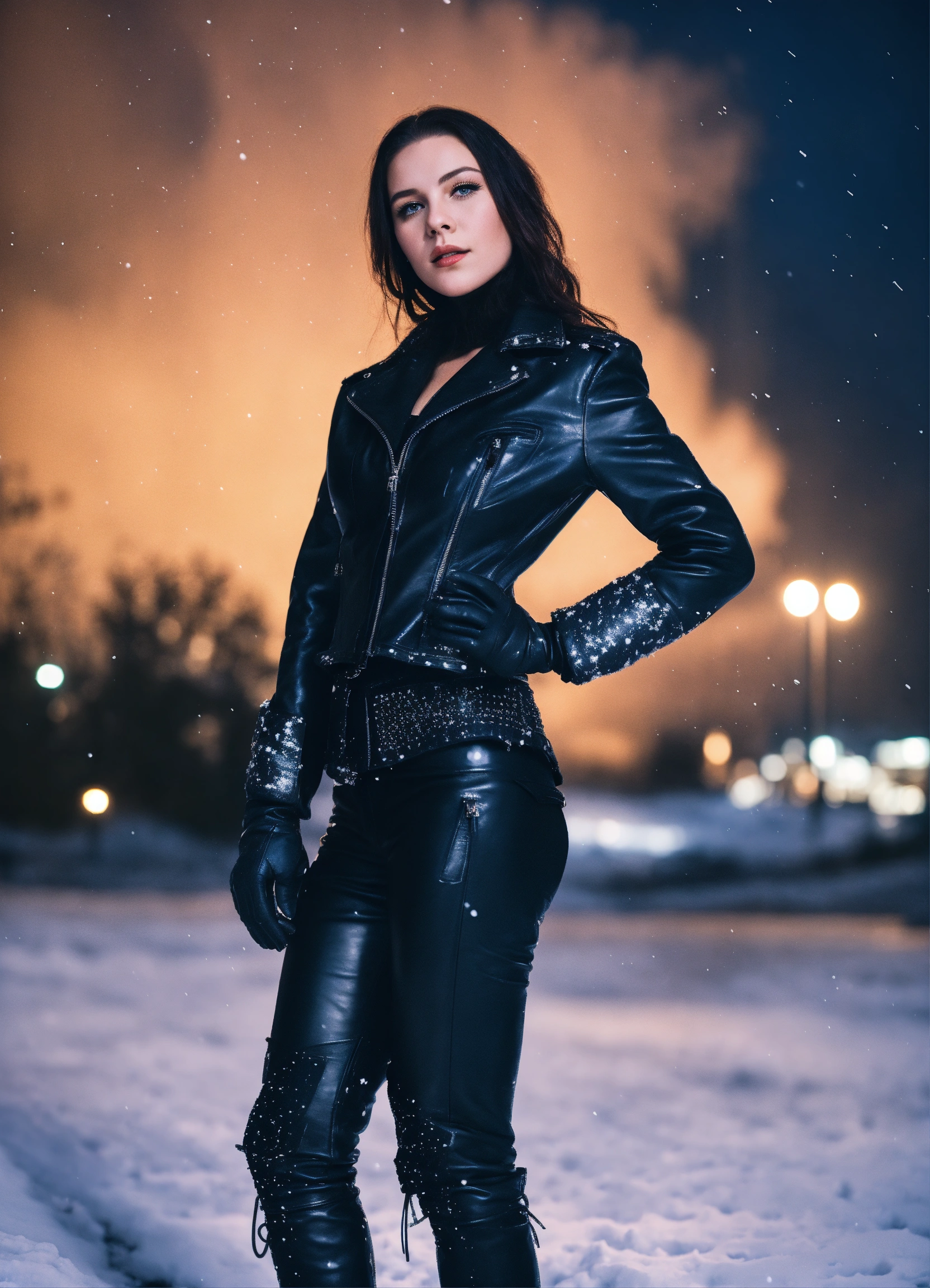 A real photo of a 25 year old metal woman with looking like sophie thatcher, wearing black leather jacket pants corsets and gloves. urban background in the sky we see stars. full body snow at night.
