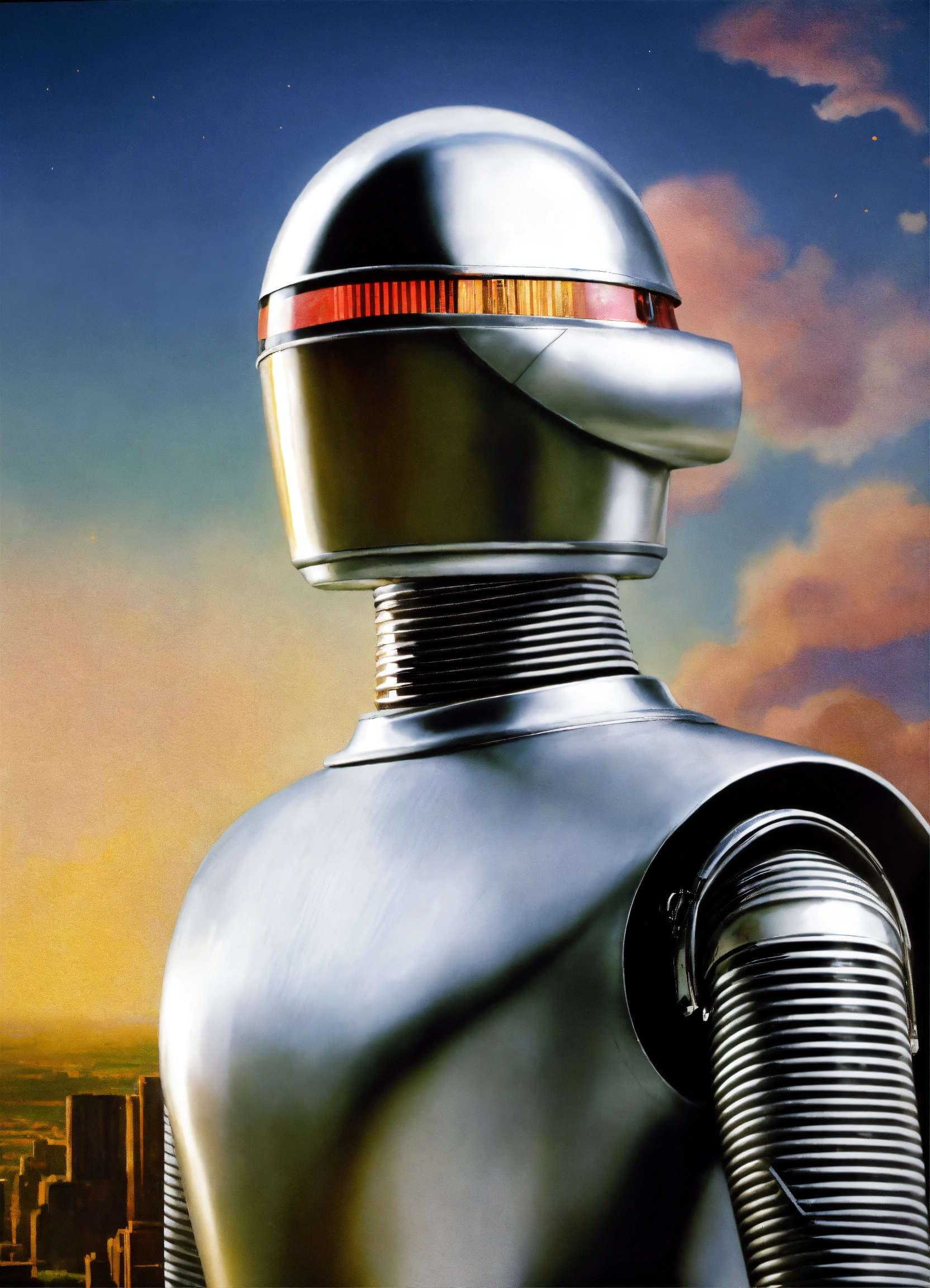 Gort, the robot from the movie "the day the earth stood still" with a curved visor that has a horizontal slit, the neck smoothly transitions to the body