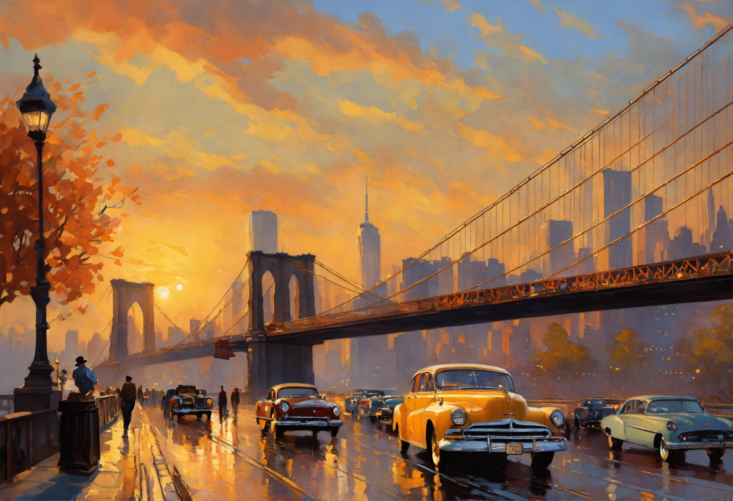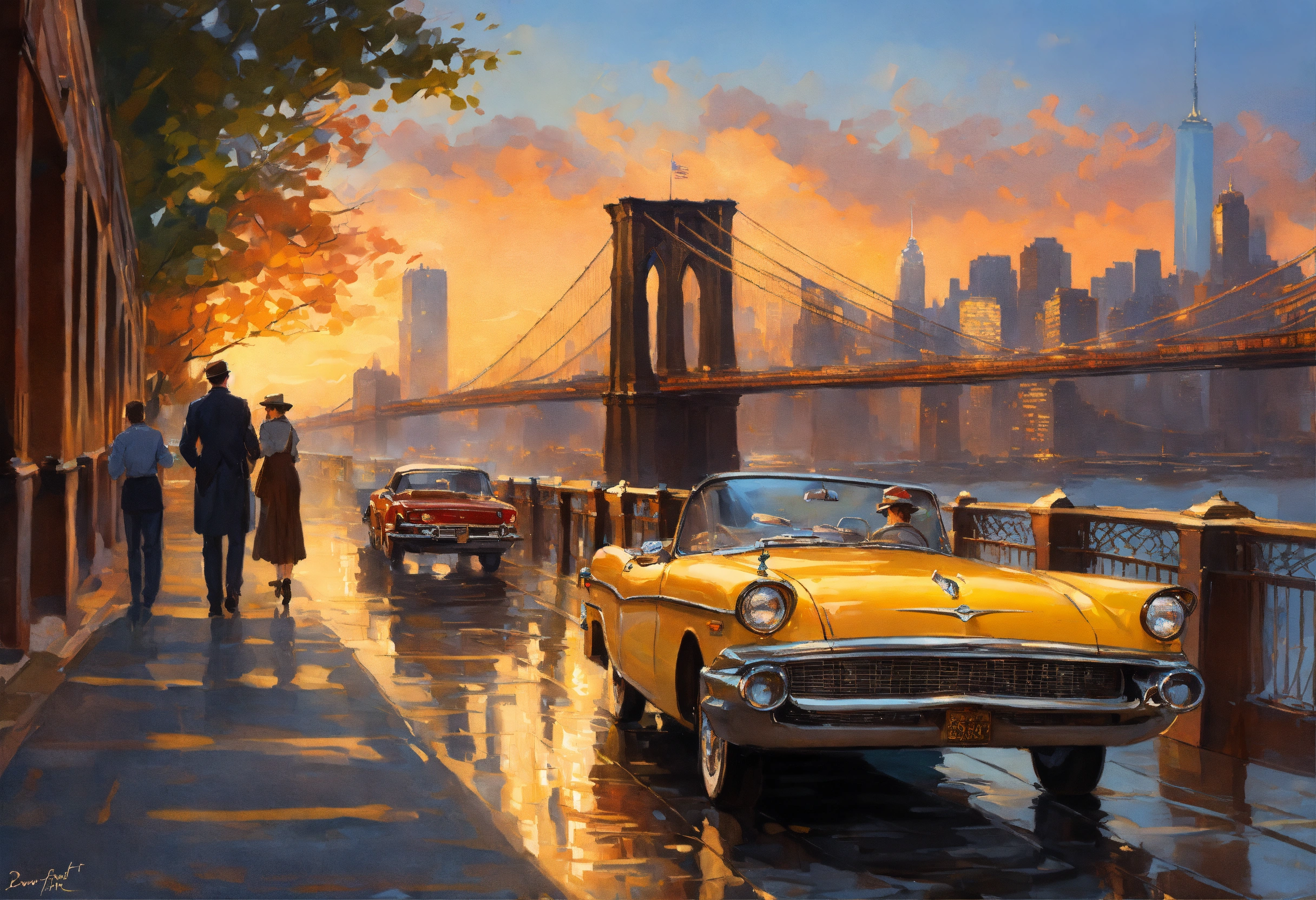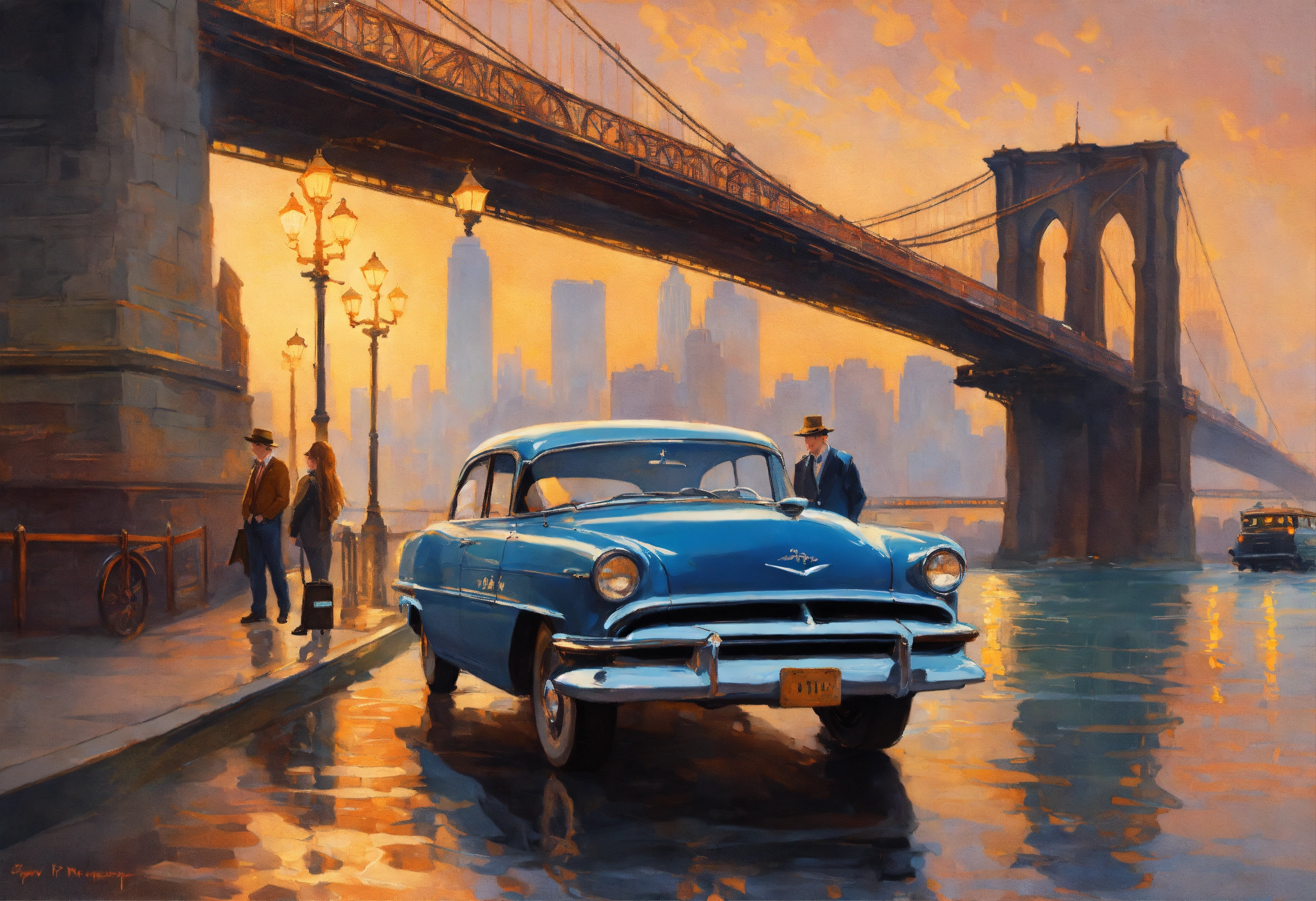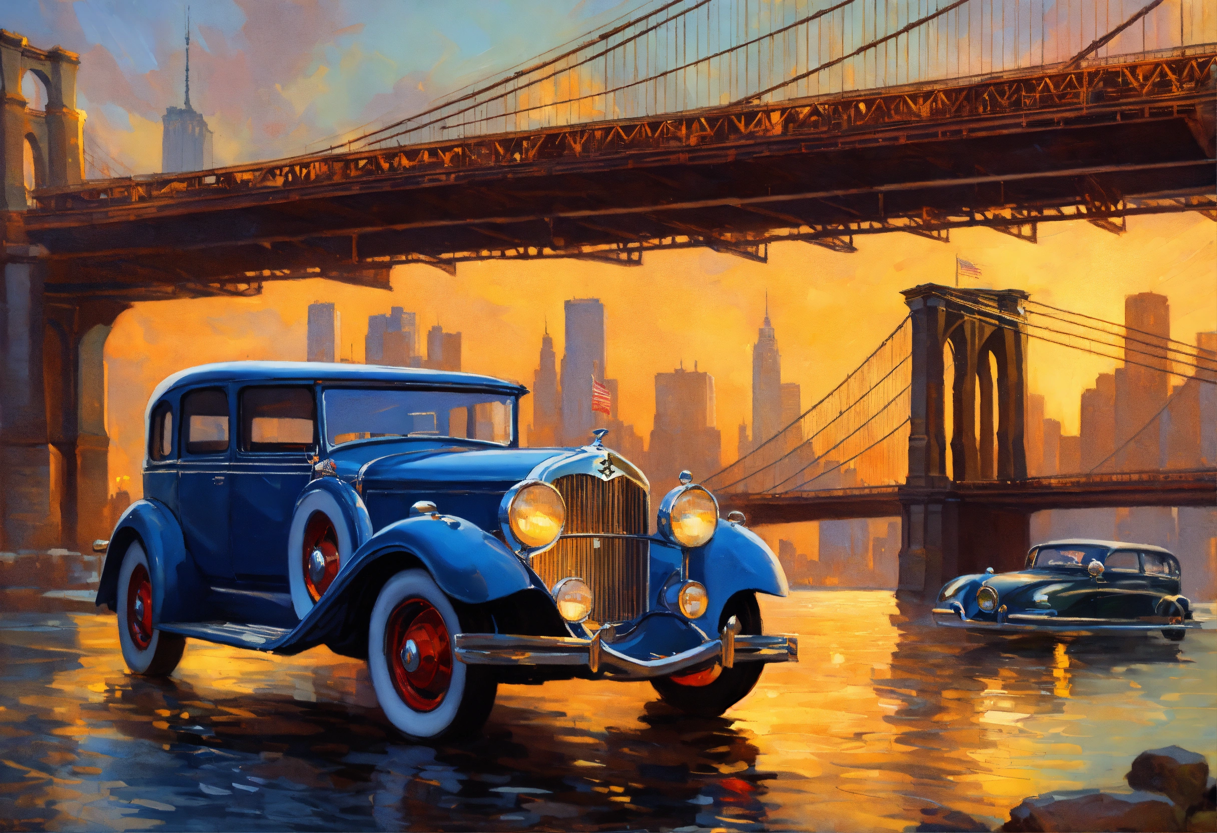 America antique cars in new york, brooklyn bridge, illustration, by evgeny lushpin and daniel f gerhartz and claude monet and leonid afremov.