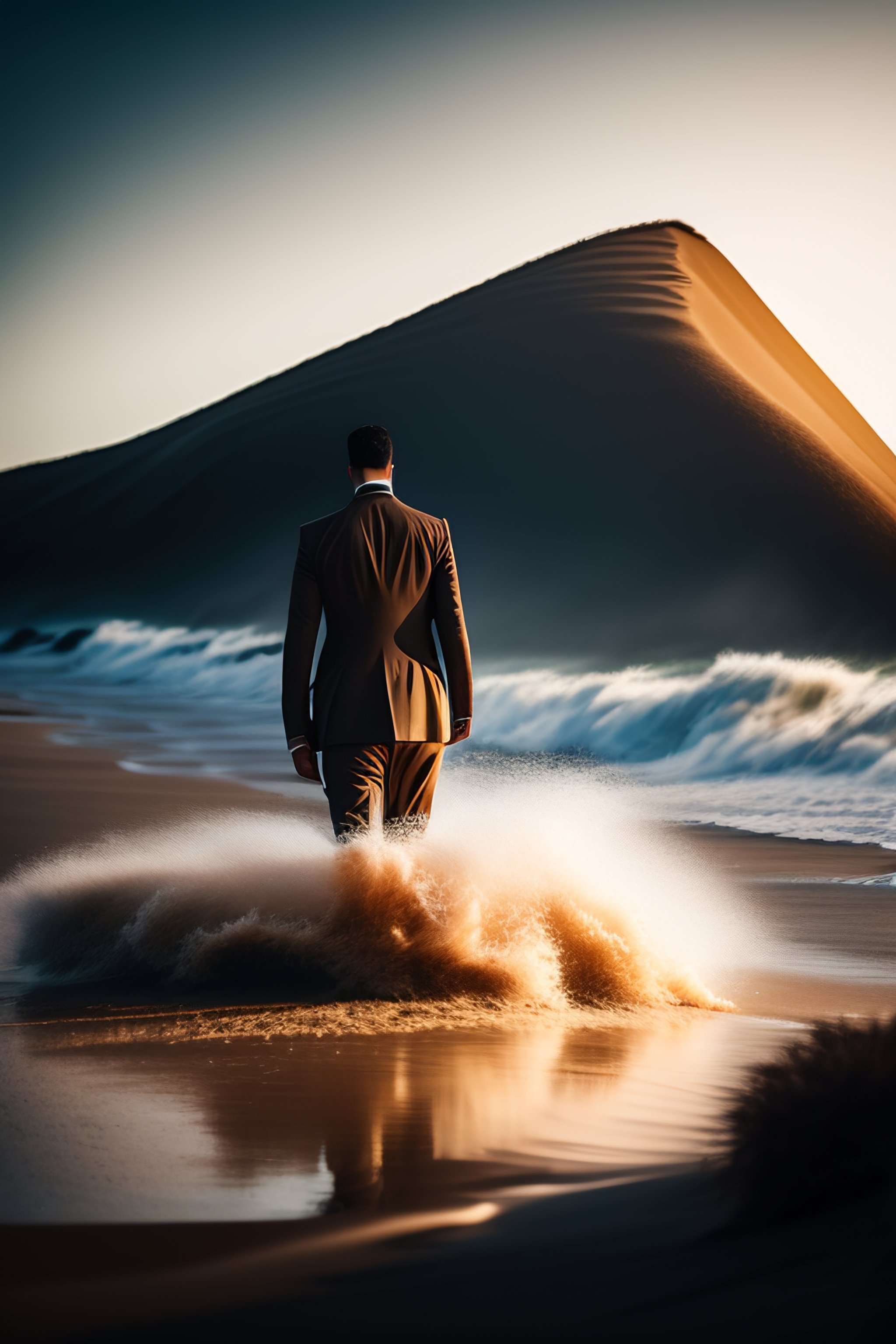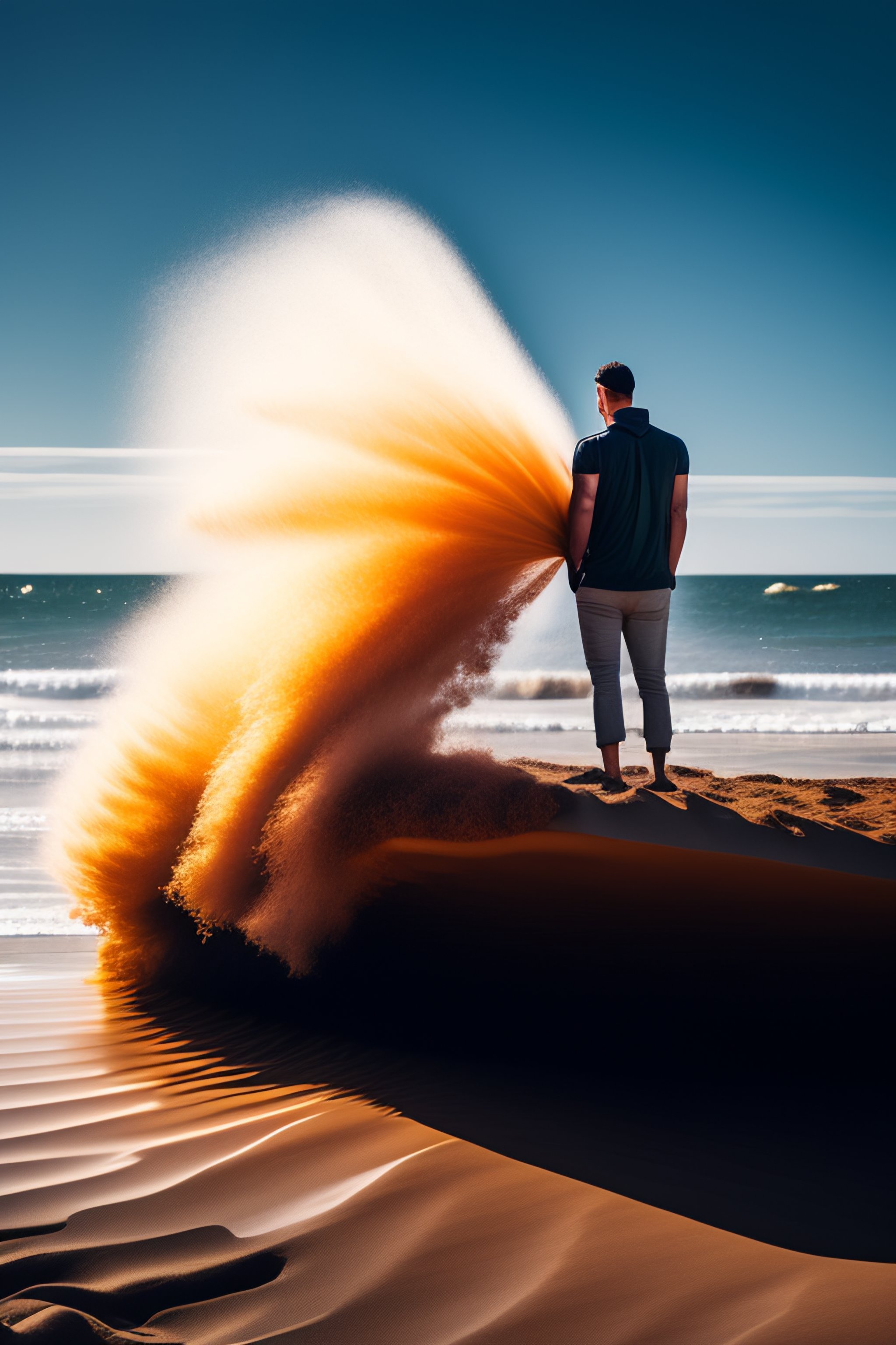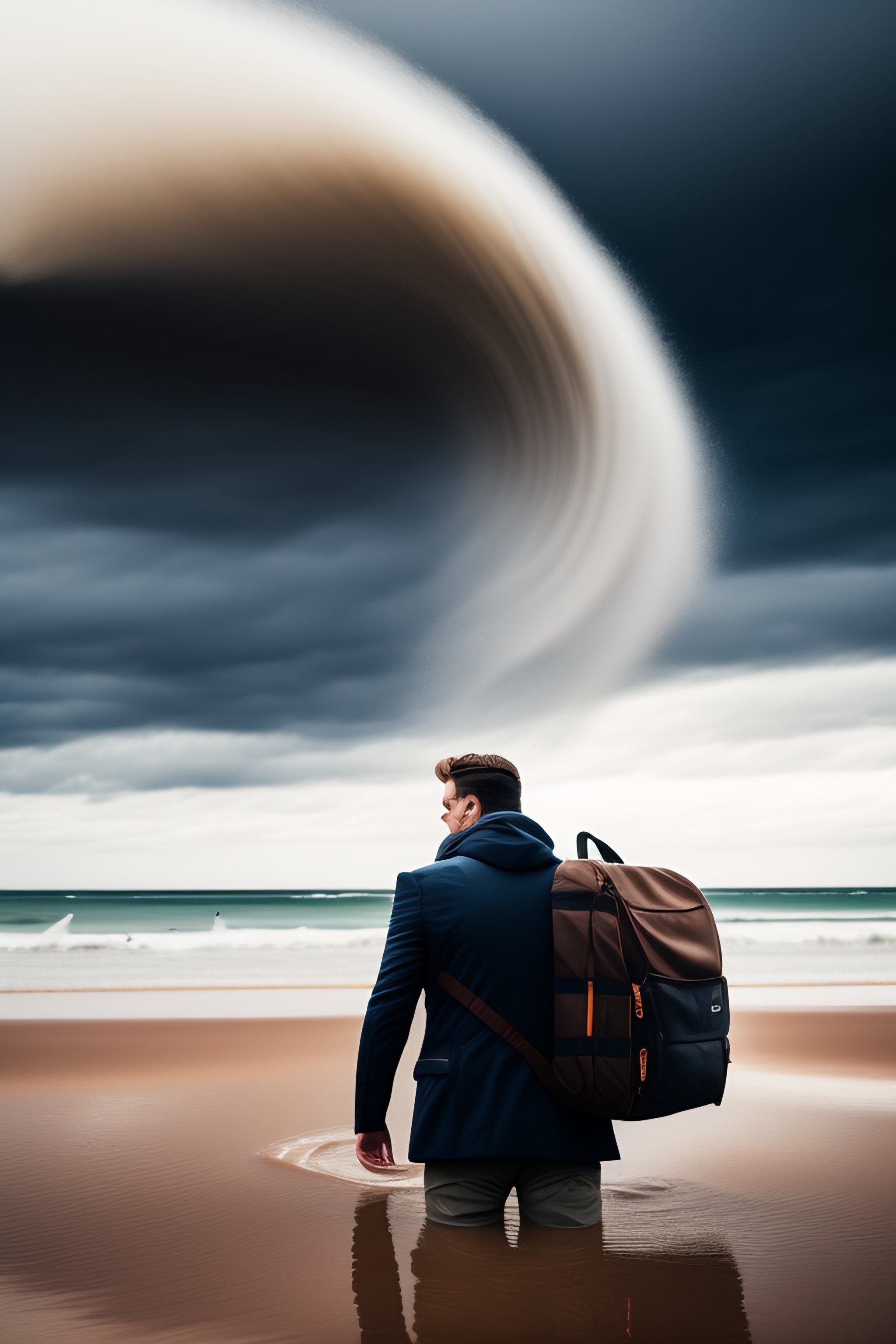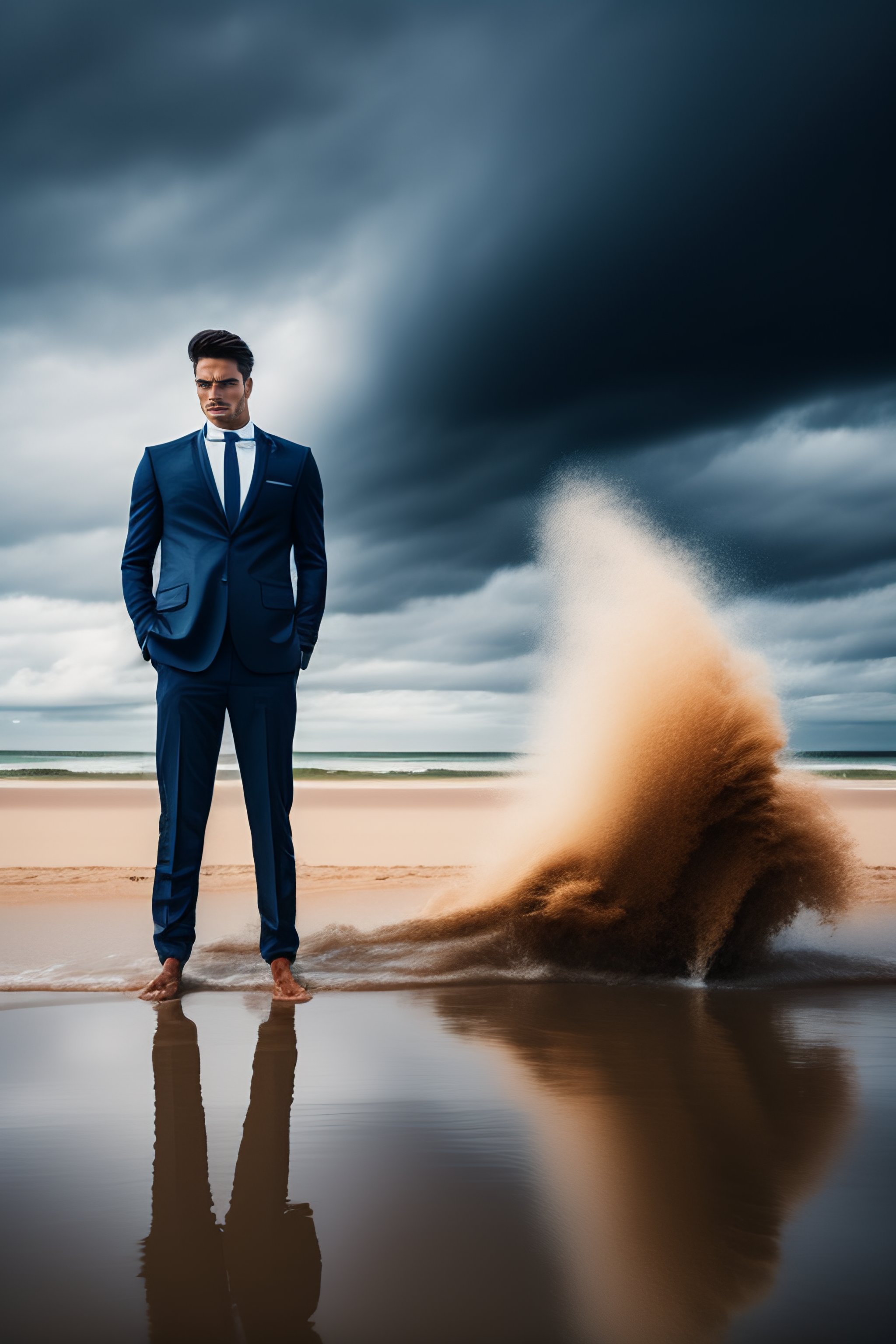 Dramatic wind pushing on man's back standing in quicksand