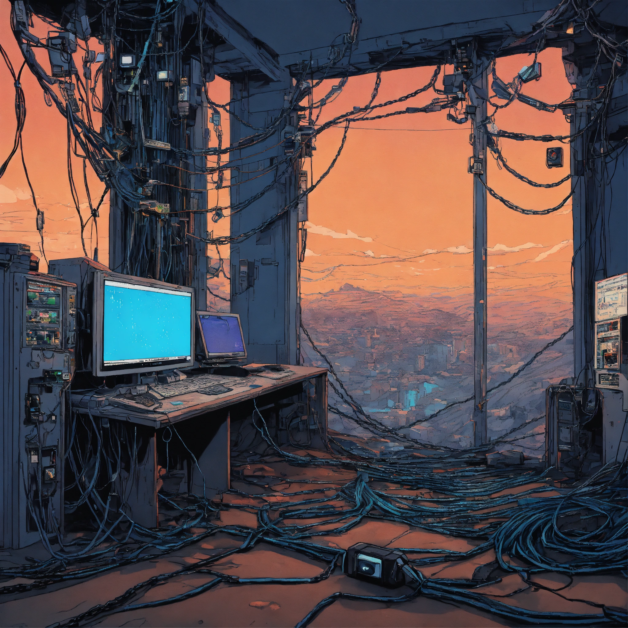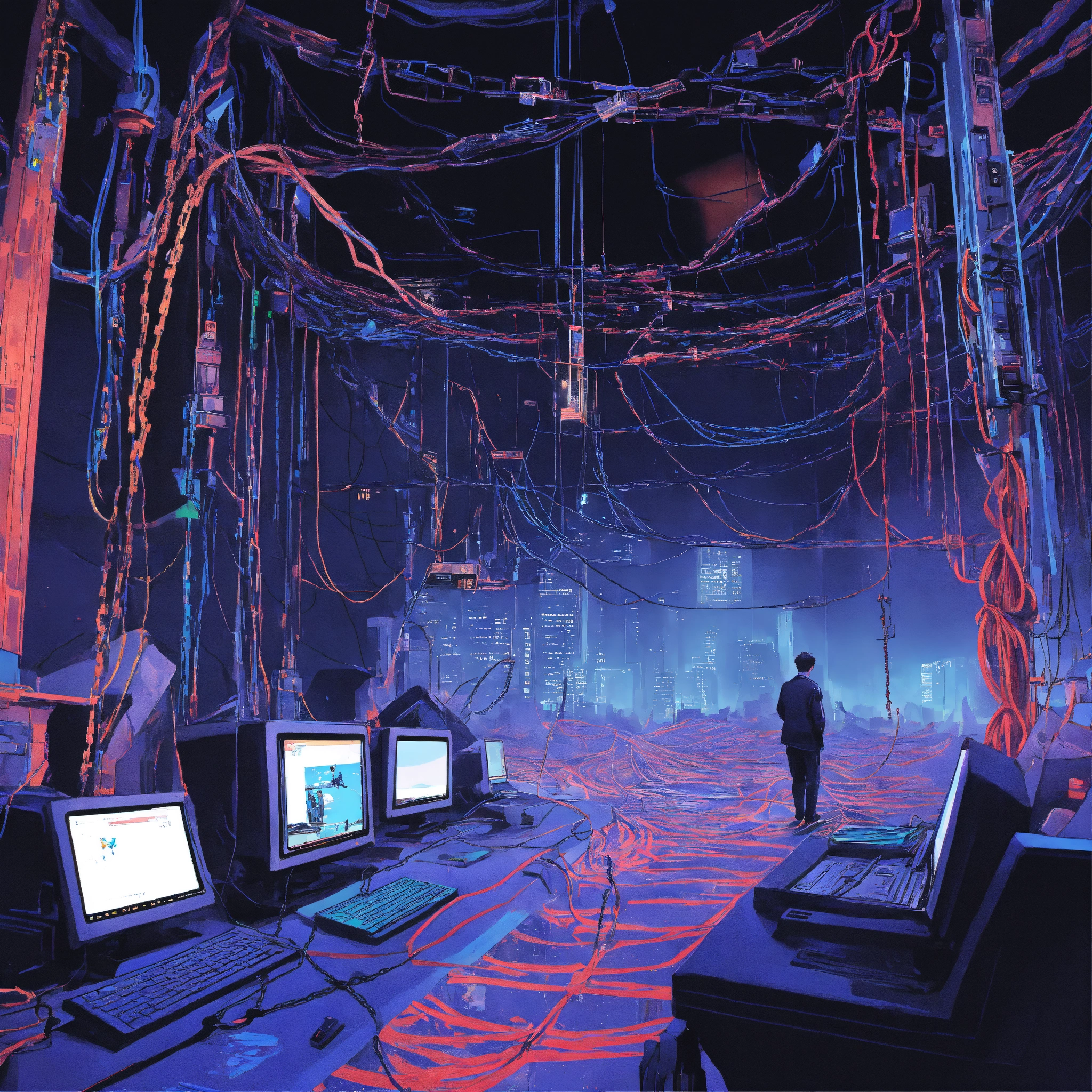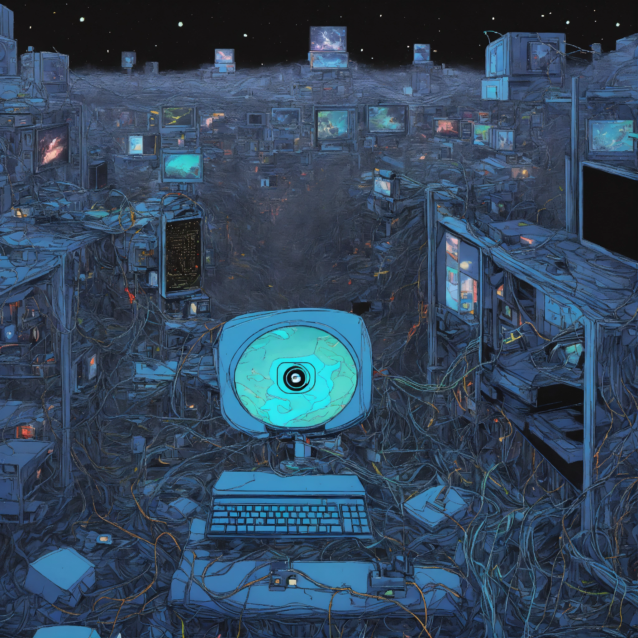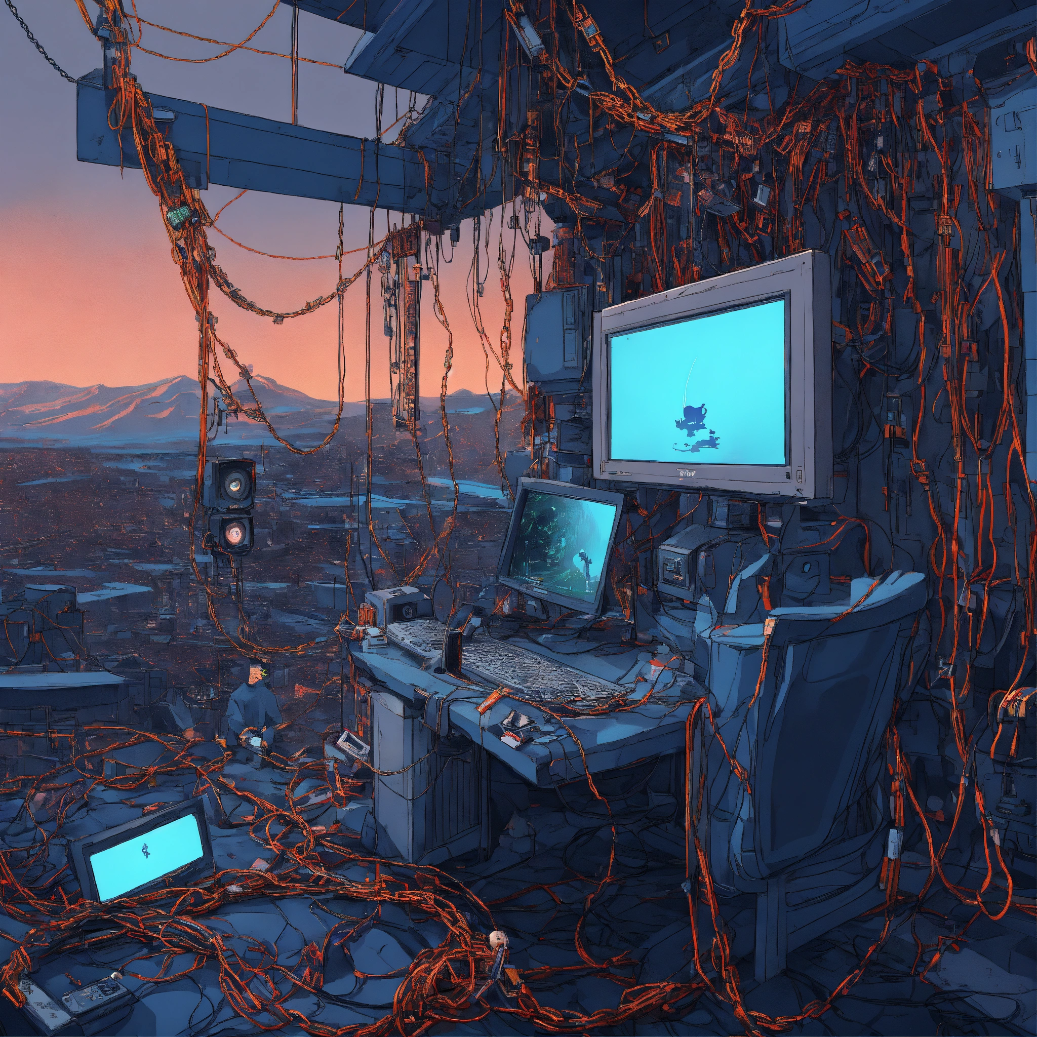 Depict a cartoonish, dystopian landscape where streamers are quite literally ensnared by their own live feeds. their chains are streams of data cables and broken webcams, intricately knotted around their wrists and necks, tethered to endlessly scrolling screens that wash their world in a relentless blue, contrasting with the deep black of the void they can't escape