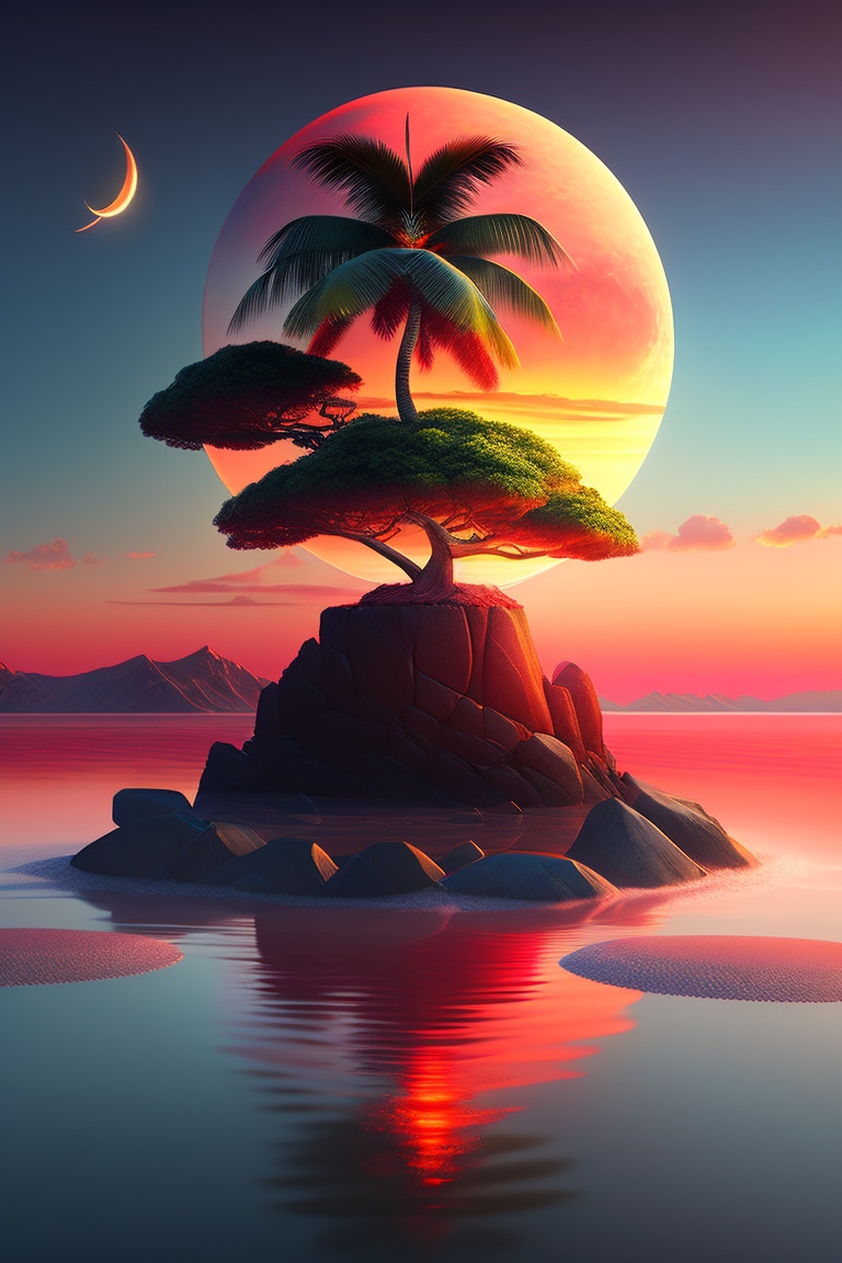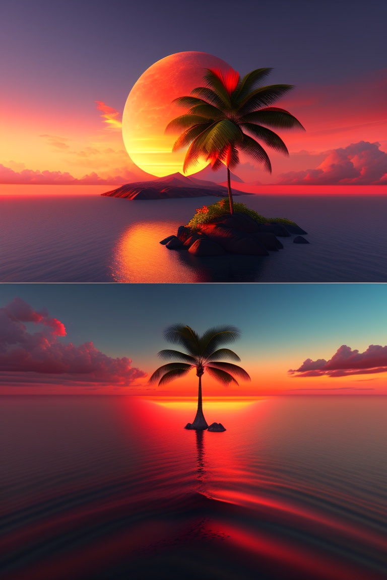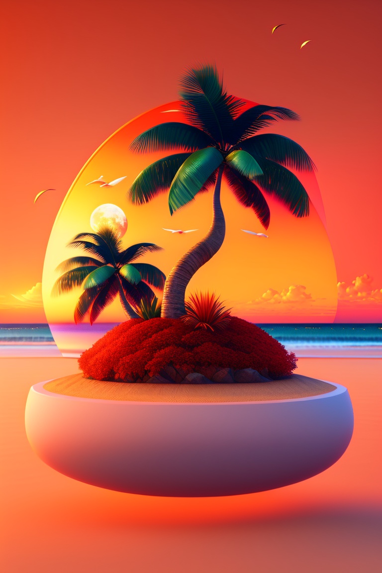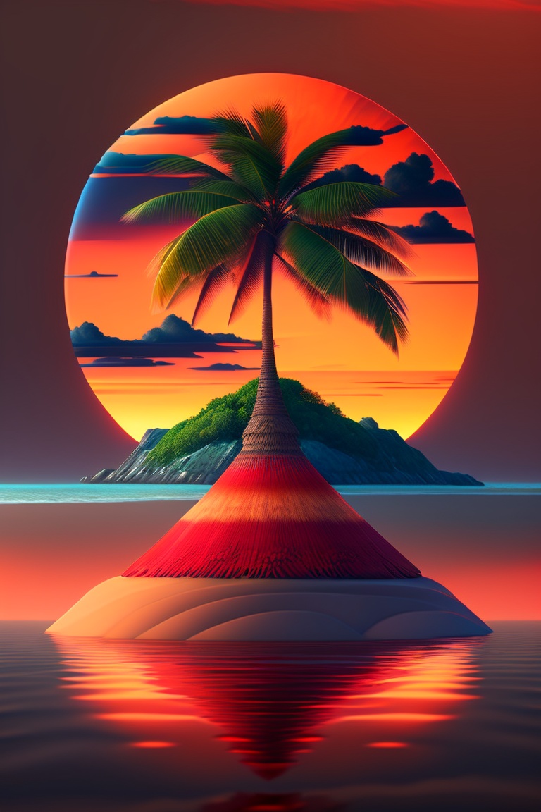 A coconut tree on an island in middle of ocean, 3d blender style island, anime style skies, tree texture, sand texture, water texture, masterpiece, detailed, 4k, leaf texture, birds flying in the sky, burning red sunset, anime style sunset